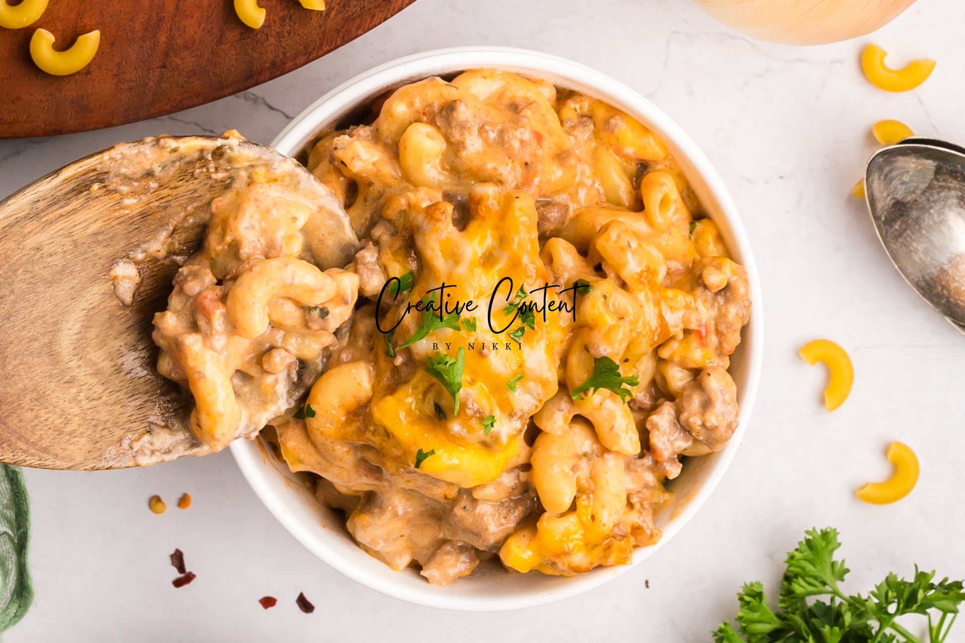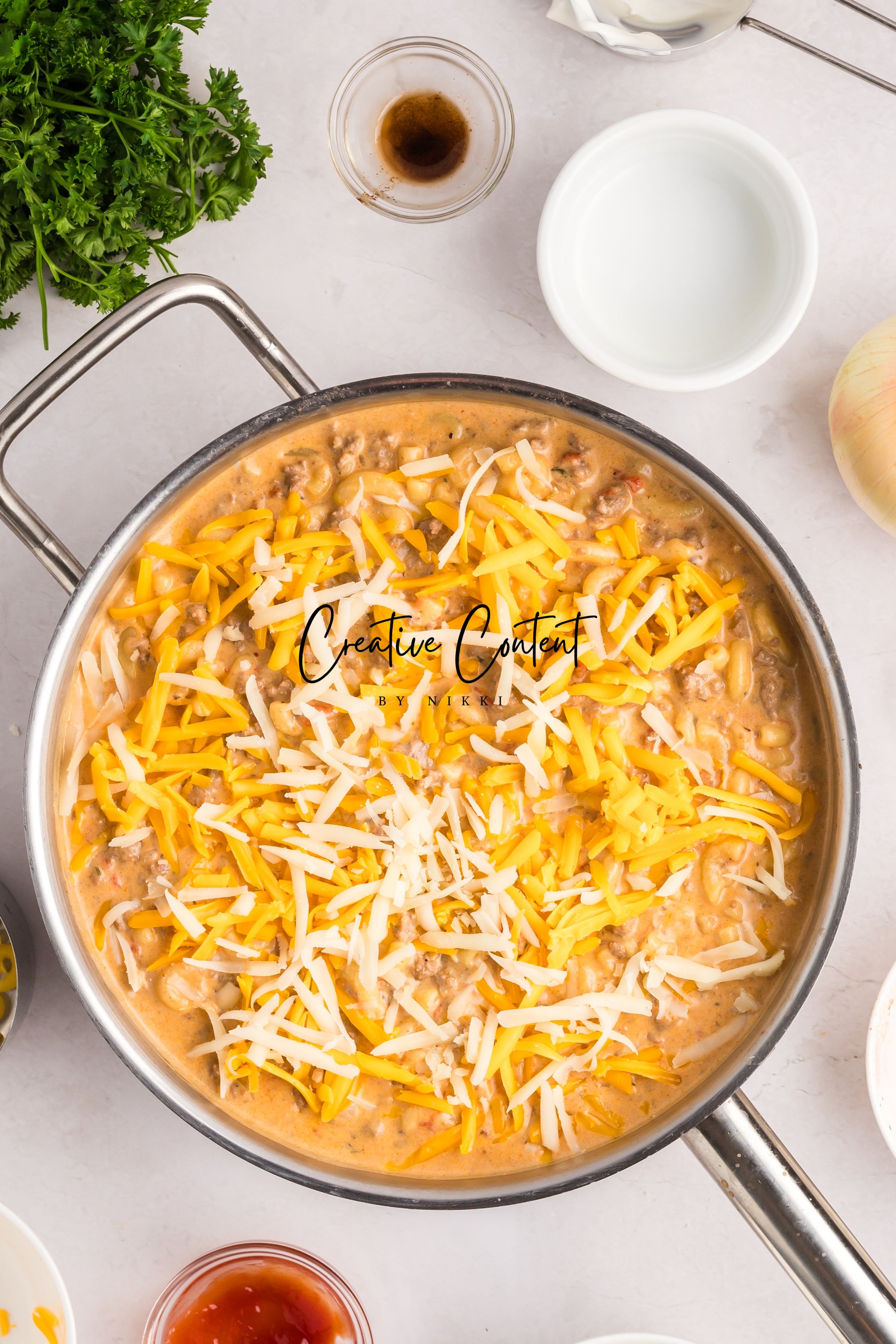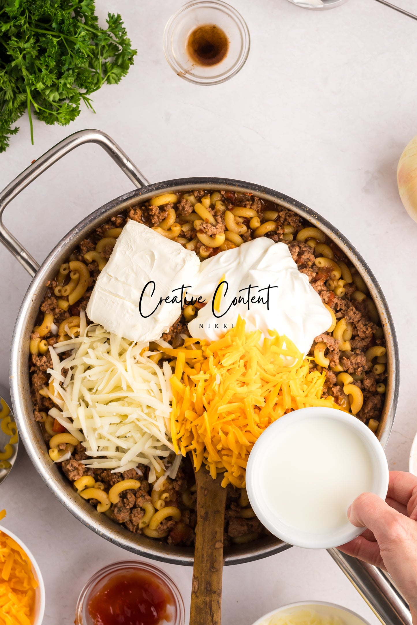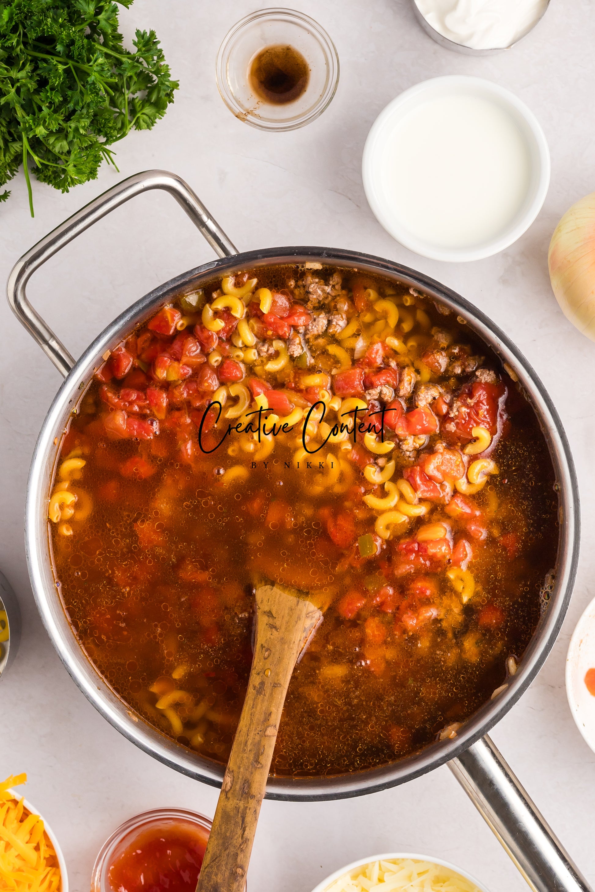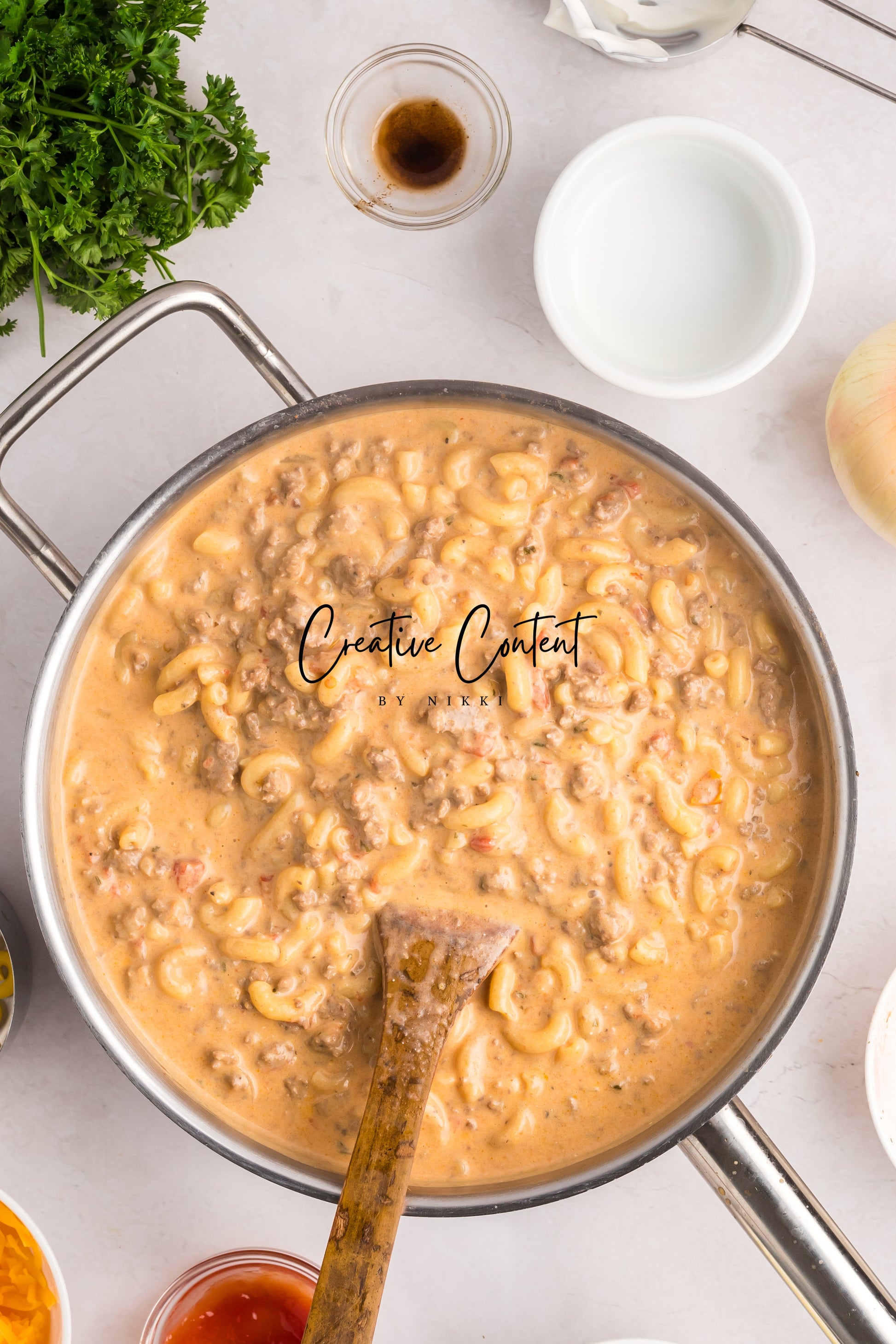 - Featured Ingredients; ground beef, yellow onion, seasonings, beef broth, petite diced tomatoes, Better Than Bouillon, elbow macaroni, ketchup, Worcestershire sauce, cream cheese, sour cream, whole milk, cheddar cheese, mozzarella cheese, and parsley