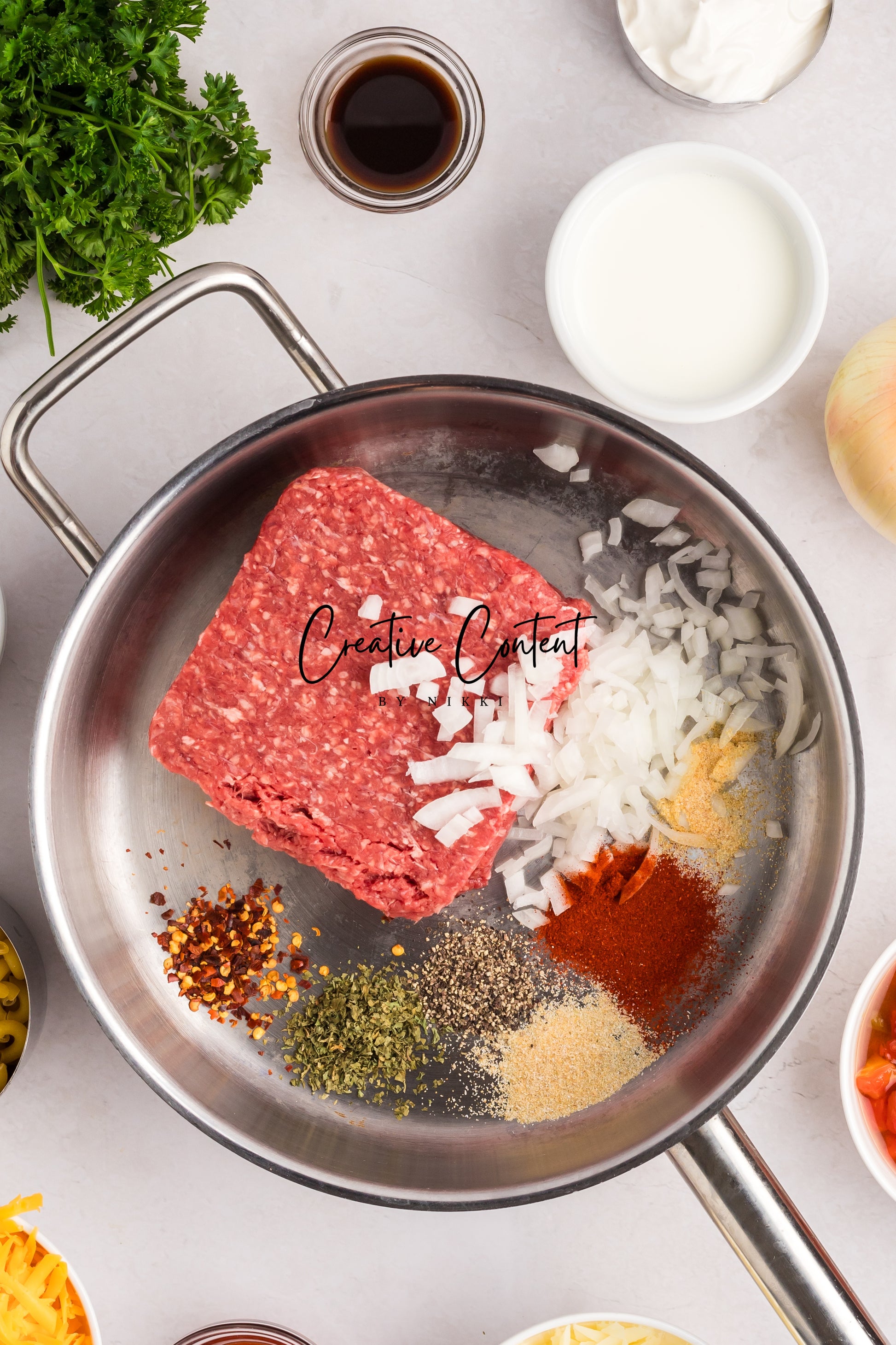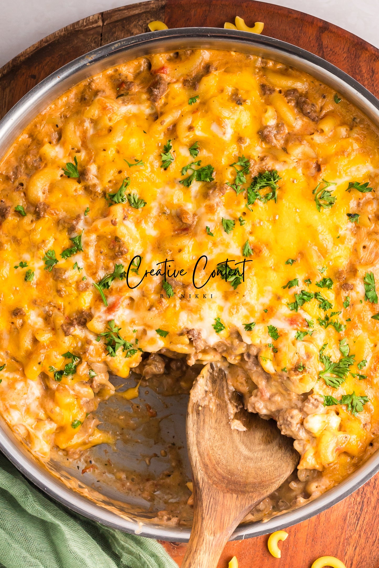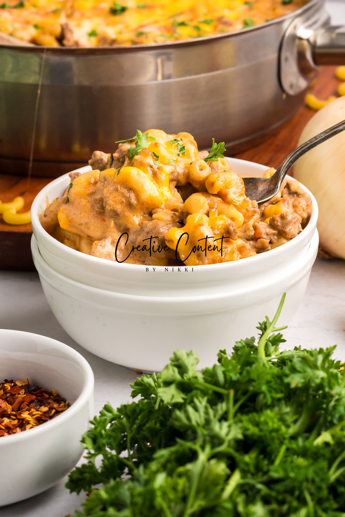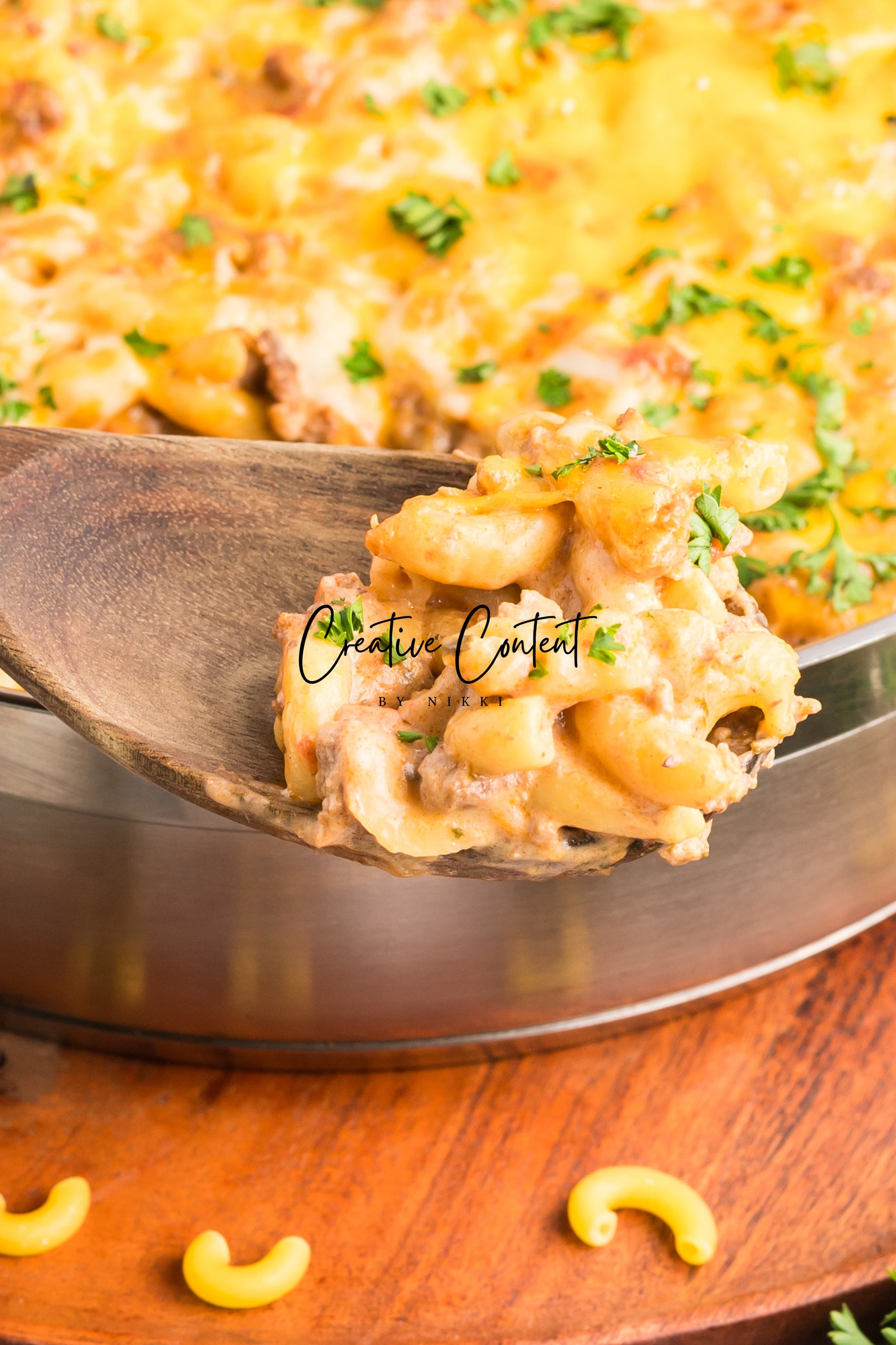 - Featured Ingredients; ground beef, yellow onion, seasonings, beef broth, petite diced tomatoes, Better Than Bouillon, elbow macaroni, ketchup, Worcestershire sauce, cream cheese, sour cream, whole milk, cheddar cheese, mozzarella cheese, and parsley