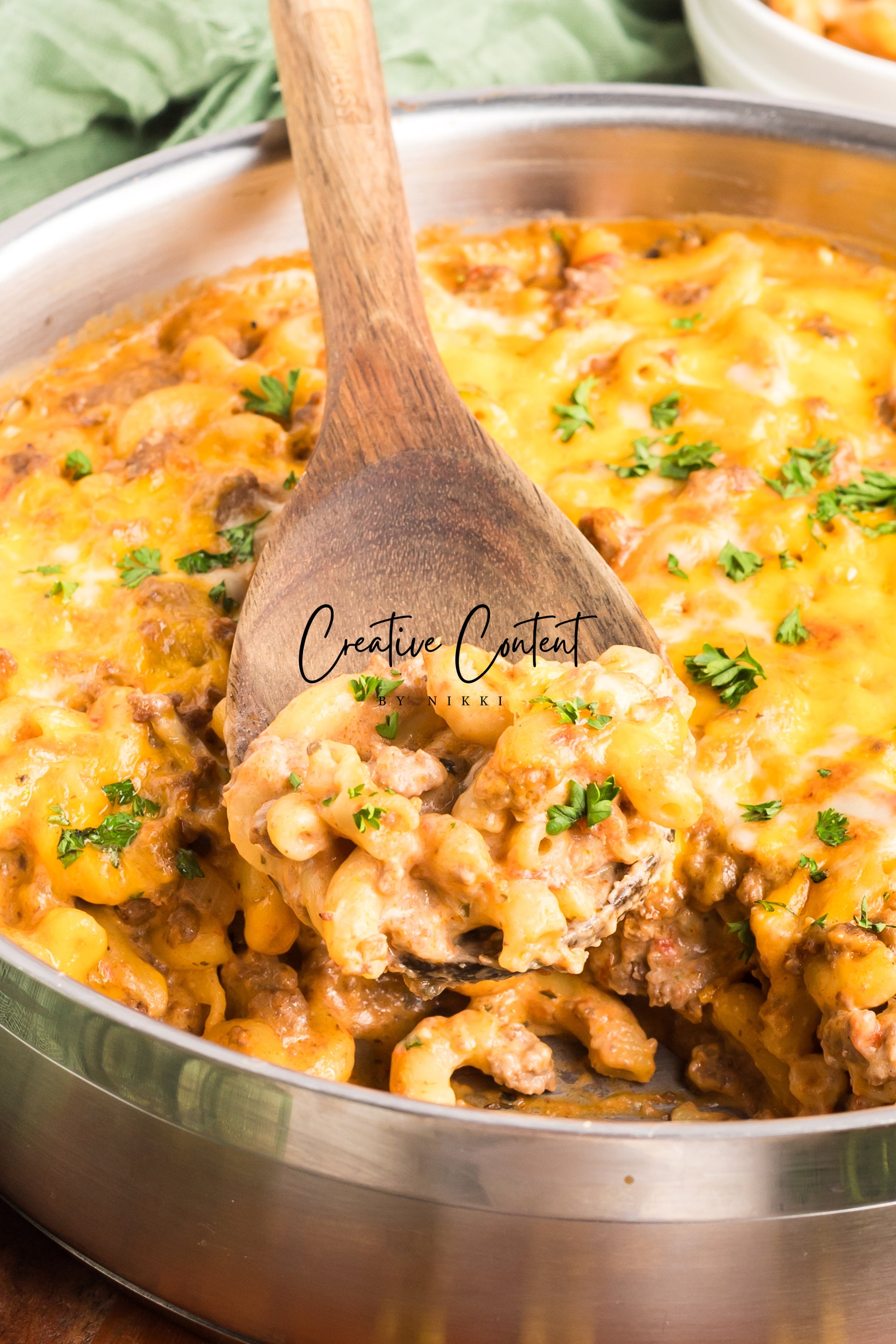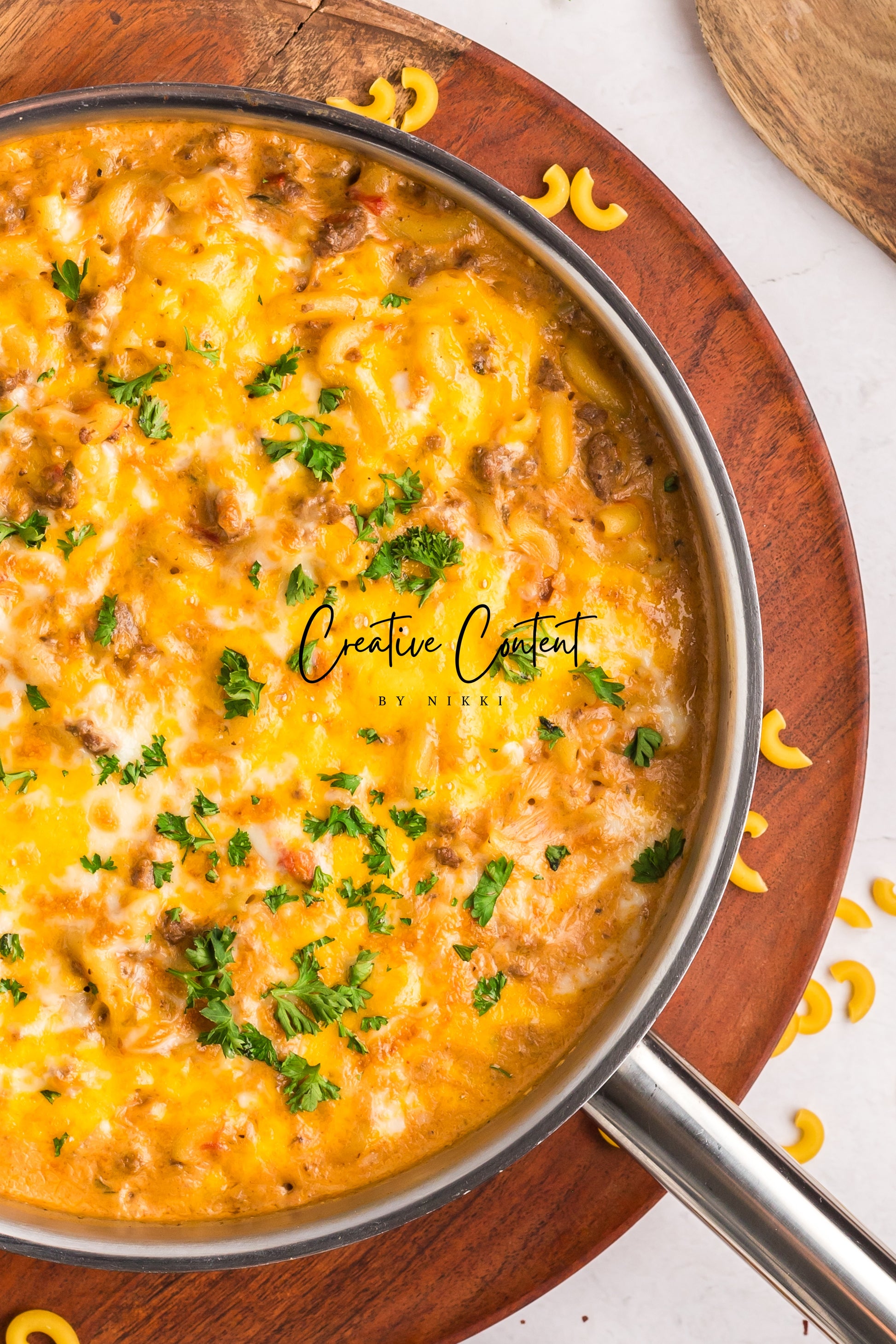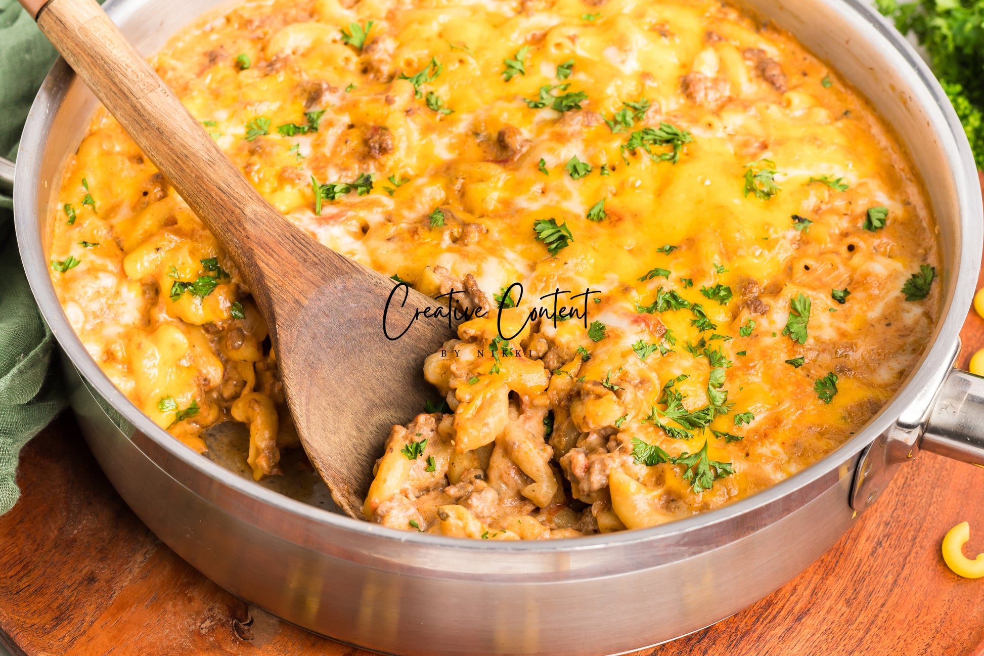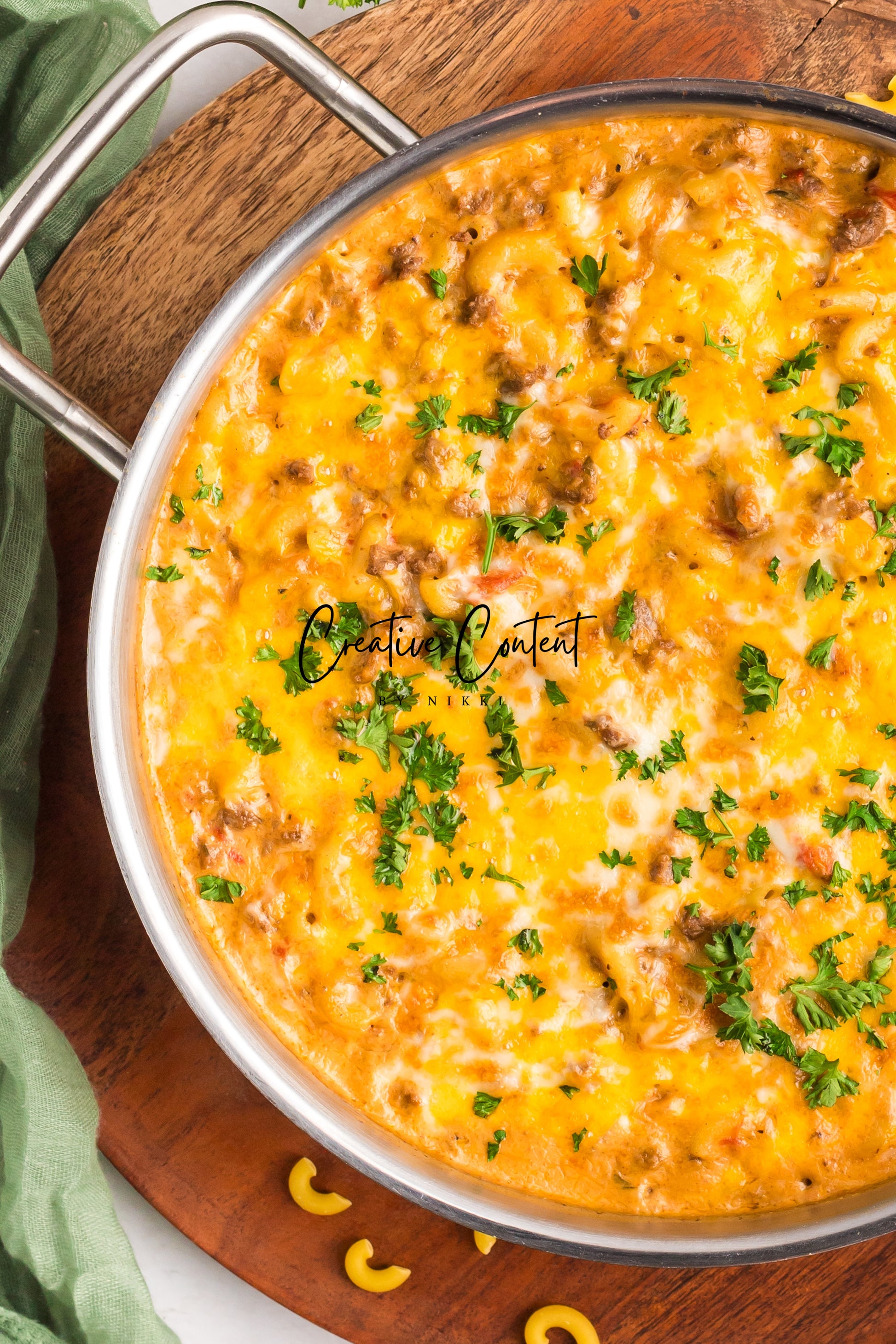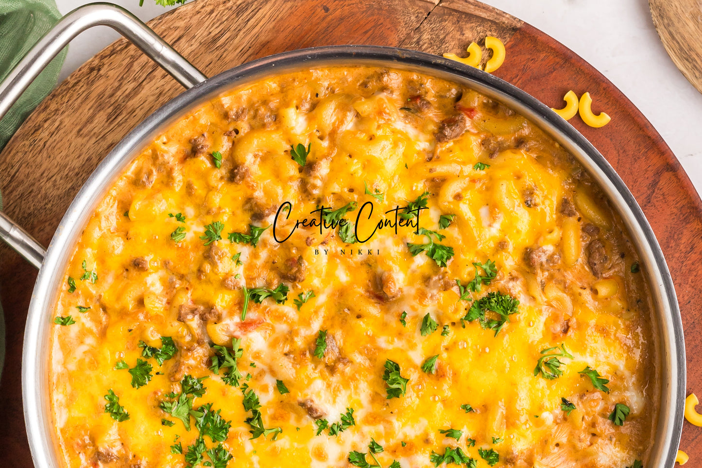 - Featured Ingredients; ground beef, yellow onion, seasonings, beef broth, petite diced tomatoes, Better Than Bouillon, elbow macaroni, ketchup, Worcestershire sauce, cream cheese, sour cream, whole milk, cheddar cheese, mozzarella cheese, and parsley