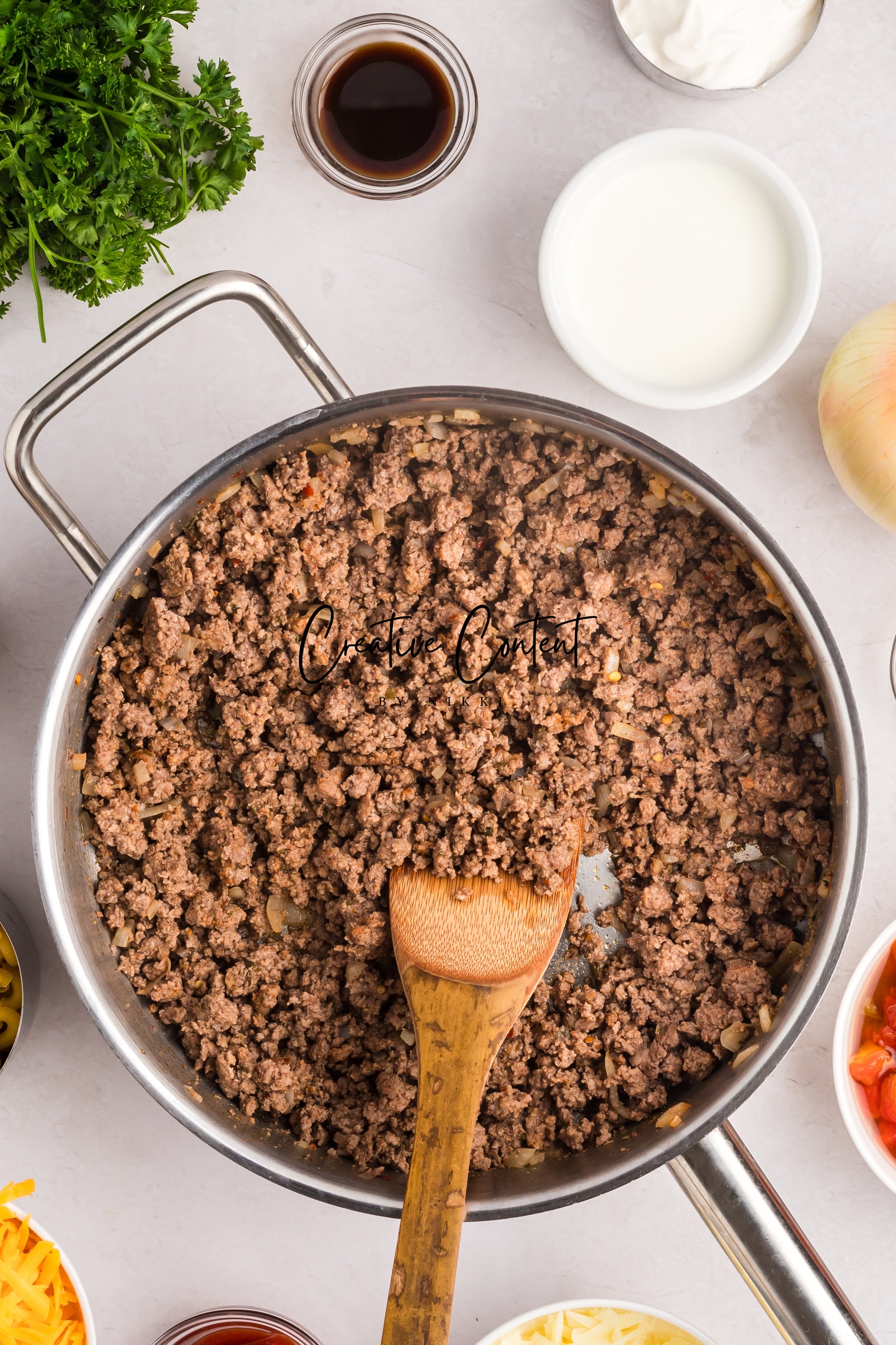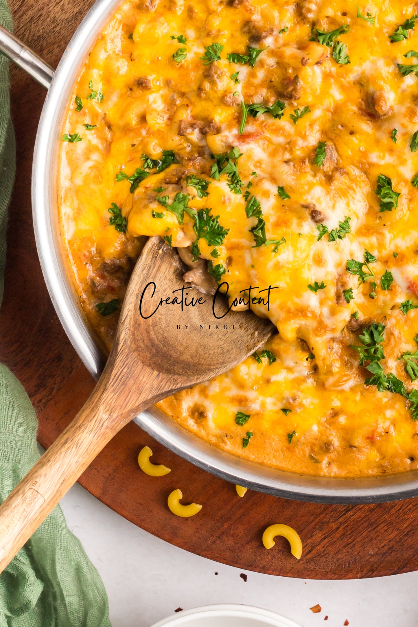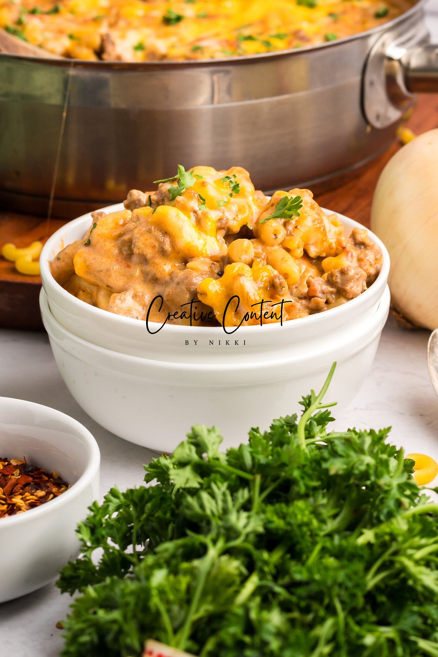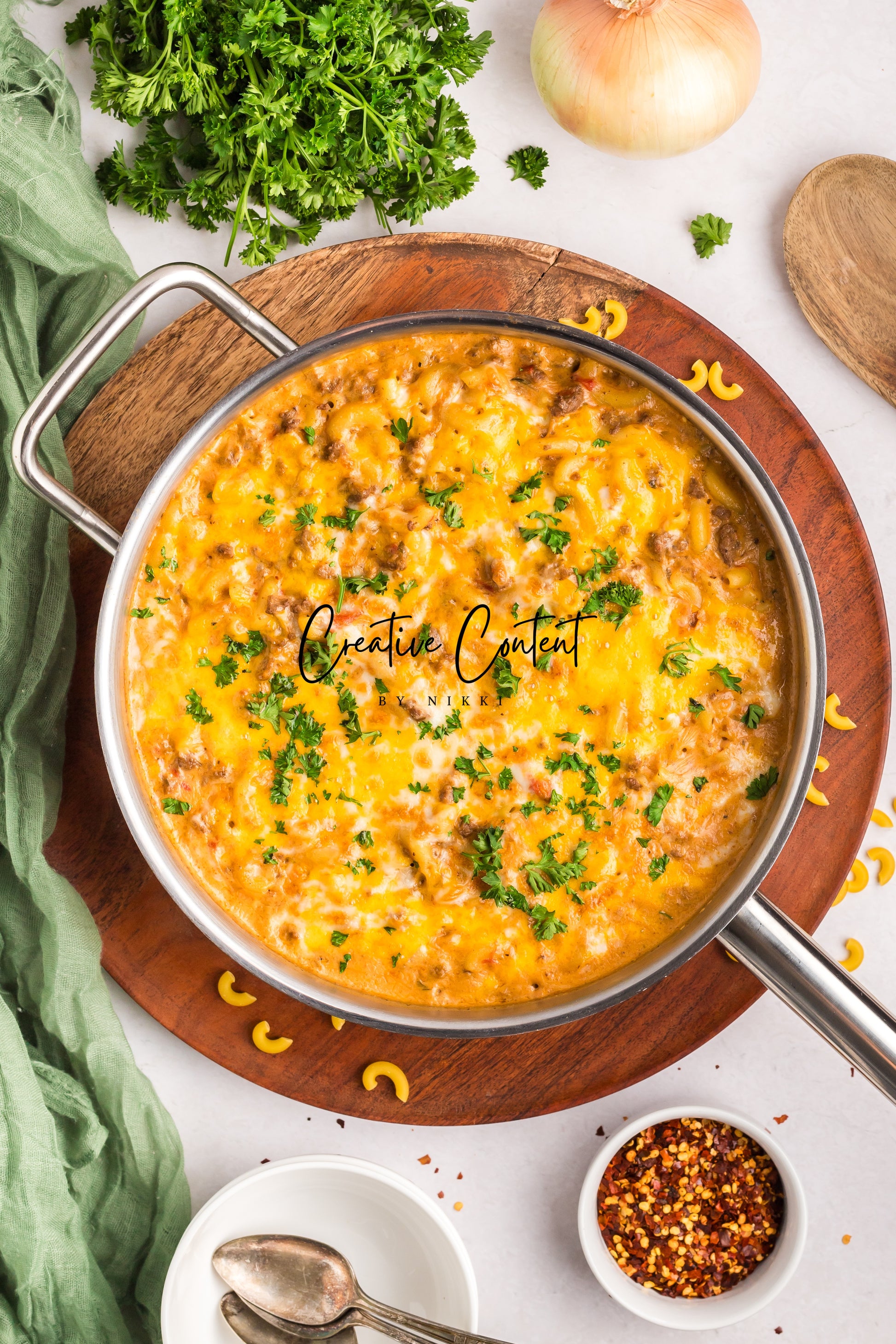 - Featured Ingredients; ground beef, yellow onion, seasonings, beef broth, petite diced tomatoes, Better Than Bouillon, elbow macaroni, ketchup, Worcestershire sauce, cream cheese, sour cream, whole milk, cheddar cheese, mozzarella cheese, and parsley