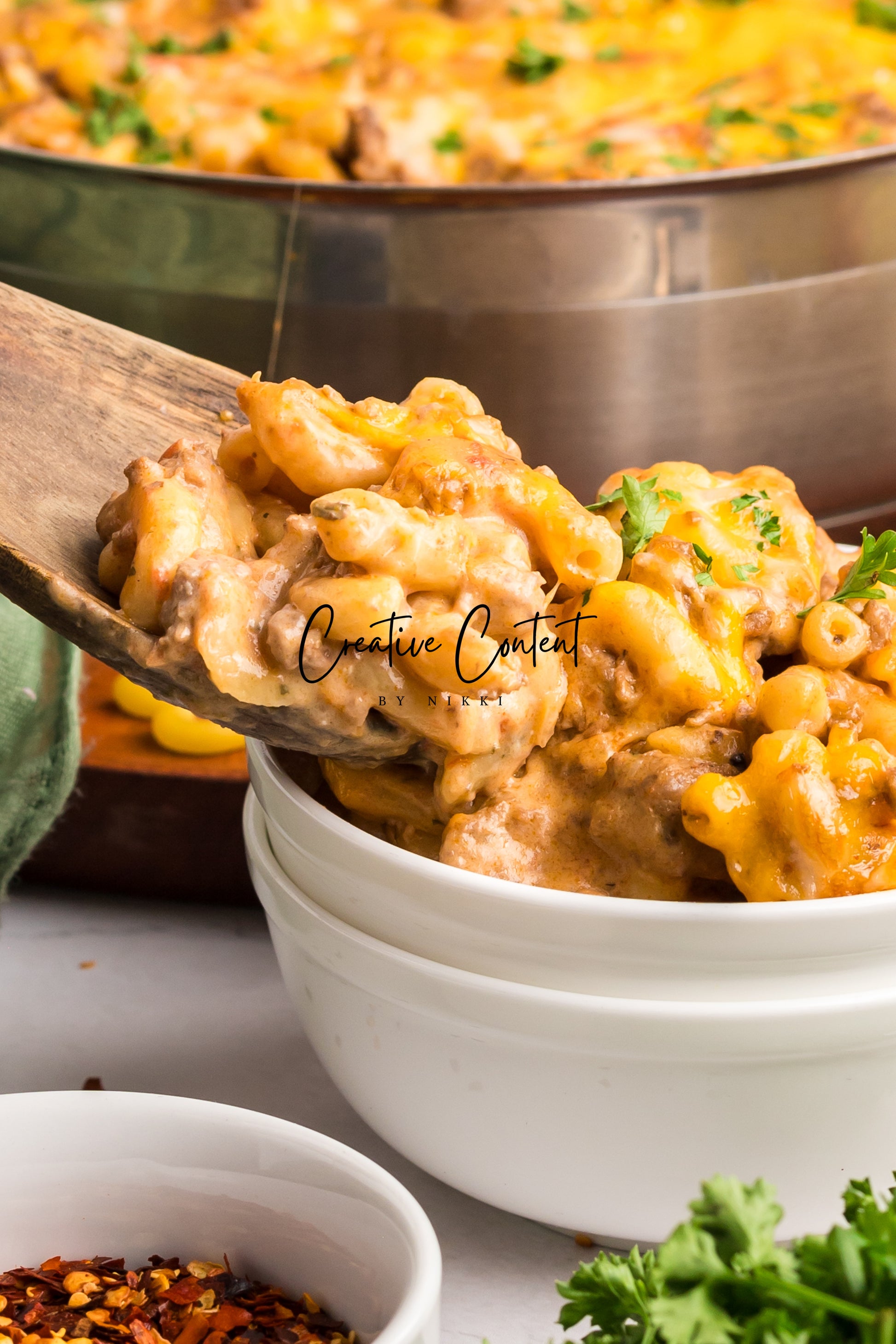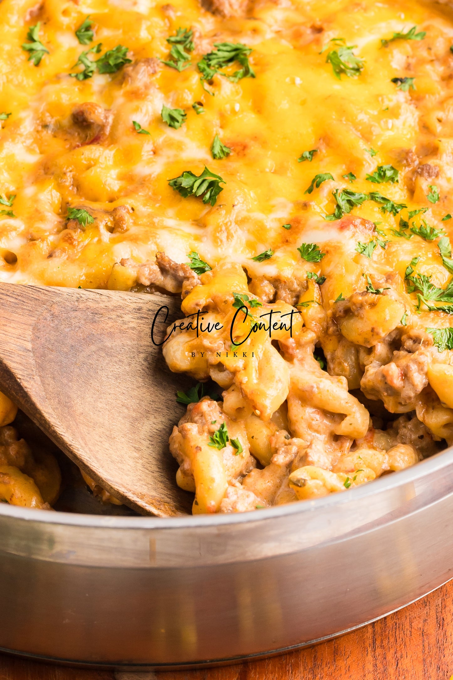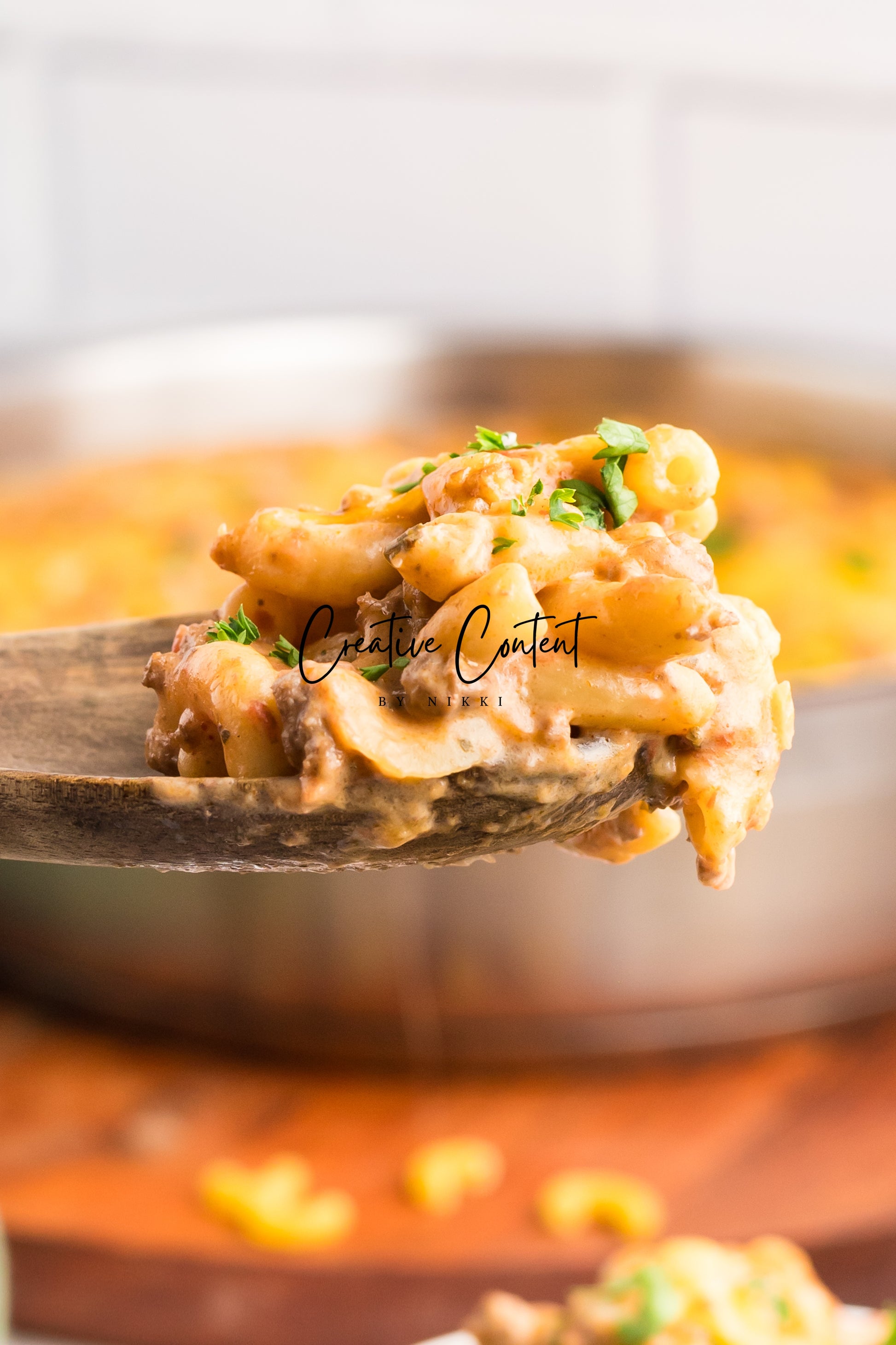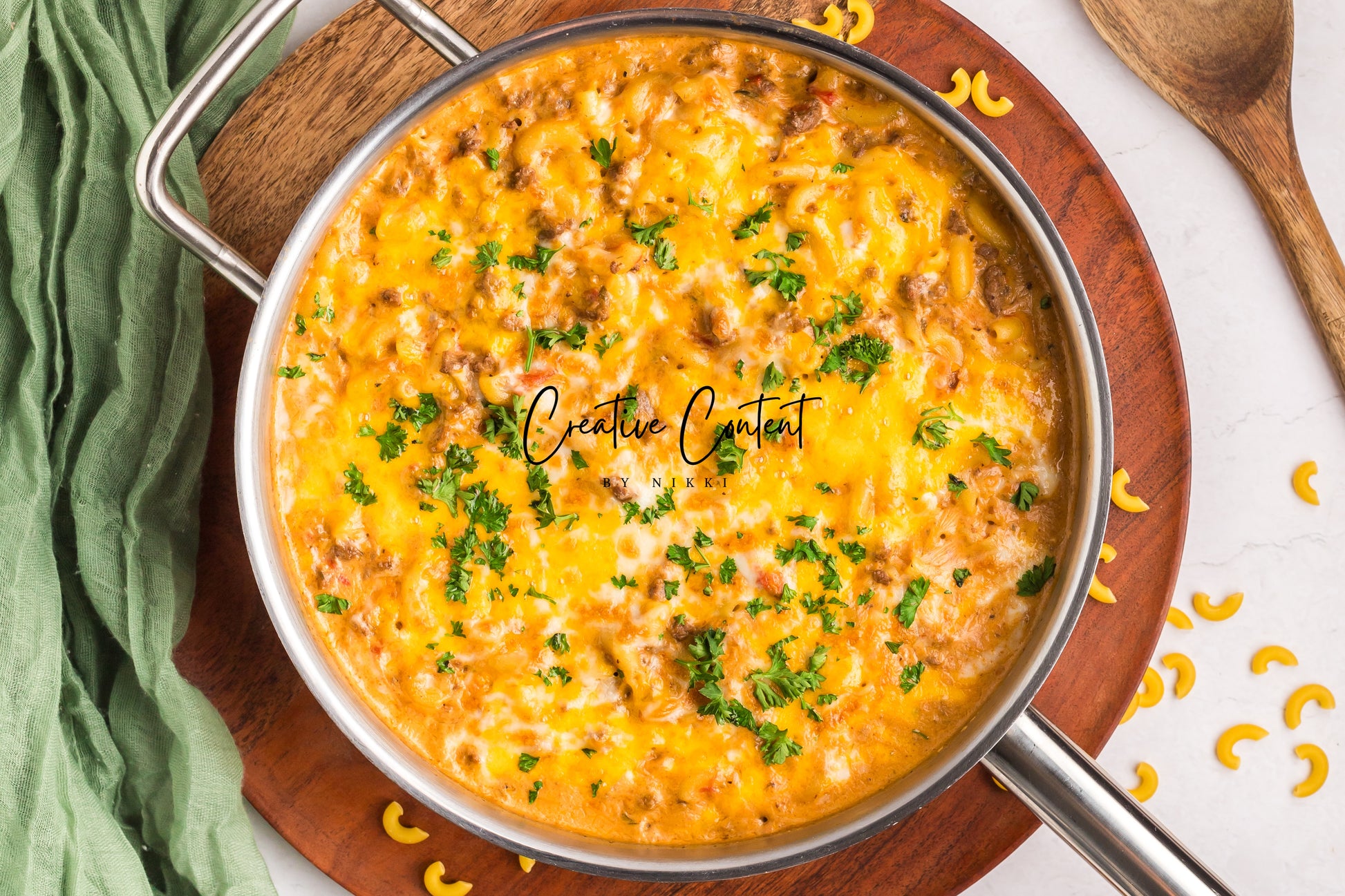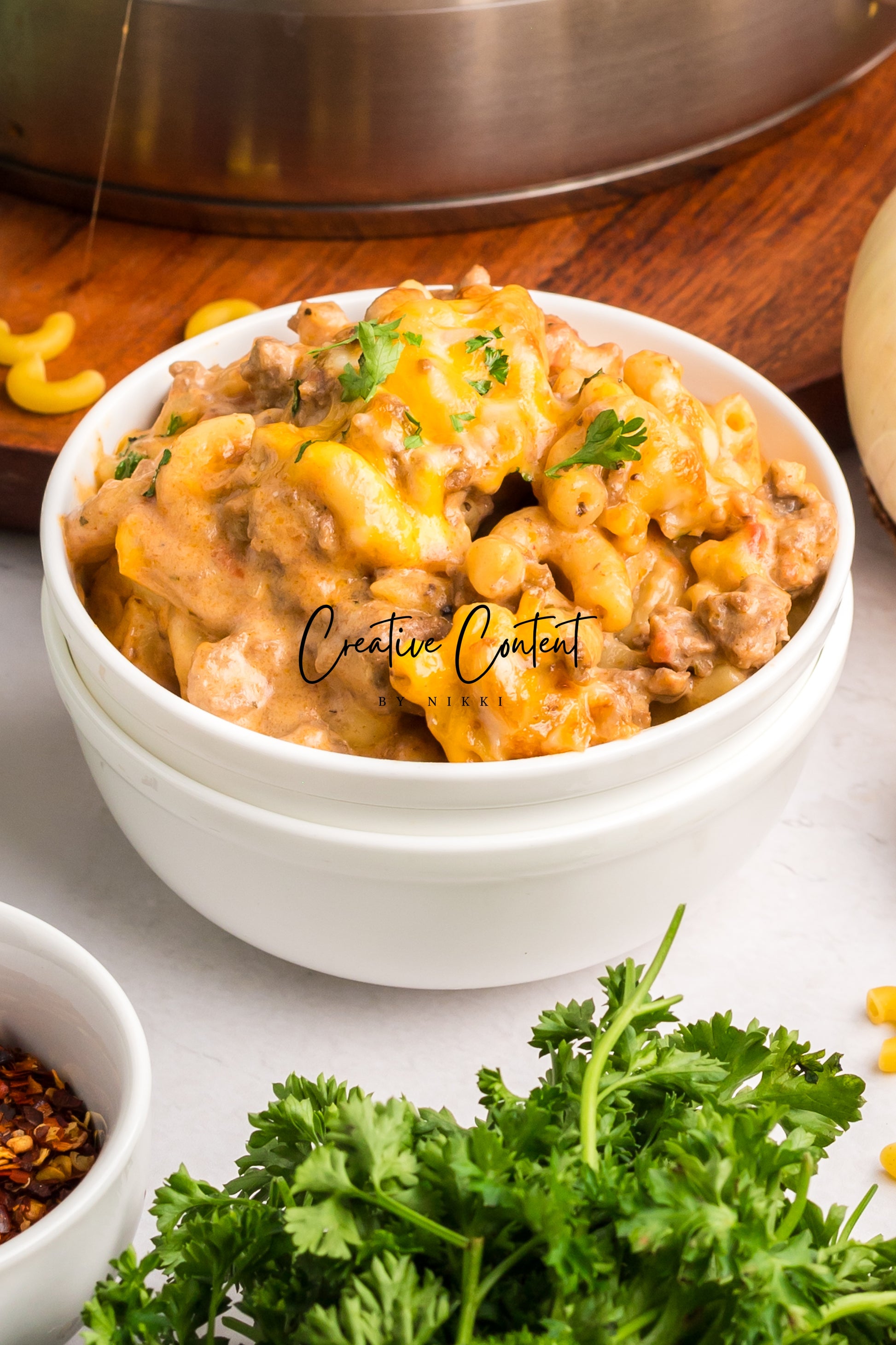 - Featured Ingredients; ground beef, yellow onion, seasonings, beef broth, petite diced tomatoes, Better Than Bouillon, elbow macaroni, ketchup, Worcestershire sauce, cream cheese, sour cream, whole milk, cheddar cheese, mozzarella cheese, and parsley