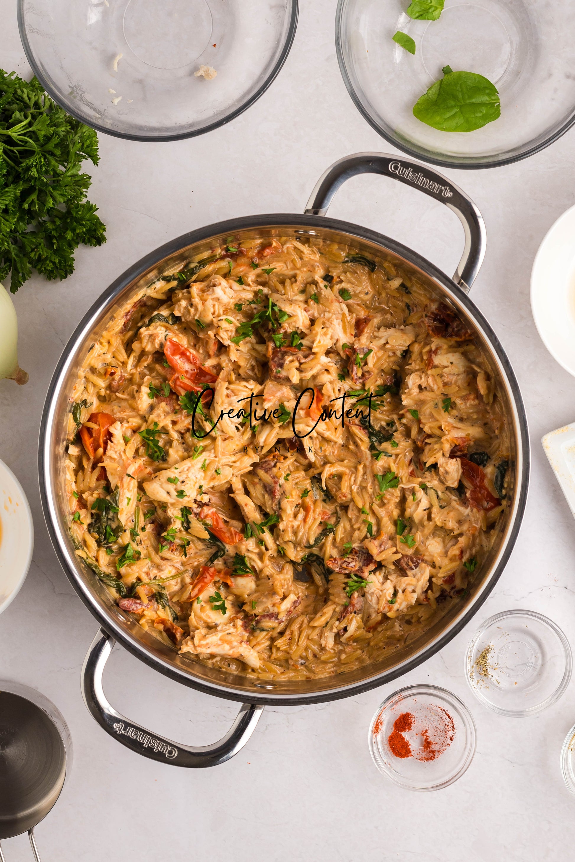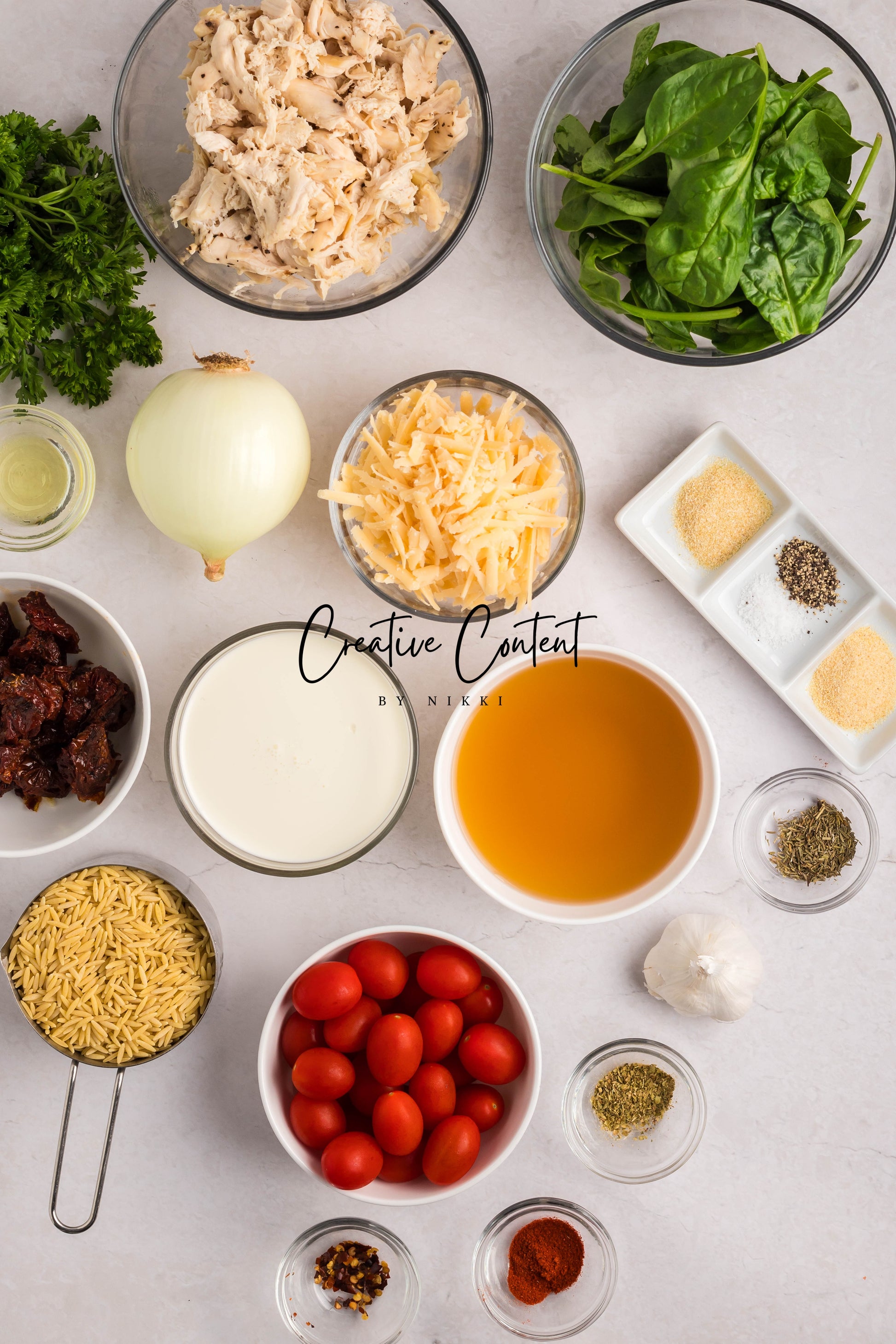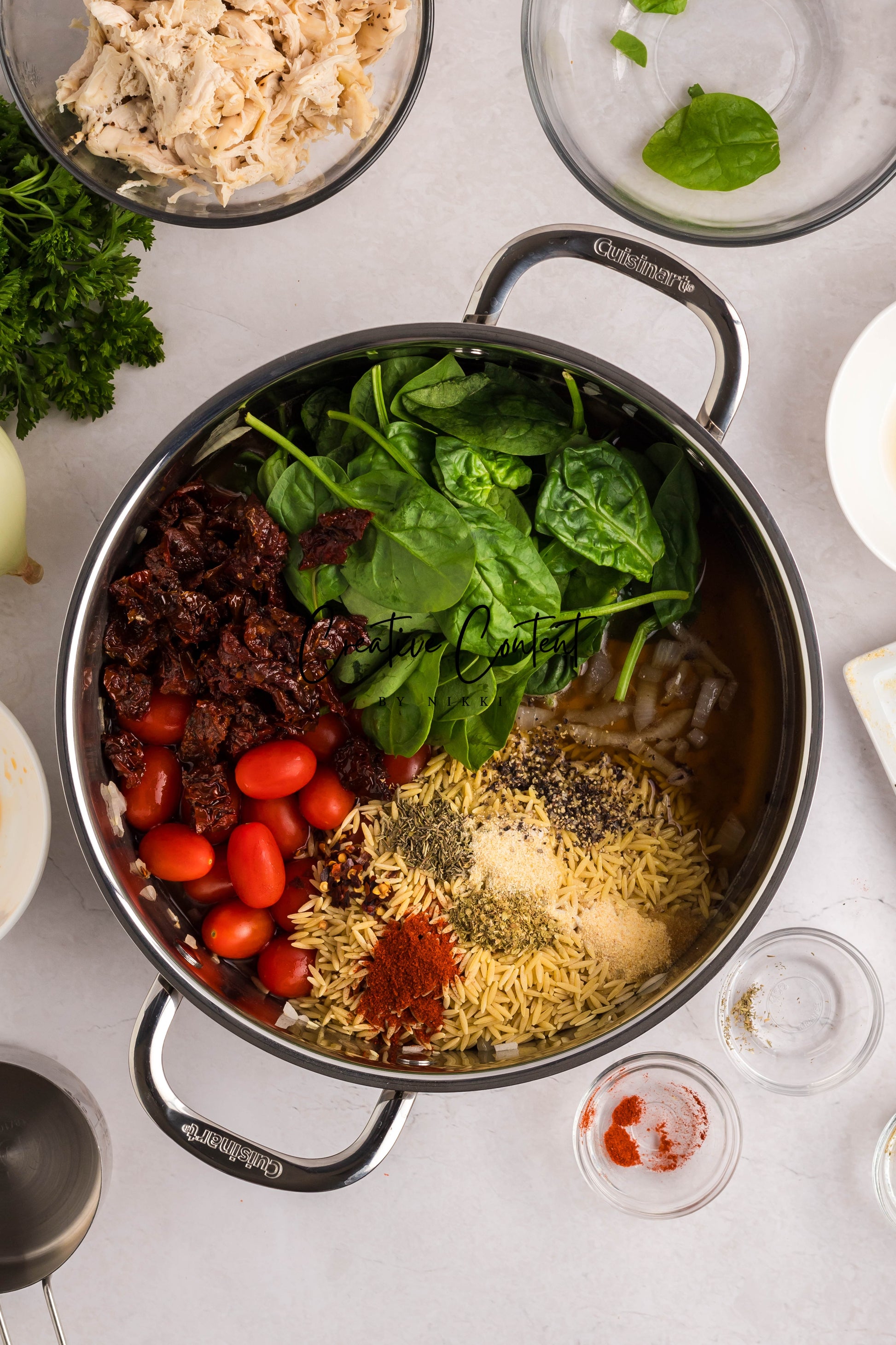 - Featured Ingredients: avocado oil, yellow onion, garlic cloves, chicken broth, cherry tomatoes, baby spinach, sun-dried tomatoes, orzo, seasonings, shredded chicken, heavy cream, parmesan cheese, and parsley.