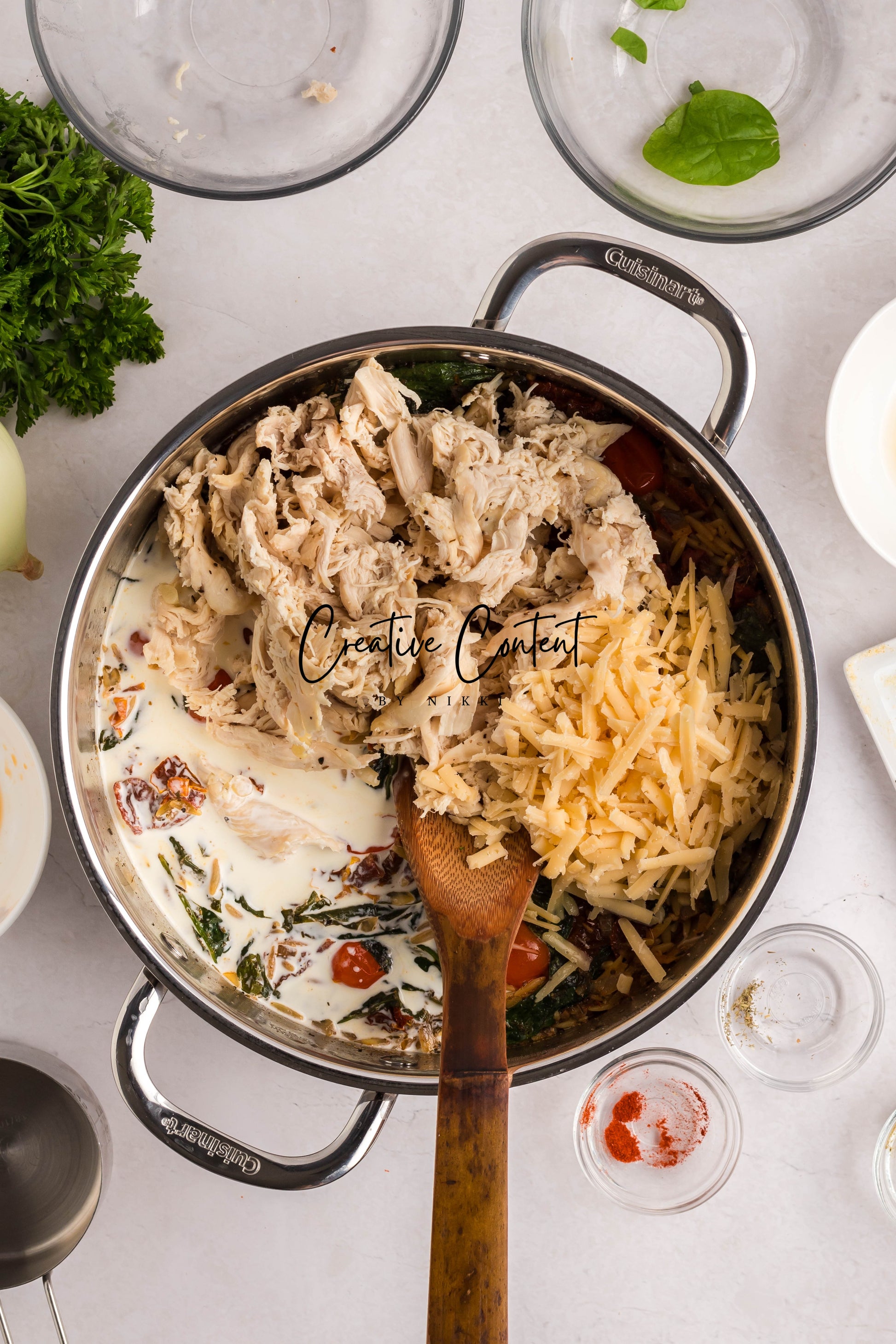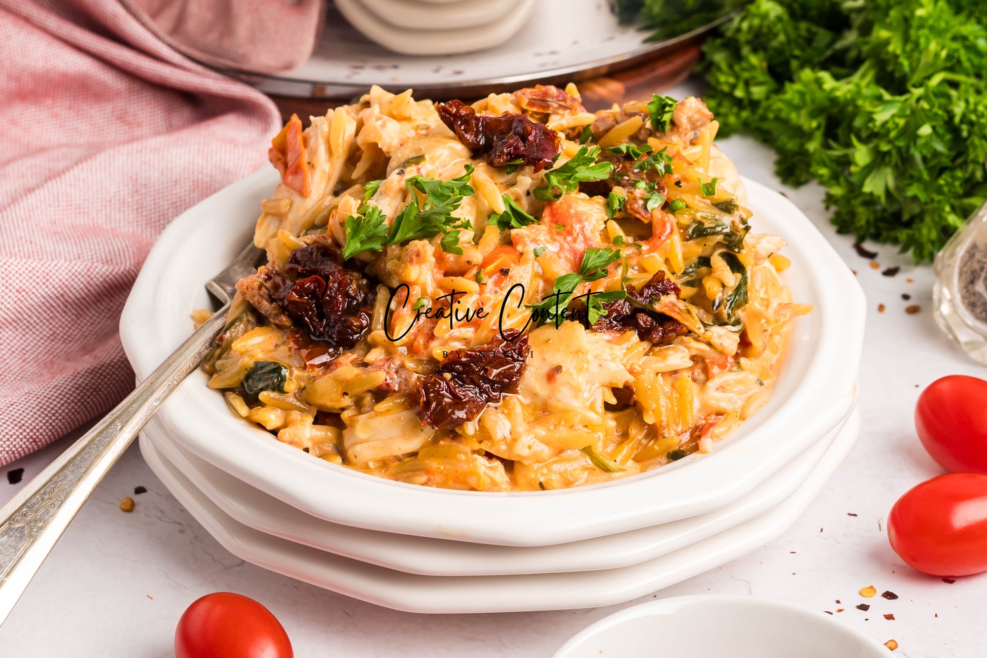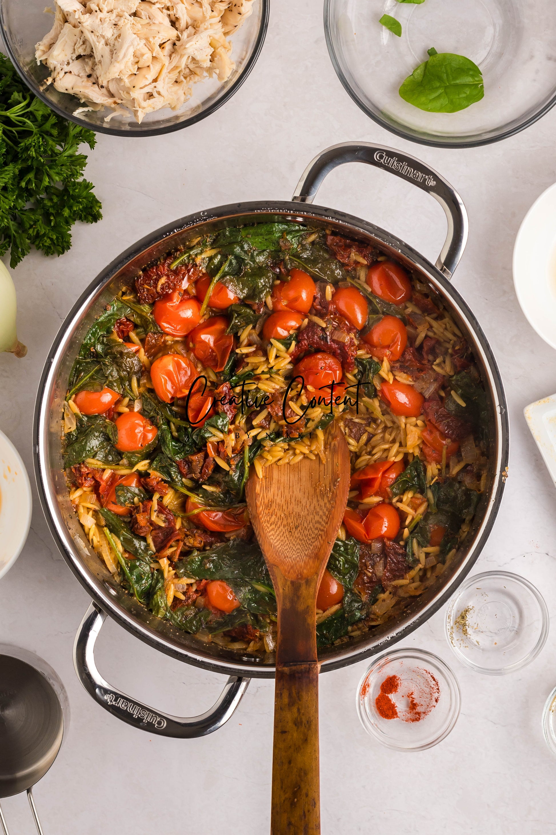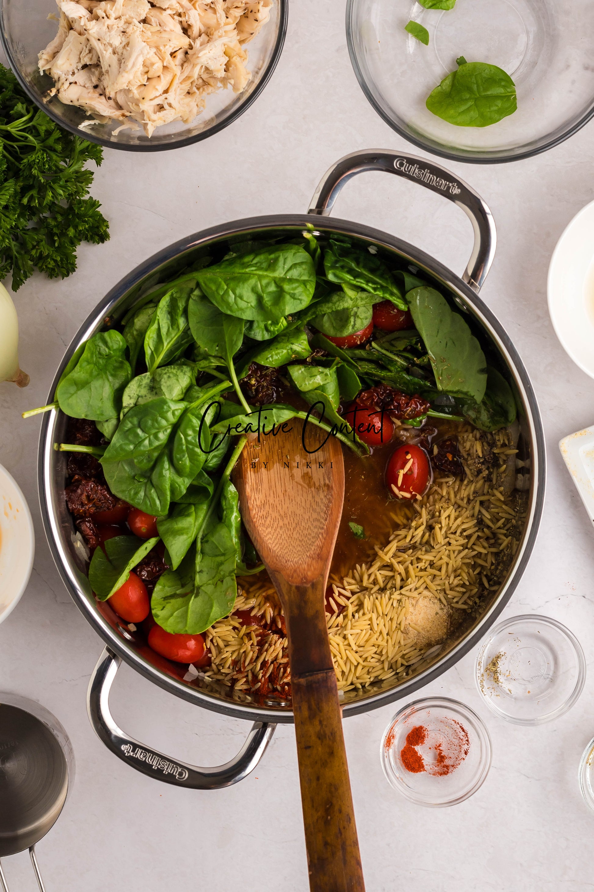 - Featured Ingredients: avocado oil, yellow onion, garlic cloves, chicken broth, cherry tomatoes, baby spinach, sun-dried tomatoes, orzo, seasonings, shredded chicken, heavy cream, parmesan cheese, and parsley.