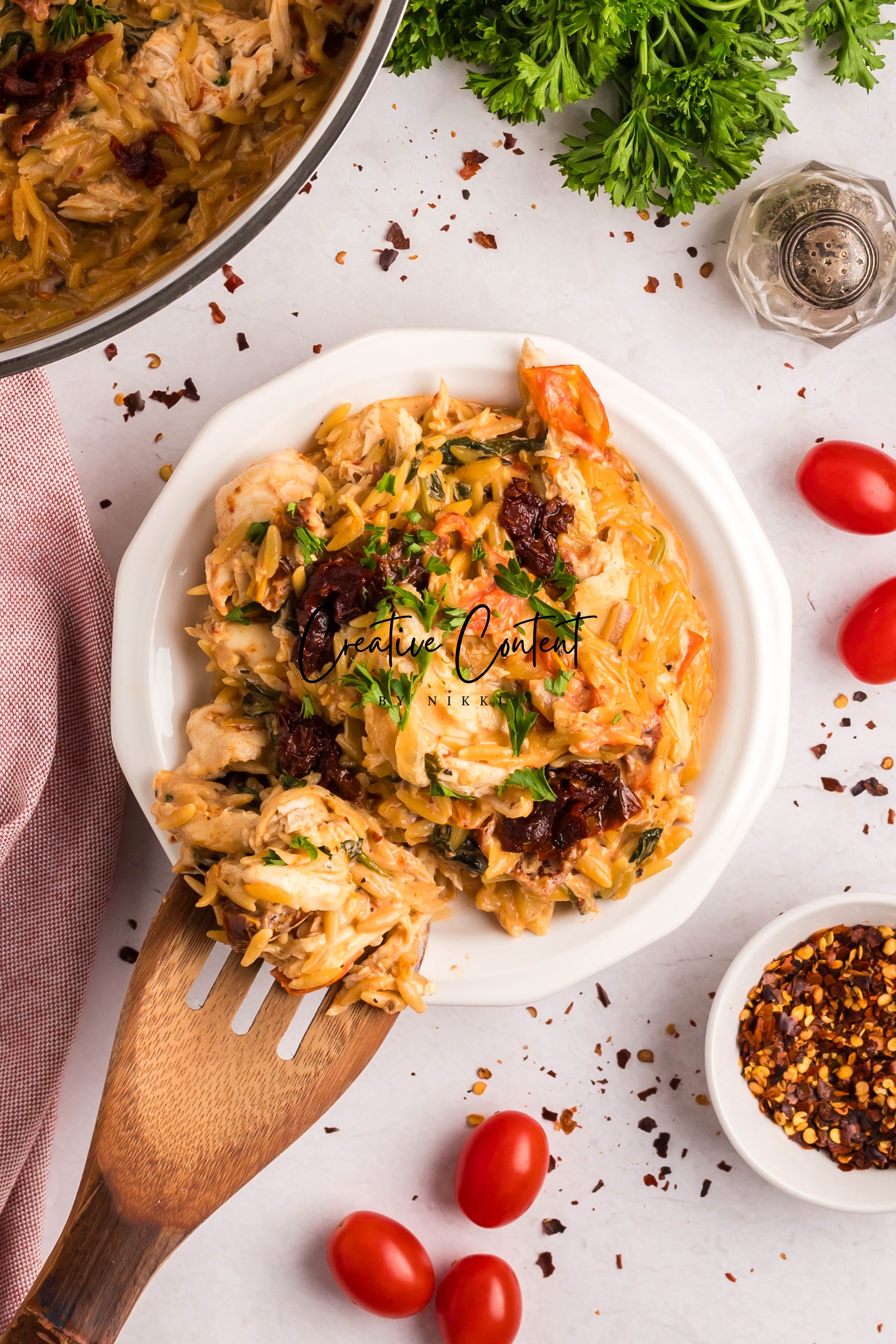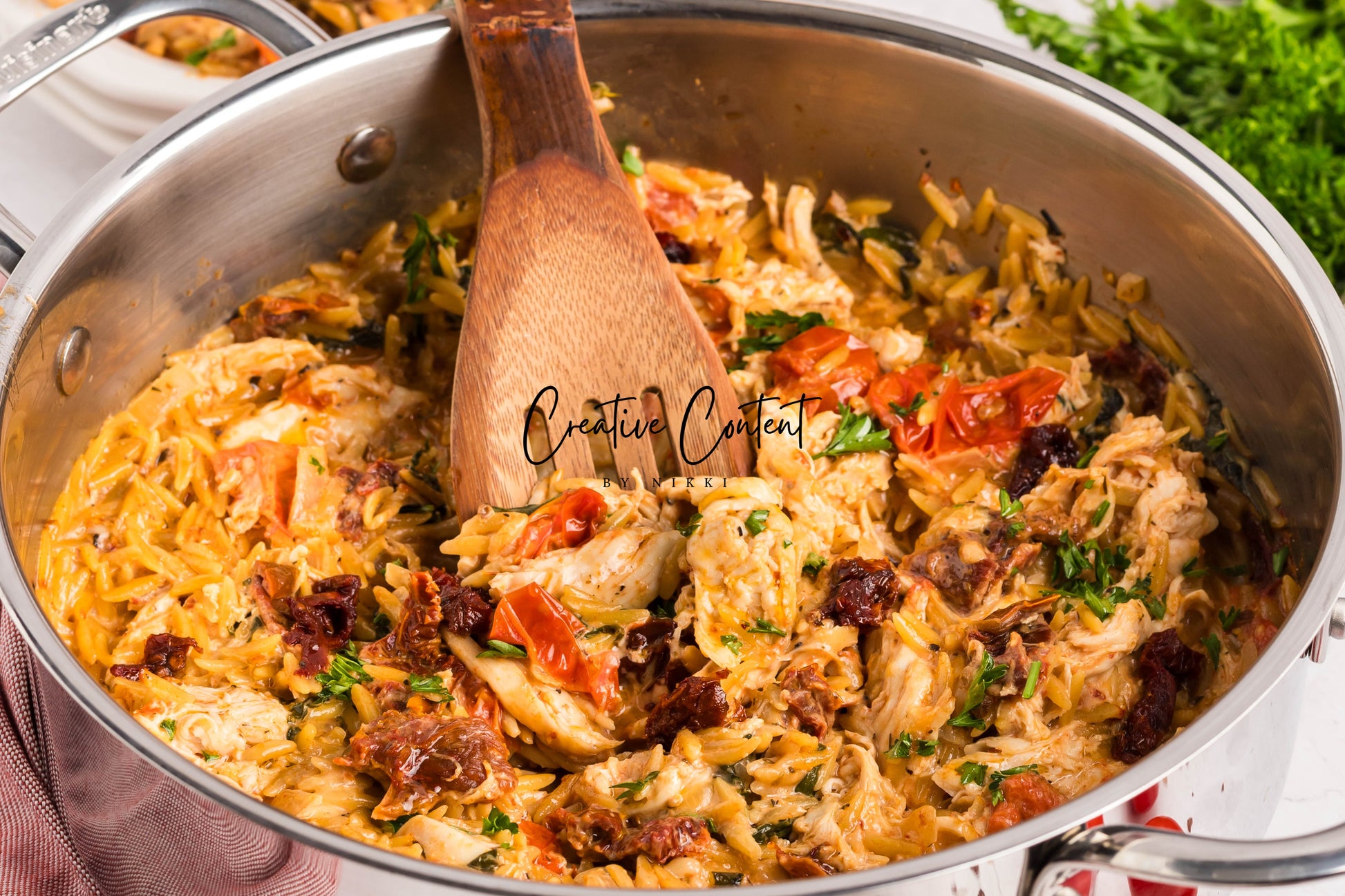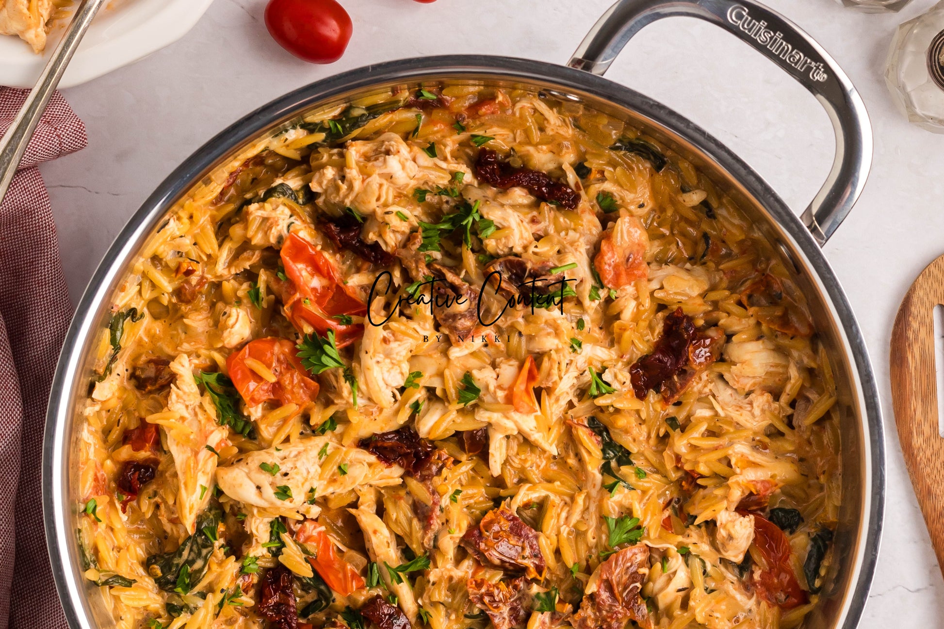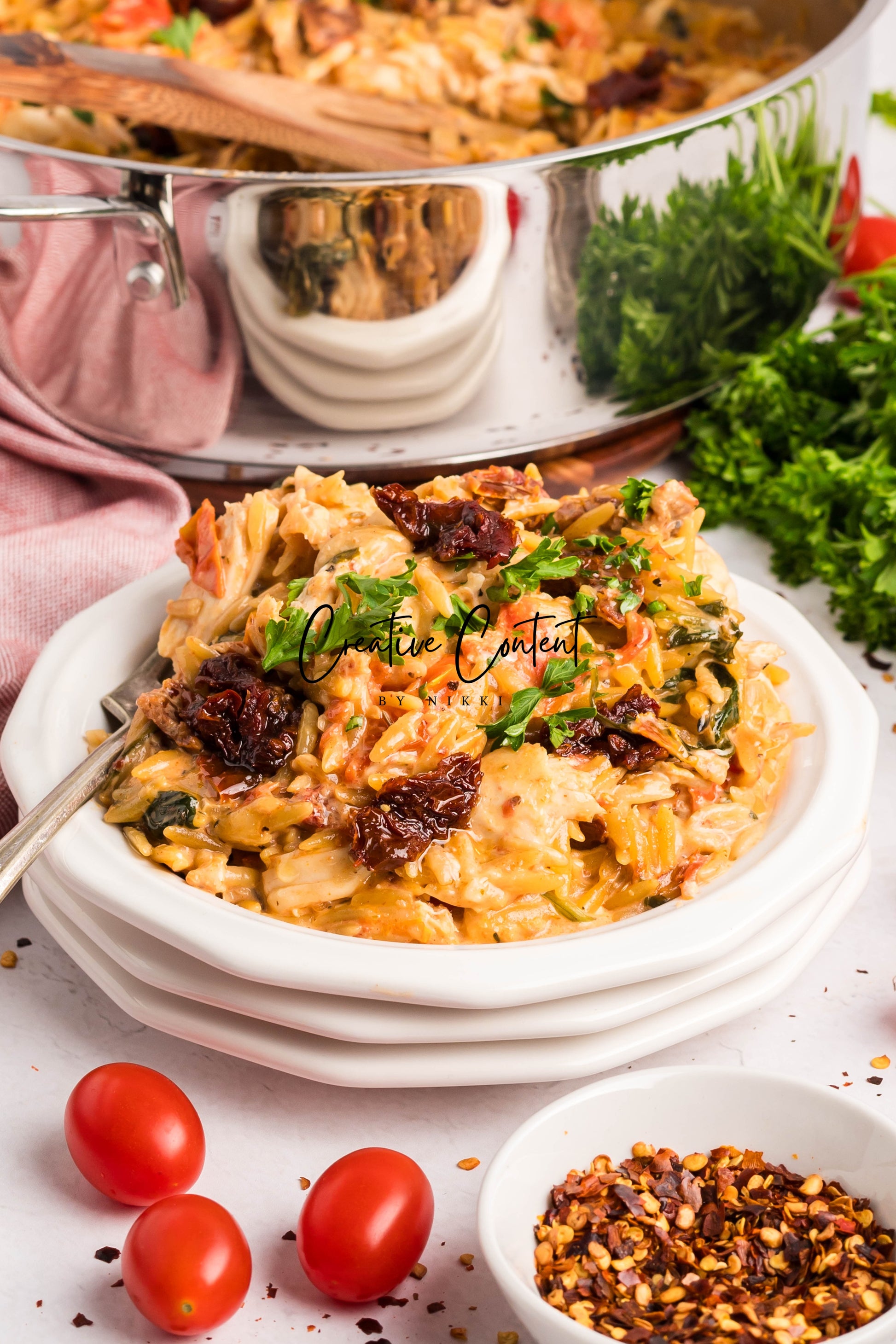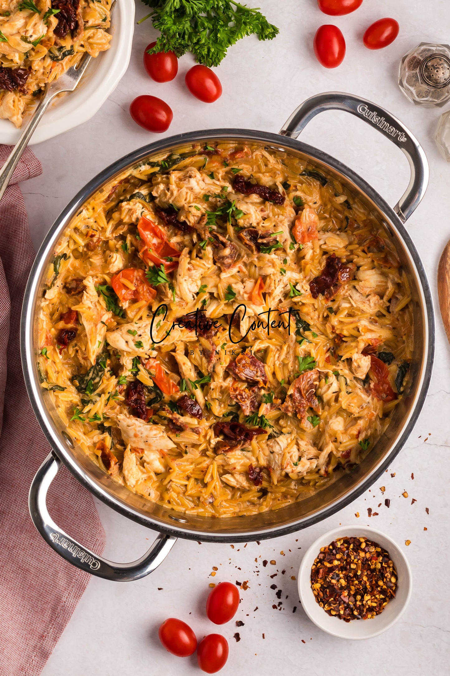This one-pot chicken and orzo is rich and flavorful, with sun-dried tomatoes, fresh garlic, and parmesan cheese. It's a Tuscan-style dish that's sure to please everyone. The orzo absorbs the savory juices from the chicken, creating a creamy base with every bite.