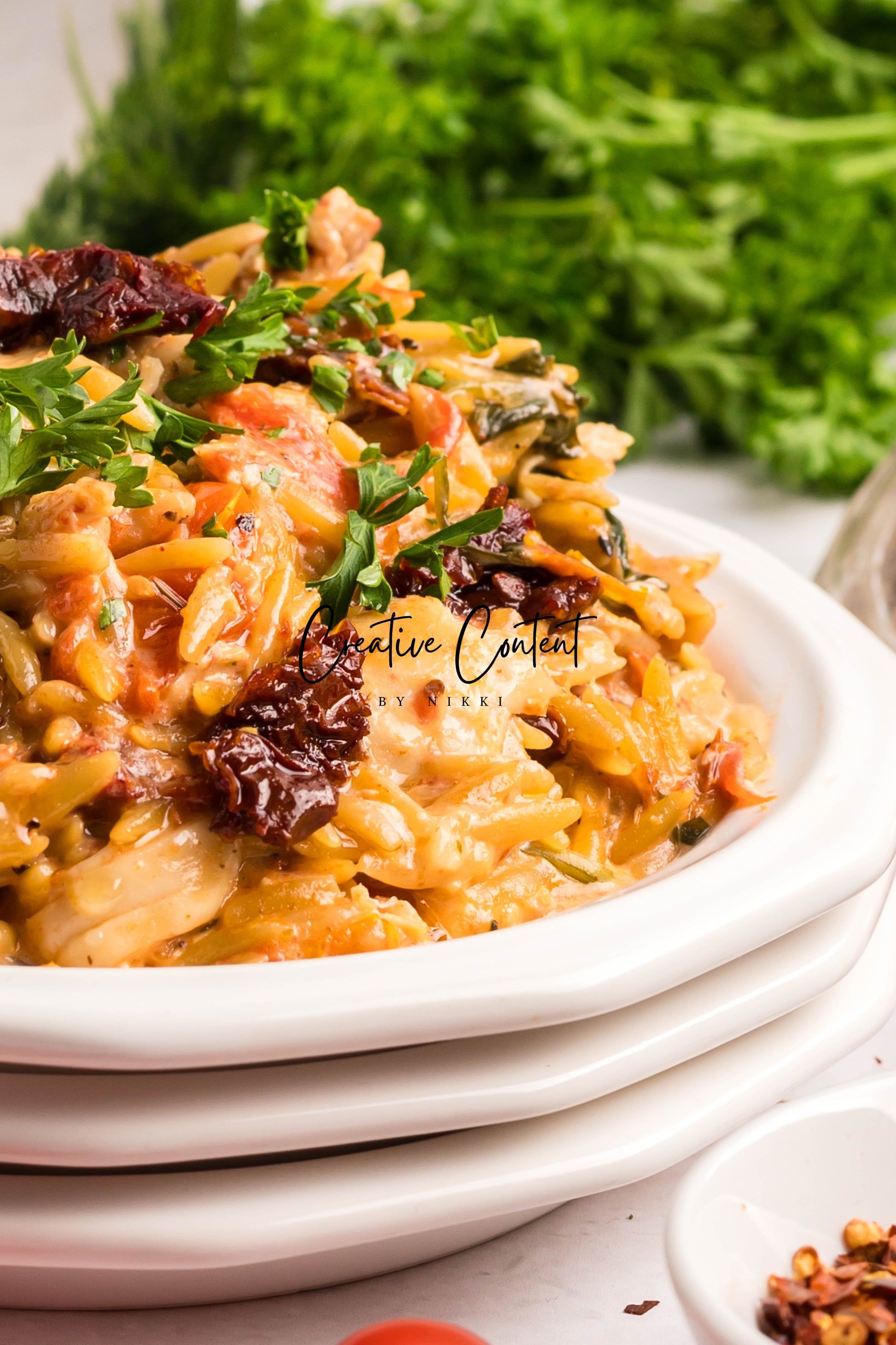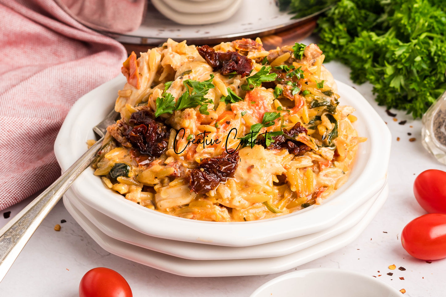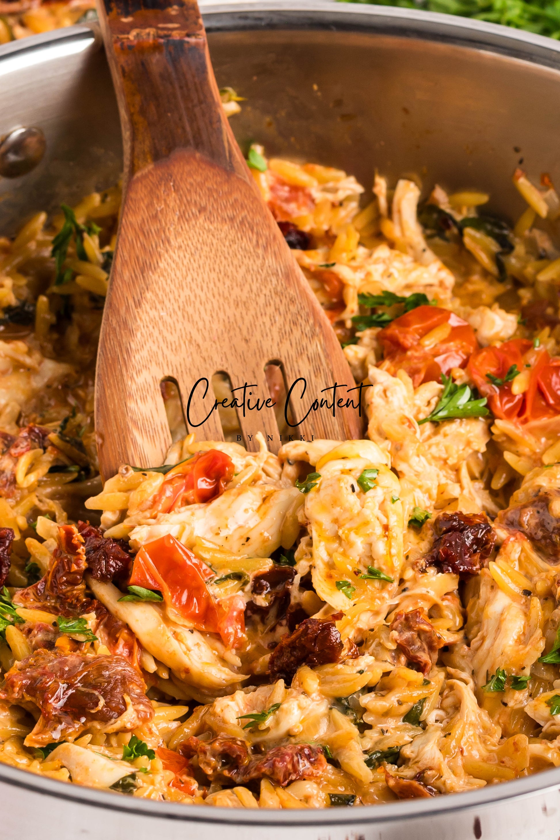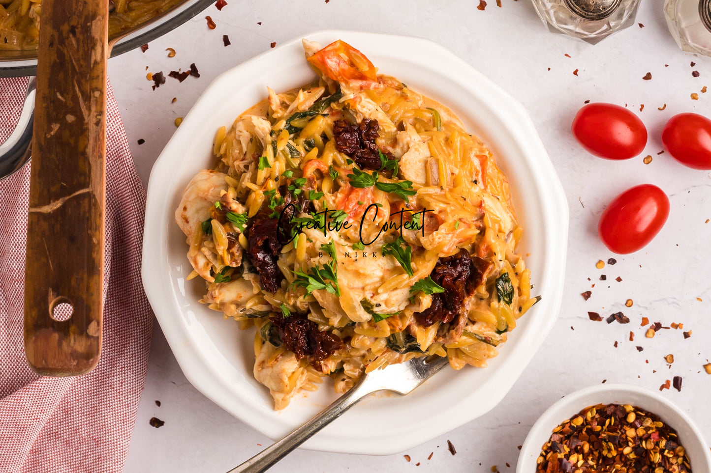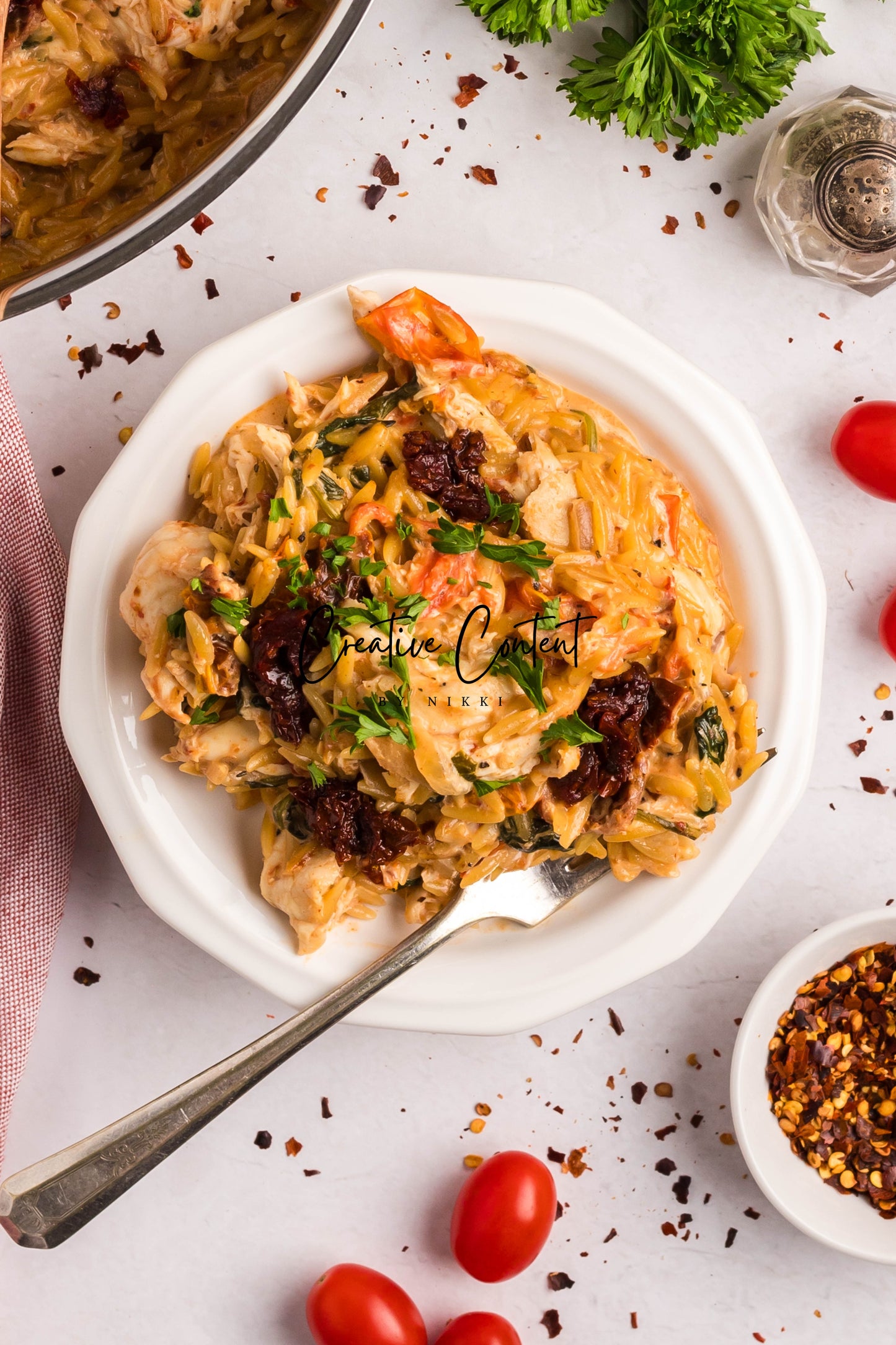 This one-pot chicken and orzo is rich and flavorful, with sun-dried tomatoes, fresh garlic, and parmesan cheese. It's a Tuscan-style dish that's sure to please everyone. The orzo absorbs the savory juices from the chicken, creating a creamy base with every bite.