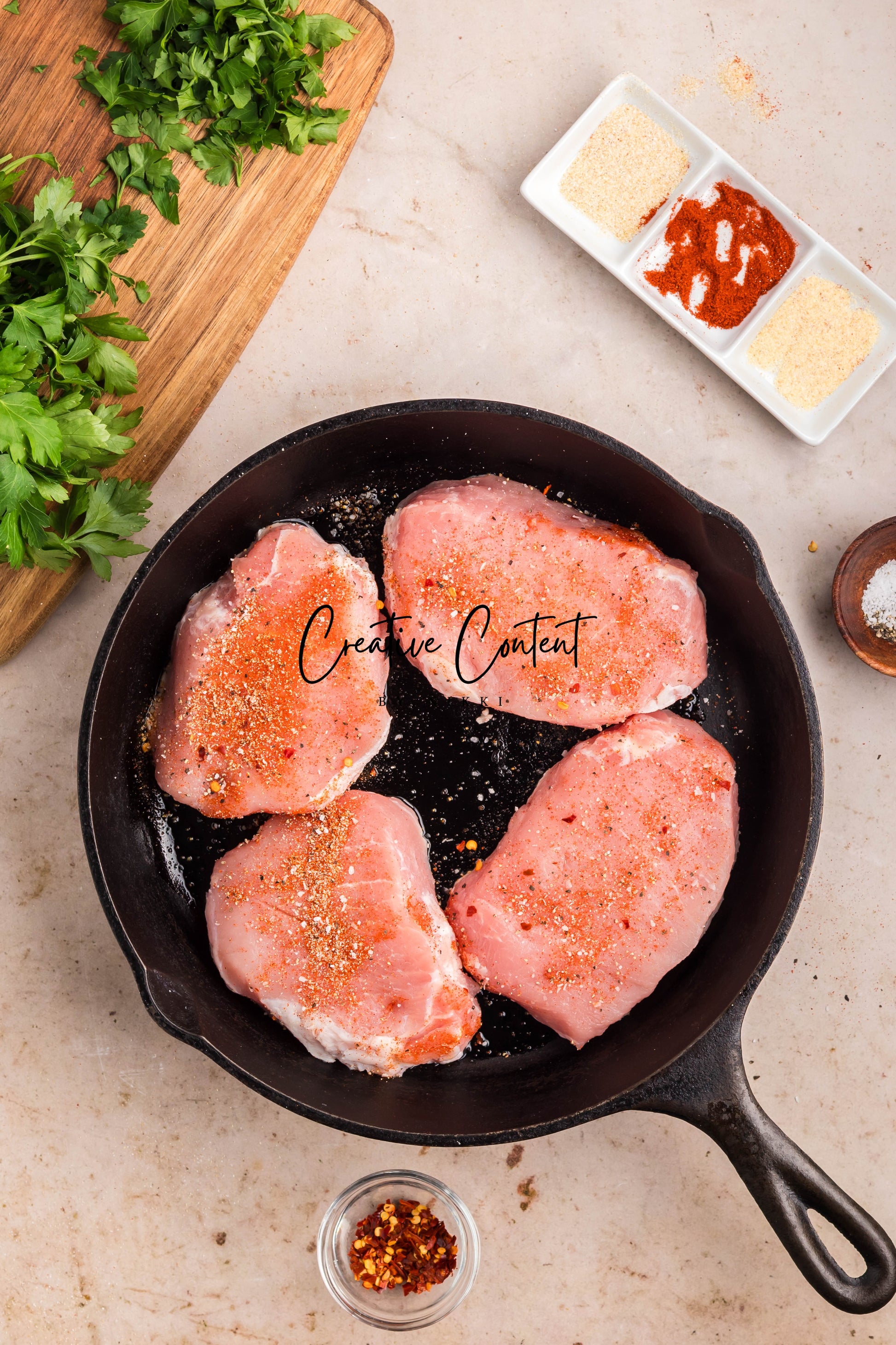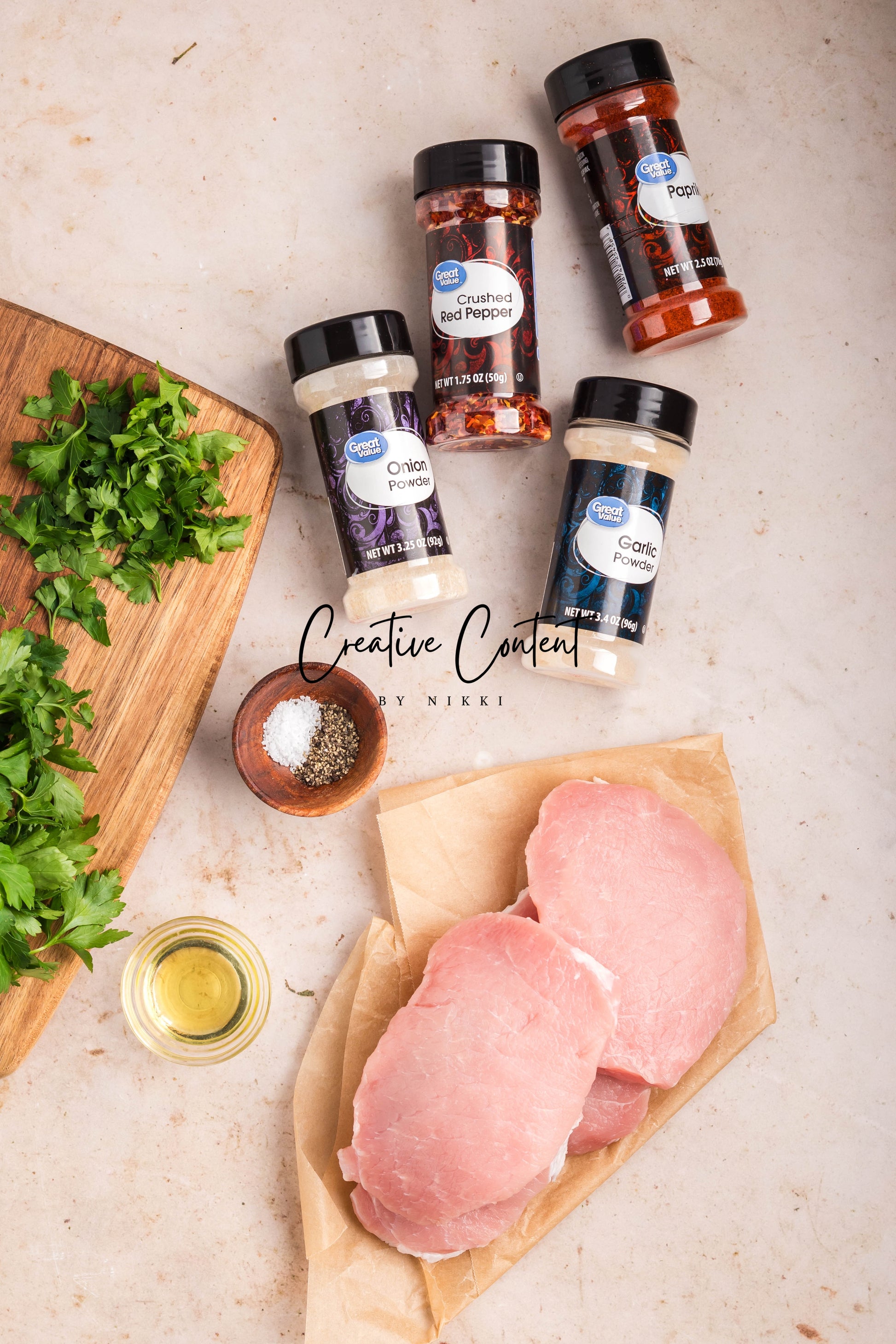 - Ingredients: Pork chops, avocado oil, paprika, red pepper flakes, onion powder, garlic powder, salt, pepper, and parsley