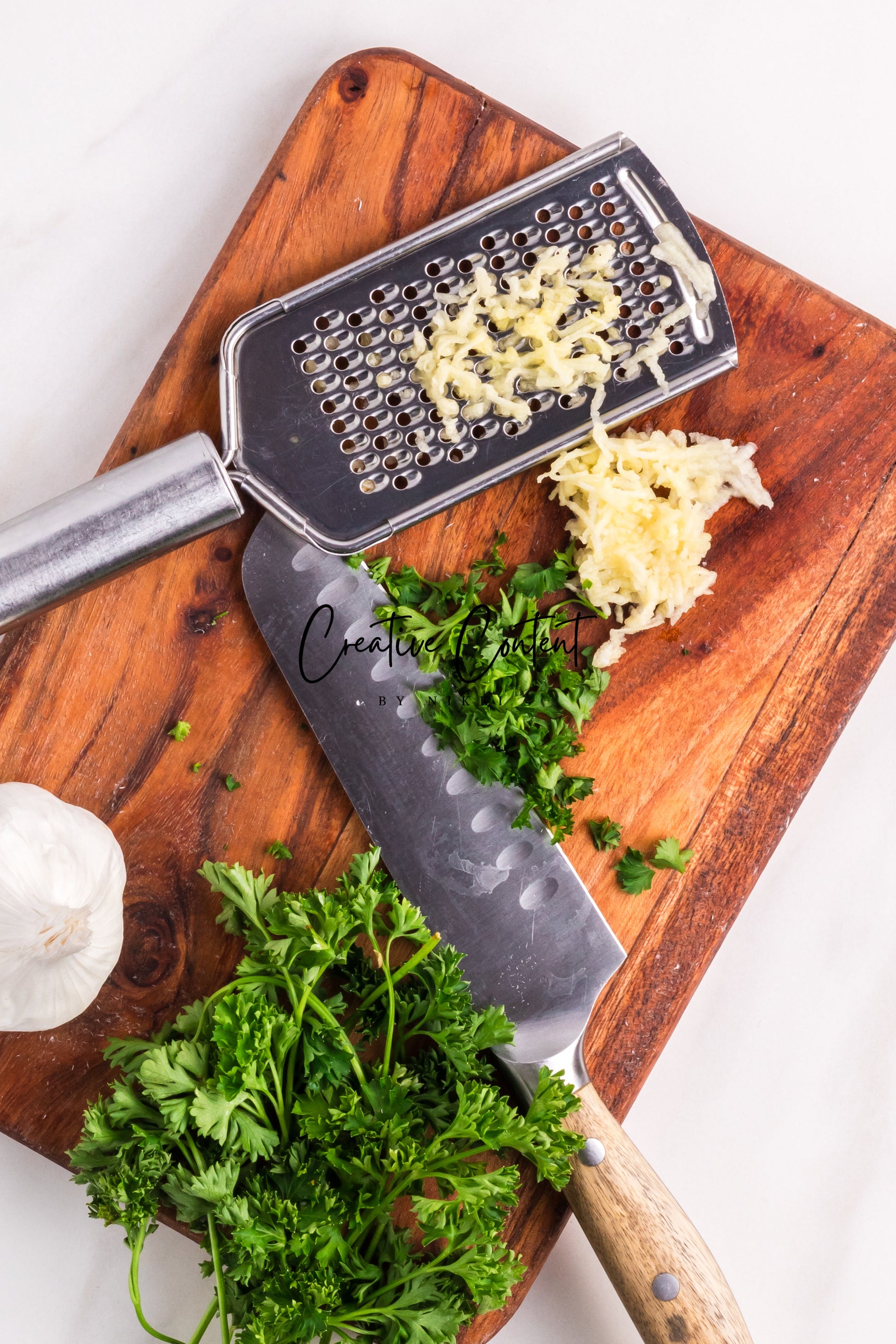 Featured Ingredients; center cut pork chops, coarse kosher salt, pepper, garlic powder, avocado oil, unsalted butter, minced garlic, rosemary sprigs, and parsley.