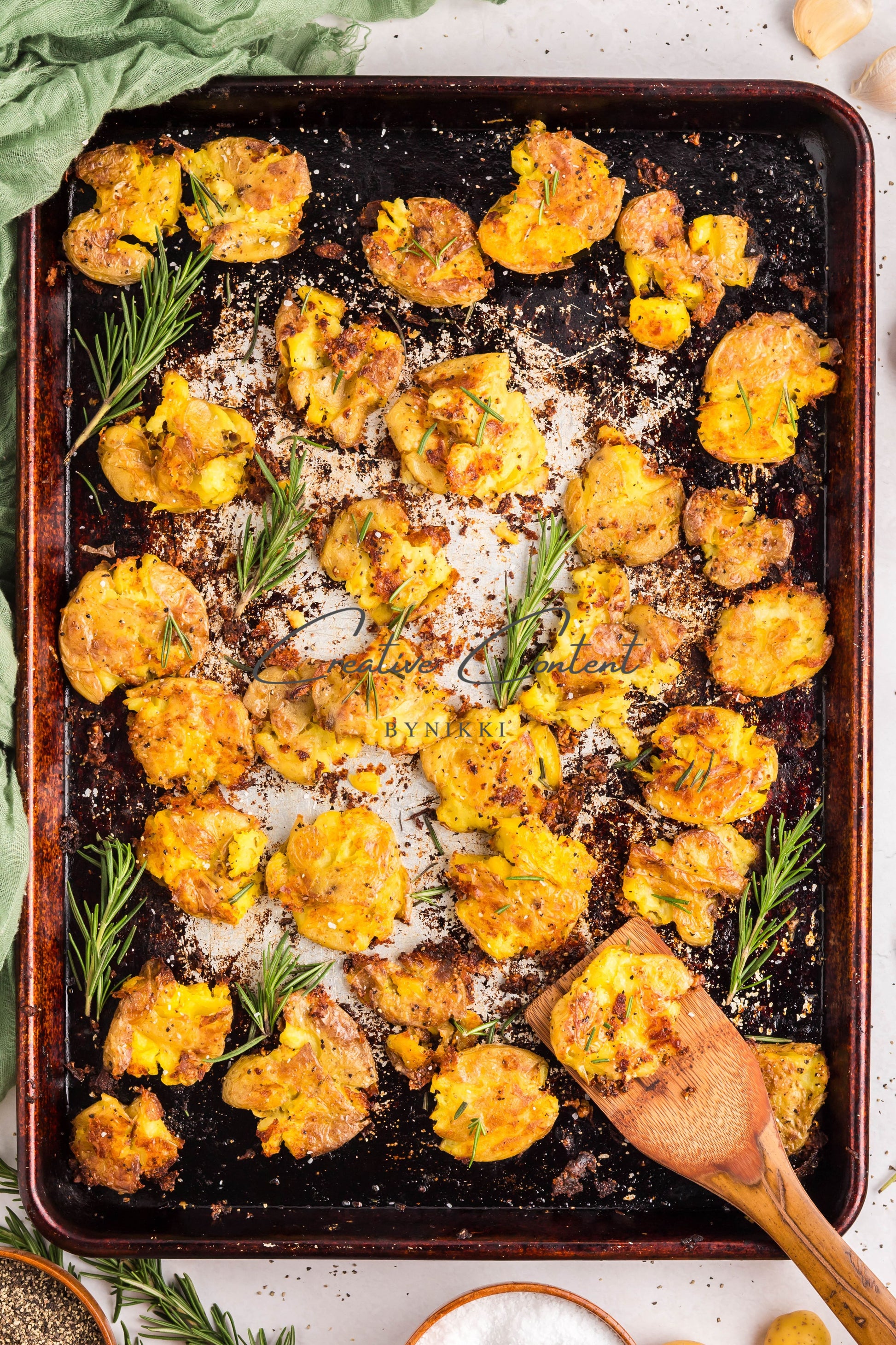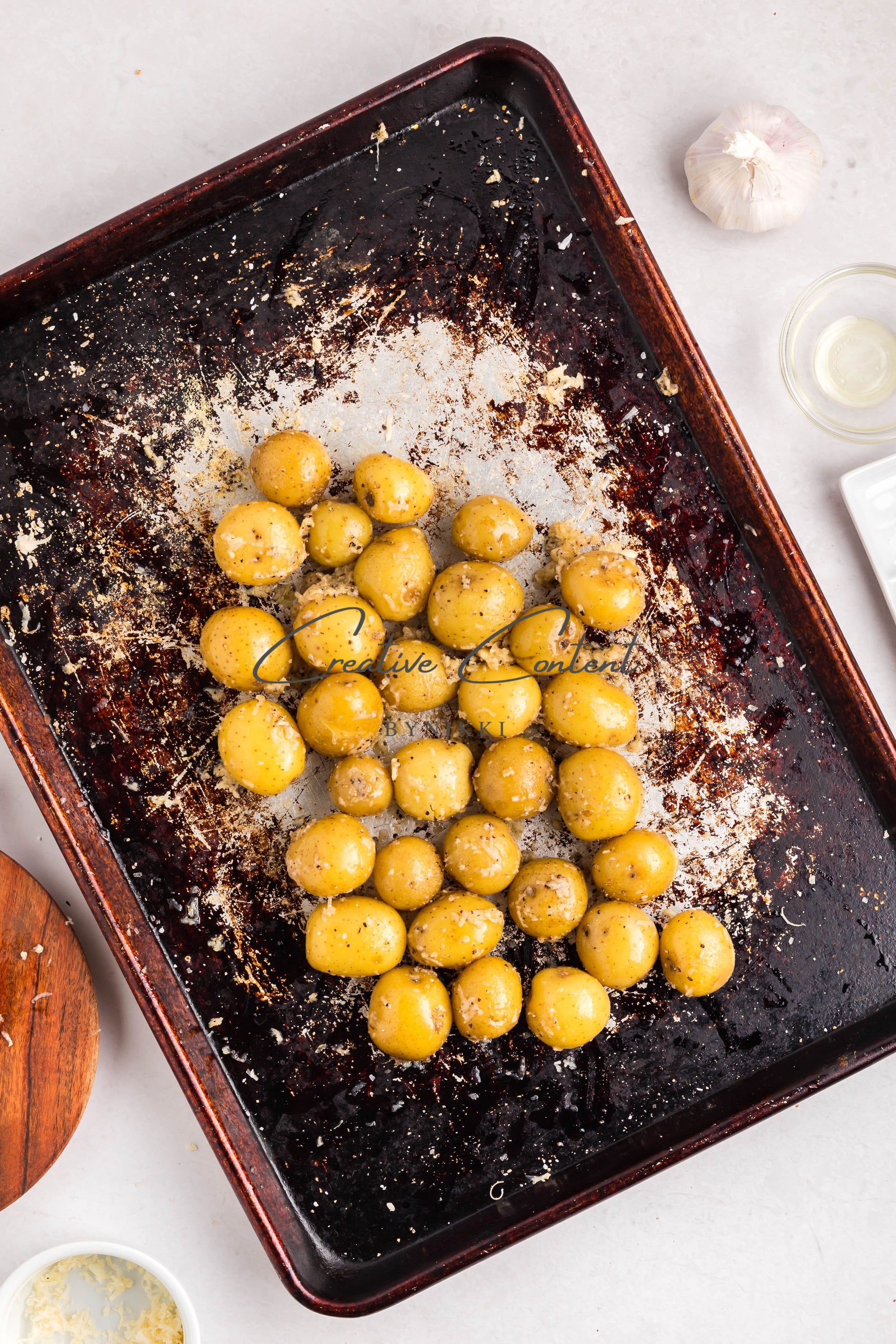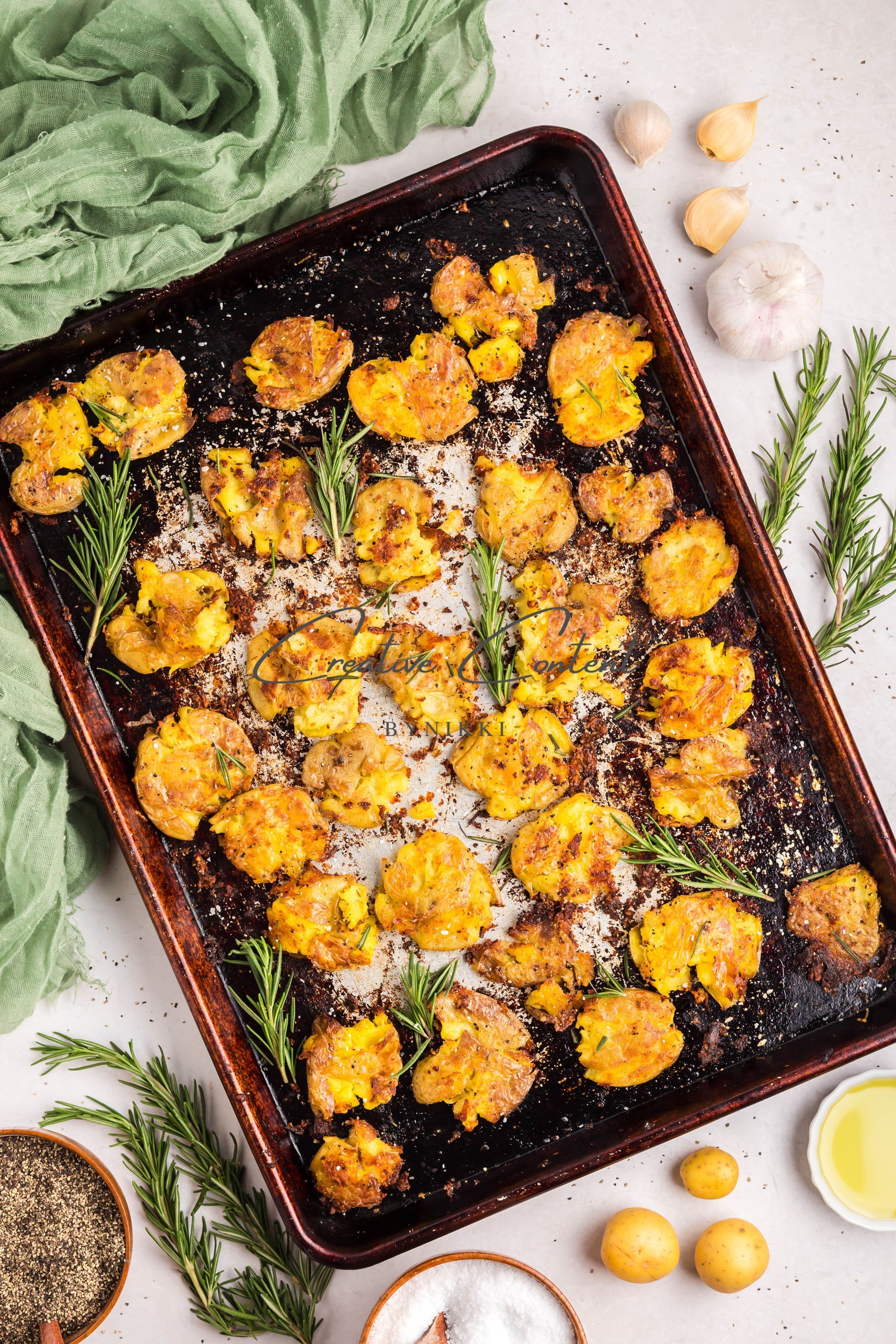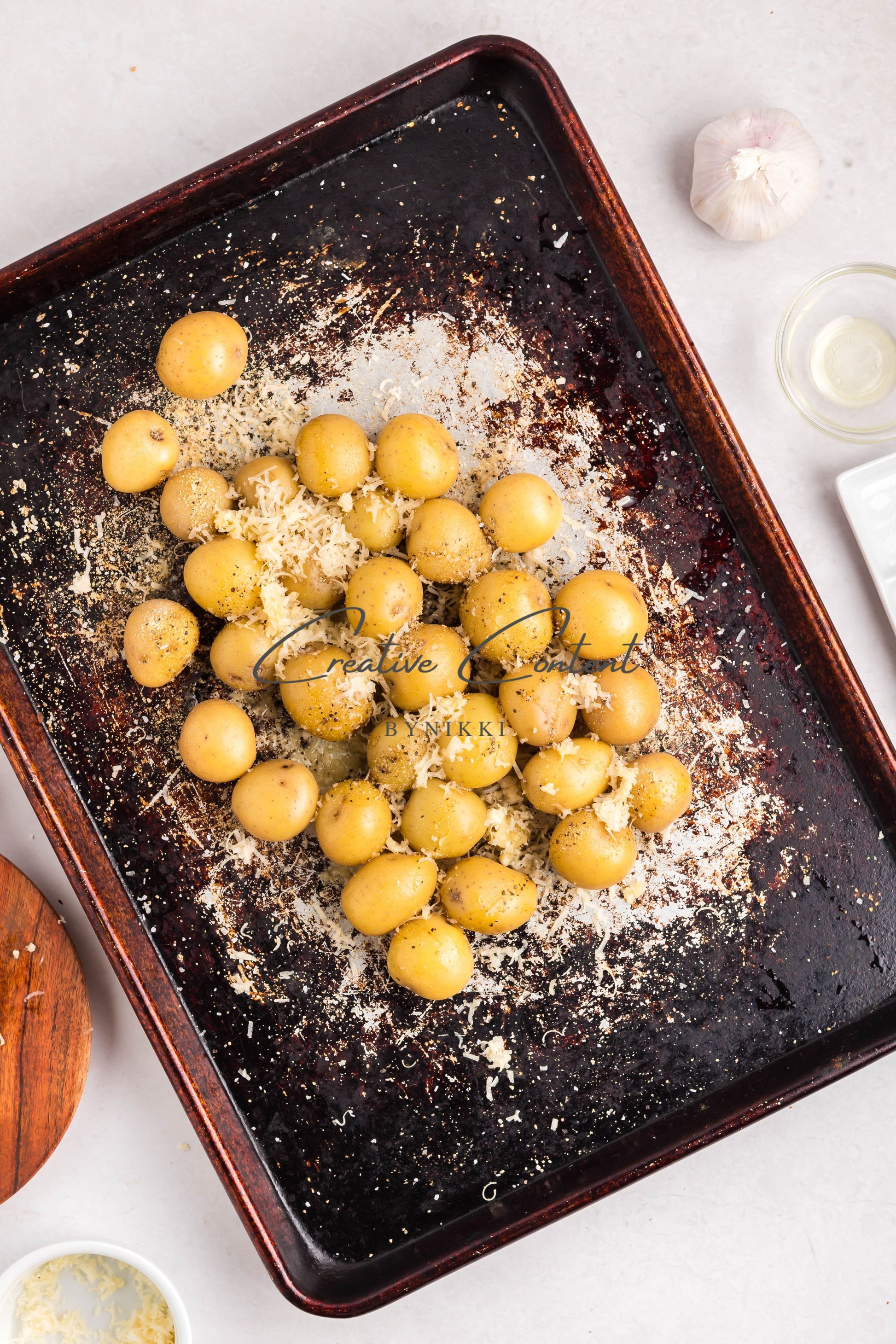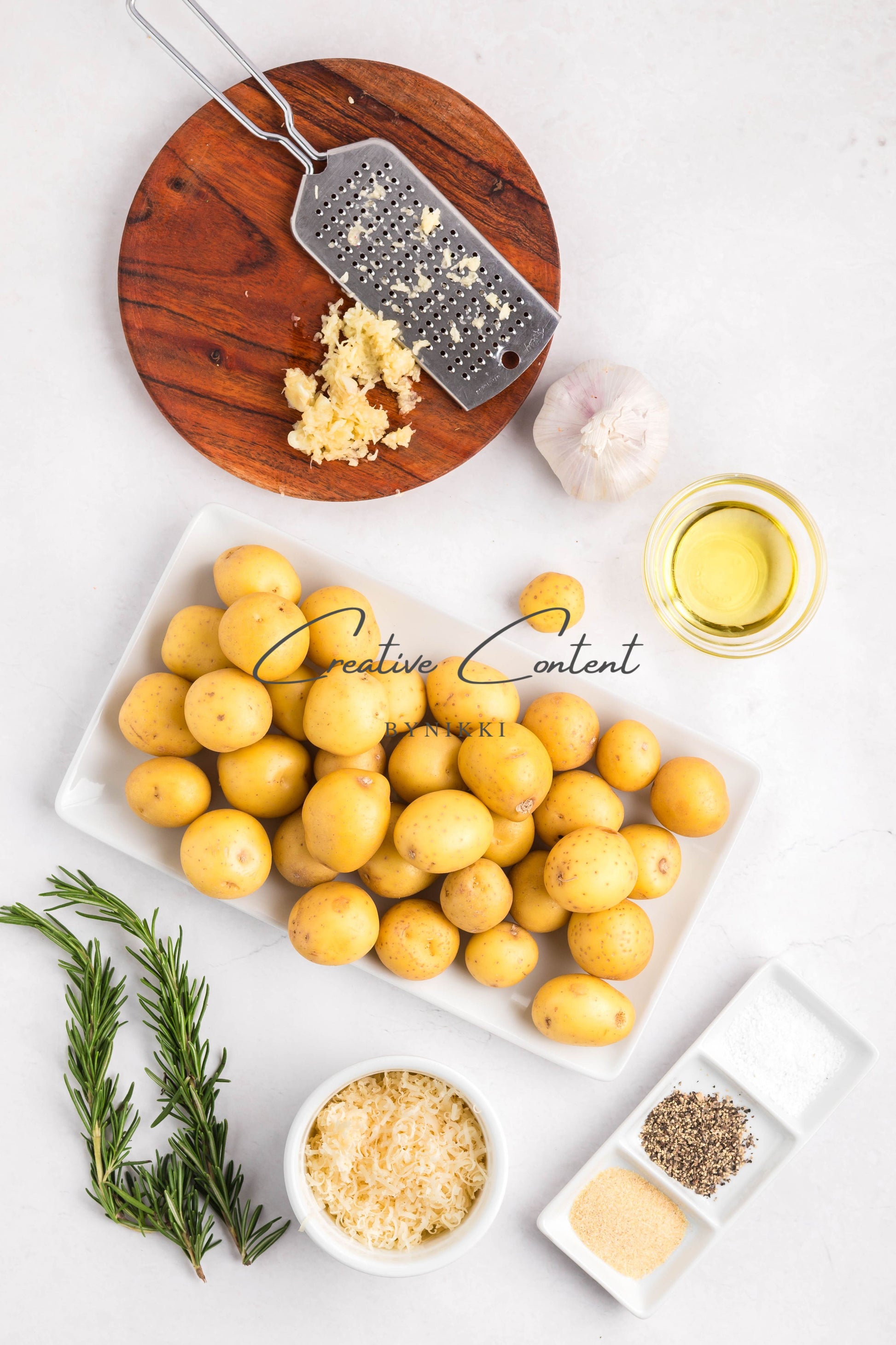 - Ingredients: baby Yukon gold potatoes, avocado oil, garlic, coarse kosher salt, black pepper, garlic powder, parmesan cheese, rosemary