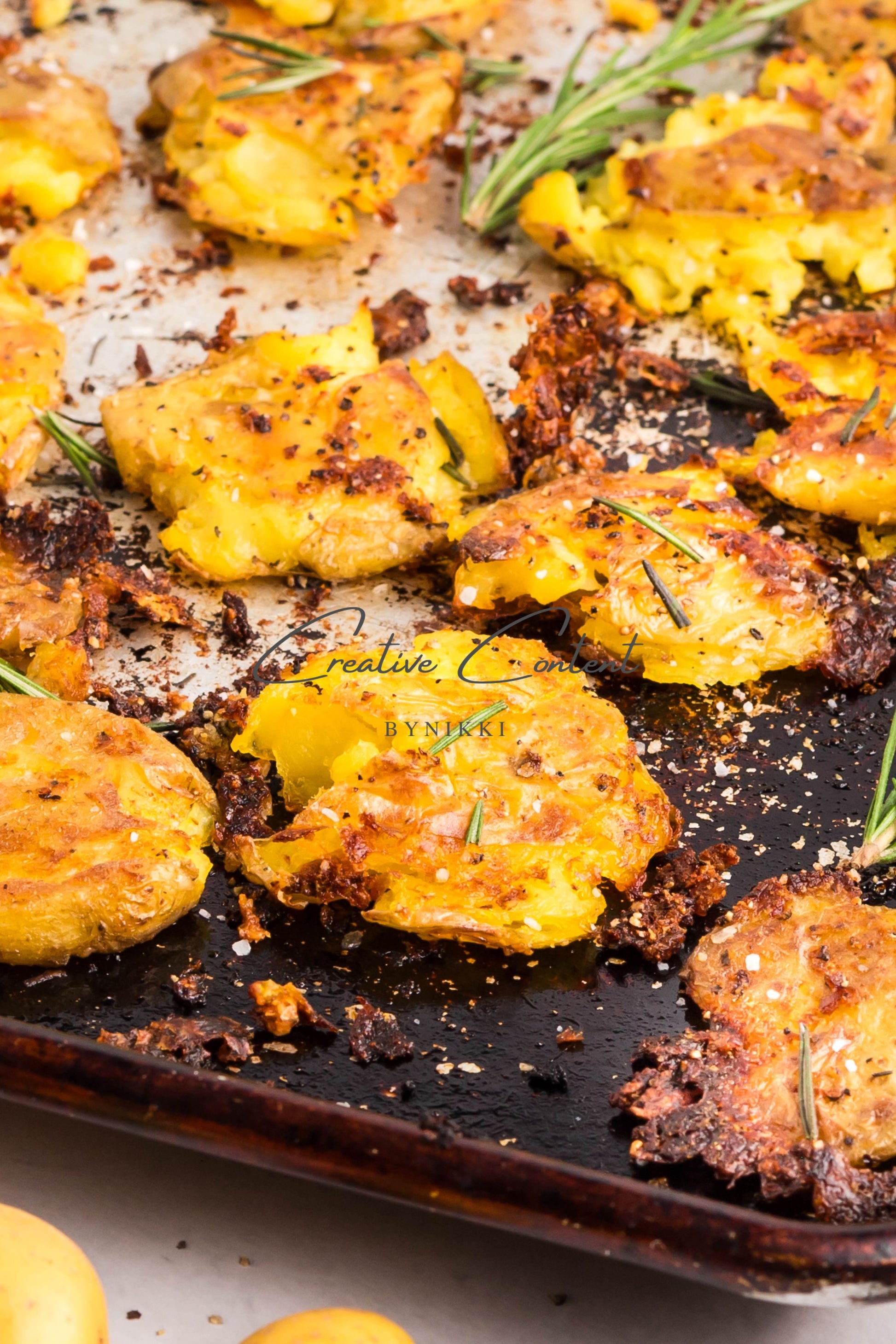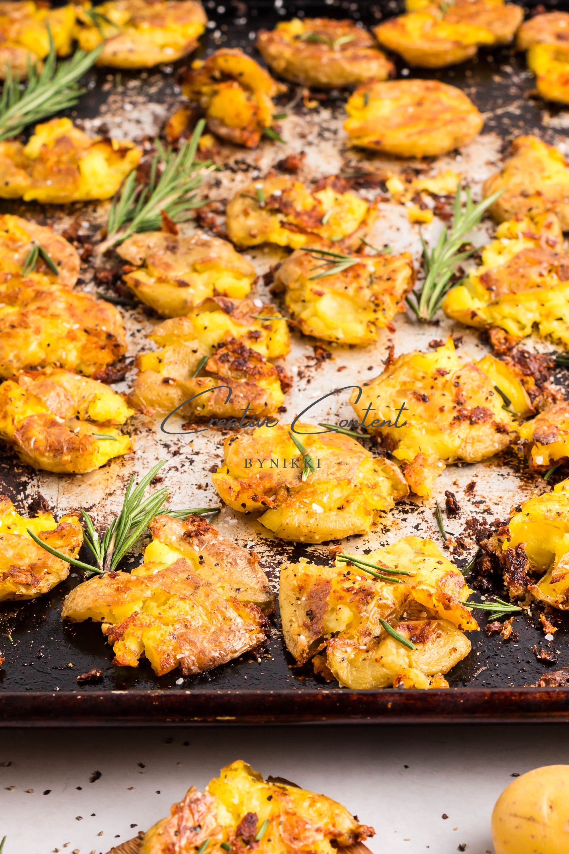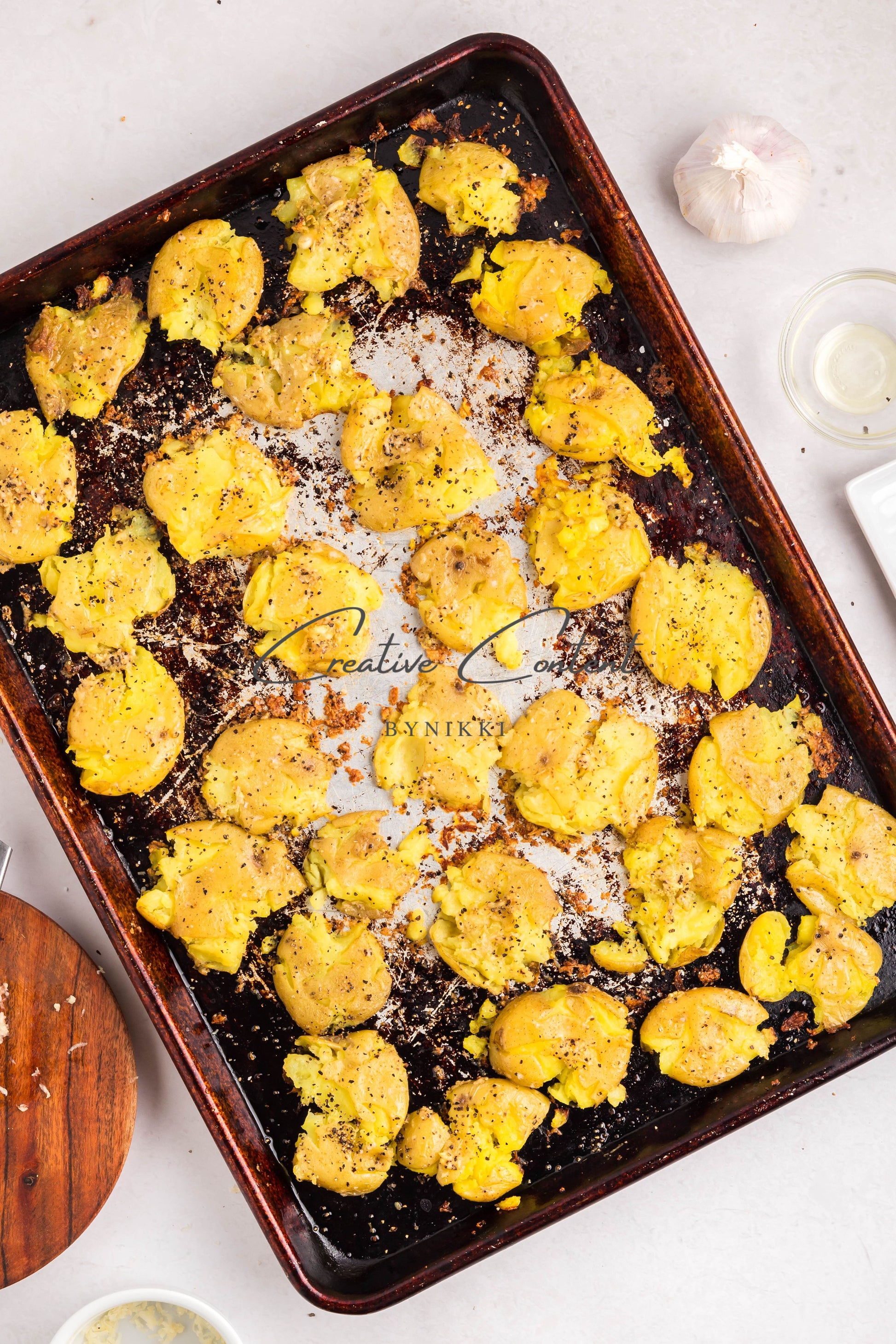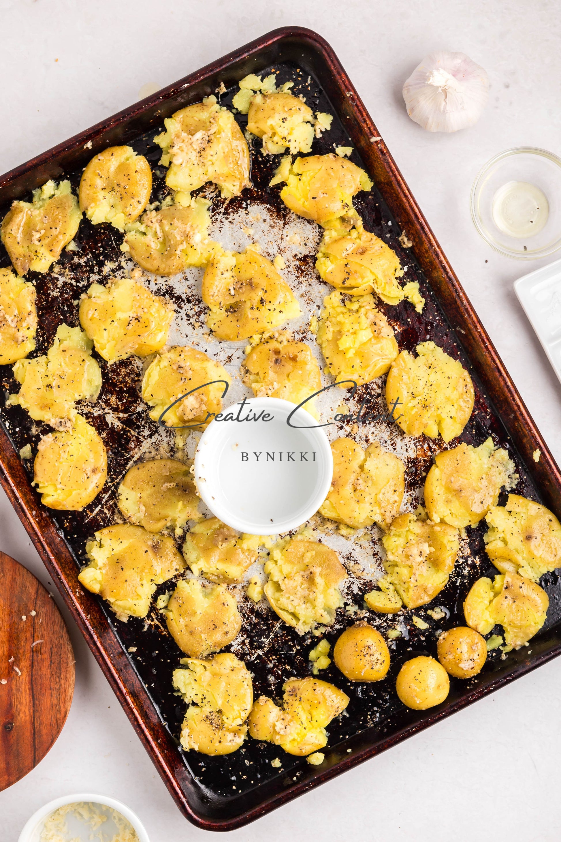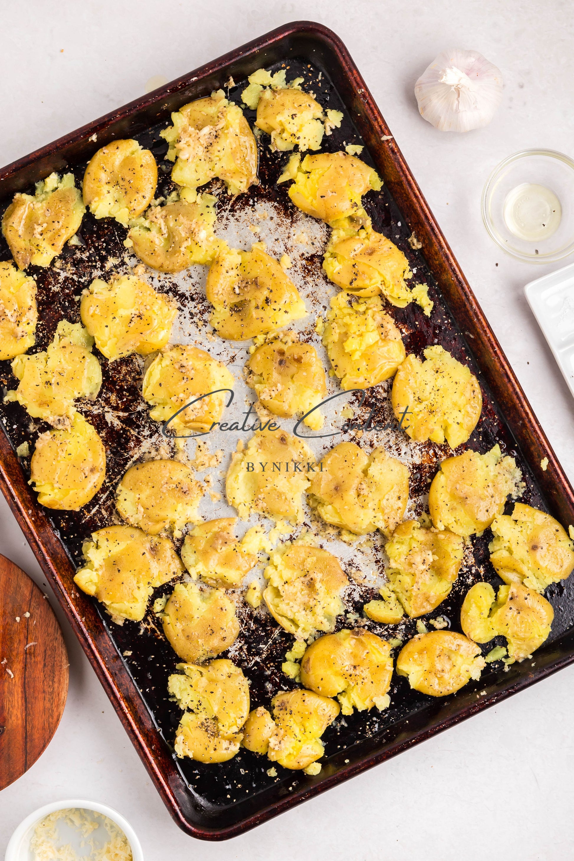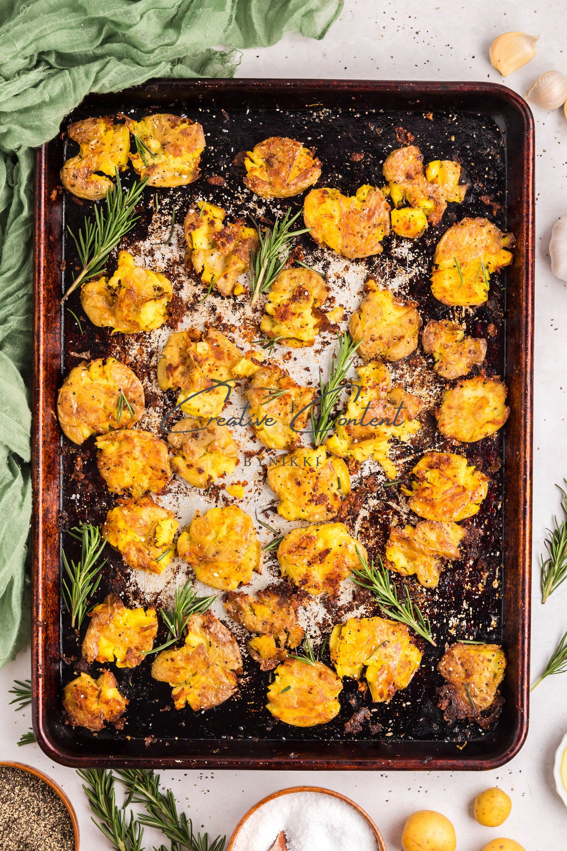 - Ingredients: baby Yukon gold potatoes, avocado oil, garlic, coarse kosher salt, black pepper, garlic powder, parmesan cheese, rosemary