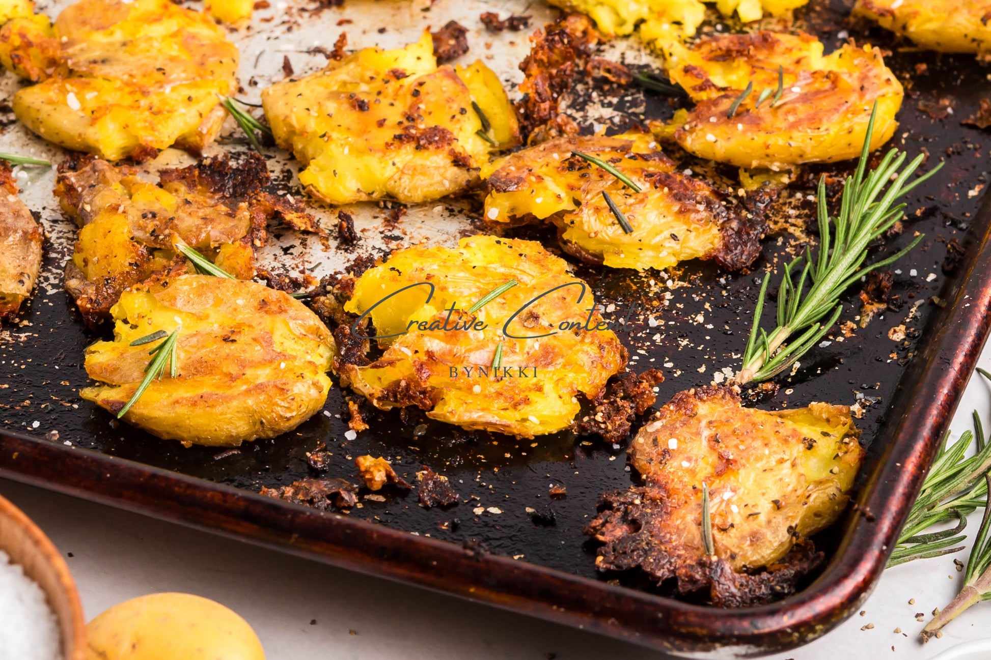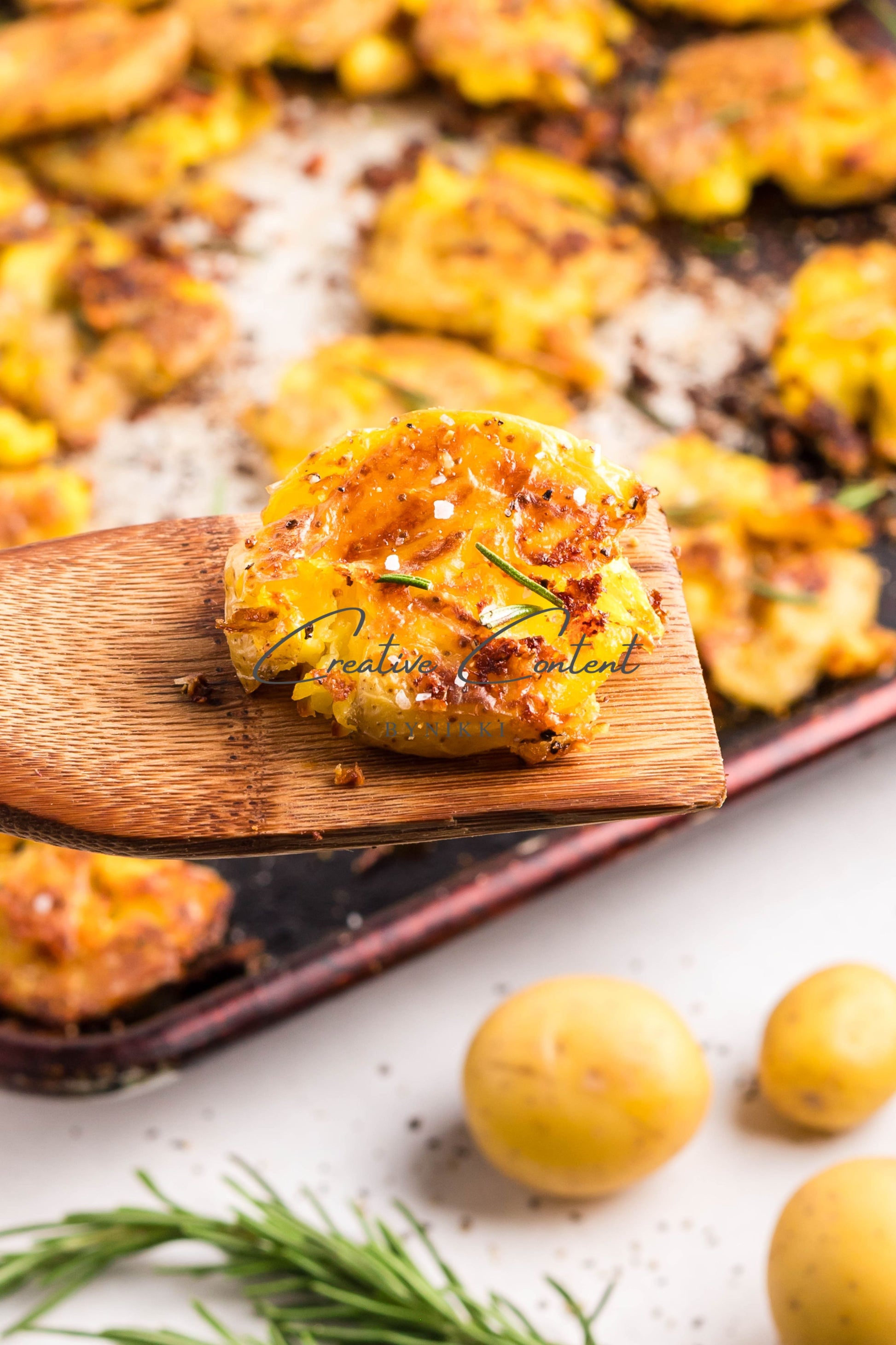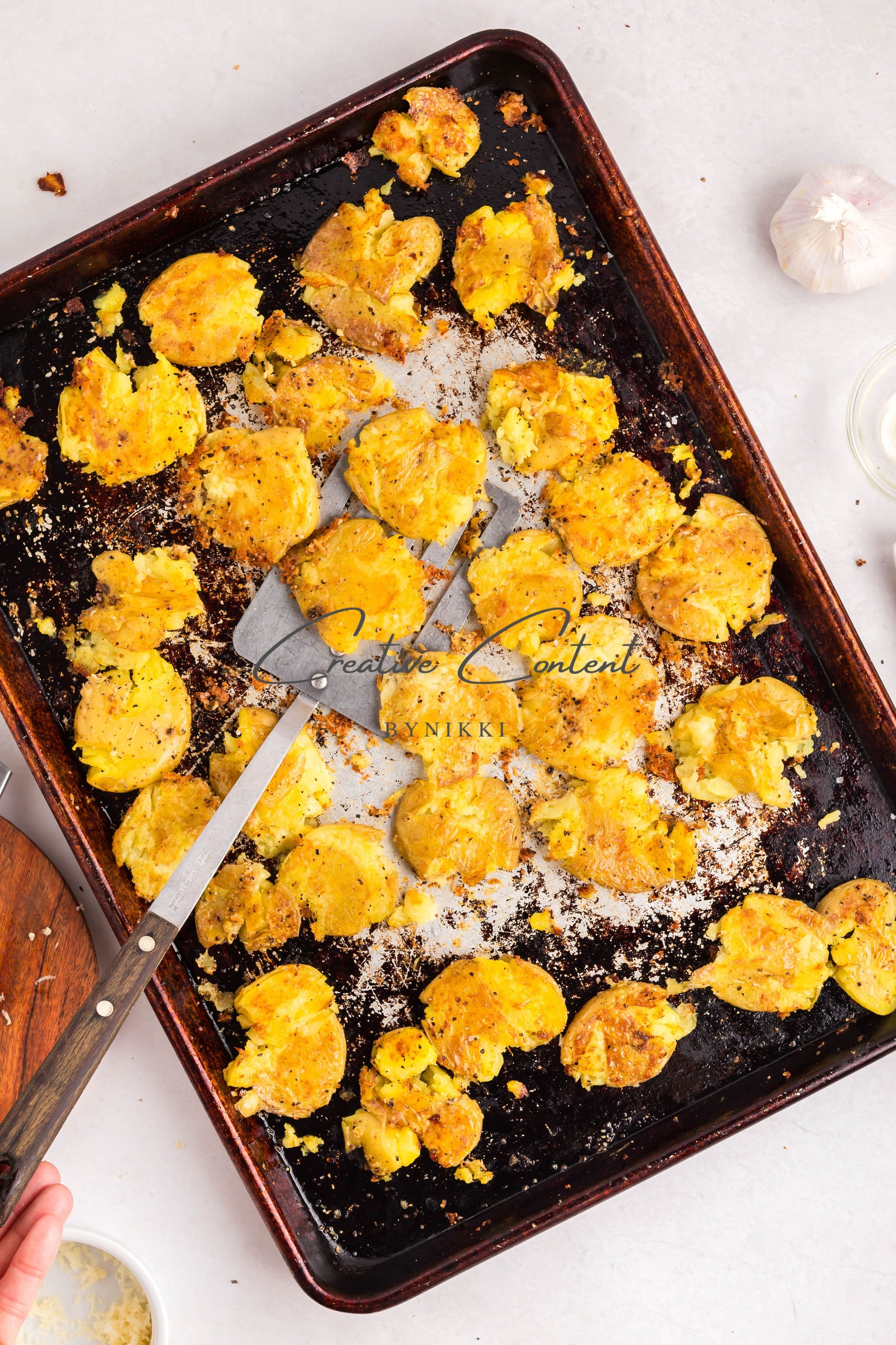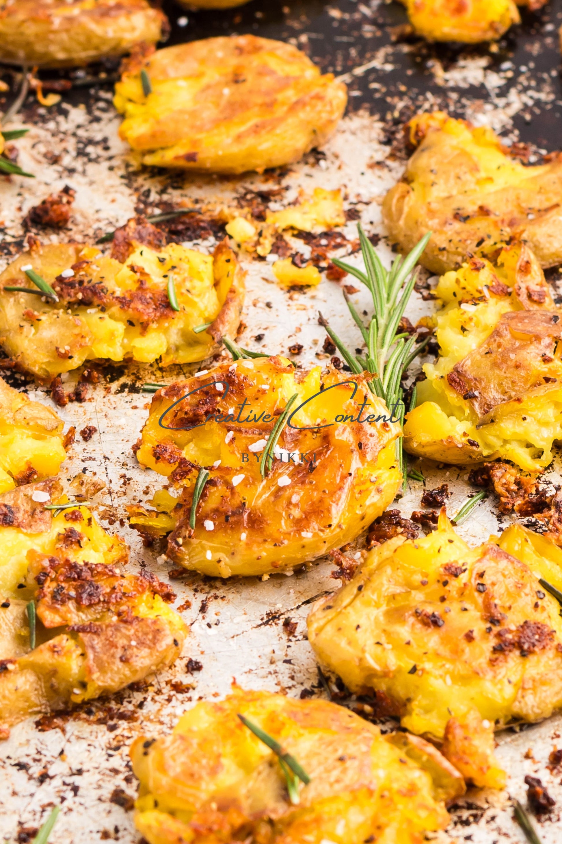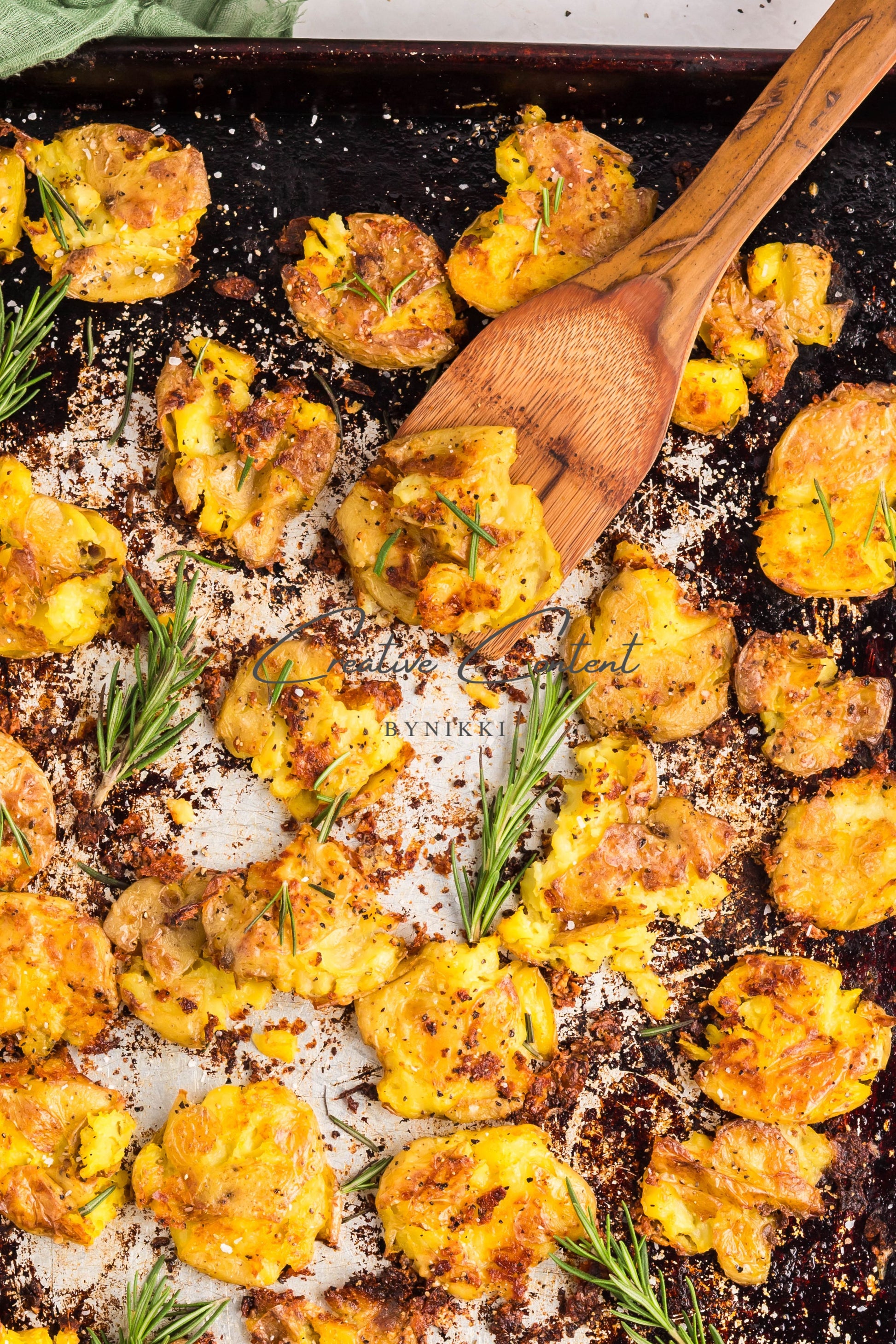 - Ingredients: baby Yukon gold potatoes, avocado oil, garlic, coarse kosher salt, black pepper, garlic powder, parmesan cheese, rosemary