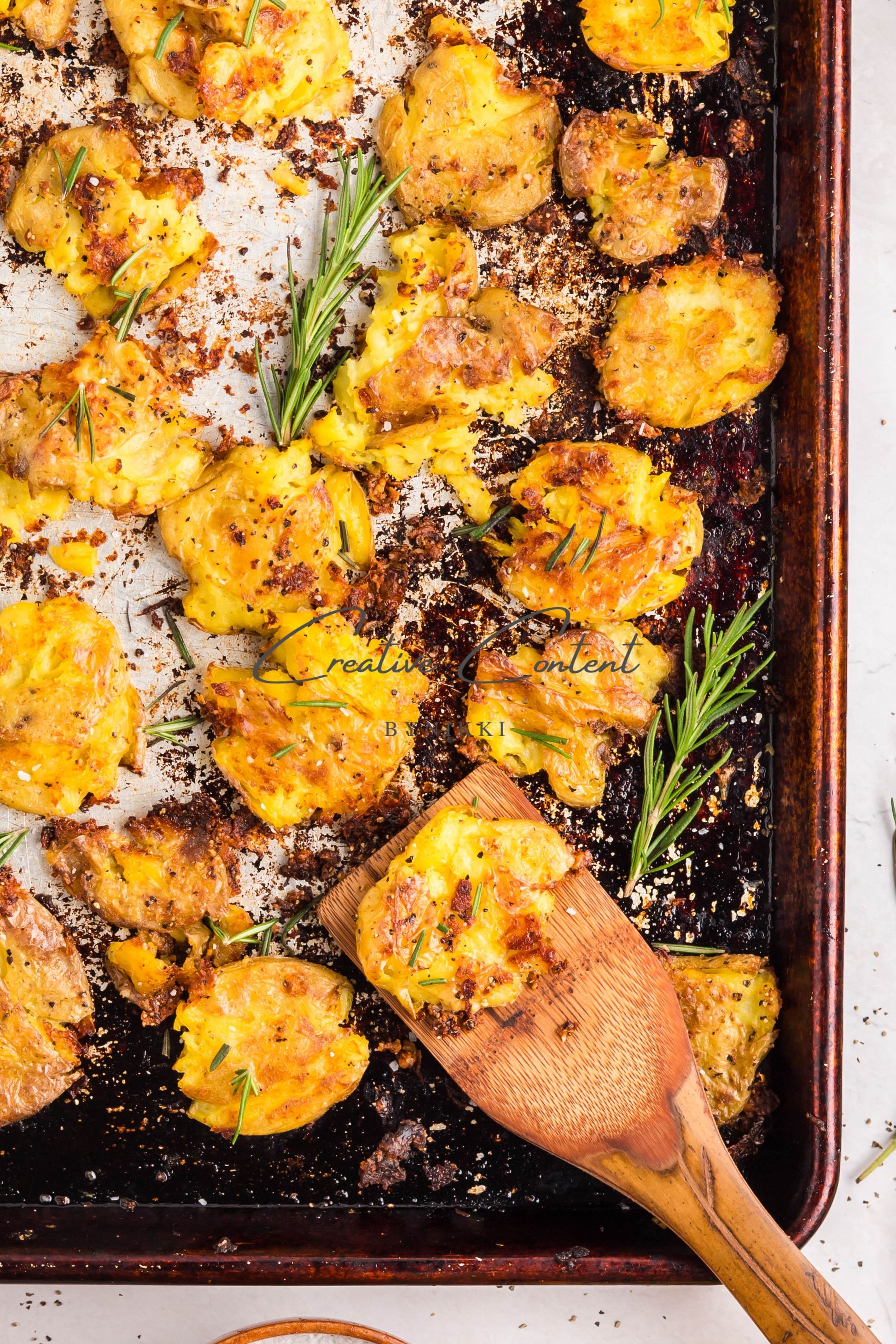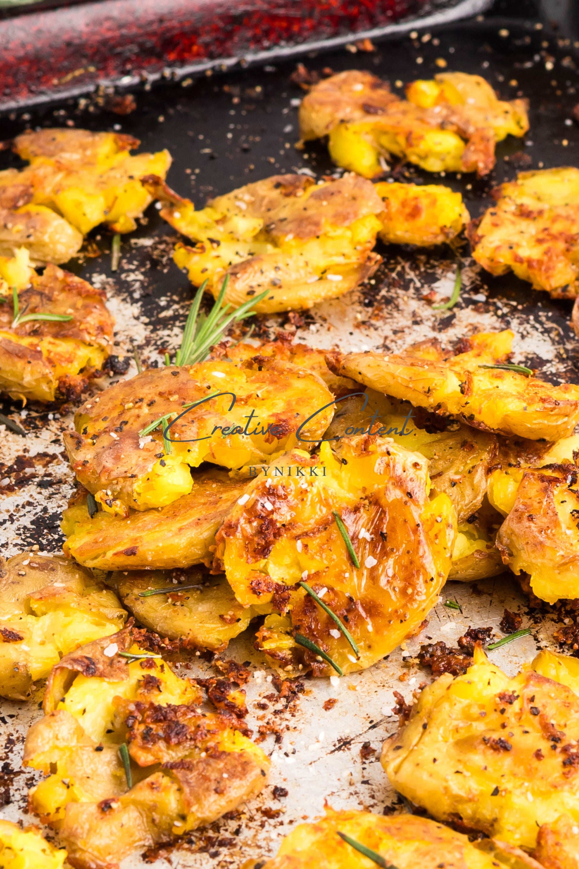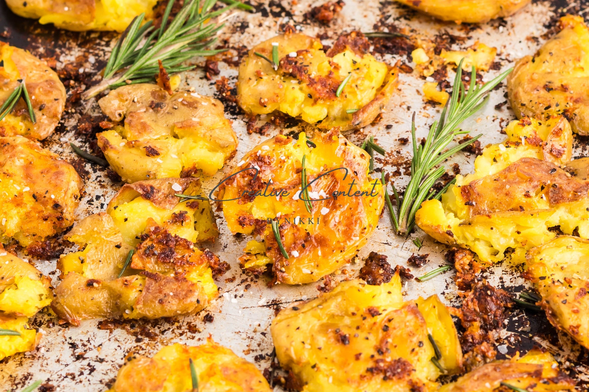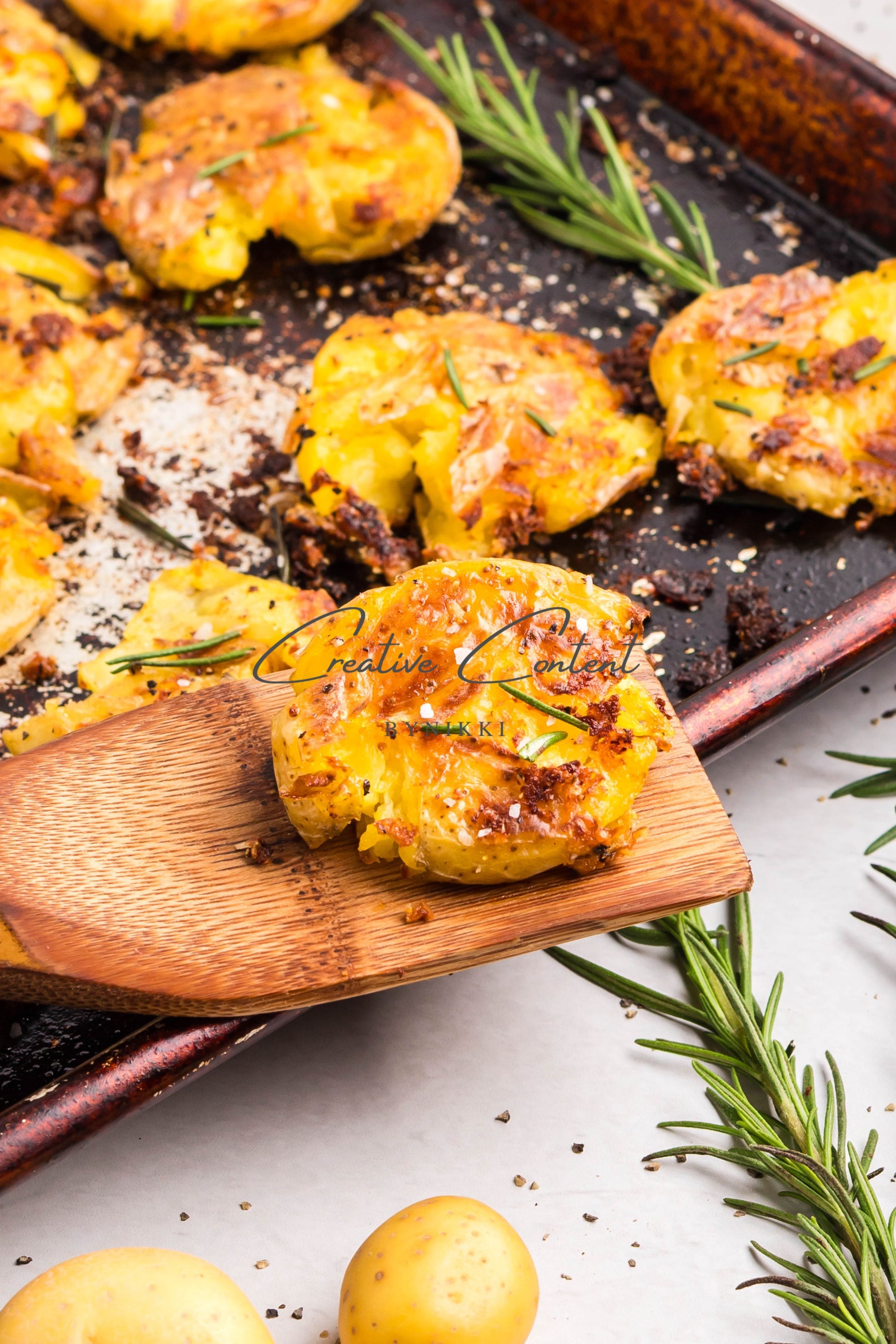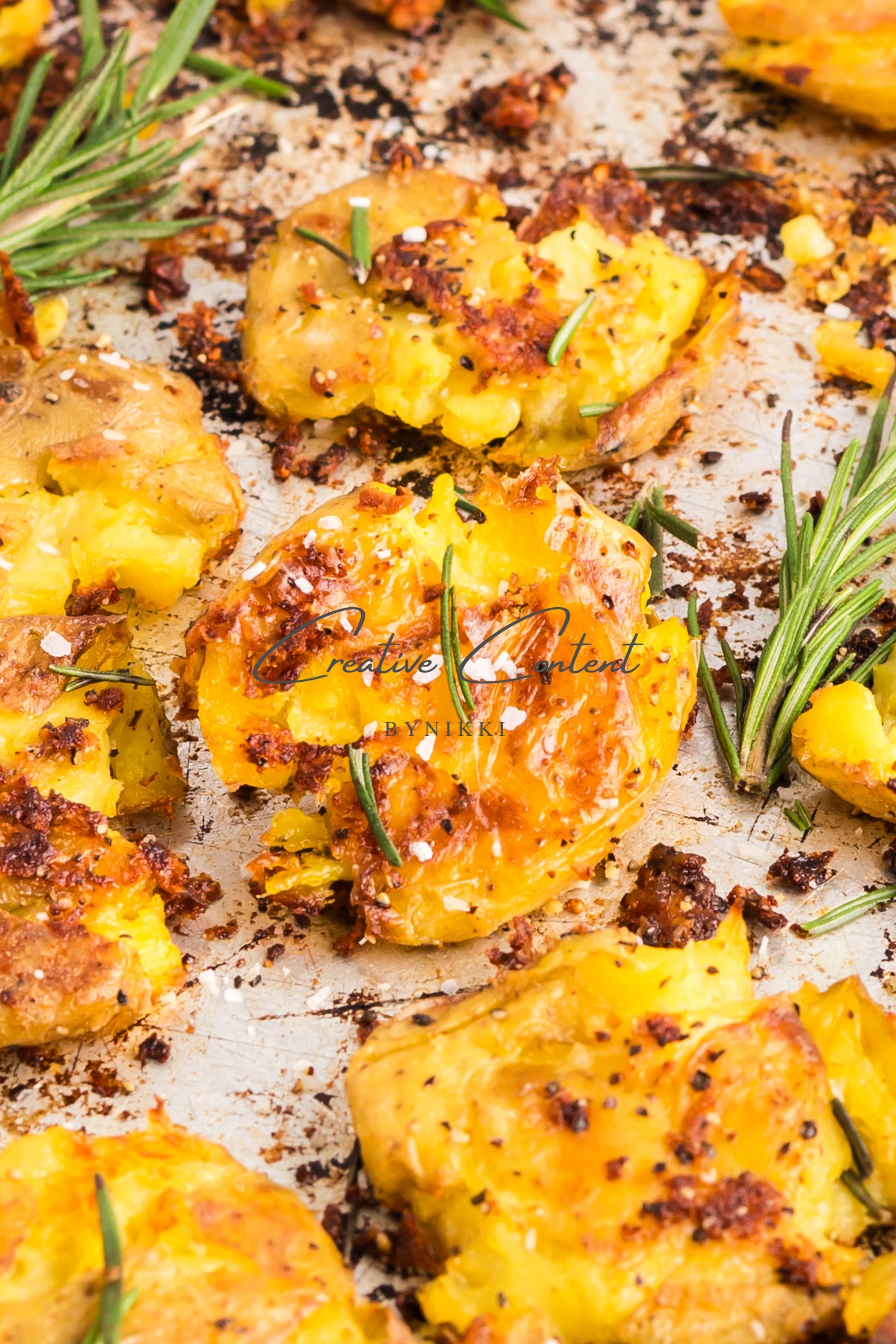 - Ingredients: baby Yukon gold potatoes, avocado oil, garlic, coarse kosher salt, black pepper, garlic powder, parmesan cheese, rosemary