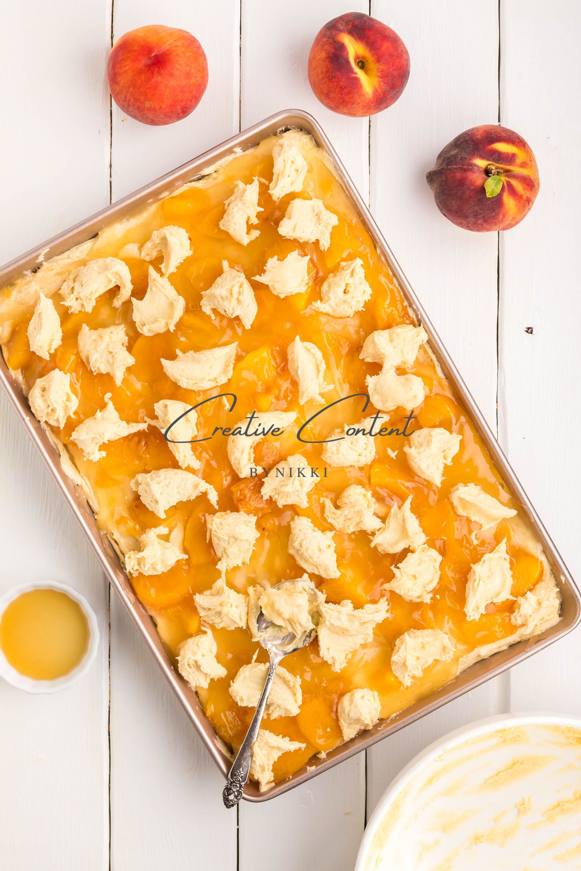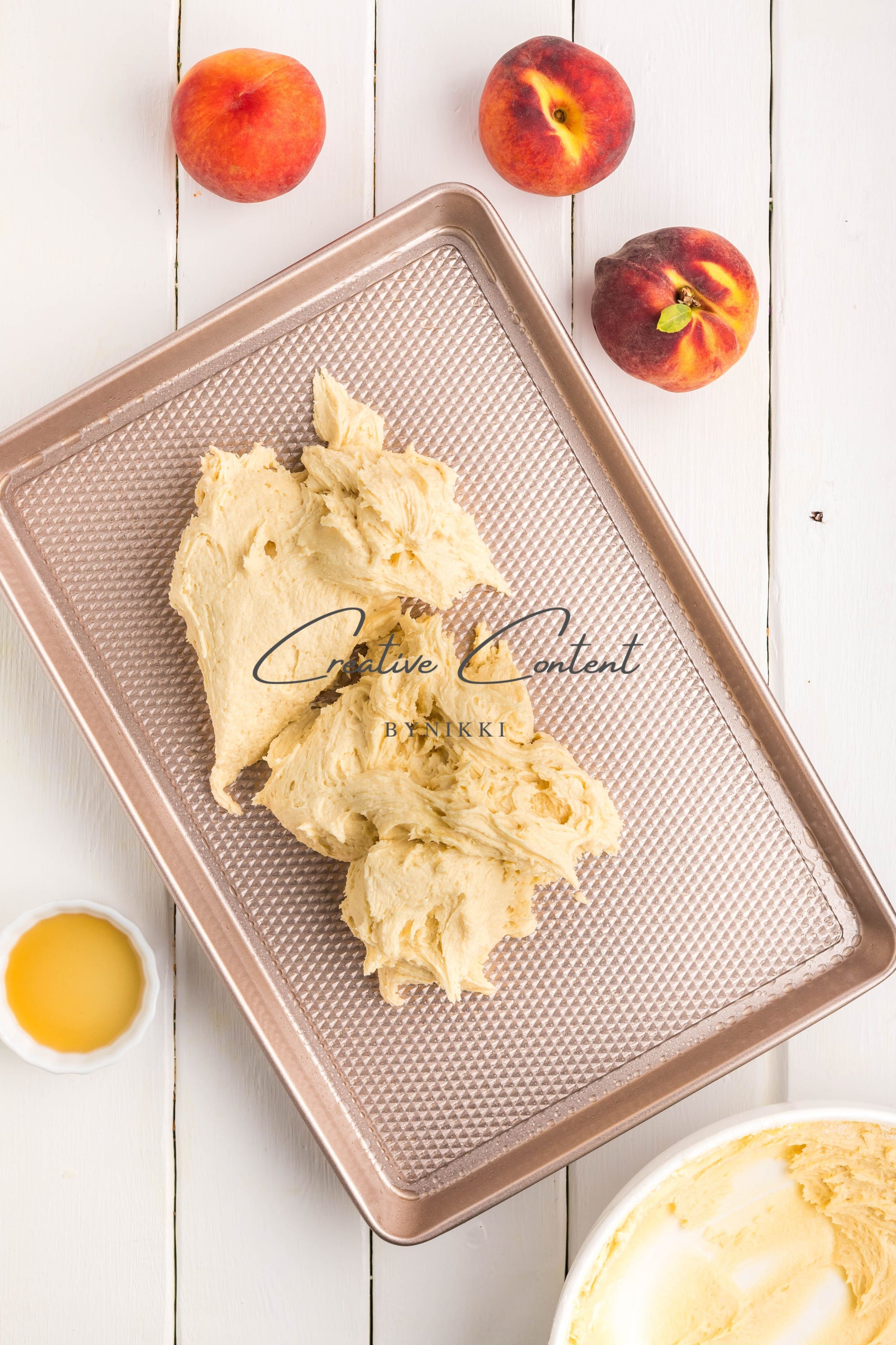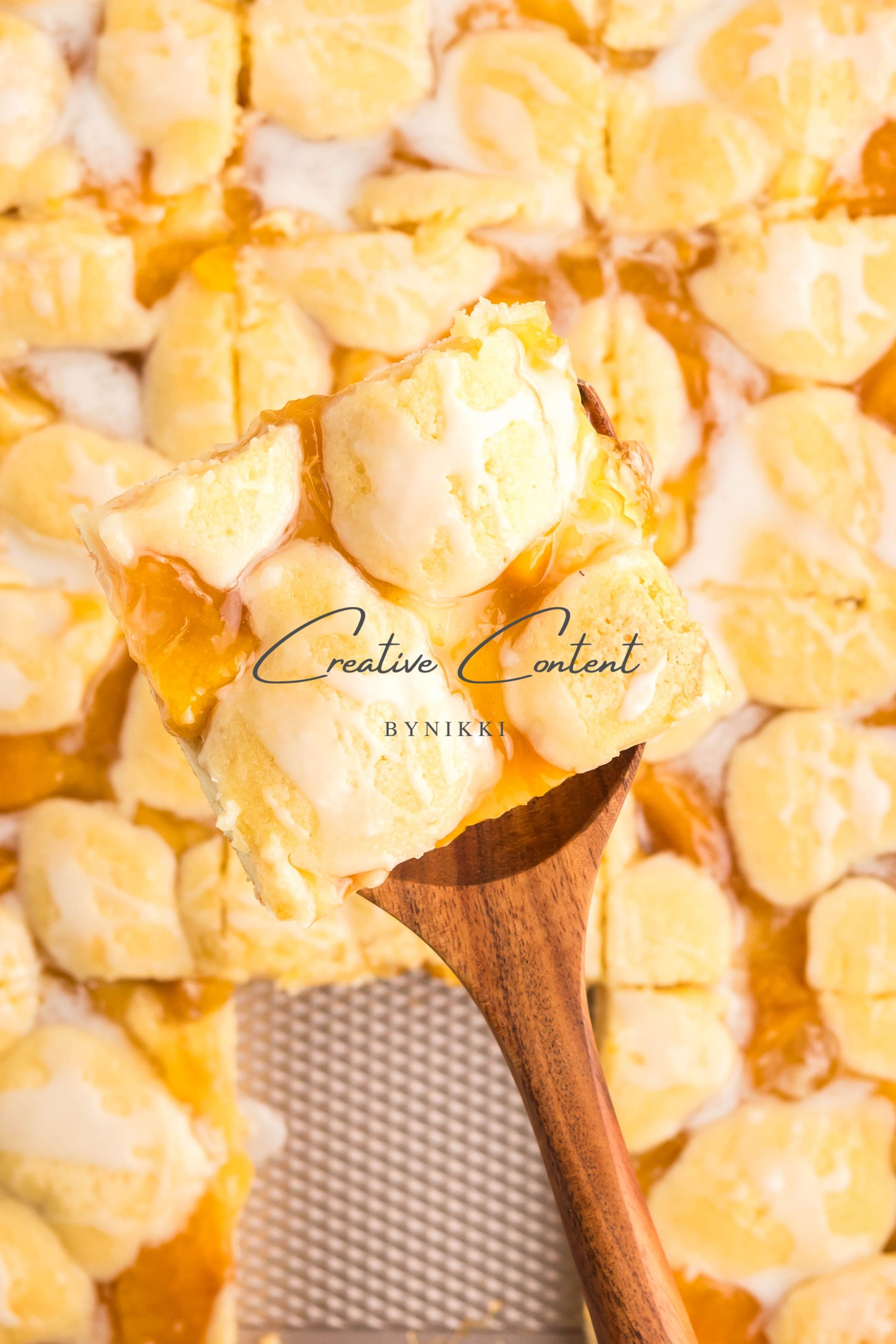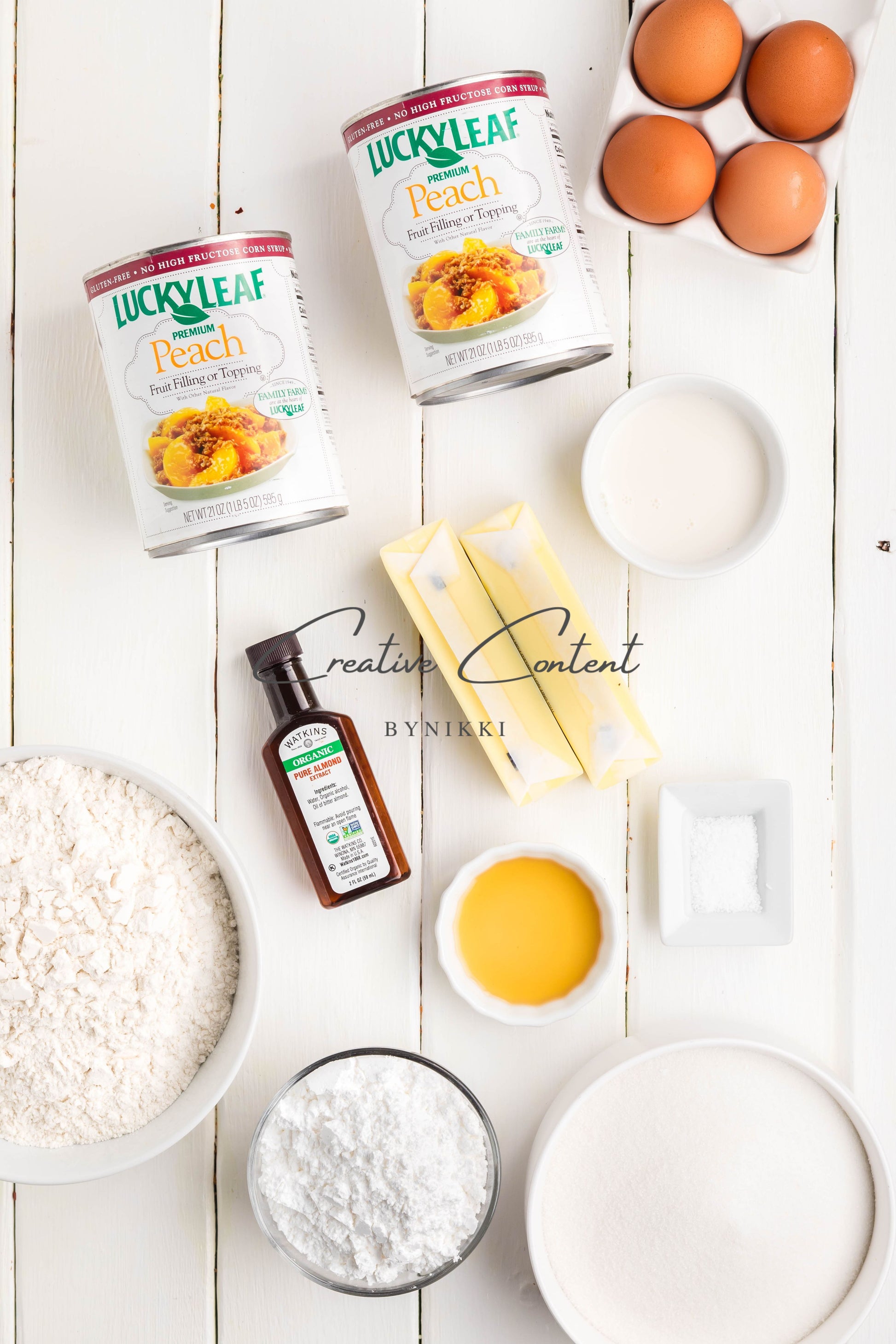- Ingredients: unsalted butter, sugar, salt, eggs, vanilla extract, almond extract, all-purpose flour, peach pie filling, powdered sugar, vanilla extract, almond extract, milk