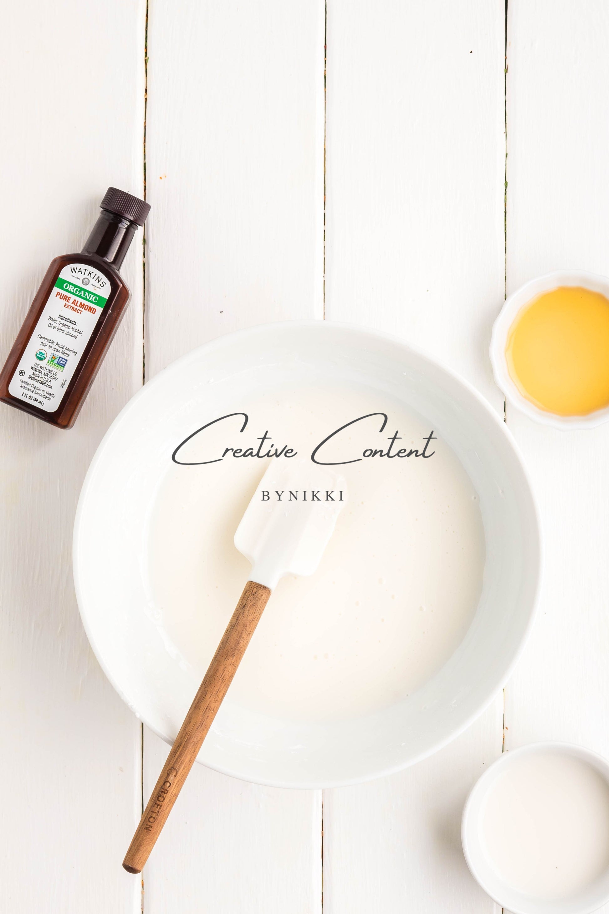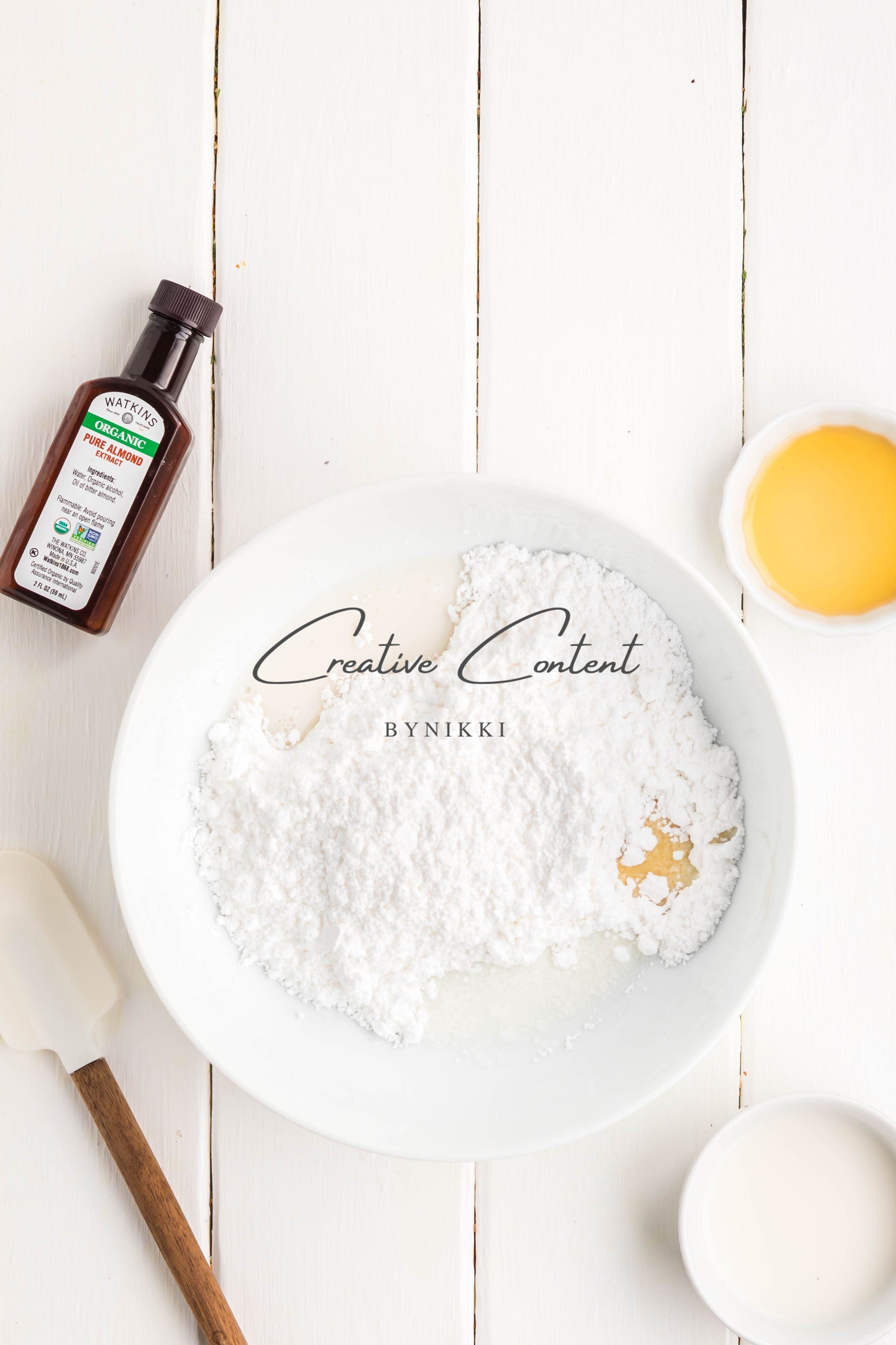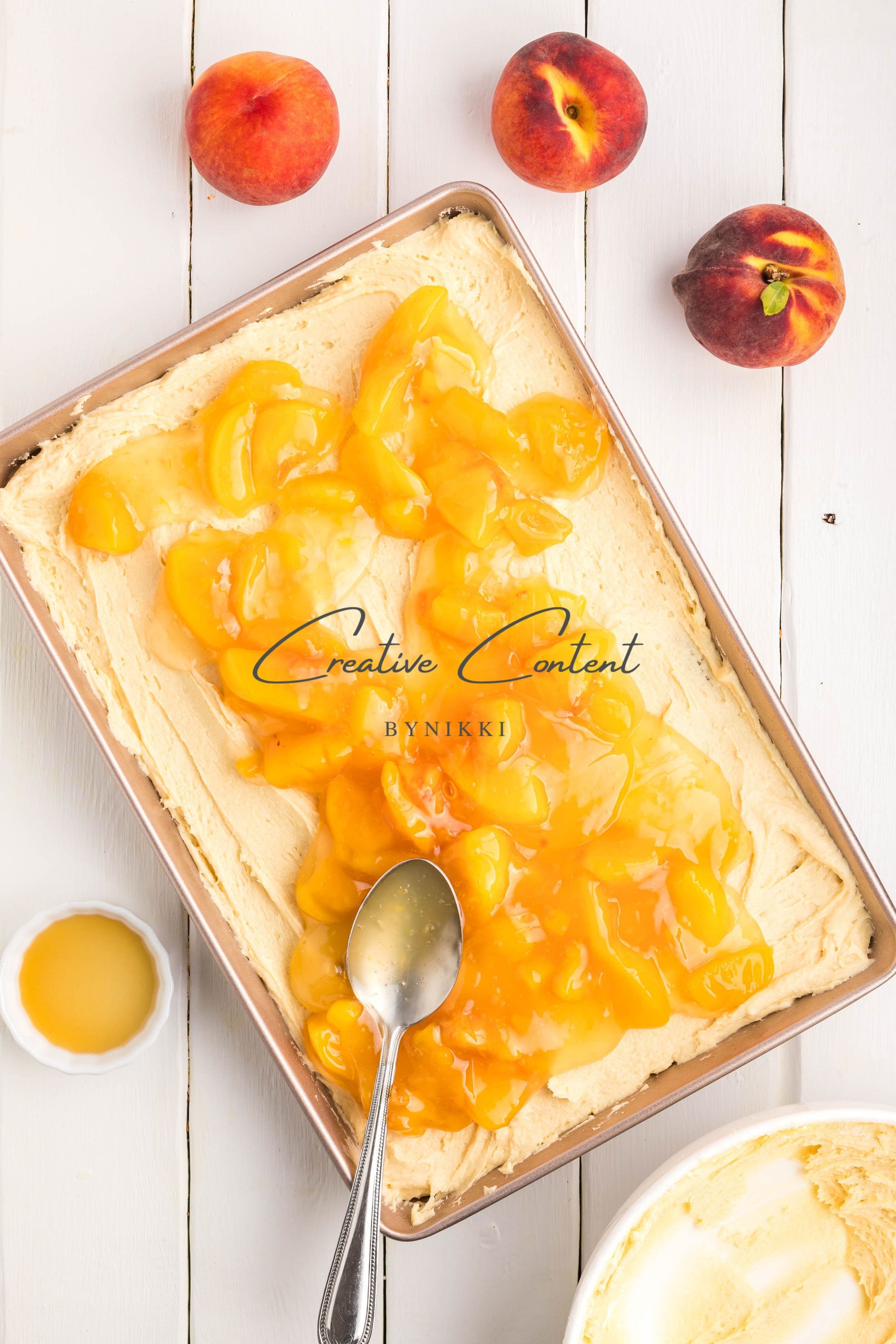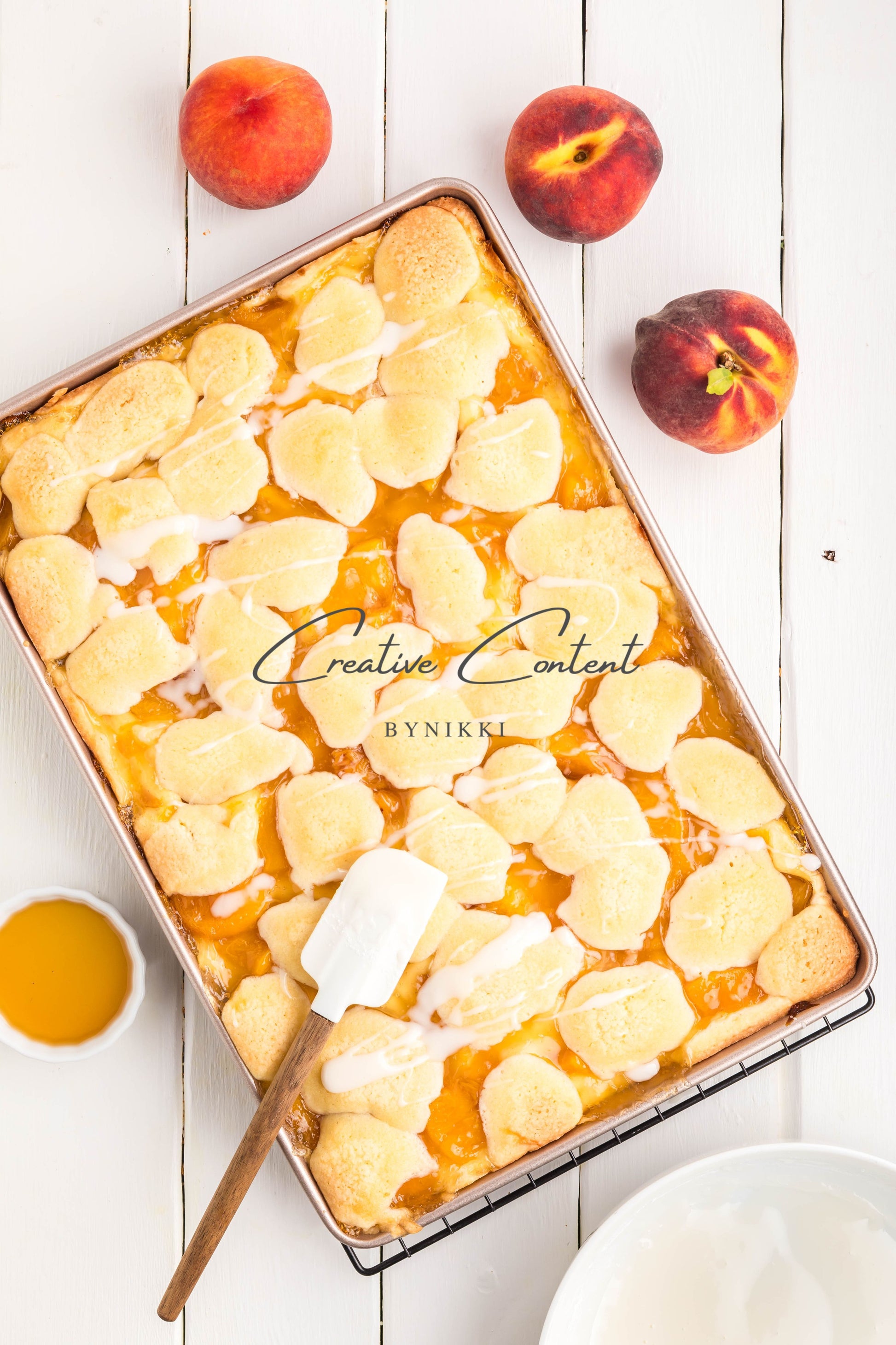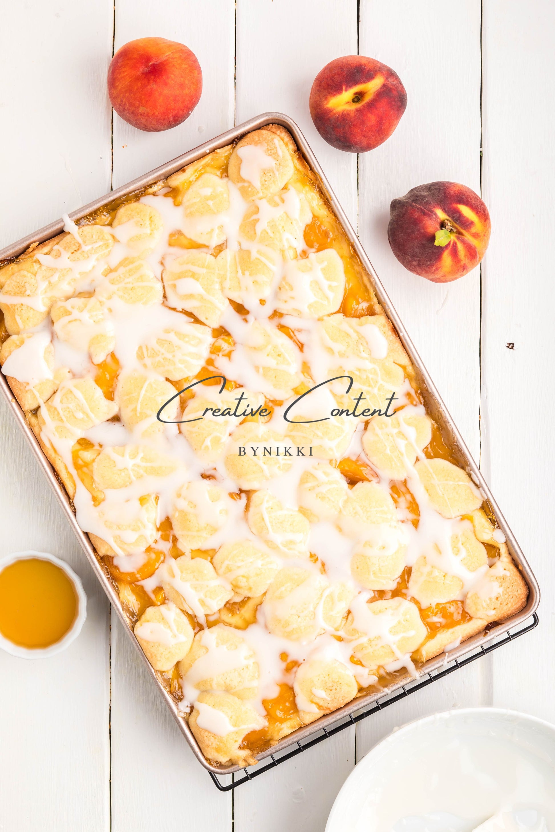 - Ingredients: unsalted butter, sugar, salt, eggs, vanilla extract, almond extract, all-purpose flour, peach pie filling, powdered sugar, vanilla extract, almond extract, milk