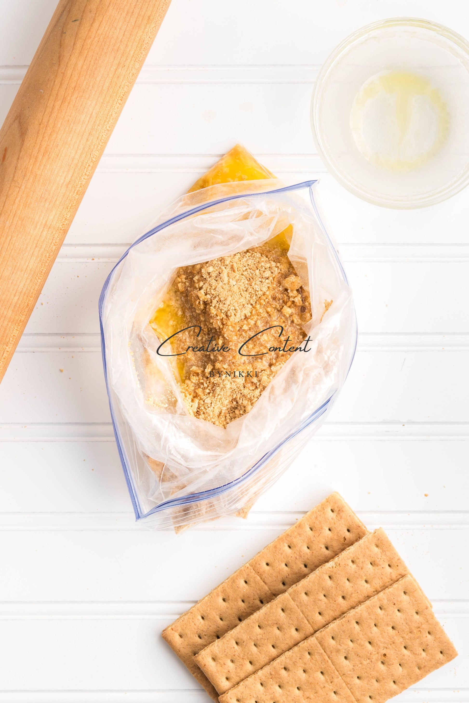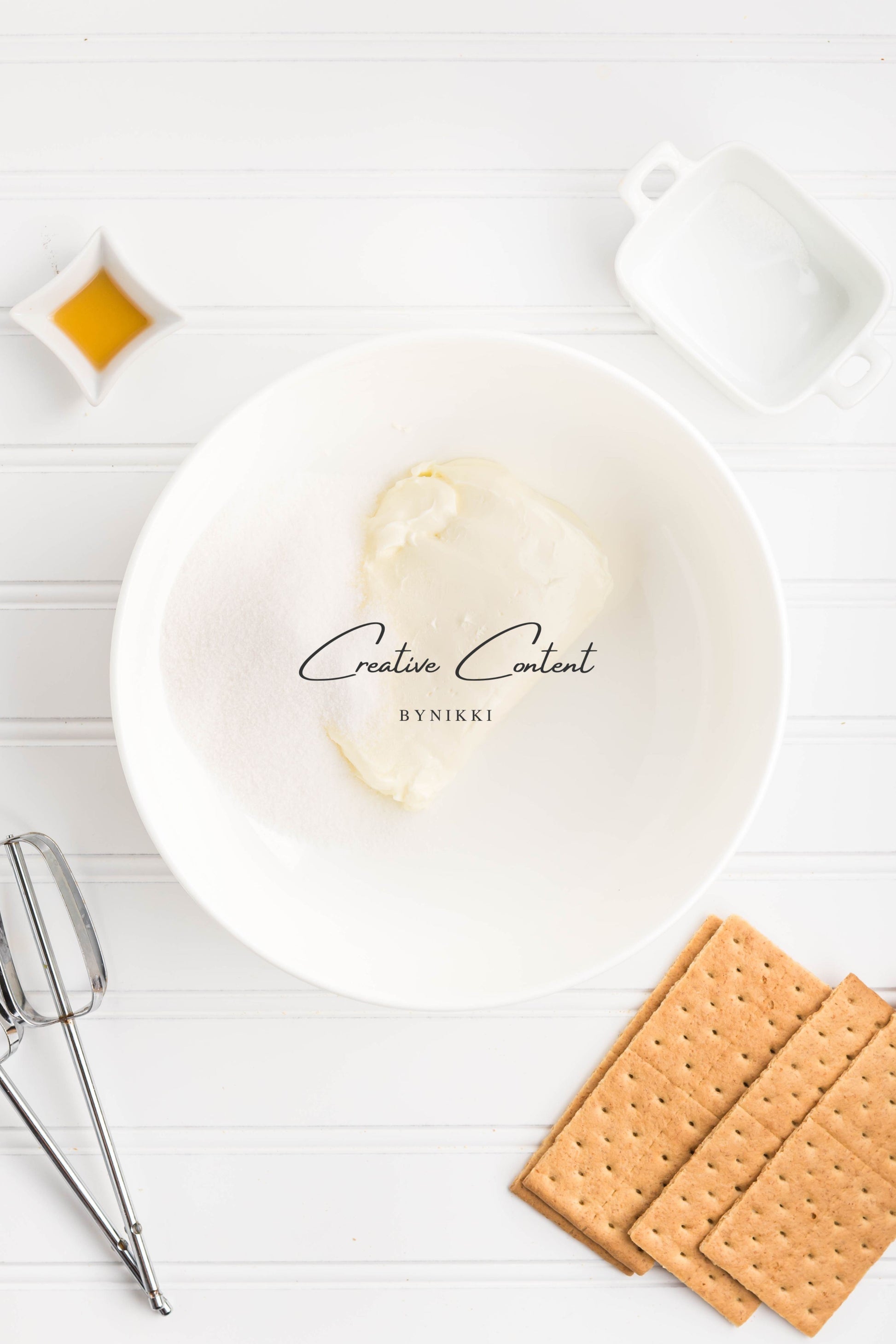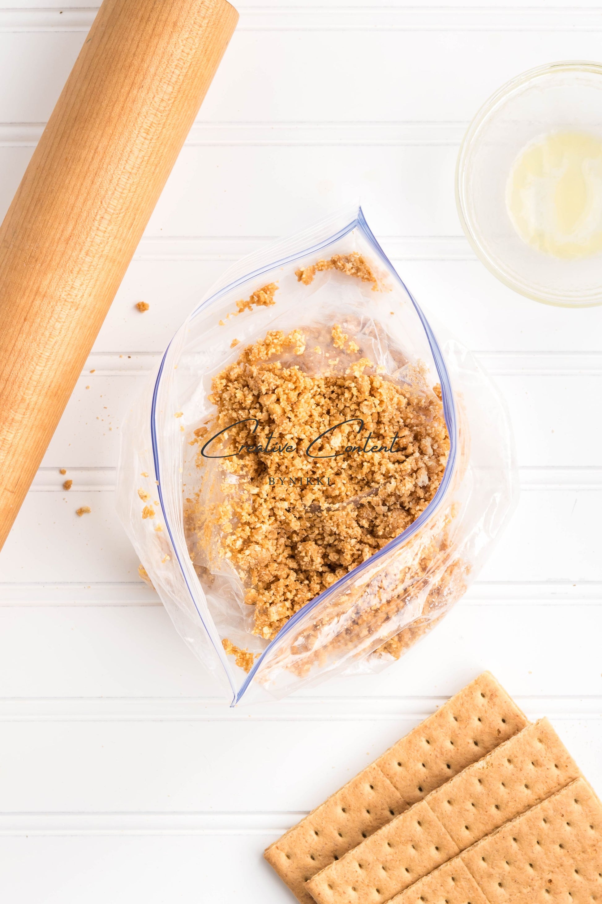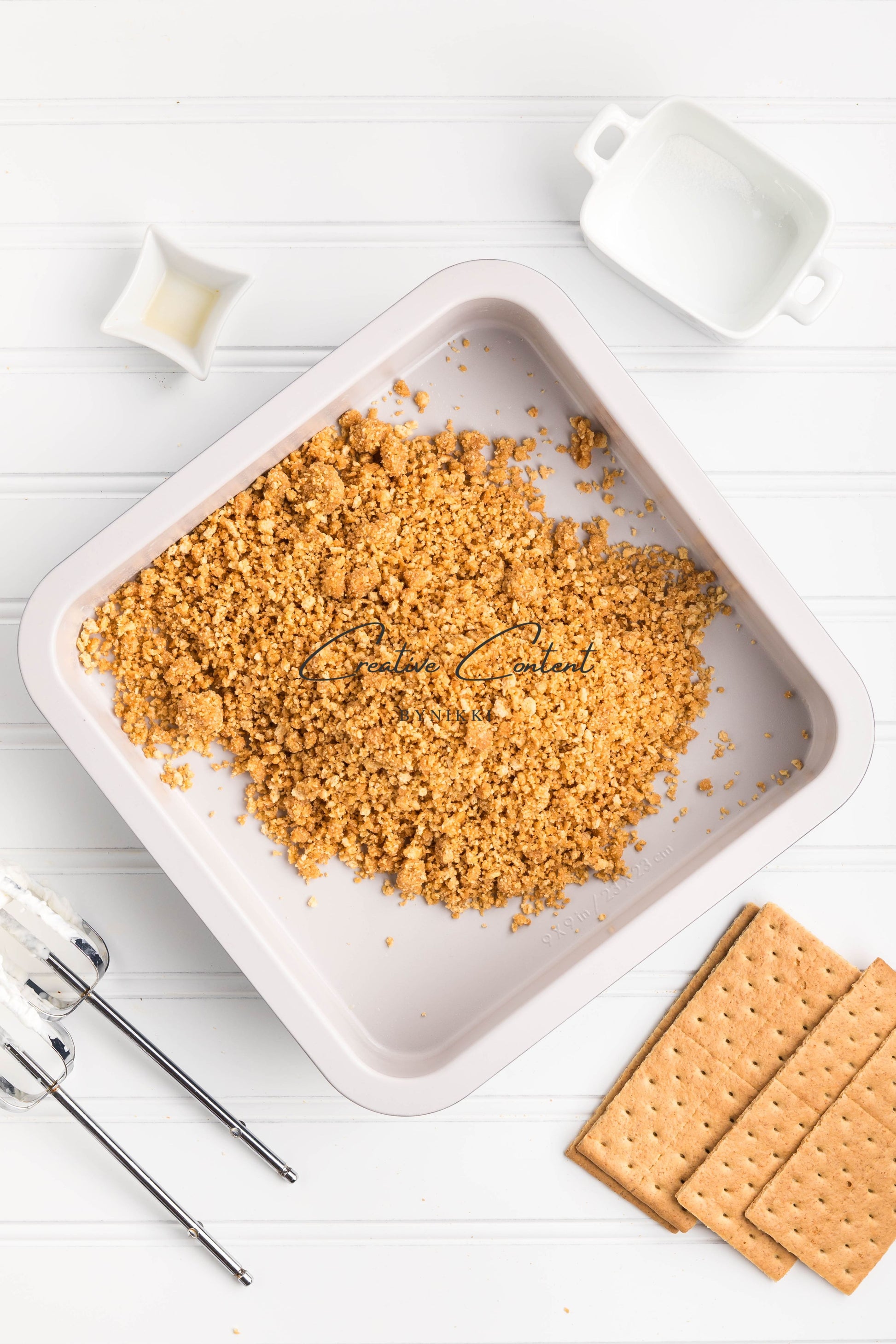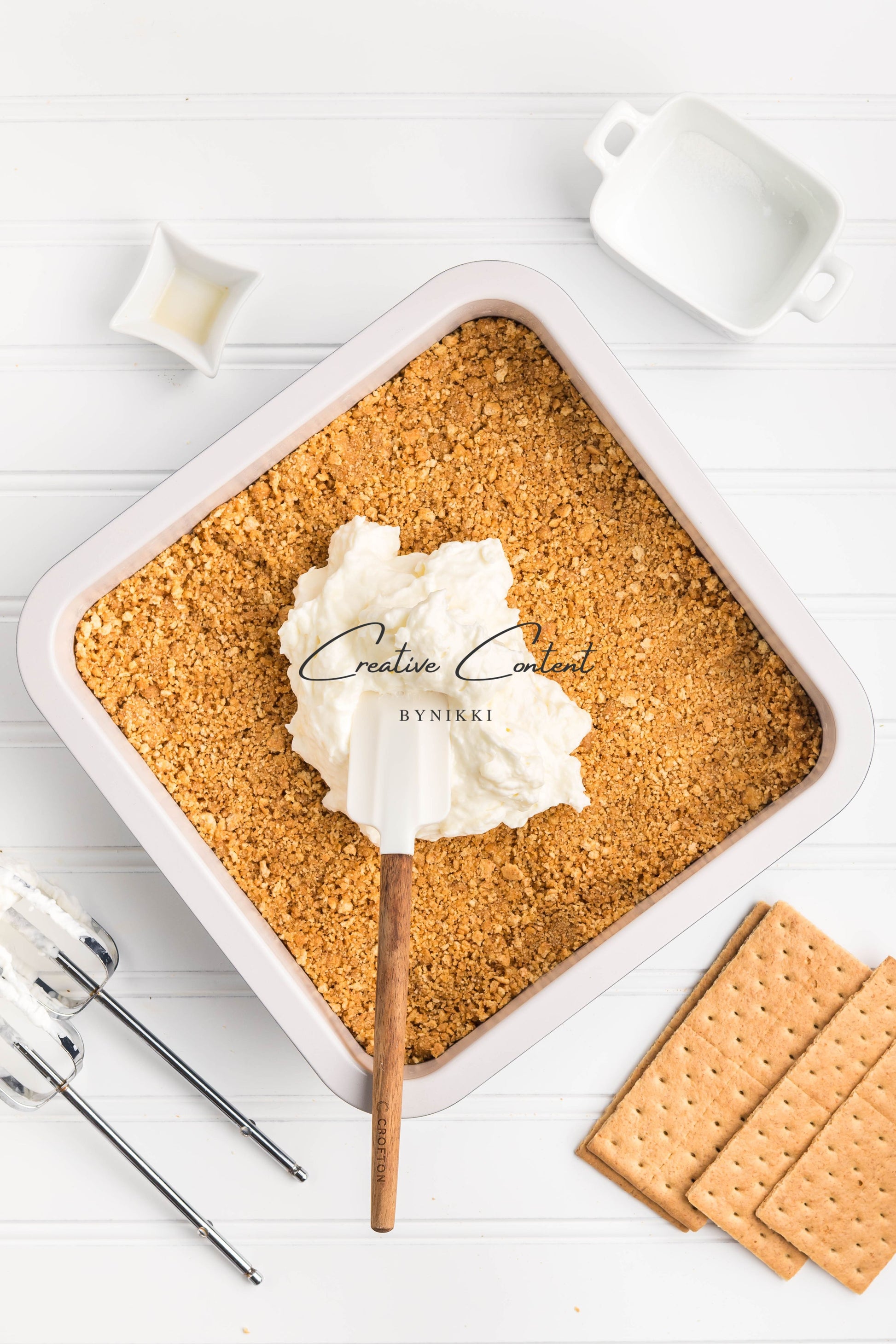 graham crackers, salted butter, cream cheese, sugar, heavy whipping cream, sugar, vanilla extract, peach pie filling.