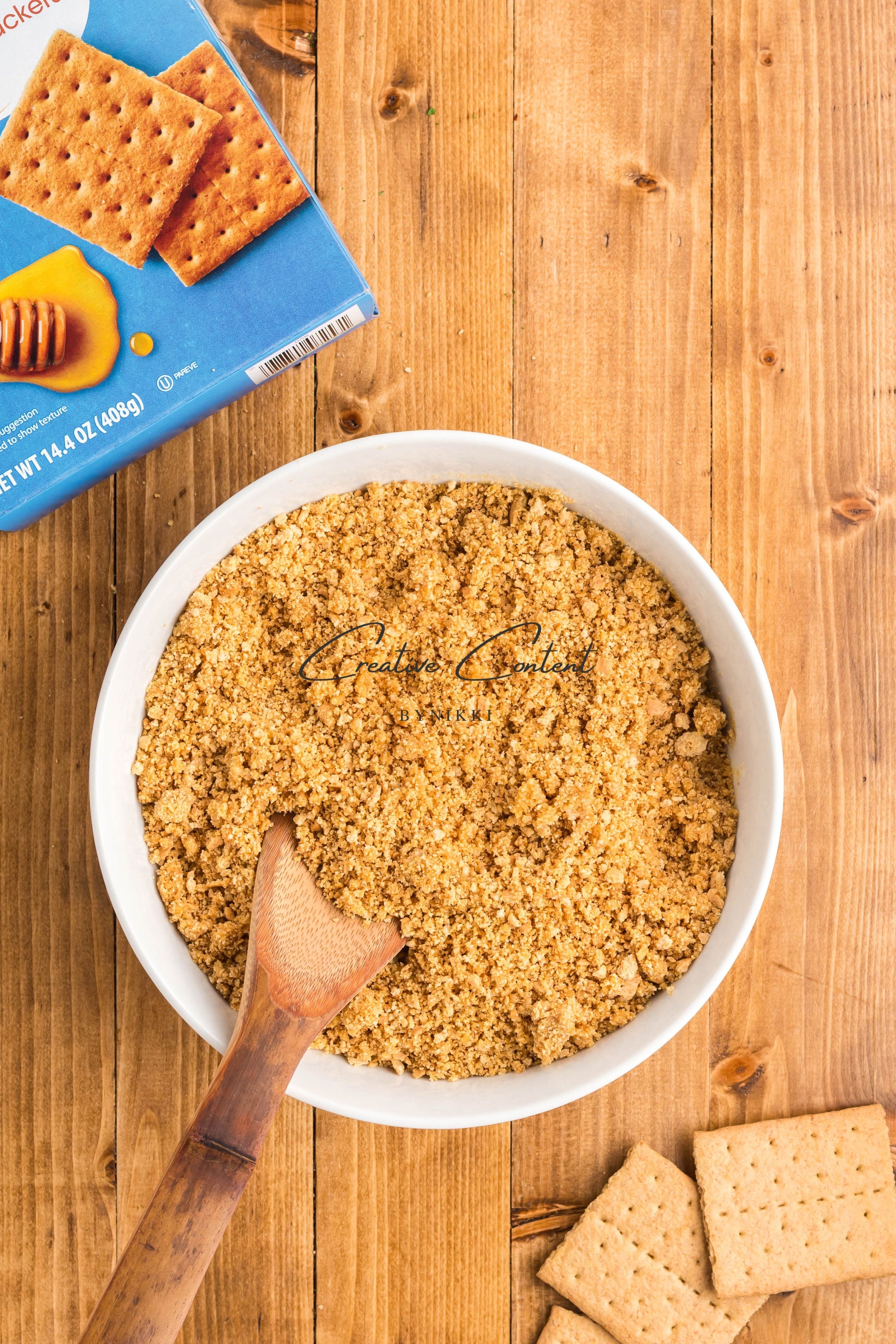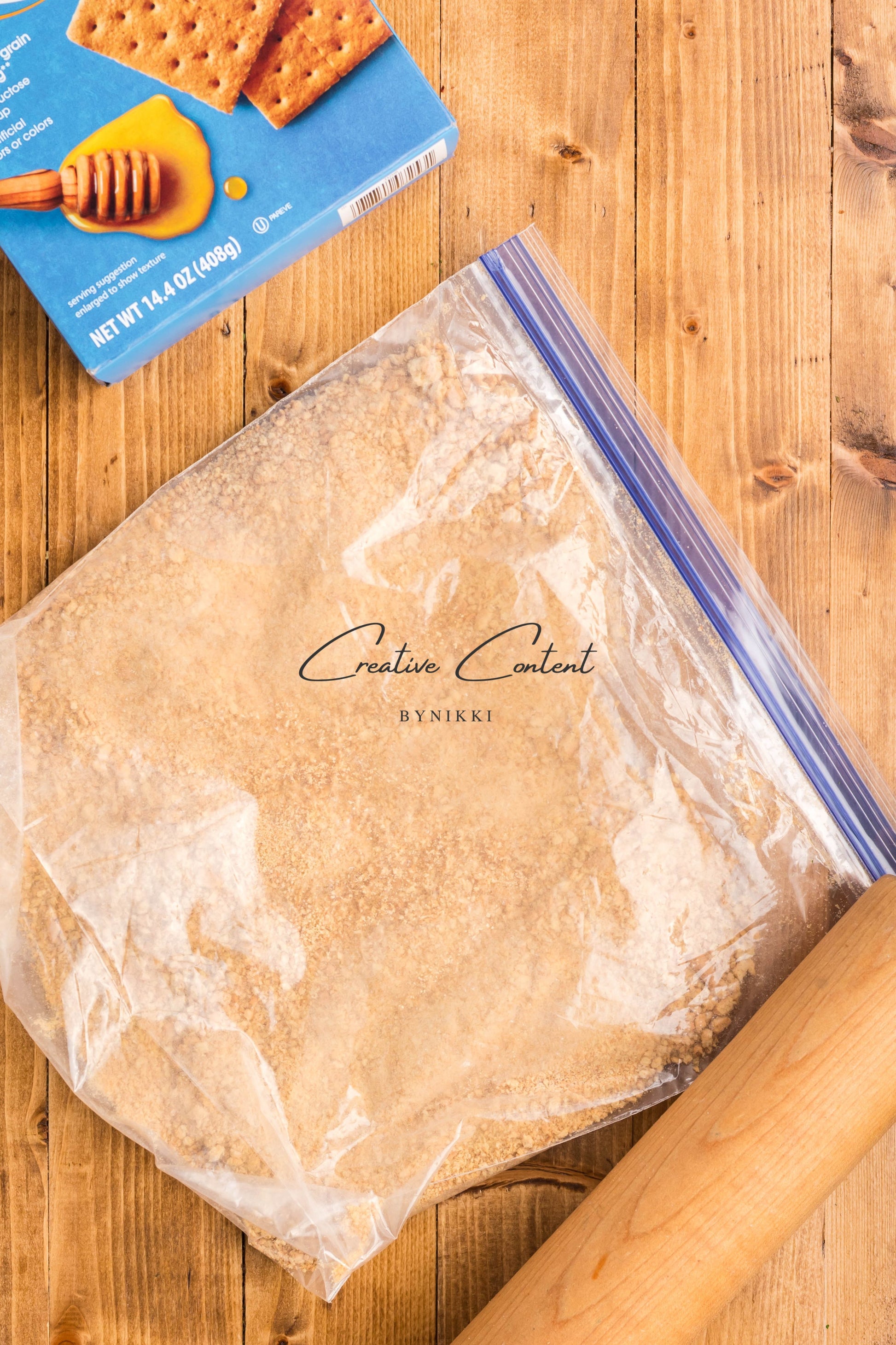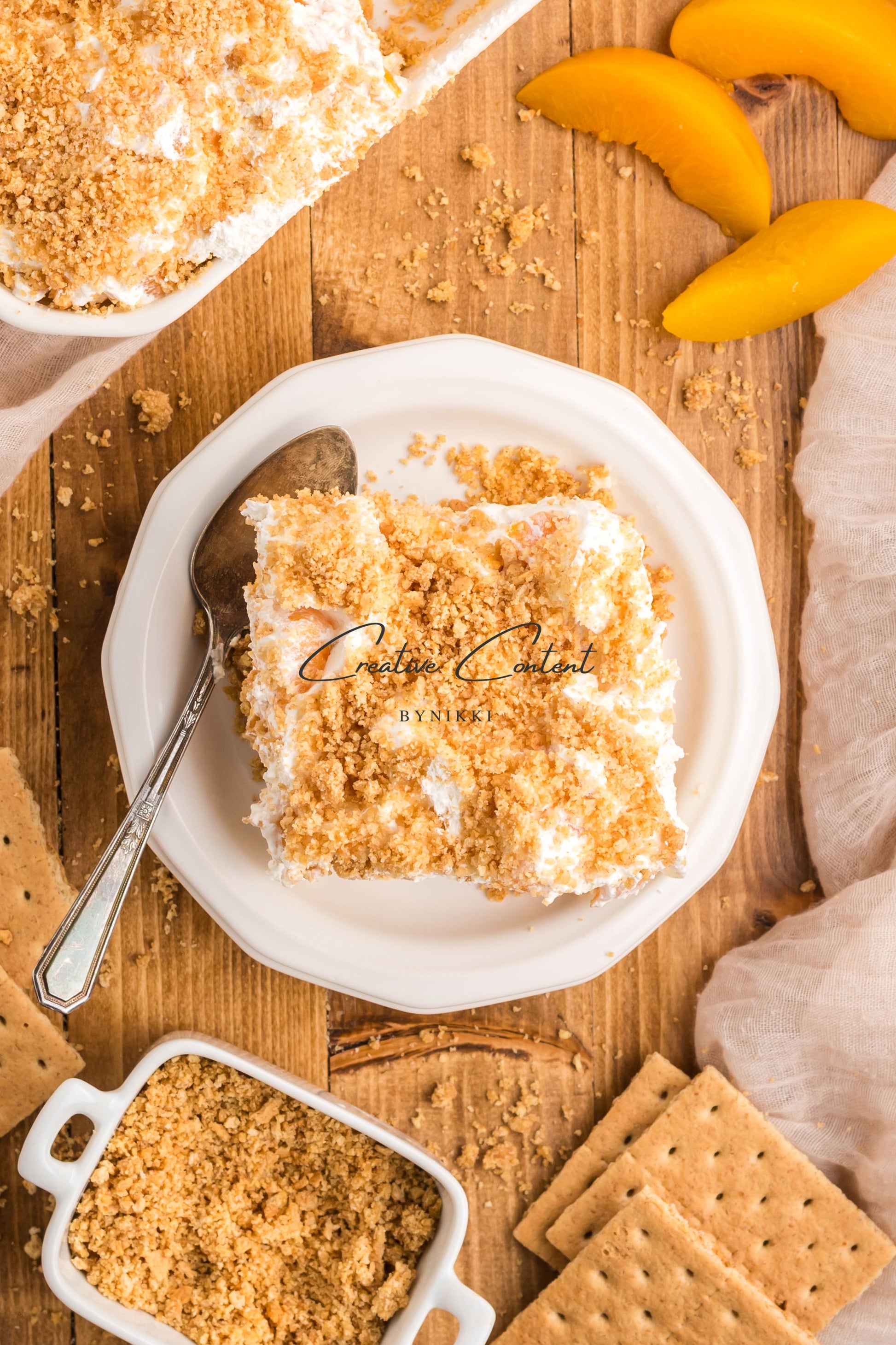- Ingredients: salted butter, graham cracker crumbs, cream cheese, butter, powdered sugar, frozen whipped topping, sliced peaches