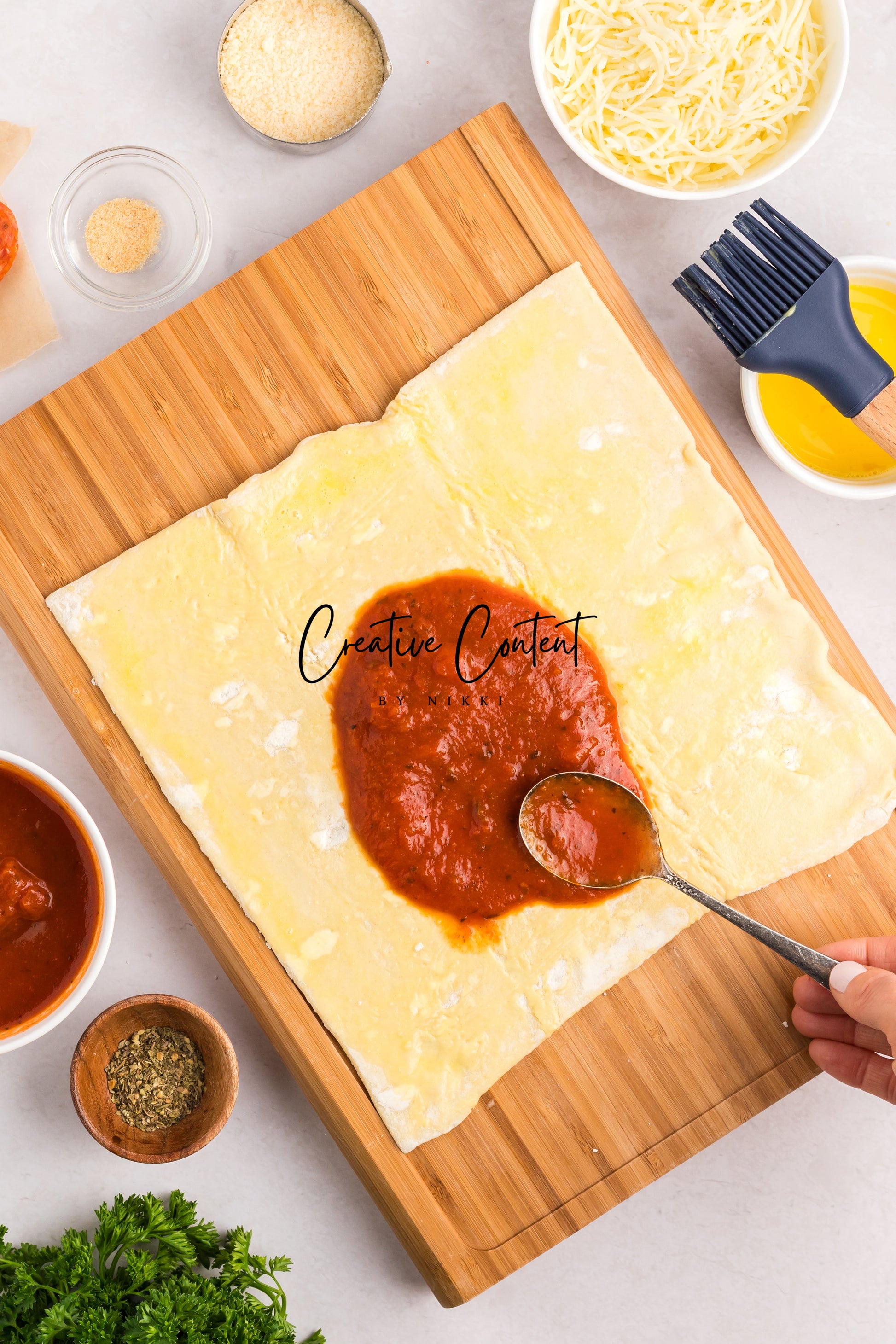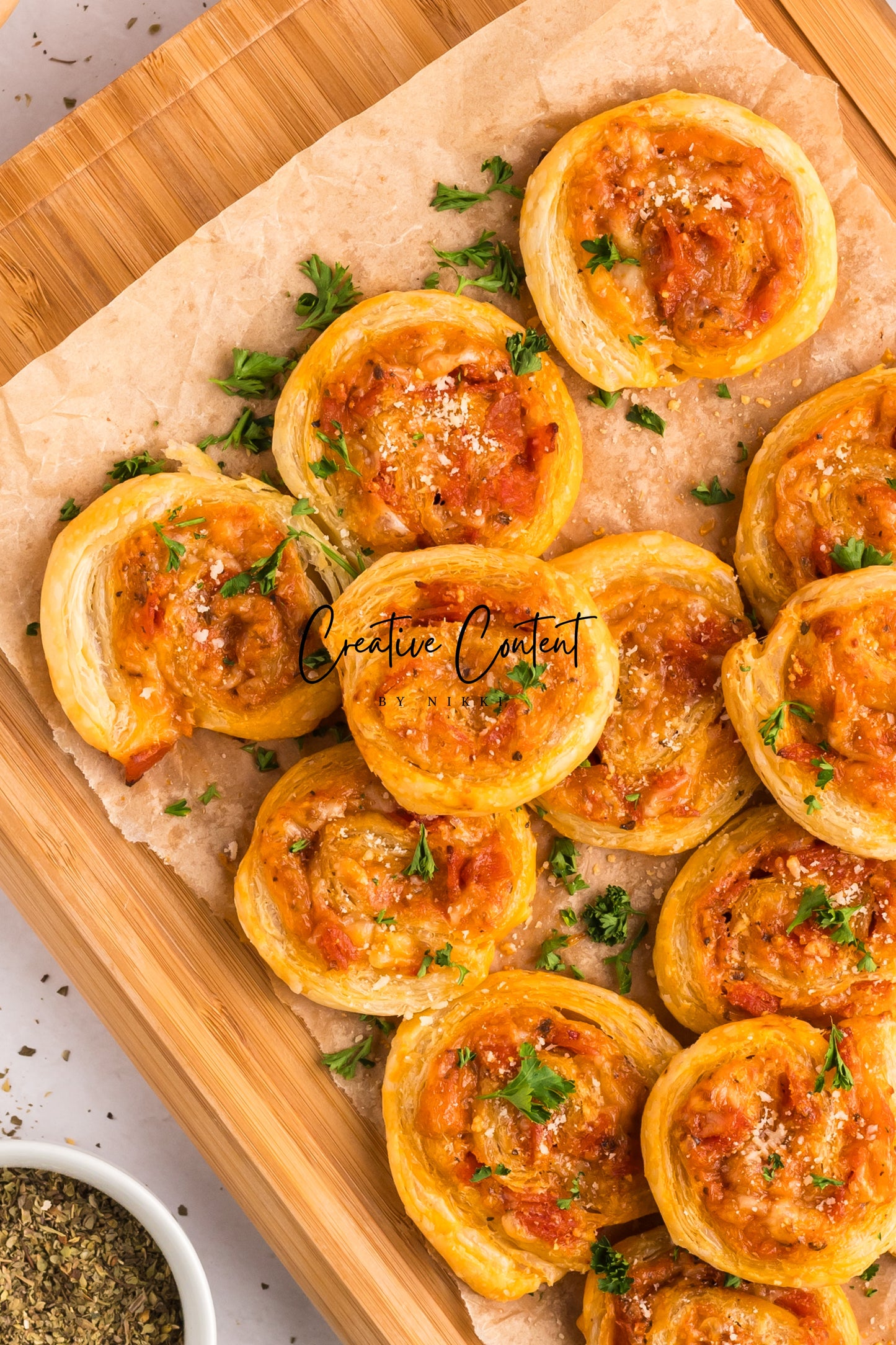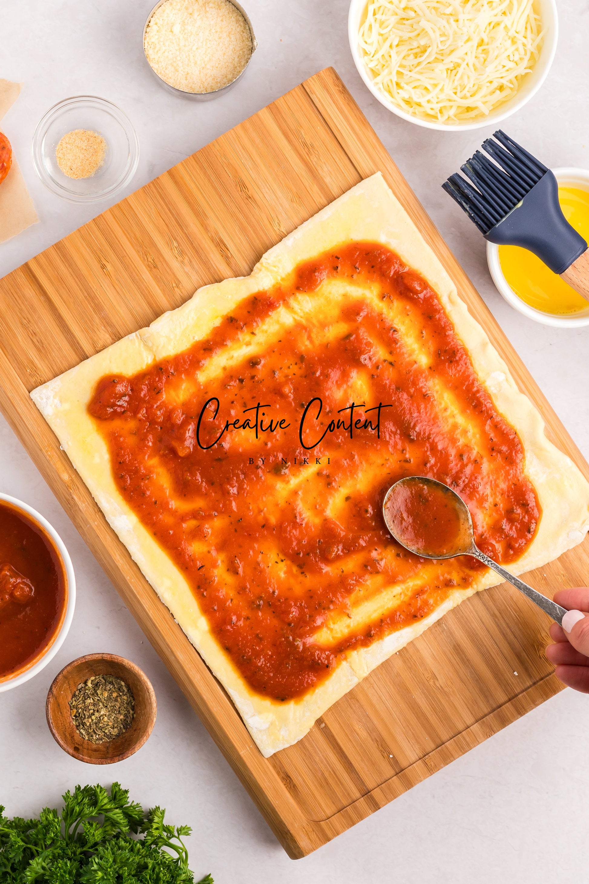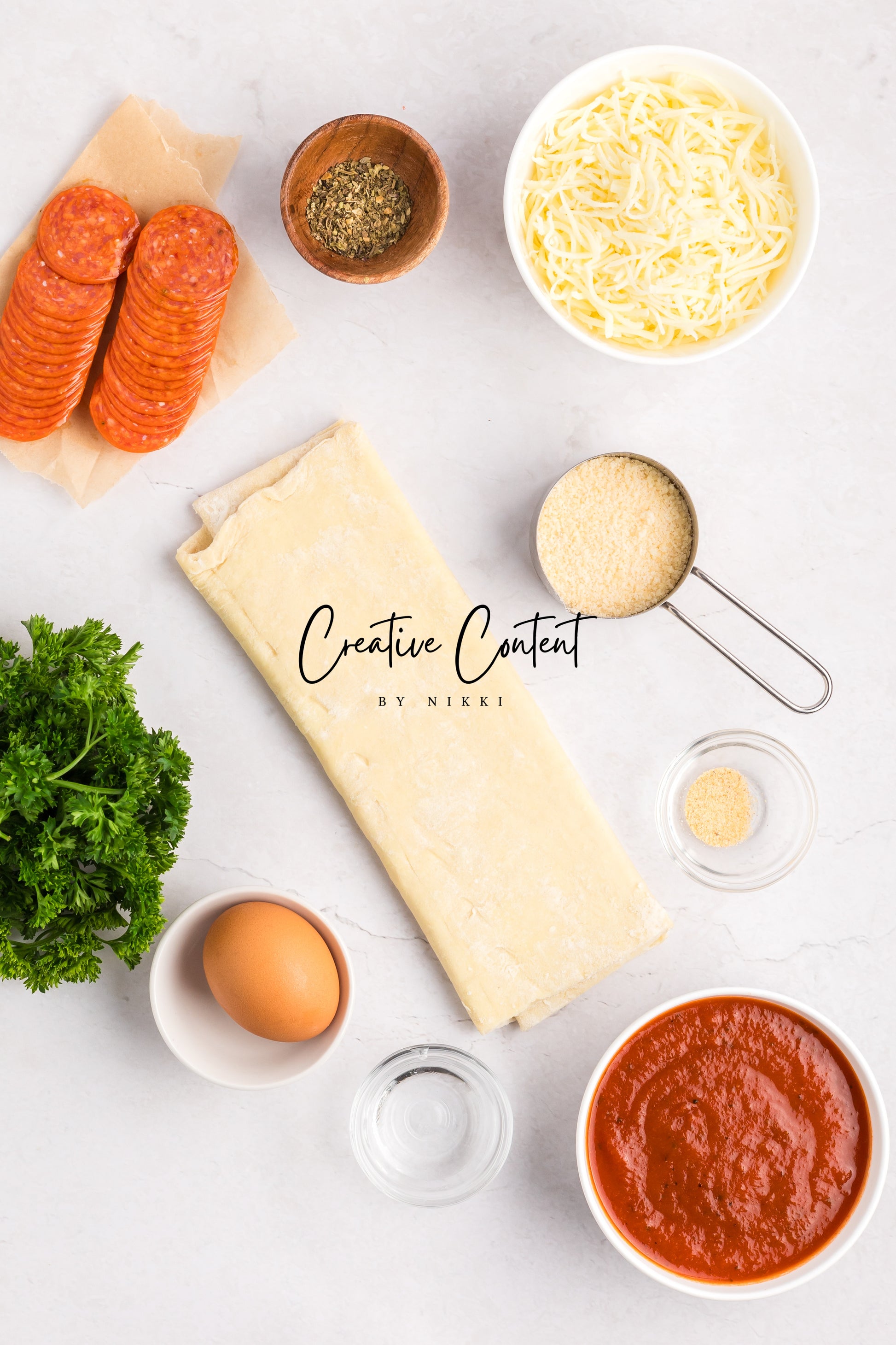 - Featured Ingredients; puff pastry, pizza sauce or marinara sauce, mozzarella cheese, pepperoni, Italian seasoning, garlic powder, avocado oil, parmesan cheese, and basil.
