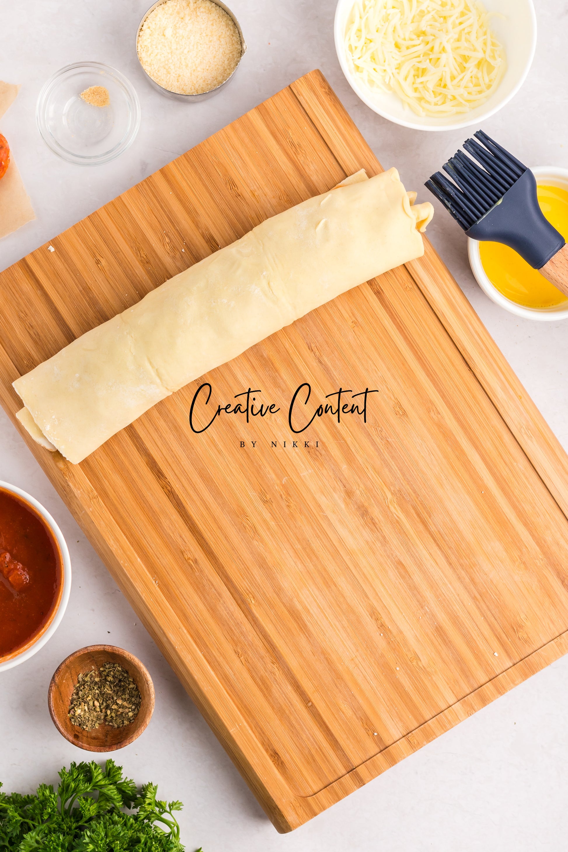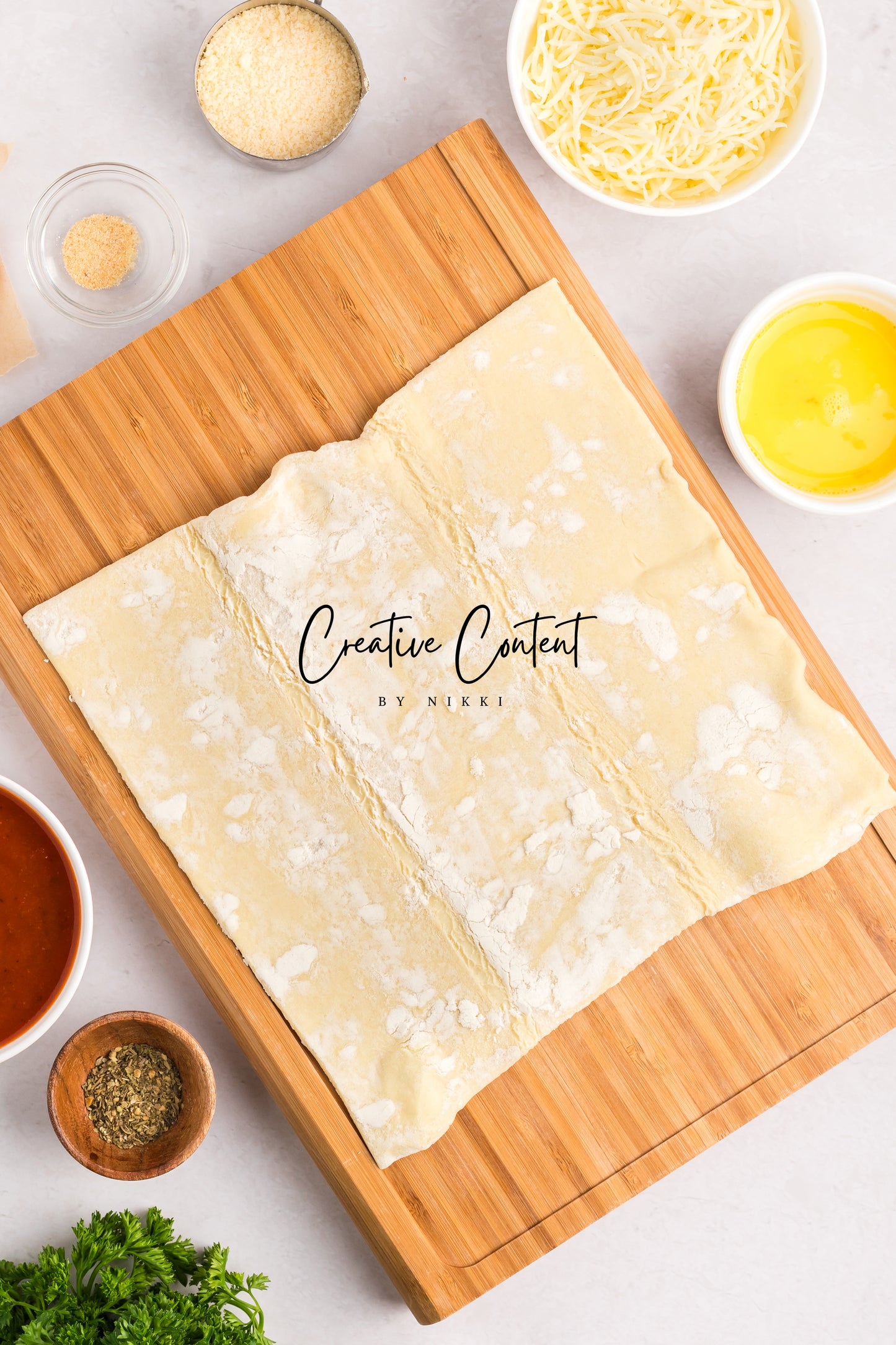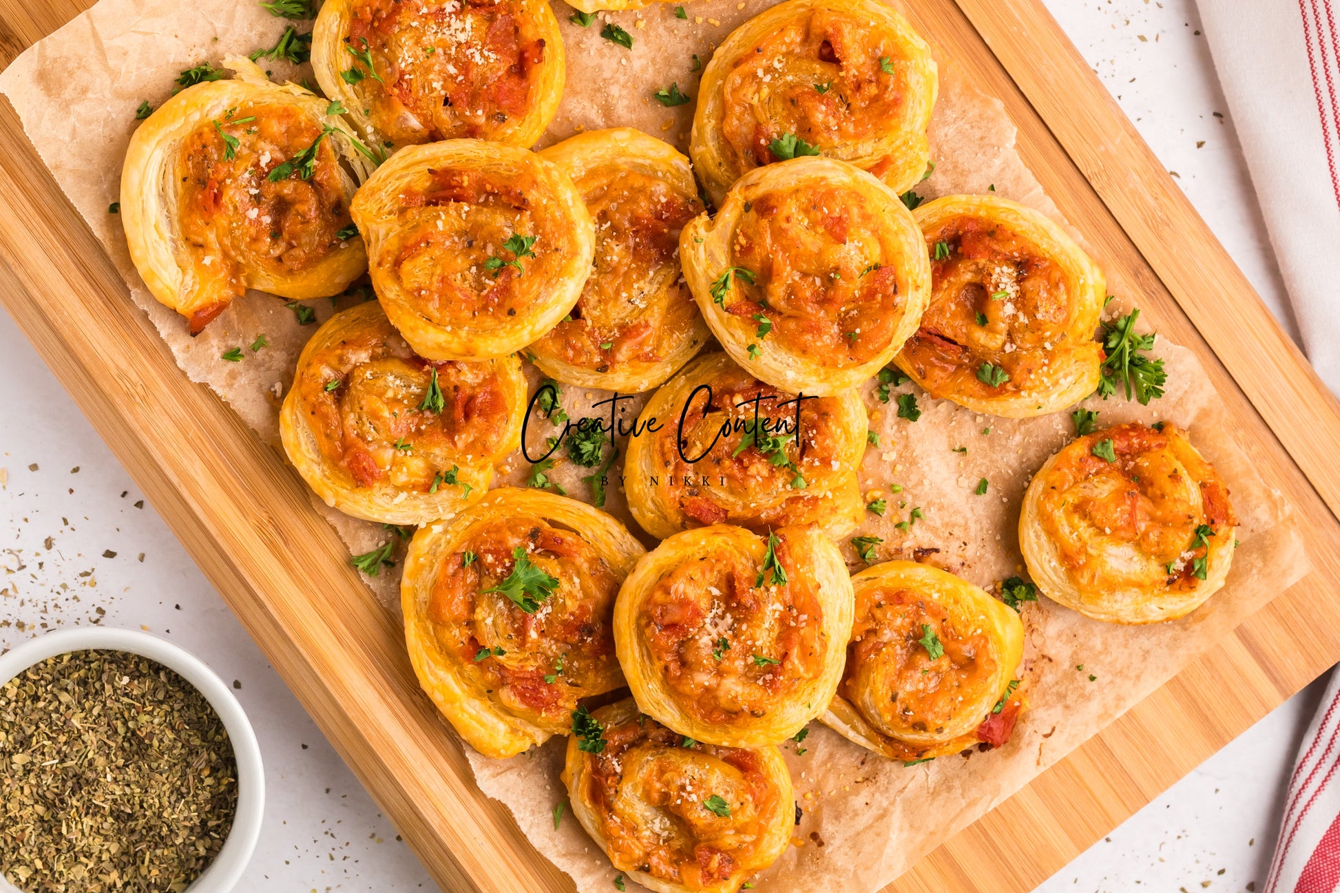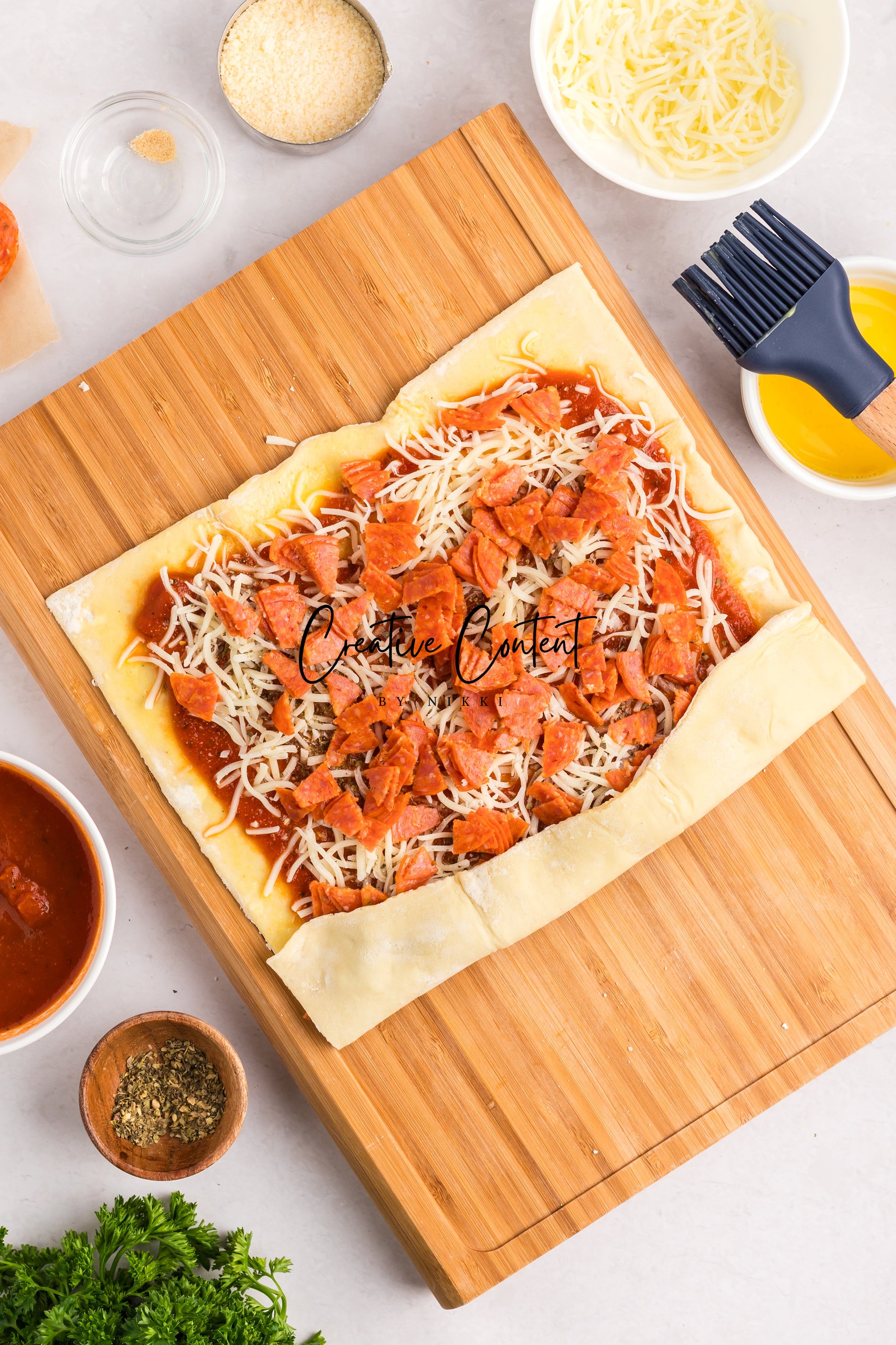 - Featured Ingredients; puff pastry, pizza sauce or marinara sauce, mozzarella cheese, pepperoni, Italian seasoning, garlic powder, avocado oil, parmesan cheese, and basil.