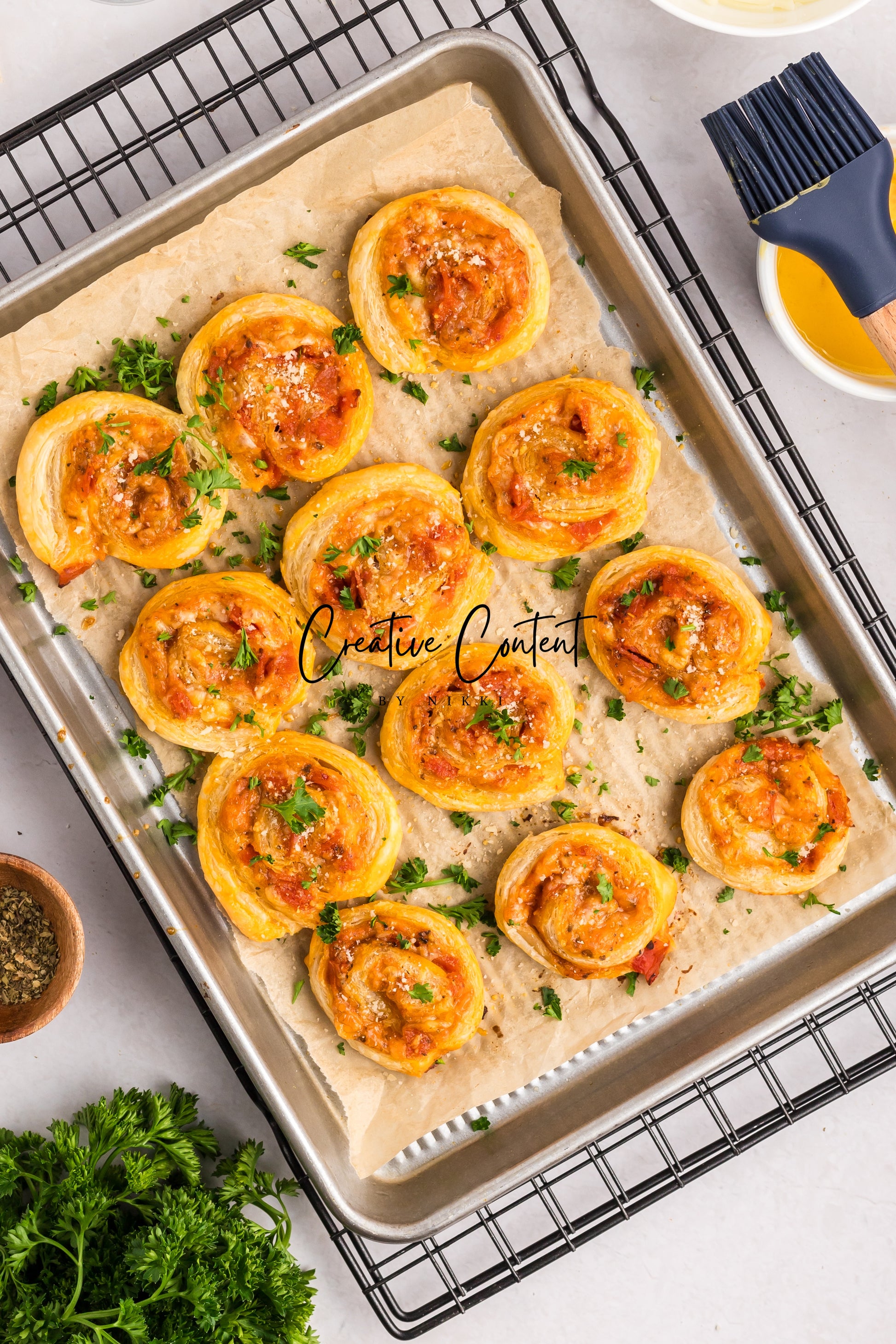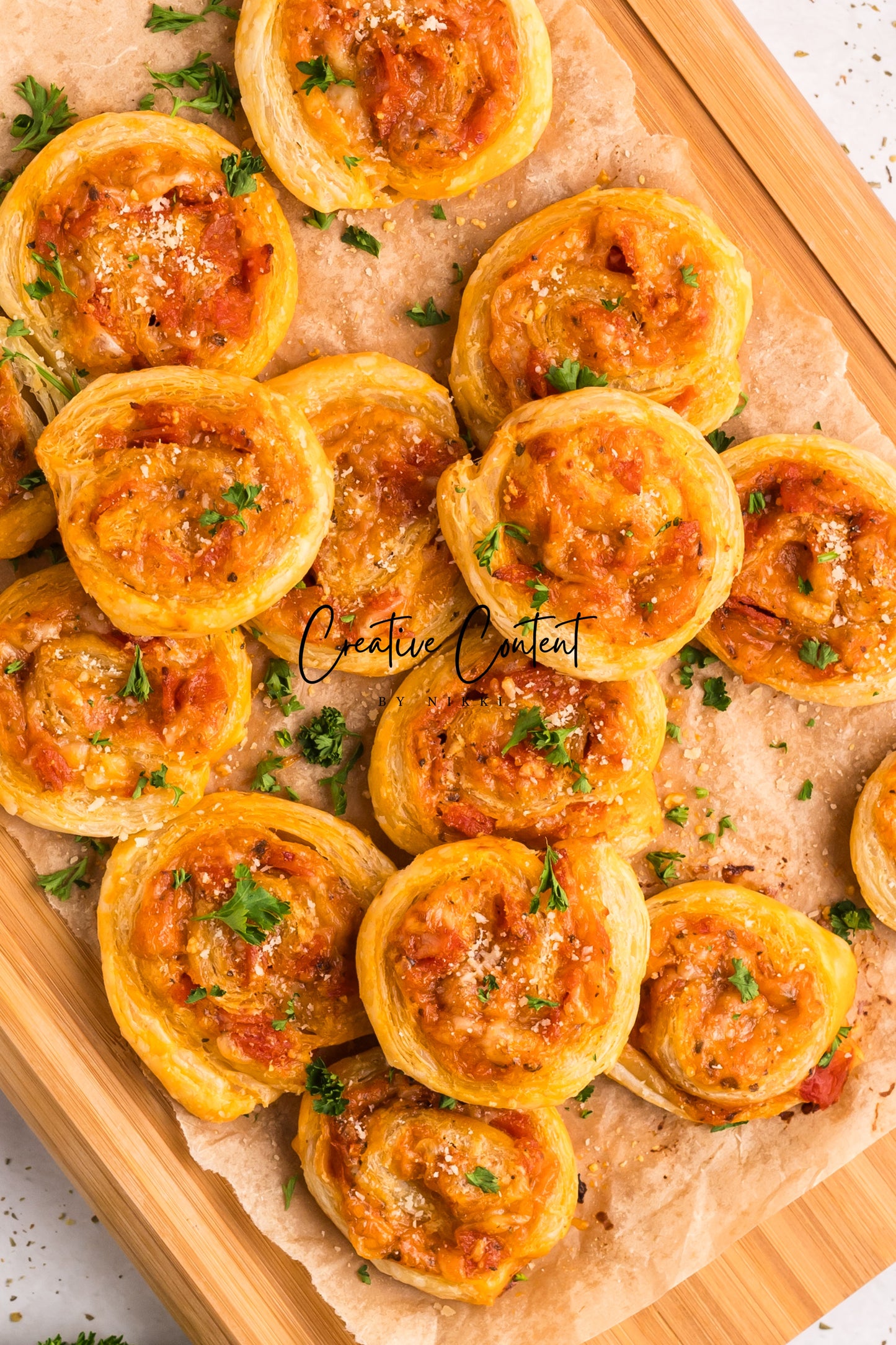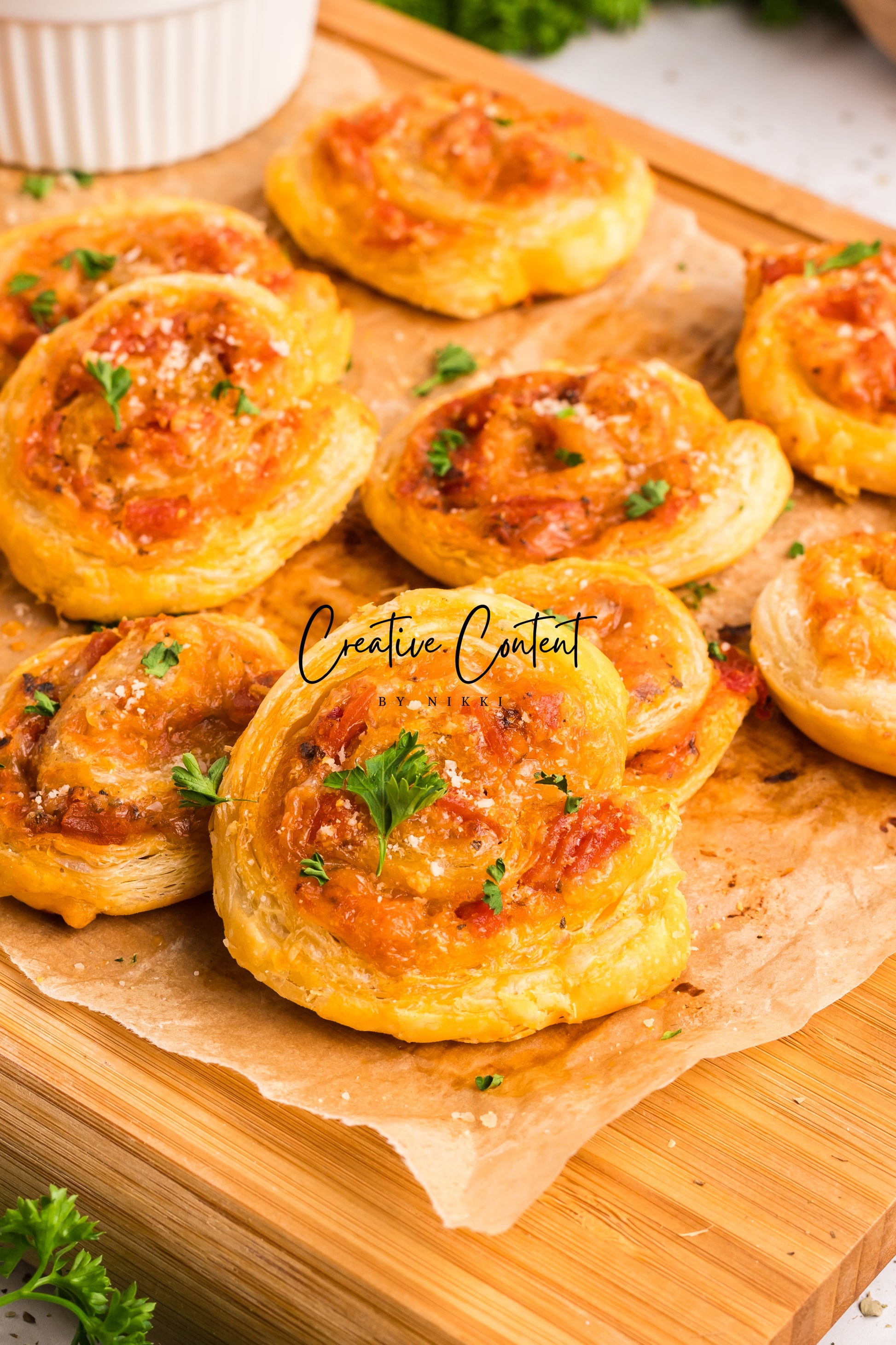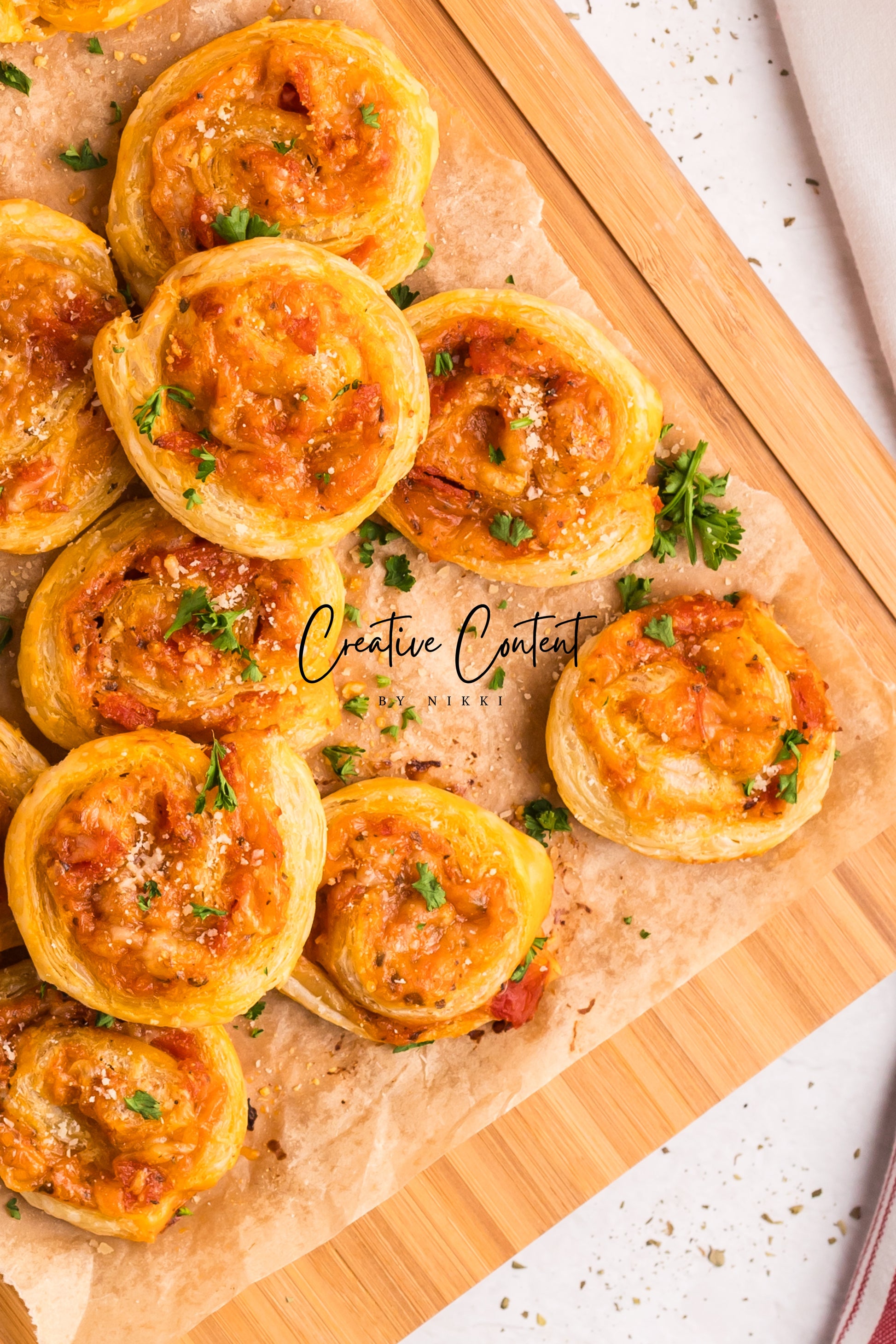 These pepperoni pinwheels are fluffy and loaded with pizza sauce, cheese, and Italian flavor in every bite. The fresh parsley on top takes this recipe to the next level. If you want to take an appetizer to impress this one will disappear. The flaky golden brown puff pastry makes for the perfect pepperoni pinwheels.