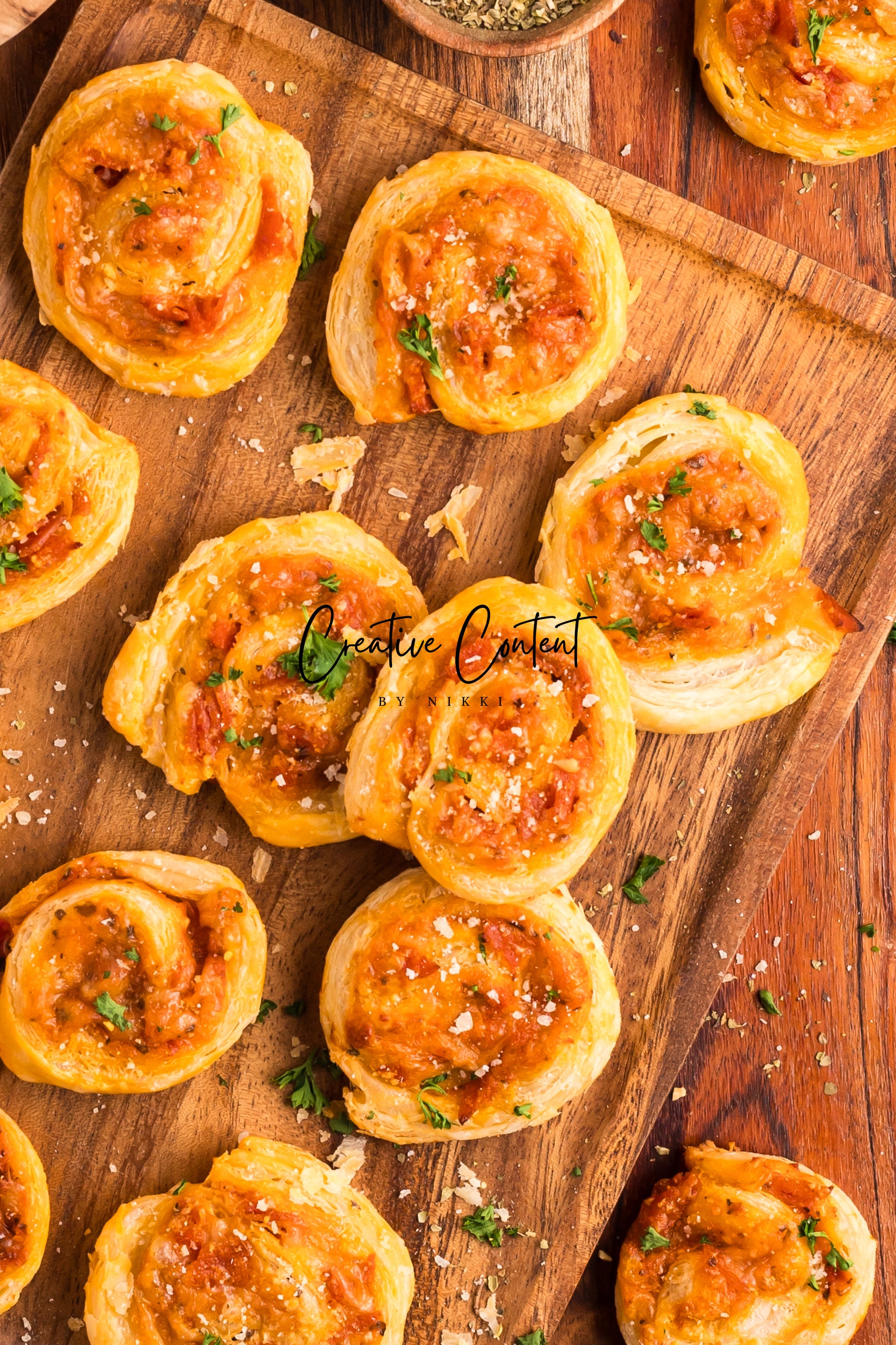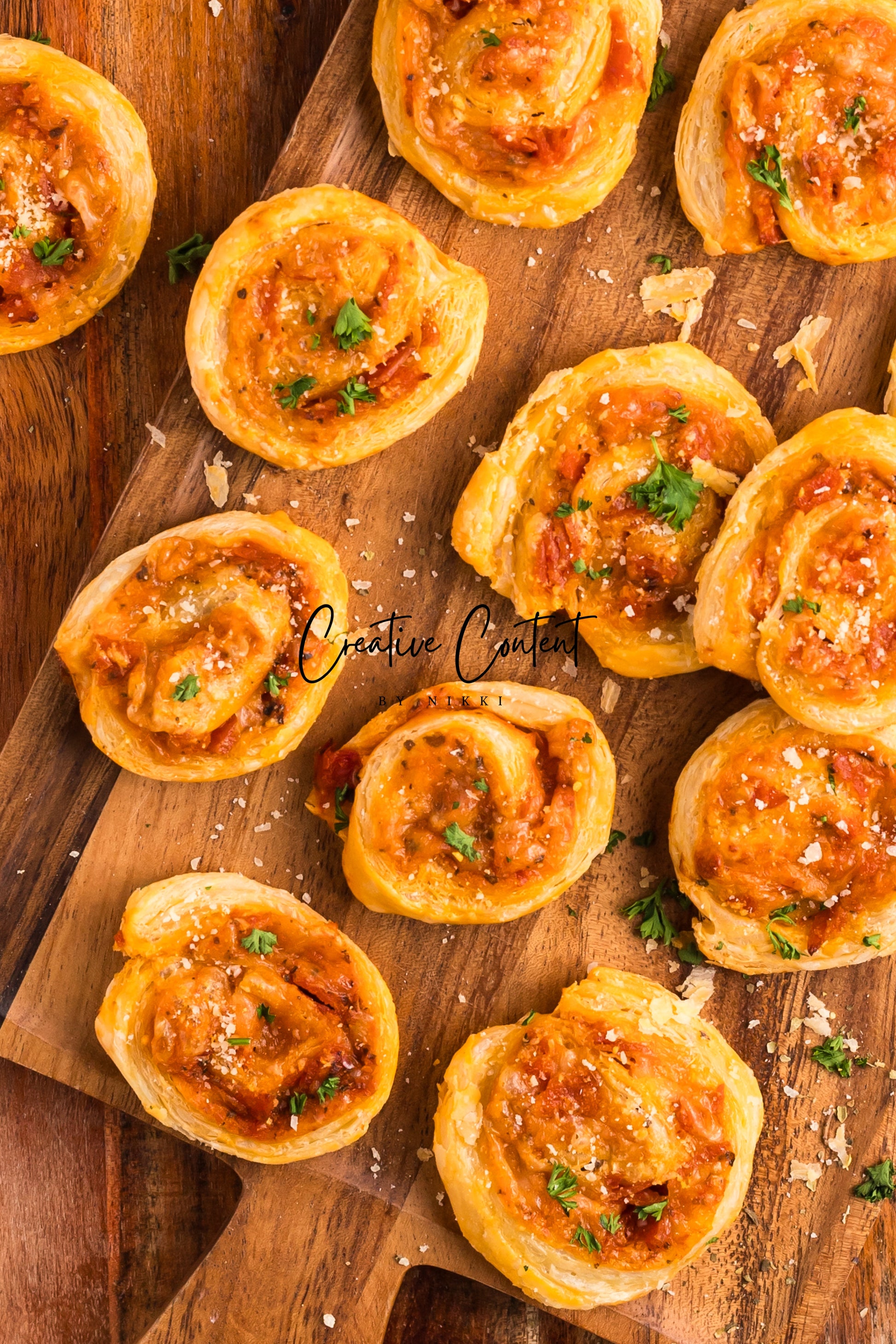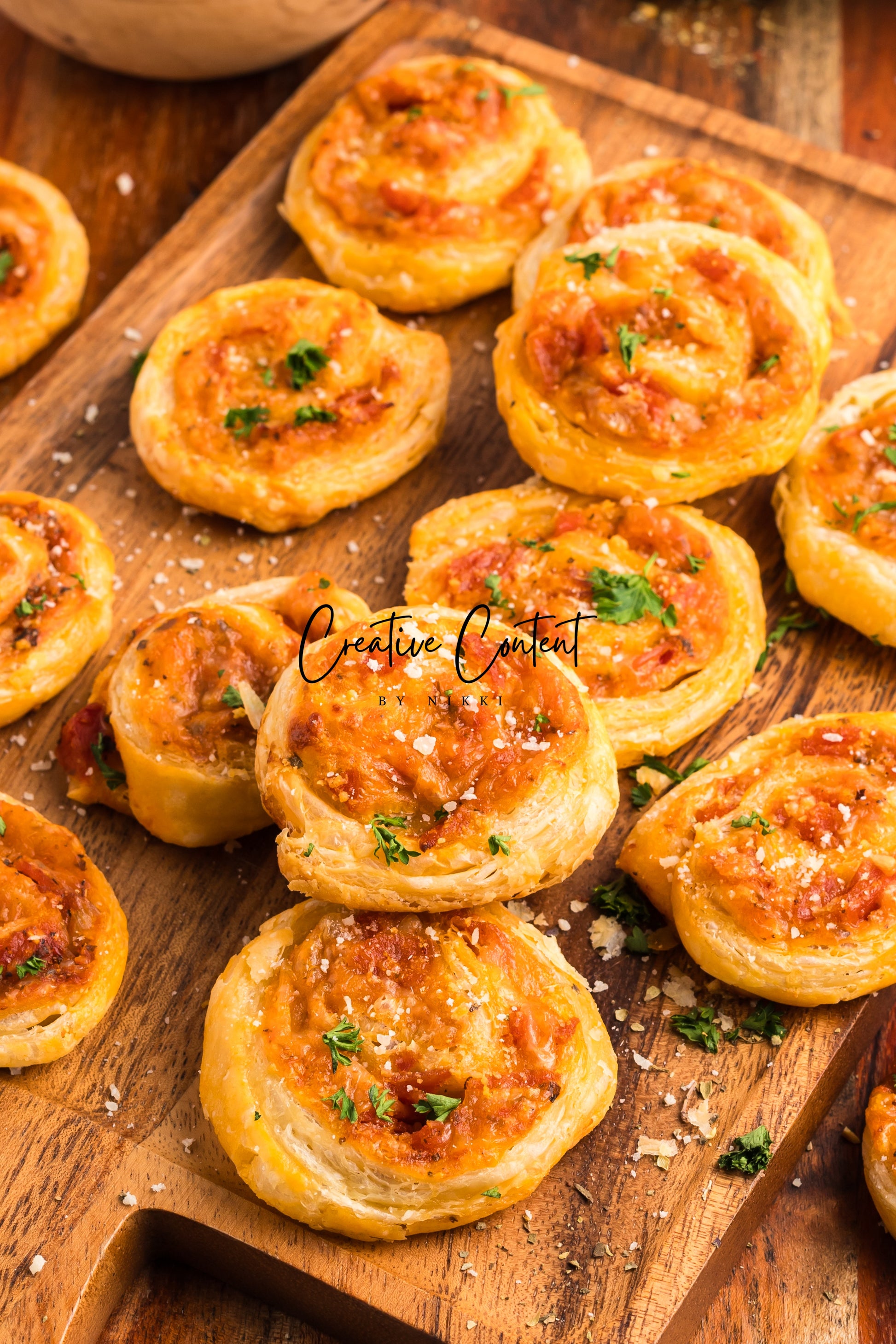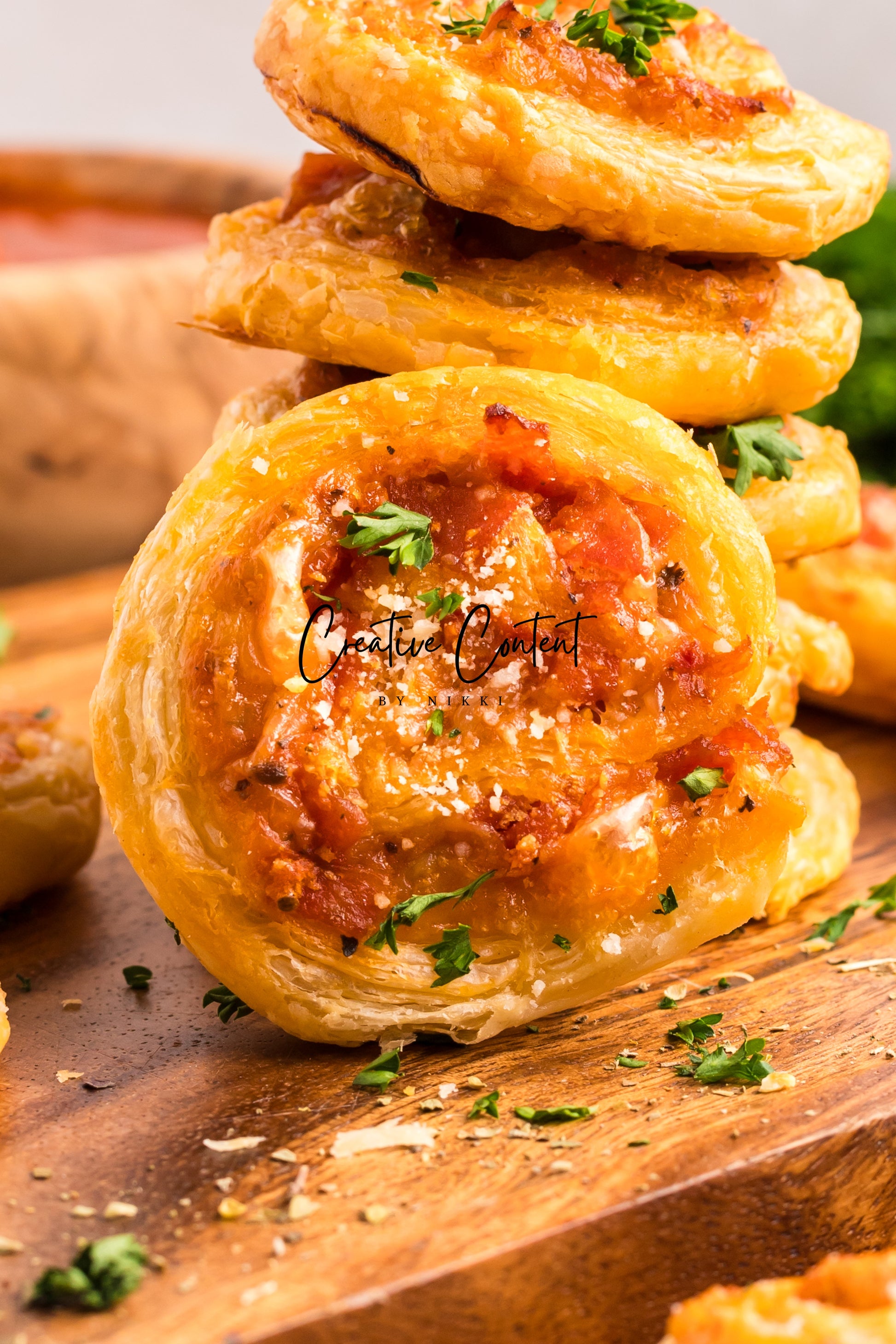 These pepperoni pinwheels are fluffy and loaded with pizza sauce, cheese, and Italian flavor in every bite. The fresh parsley on top takes this recipe to the next level. If you want to take an appetizer to impress this one will disappear. The flaky golden brown puff pastry makes for the perfect pepperoni pinwheels.