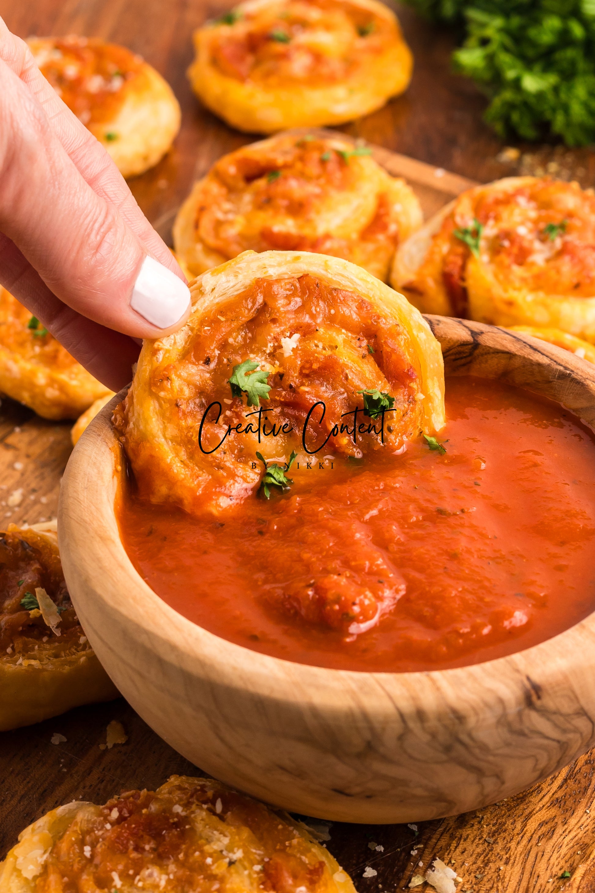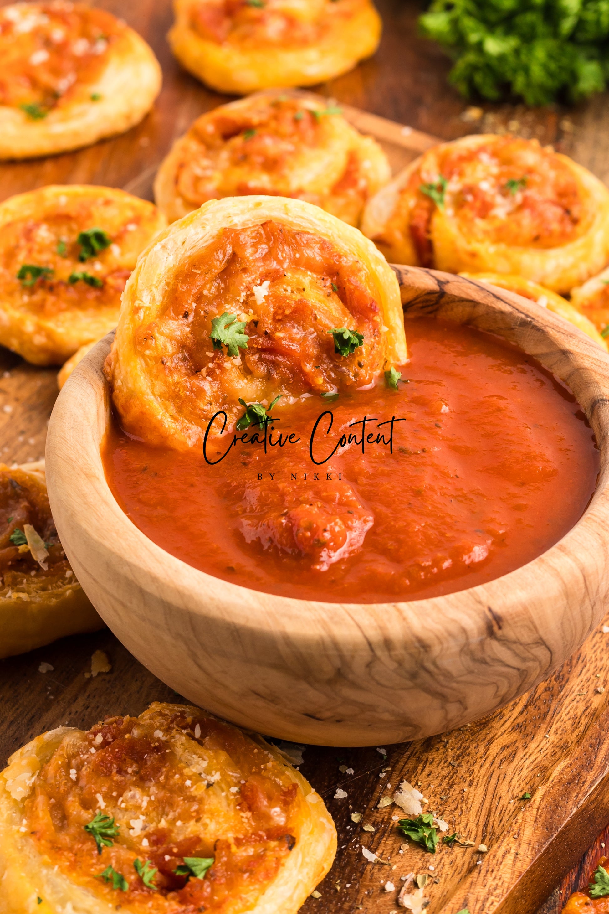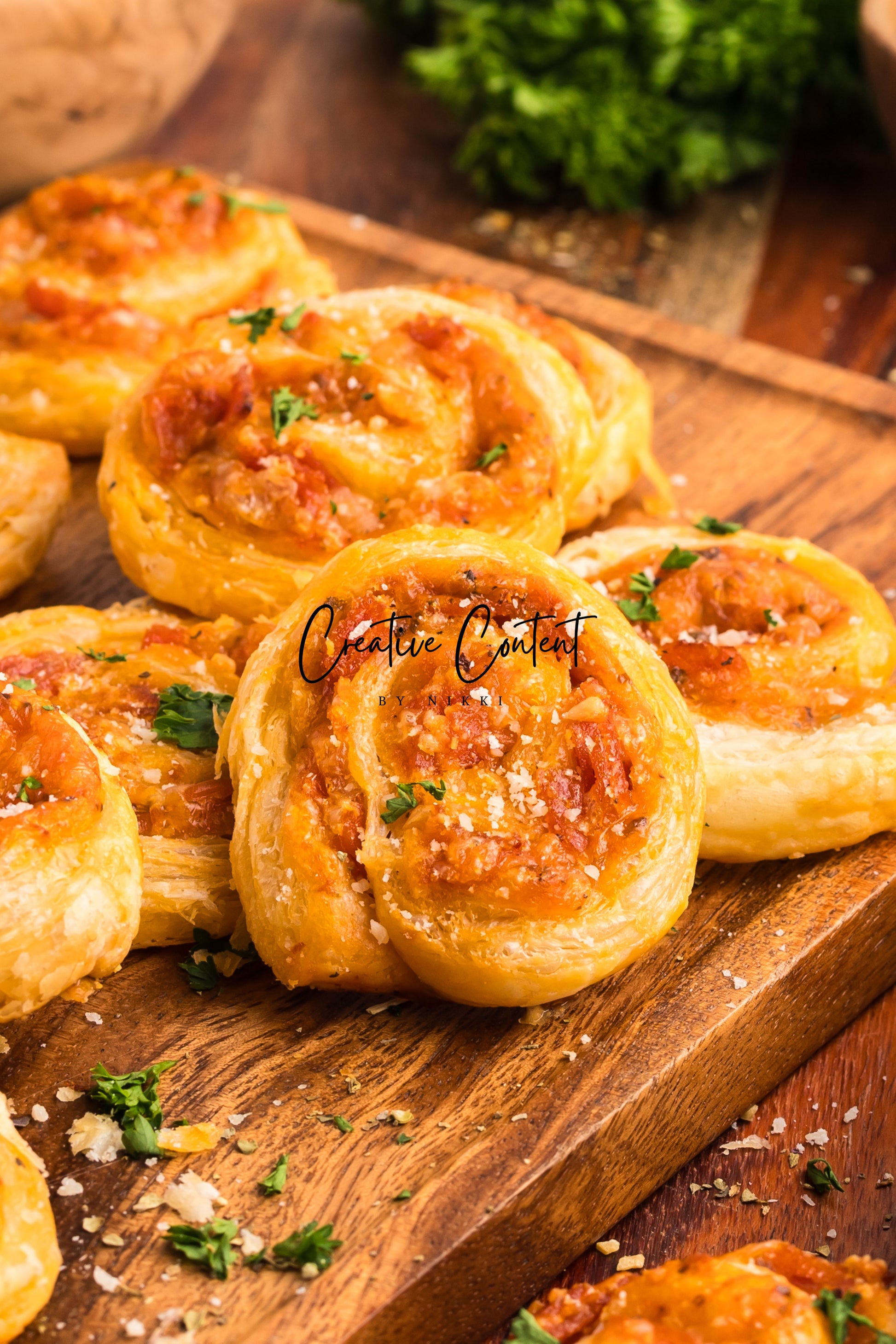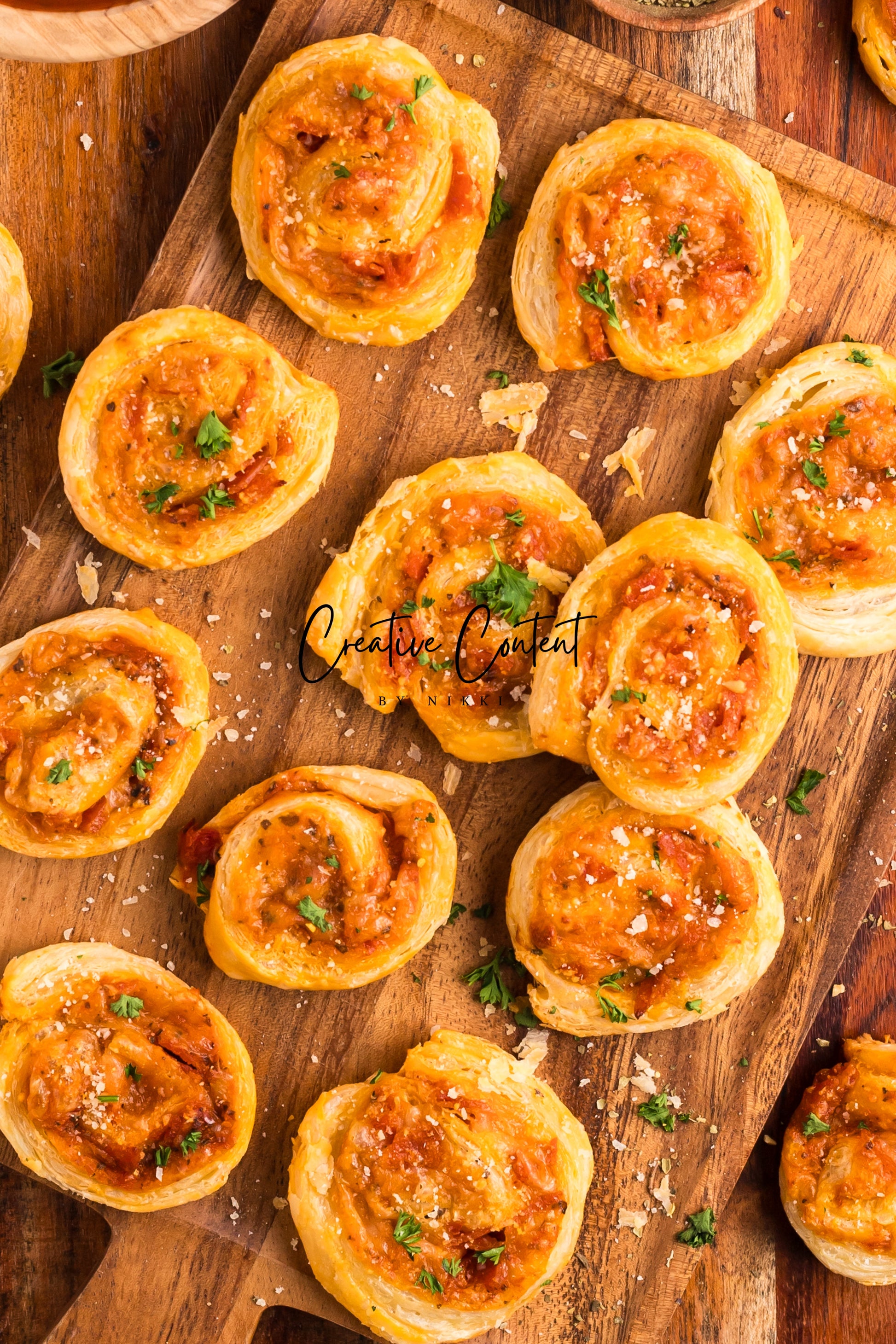 These pepperoni pinwheels are fluffy and loaded with pizza sauce, cheese, and Italian flavor in every bite. The fresh parsley on top takes this recipe to the next level. If you want to take an appetizer to impress this one will disappear. The flaky golden brown puff pastry makes for the perfect pepperoni pinwheels.