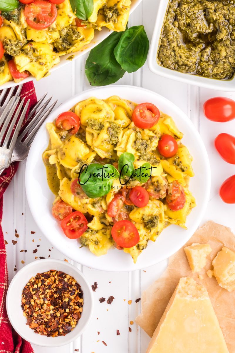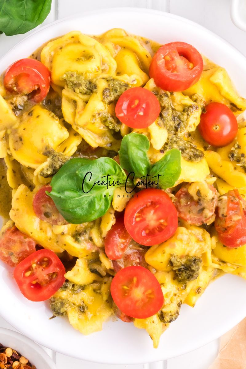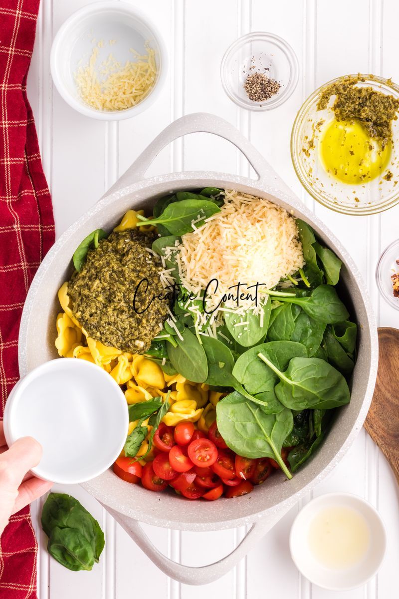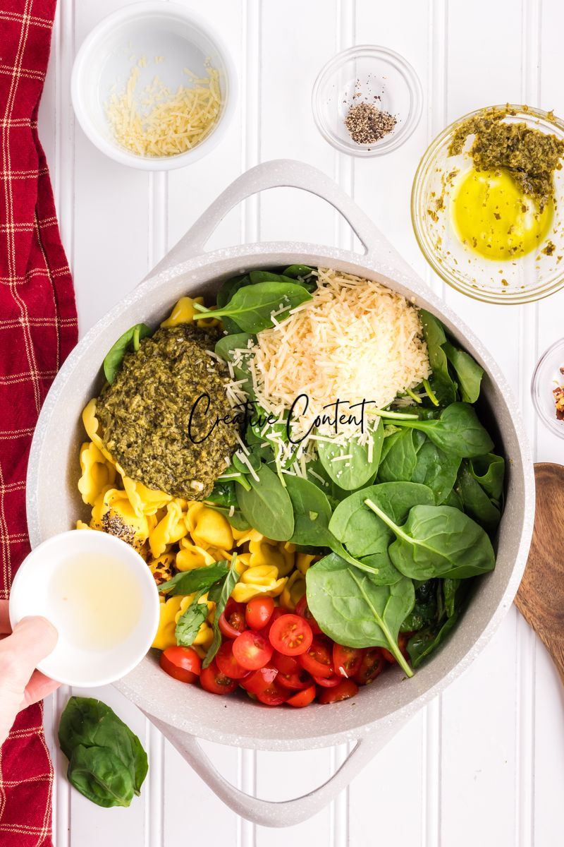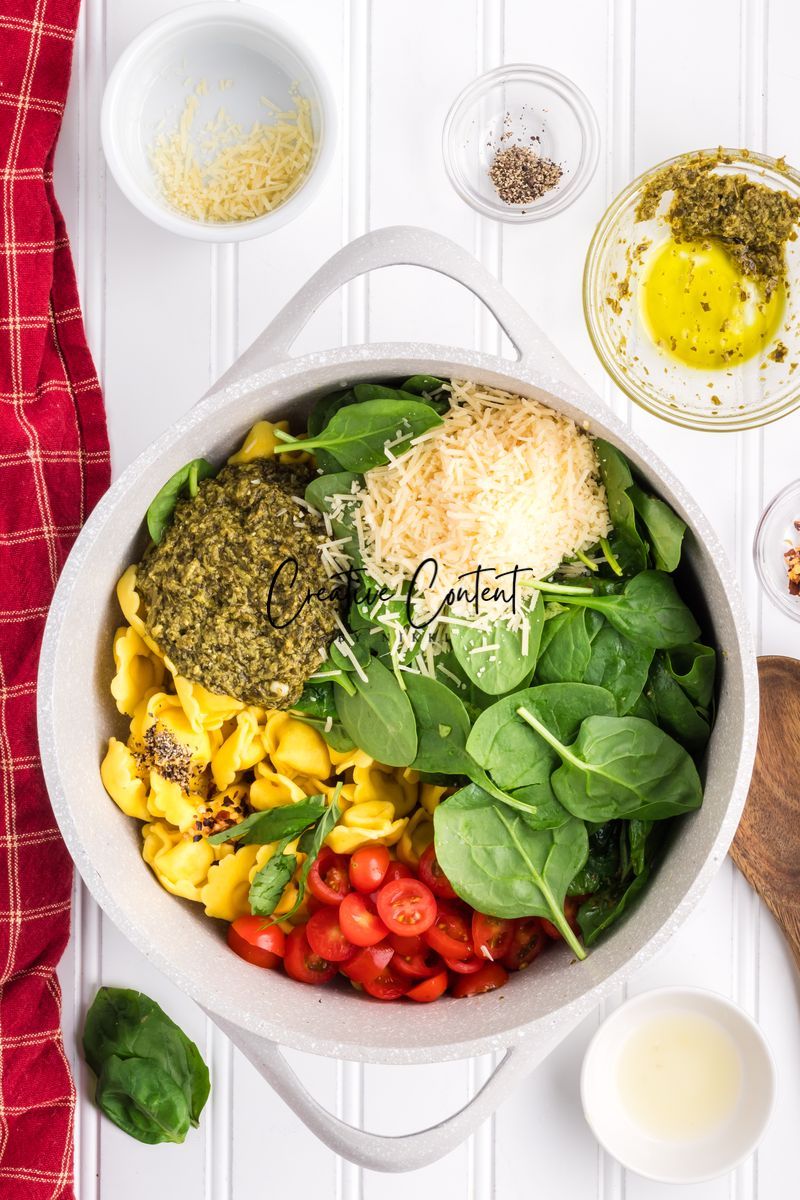 - Ingredients needed; frozen cheese tortellini, pasta water, cherry tomatoes, spinach, pesto, lemon juice, dried basil, and parmesan cheese.