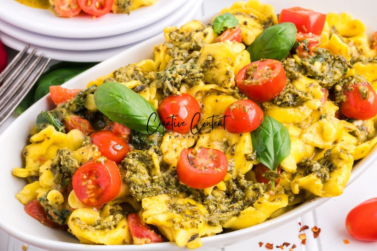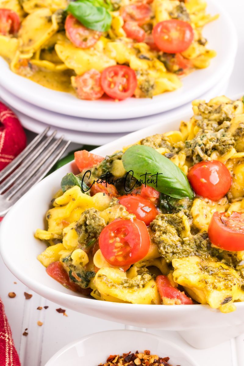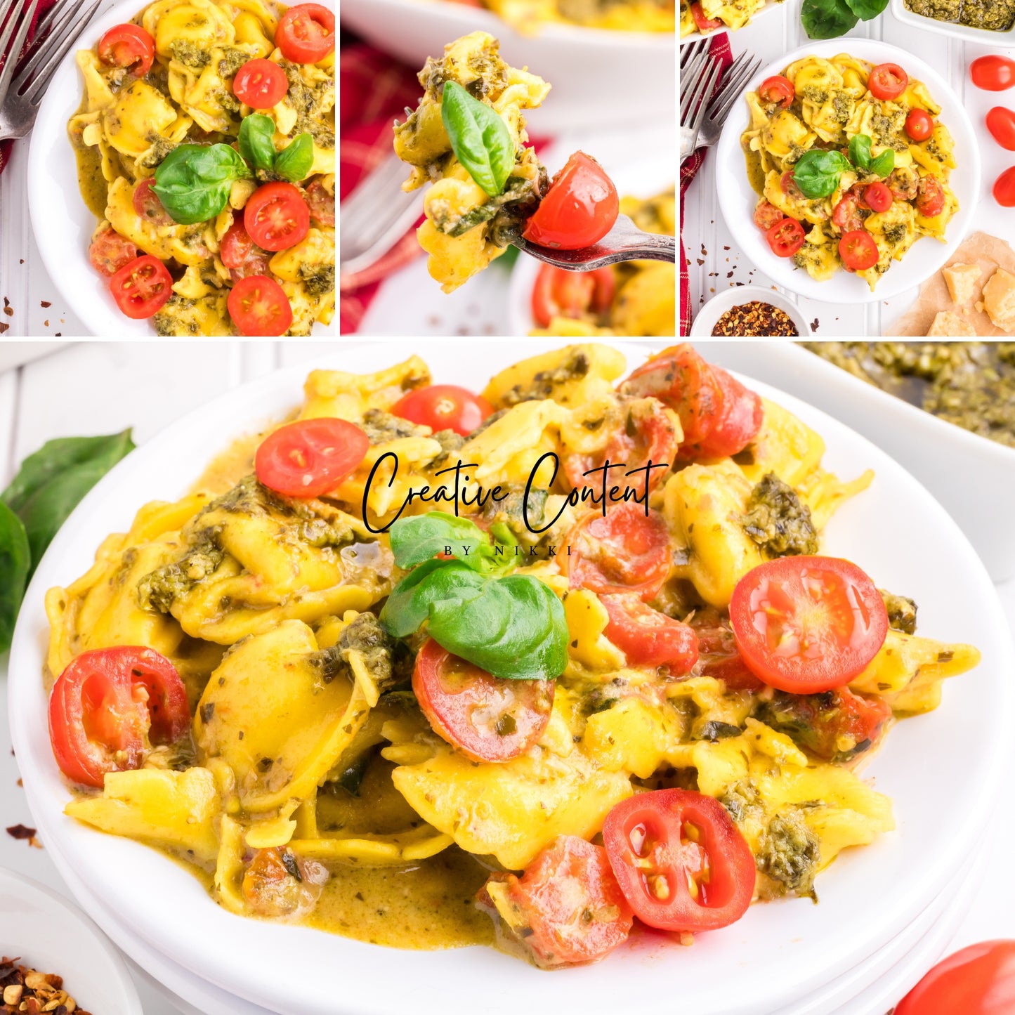 This pesto tortellini is an easy 10-minute dish that is perfect for a busy weekday night. With just a handful of ingredients, you will have a gourmet meal. The creamy pesto with the fresh spinach and juicy tomatoes compliments the cheese tortellini.