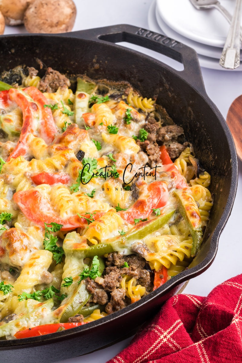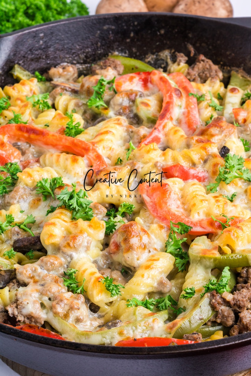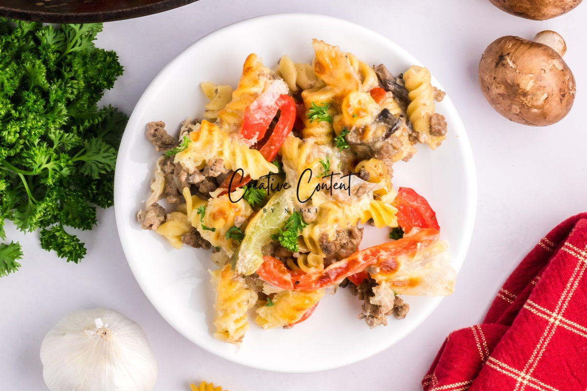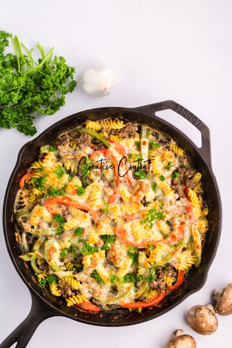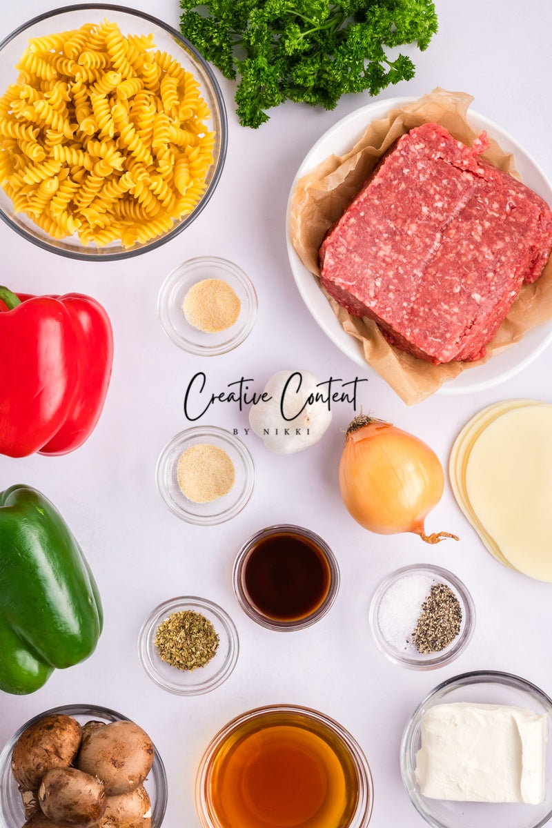 - Ingredients needed; pasta, ground beef, yellow onion, garlic cloves, Worcestershire sauce, onion powder, garlic powder, dried oregano, coarse kosher salt, black pepper, green bell pepper, red bell pepper, mushrooms, cream cheese, beef broth, provolone cheese, and parsley.
