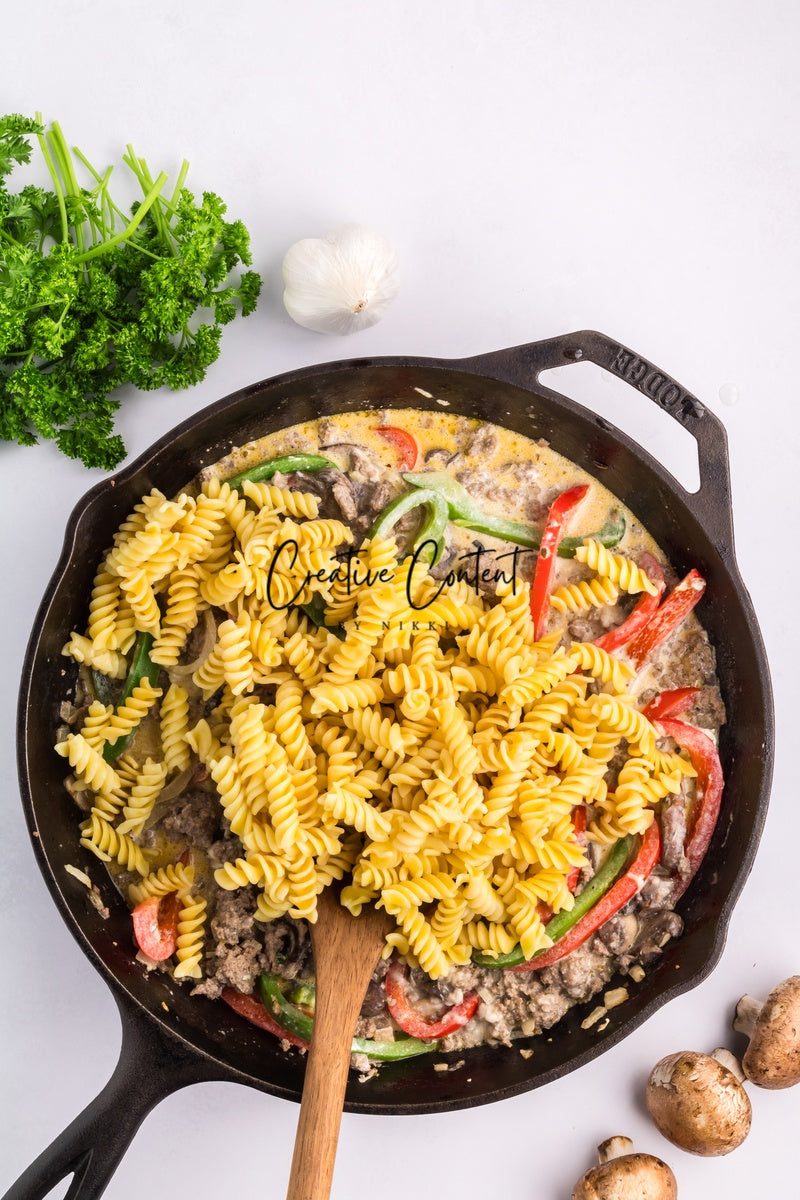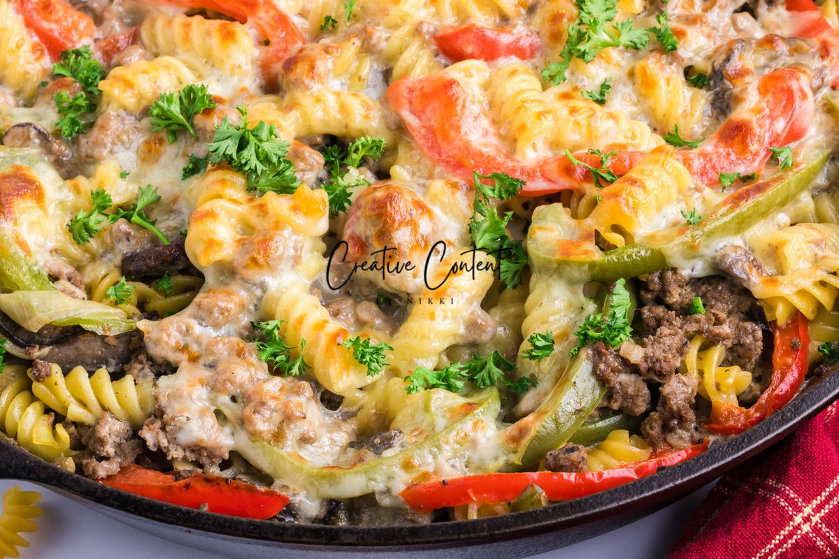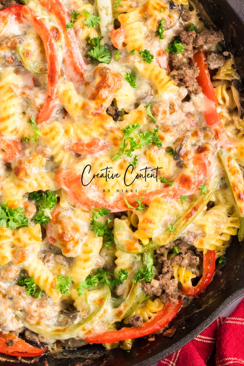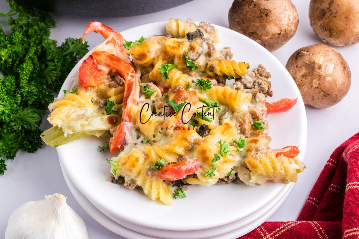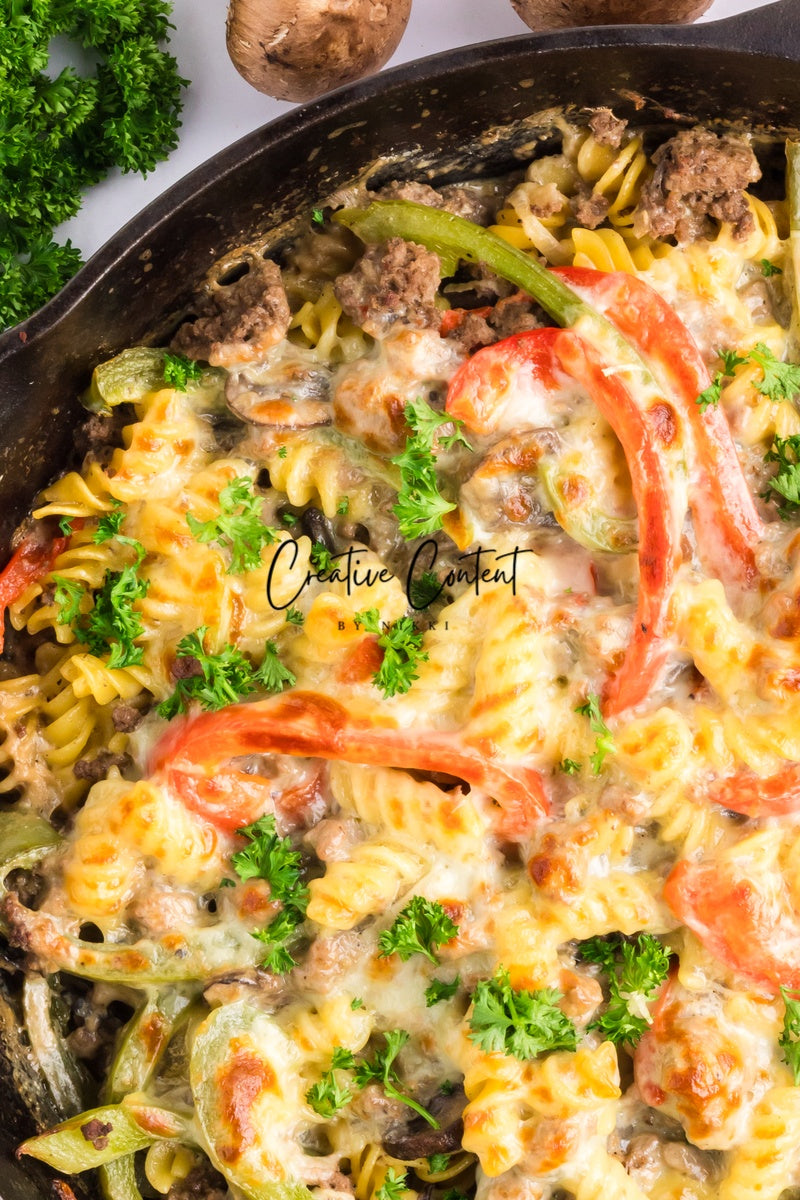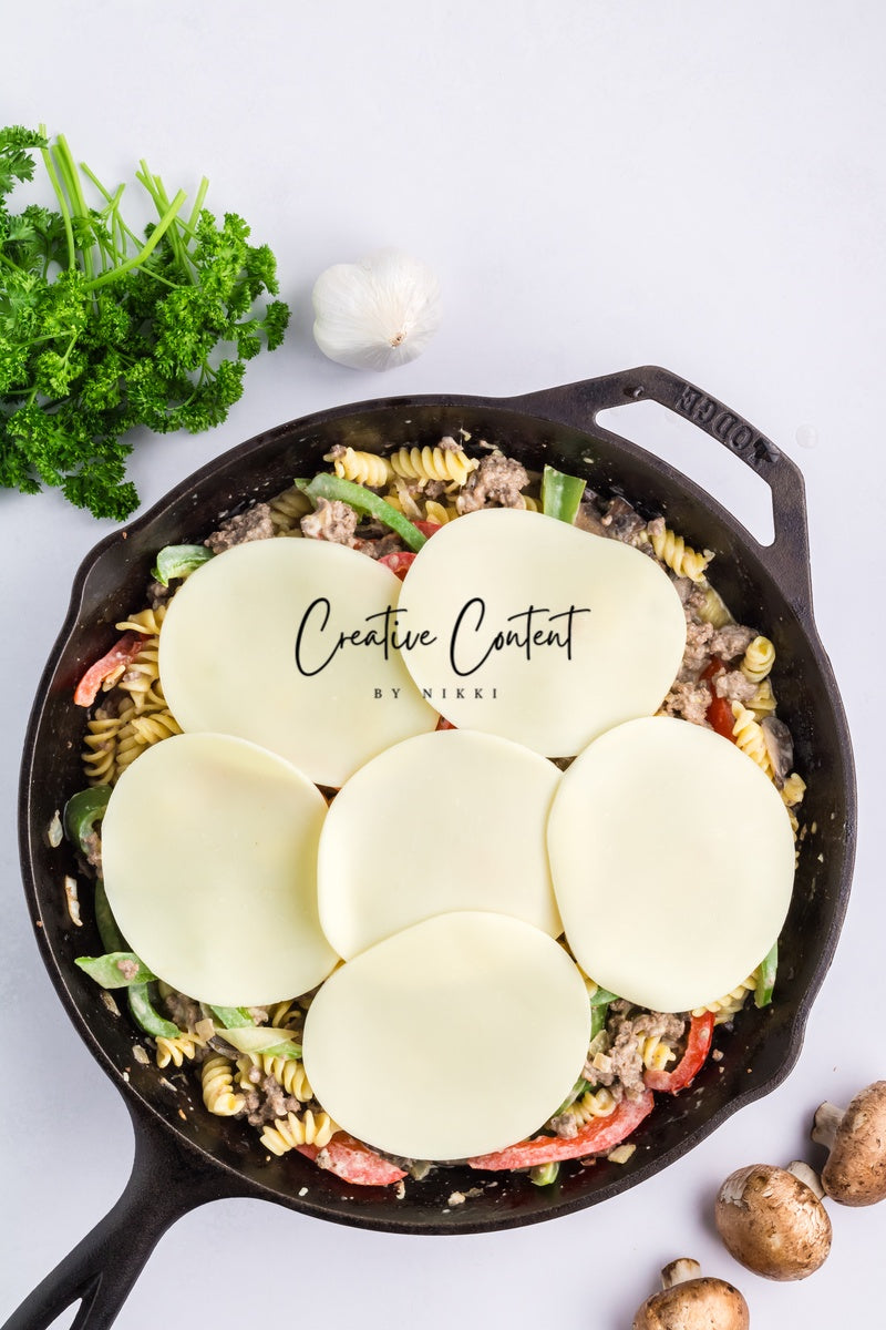 - Ingredients needed; pasta, ground beef, yellow onion, garlic cloves, Worcestershire sauce, onion powder, garlic powder, dried oregano, coarse kosher salt, black pepper, green bell pepper, red bell pepper, mushrooms, cream cheese, beef broth, provolone cheese, and parsley.