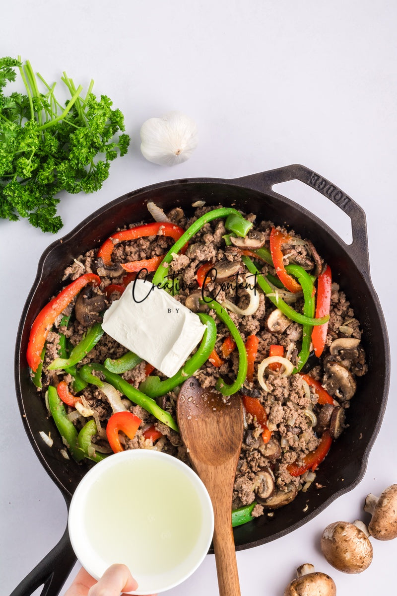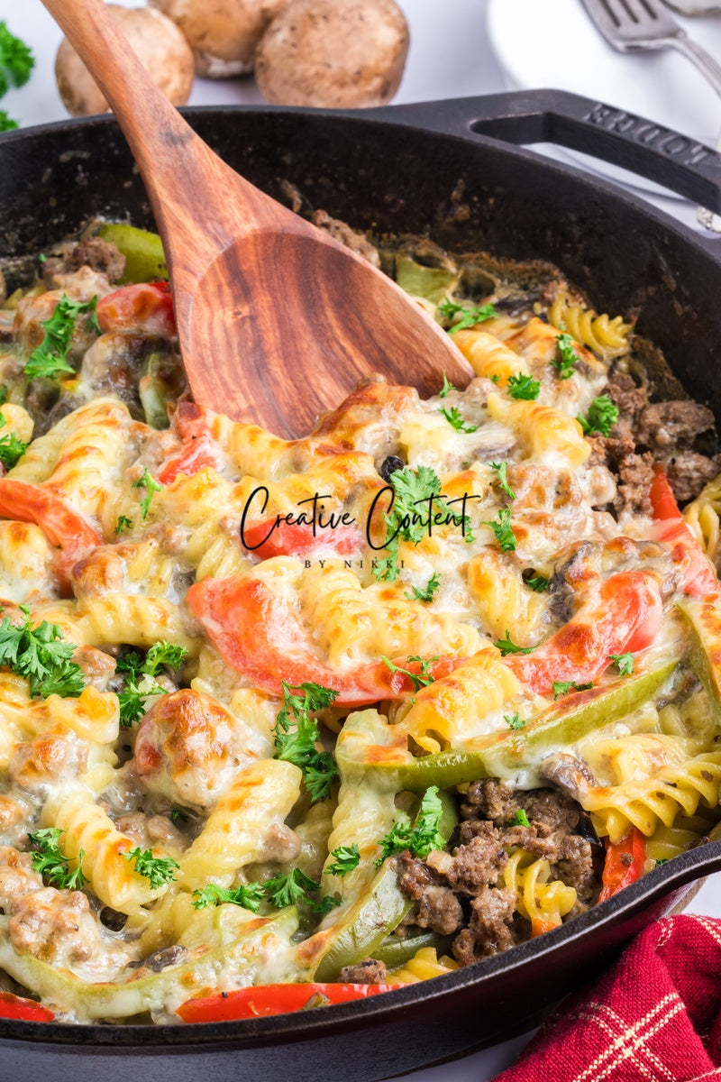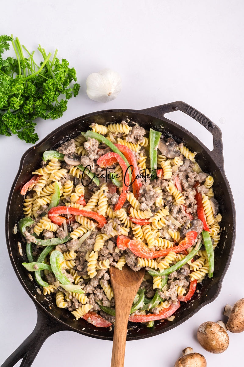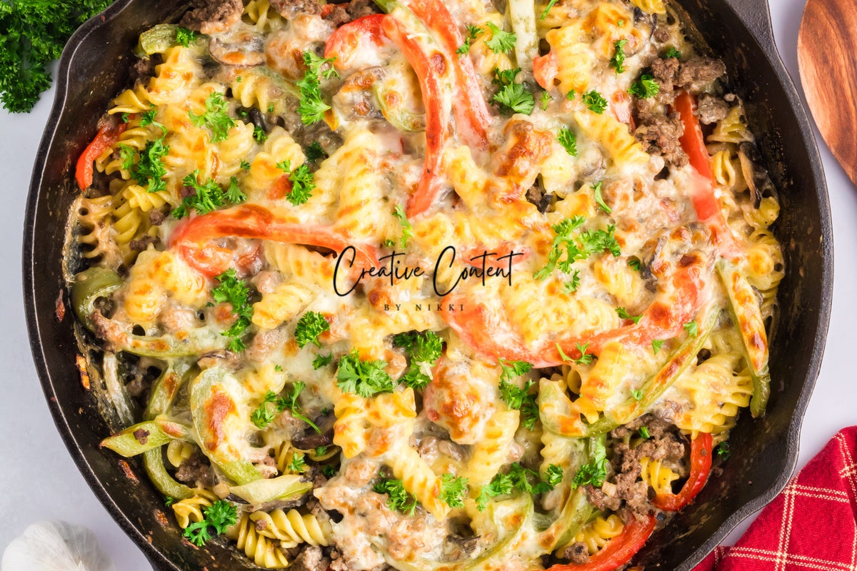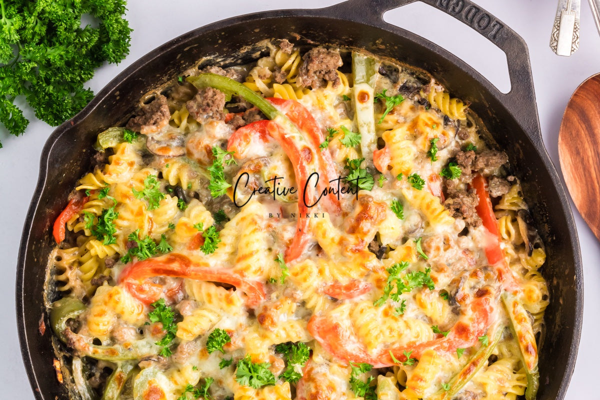 - Ingredients needed; pasta, ground beef, yellow onion, garlic cloves, Worcestershire sauce, onion powder, garlic powder, dried oregano, coarse kosher salt, black pepper, green bell pepper, red bell pepper, mushrooms, cream cheese, beef broth, provolone cheese, and parsley.