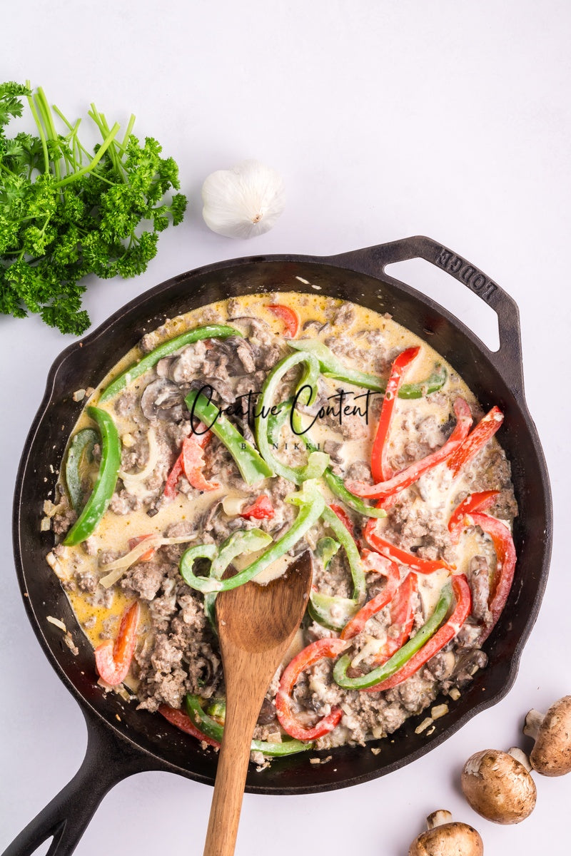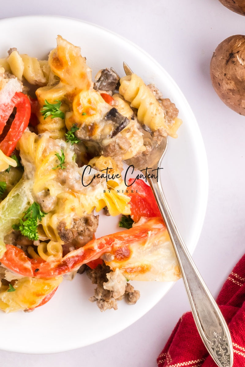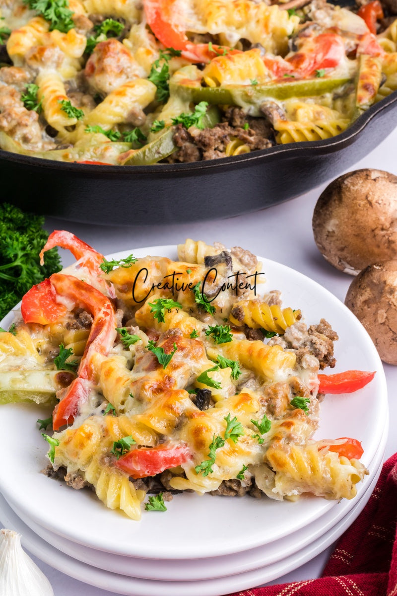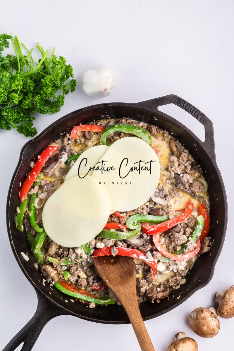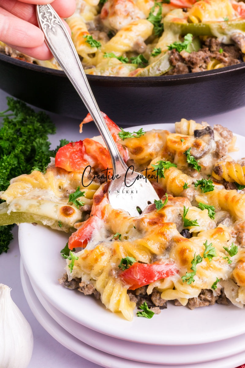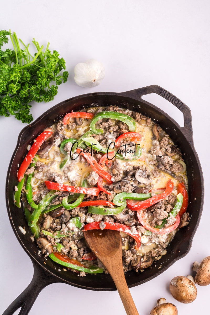 - Ingredients needed; pasta, ground beef, yellow onion, garlic cloves, Worcestershire sauce, onion powder, garlic powder, dried oregano, coarse kosher salt, black pepper, green bell pepper, red bell pepper, mushrooms, cream cheese, beef broth, provolone cheese, and parsley.
