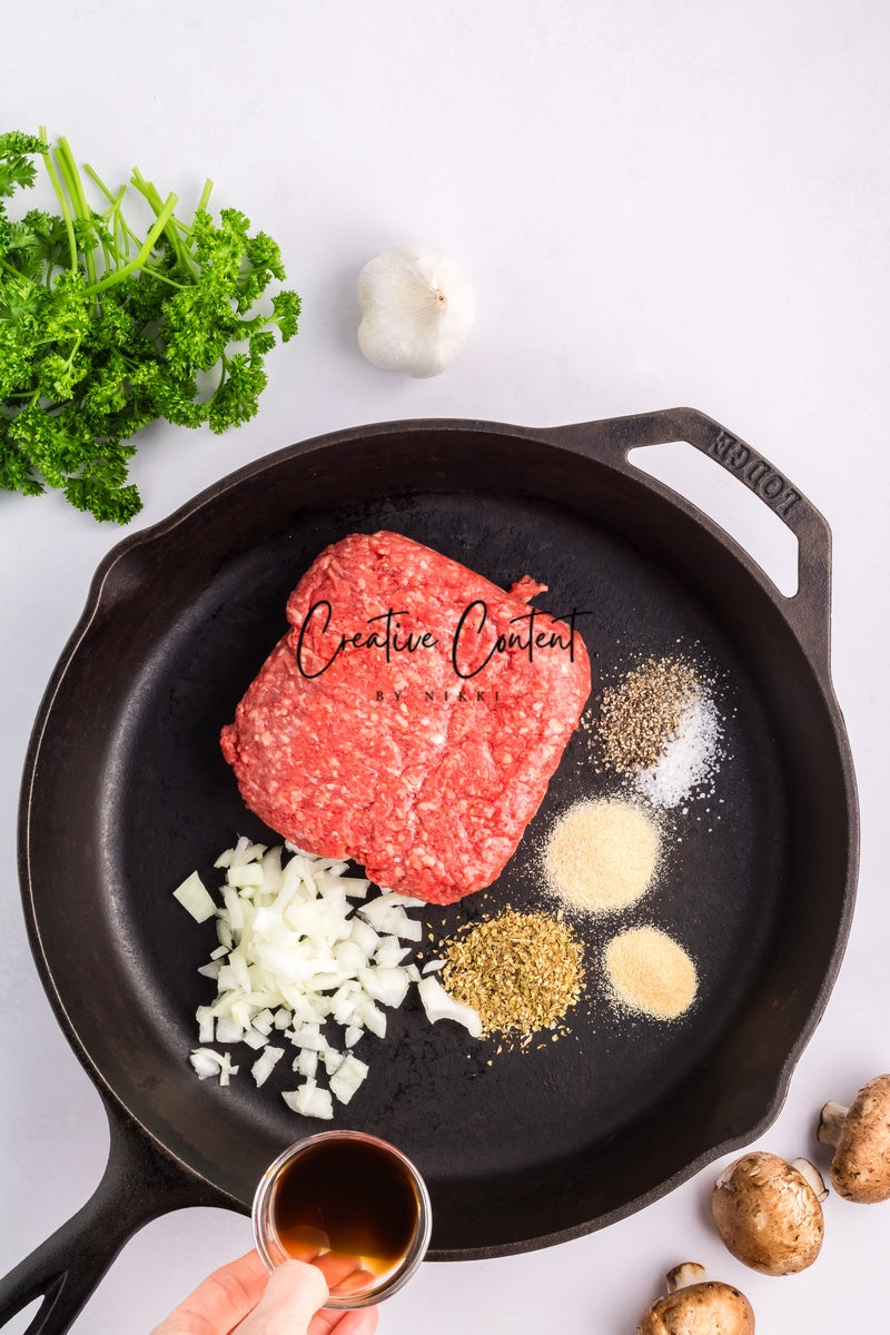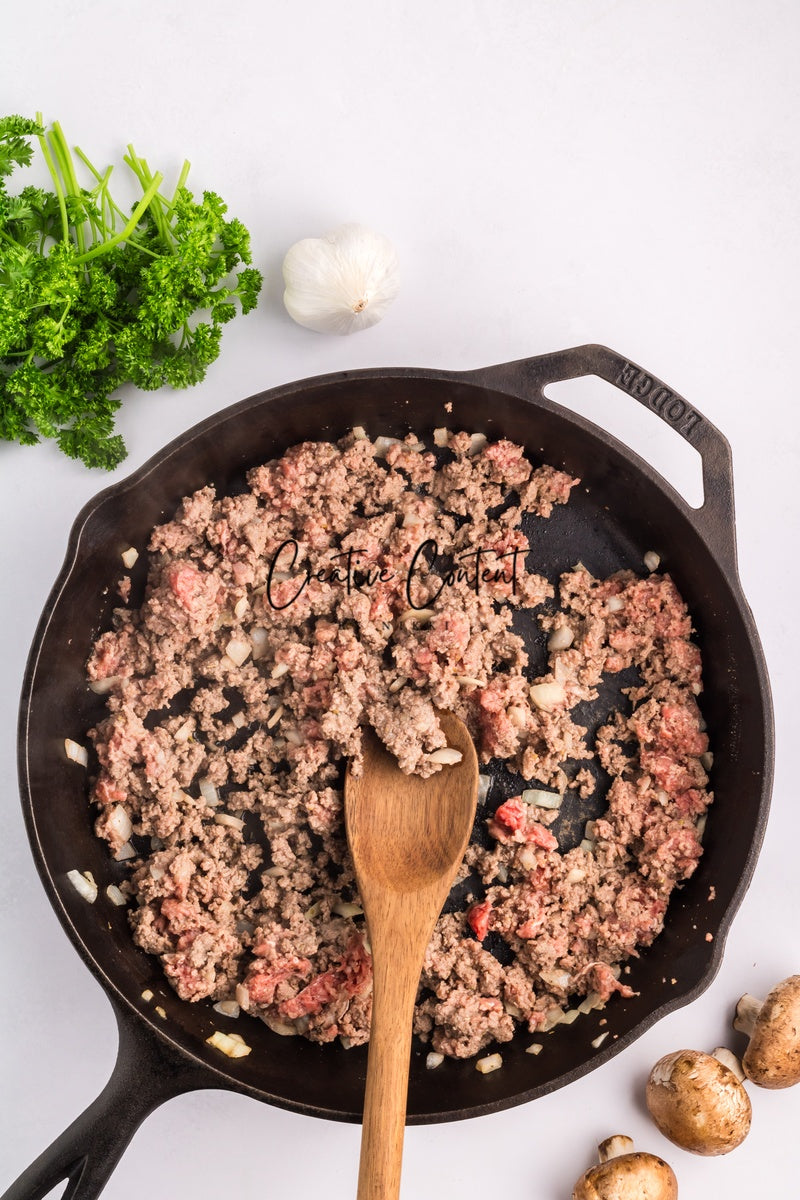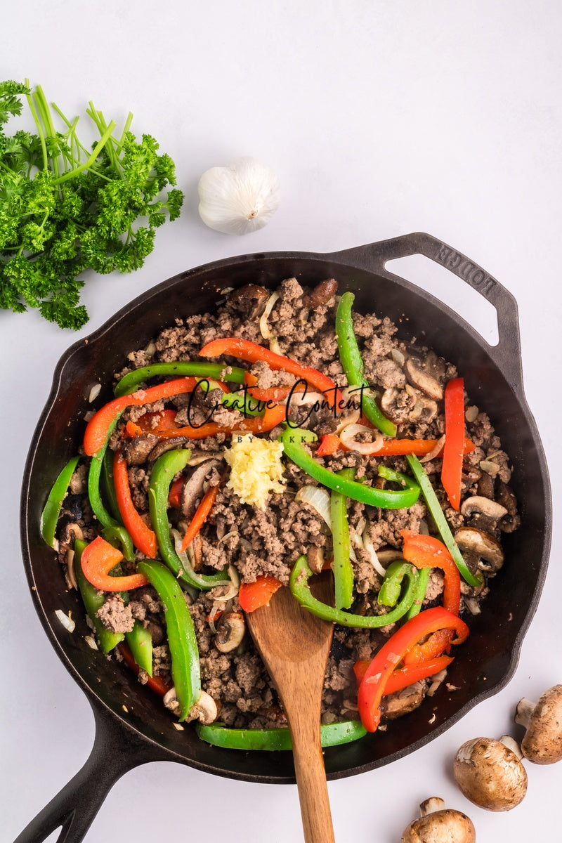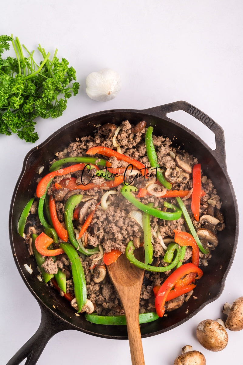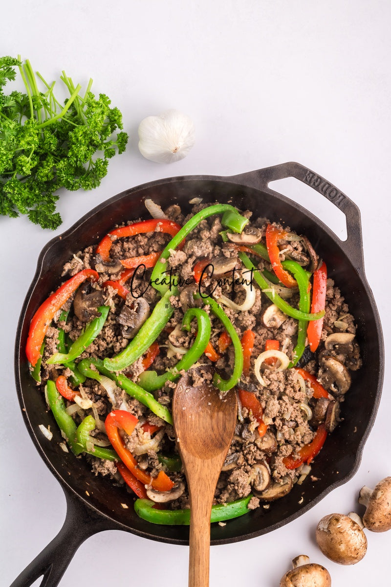 - Ingredients needed; pasta, ground beef, yellow onion, garlic cloves, Worcestershire sauce, onion powder, garlic powder, dried oregano, coarse kosher salt, black pepper, green bell pepper, red bell pepper, mushrooms, cream cheese, beef broth, provolone cheese, and parsley.