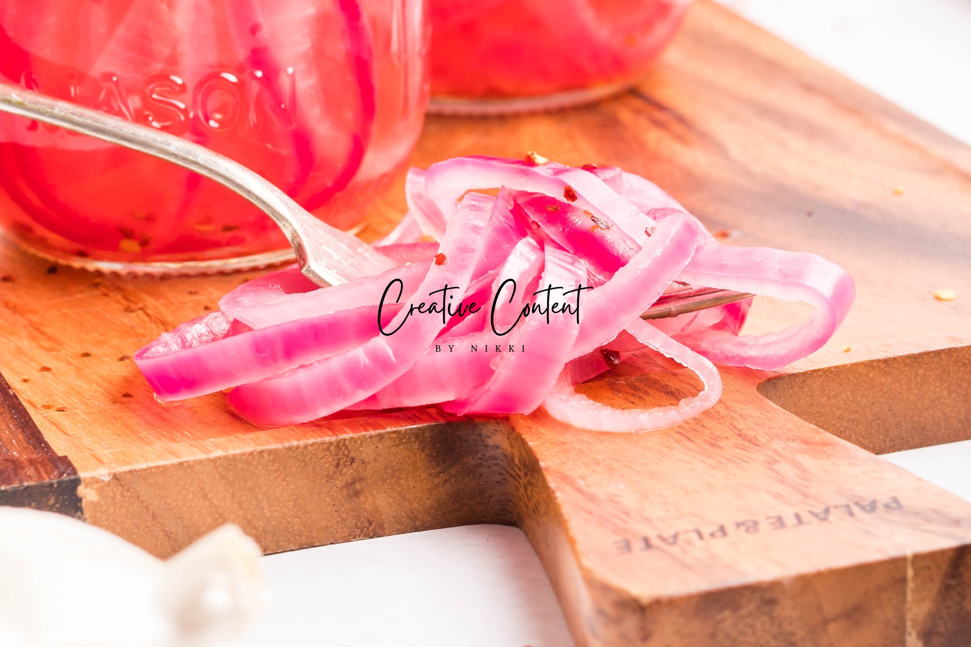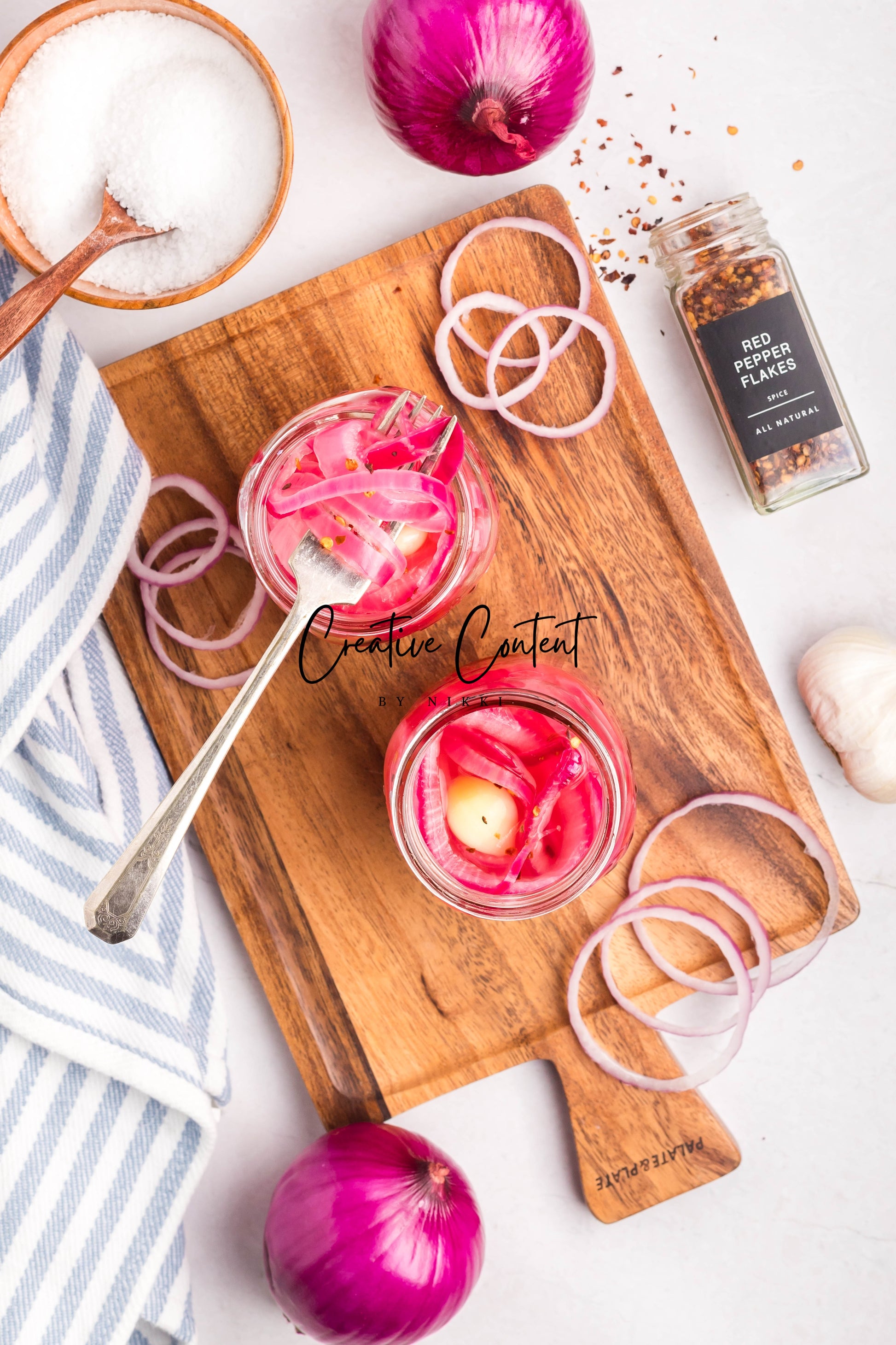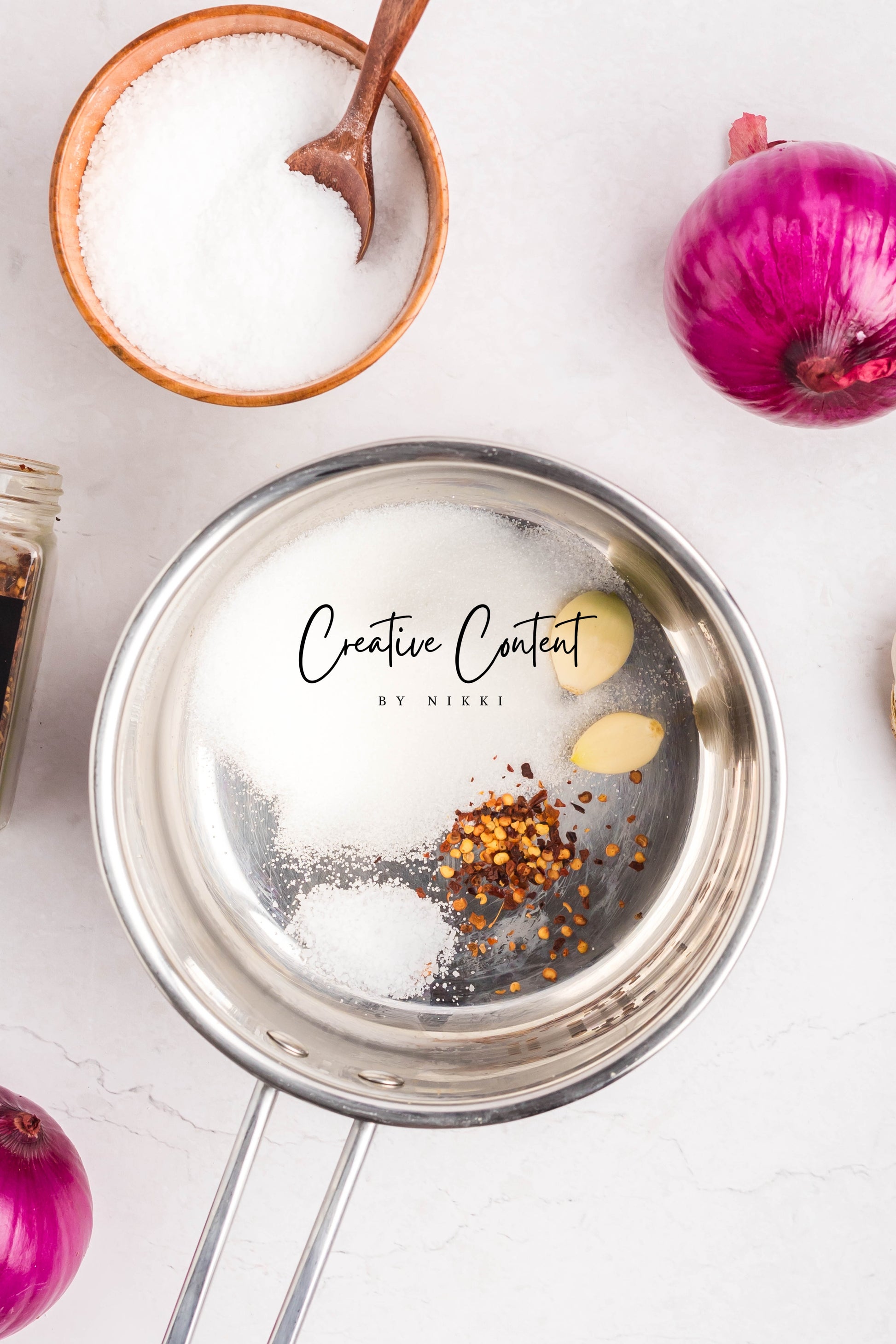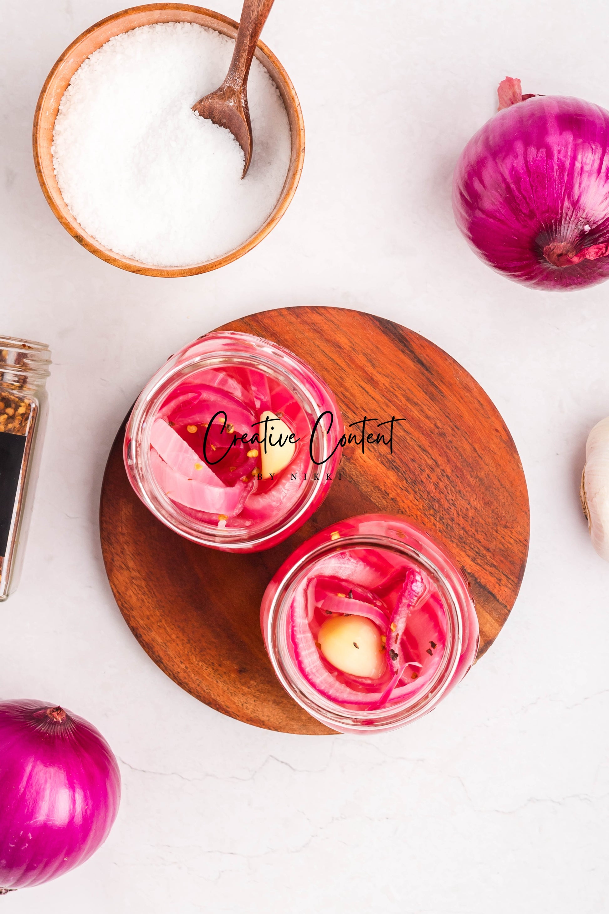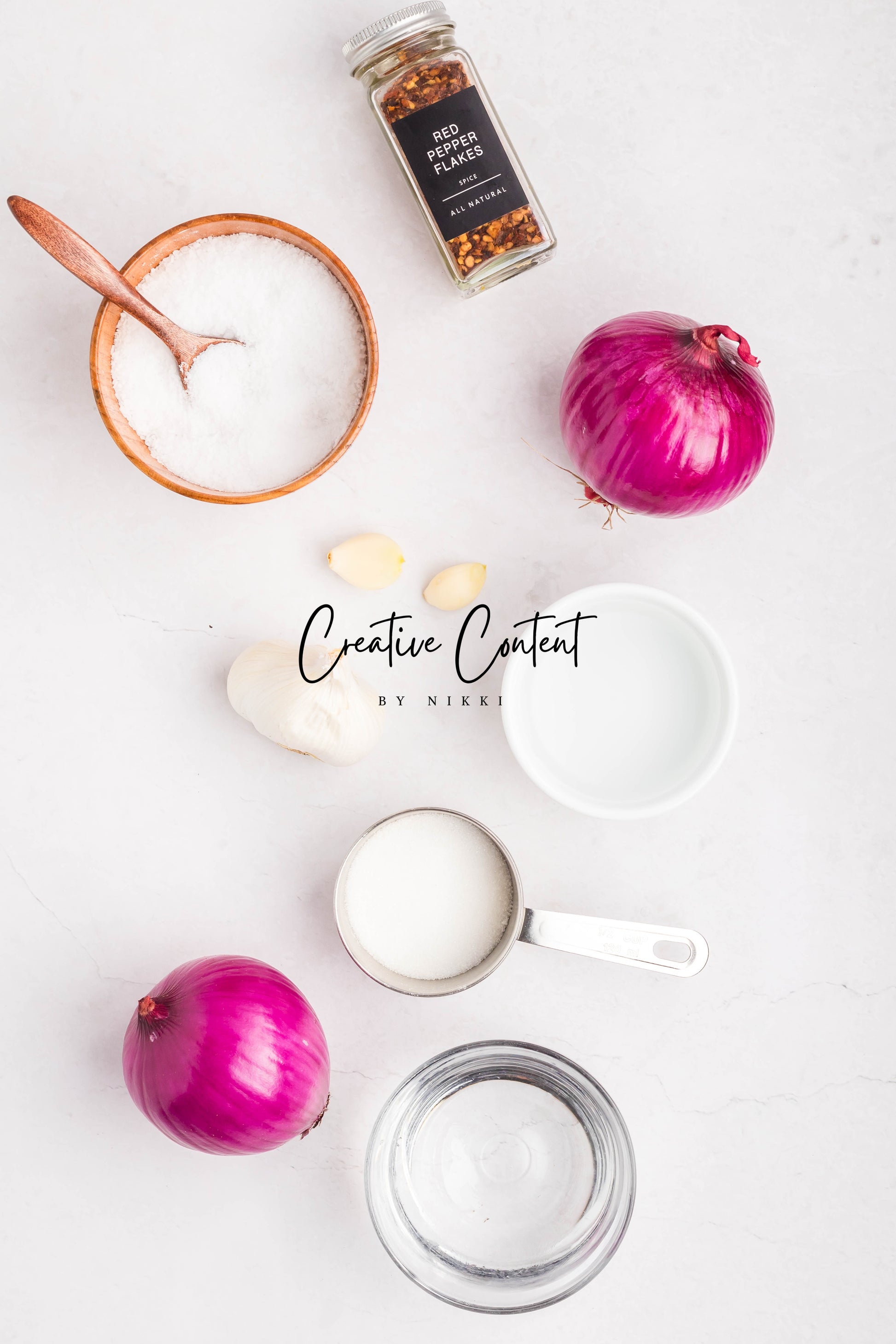 - Ingredients: Red onion, white vinegar, water, white cane sugar, garlic cloves, coarse kosher salt, red pepper flakes