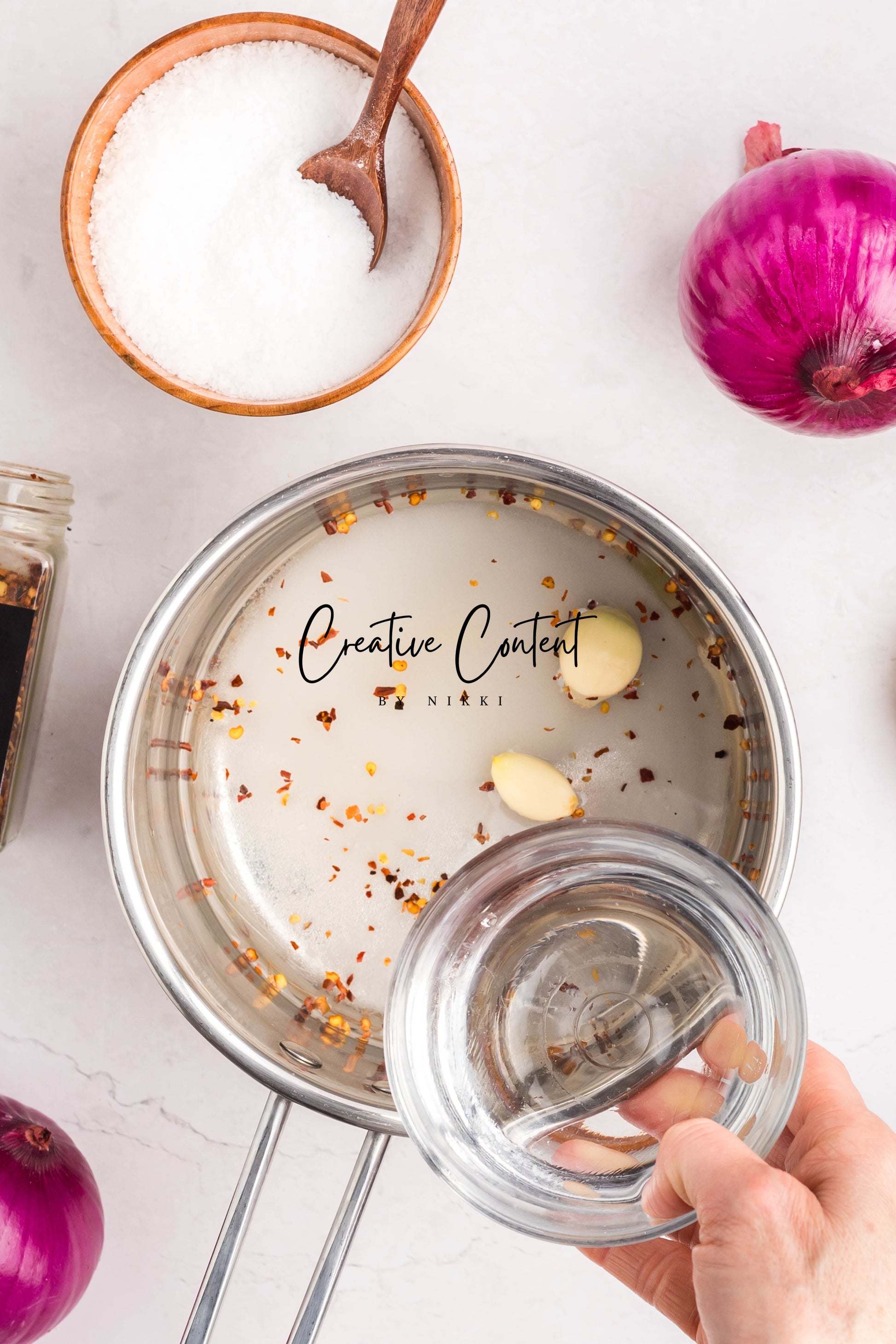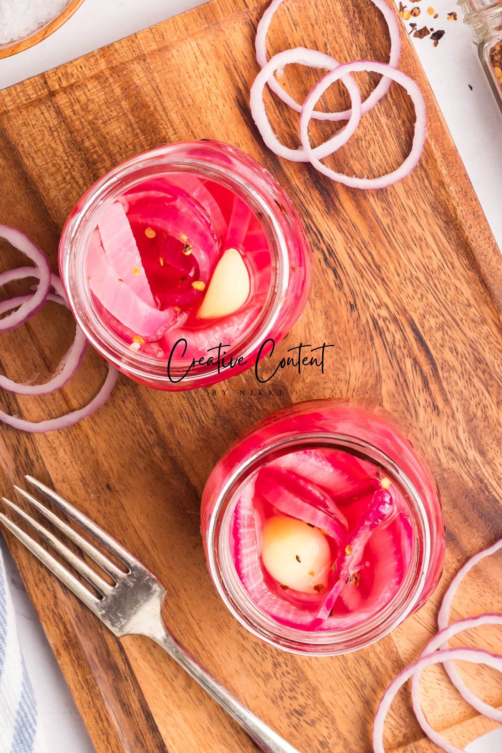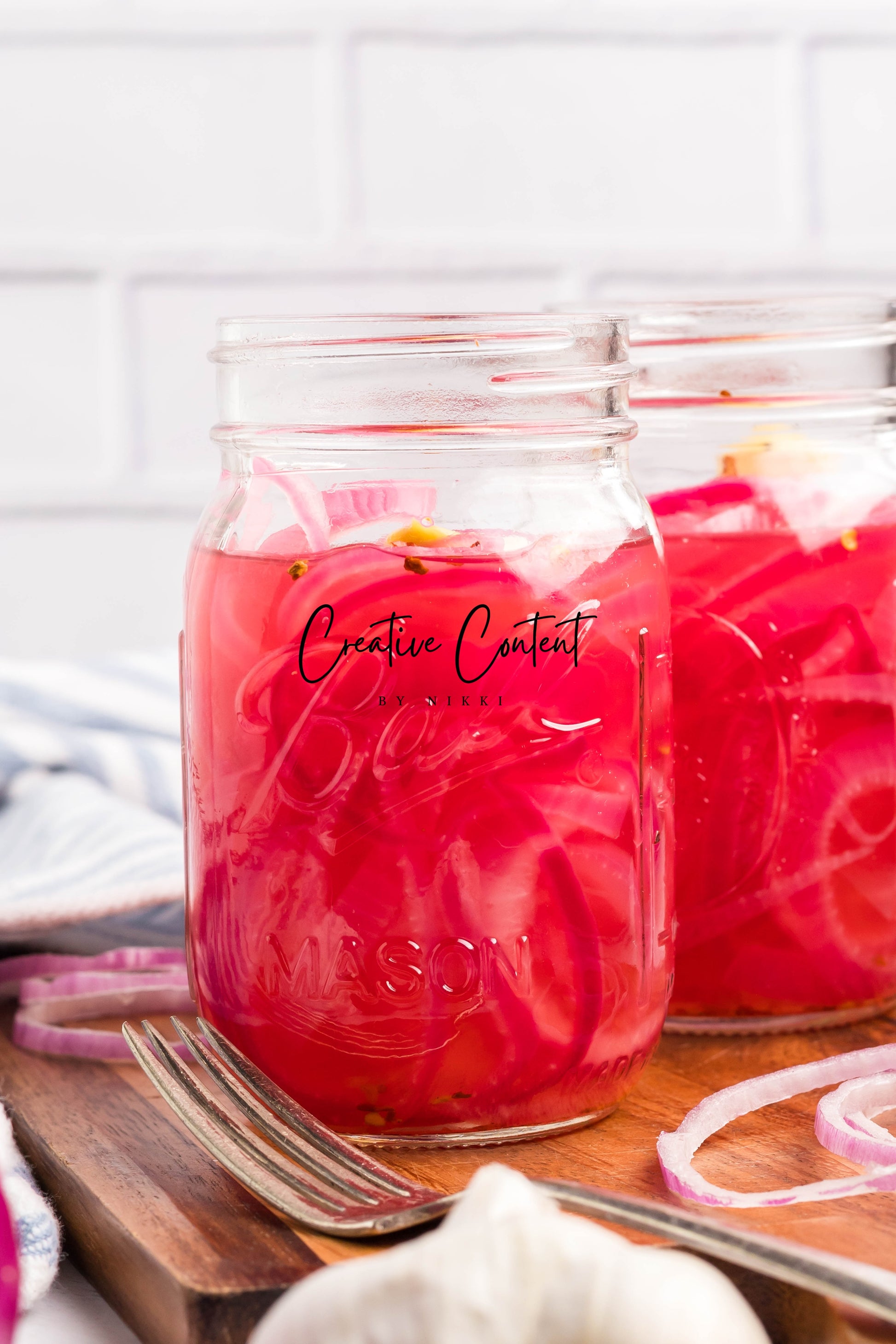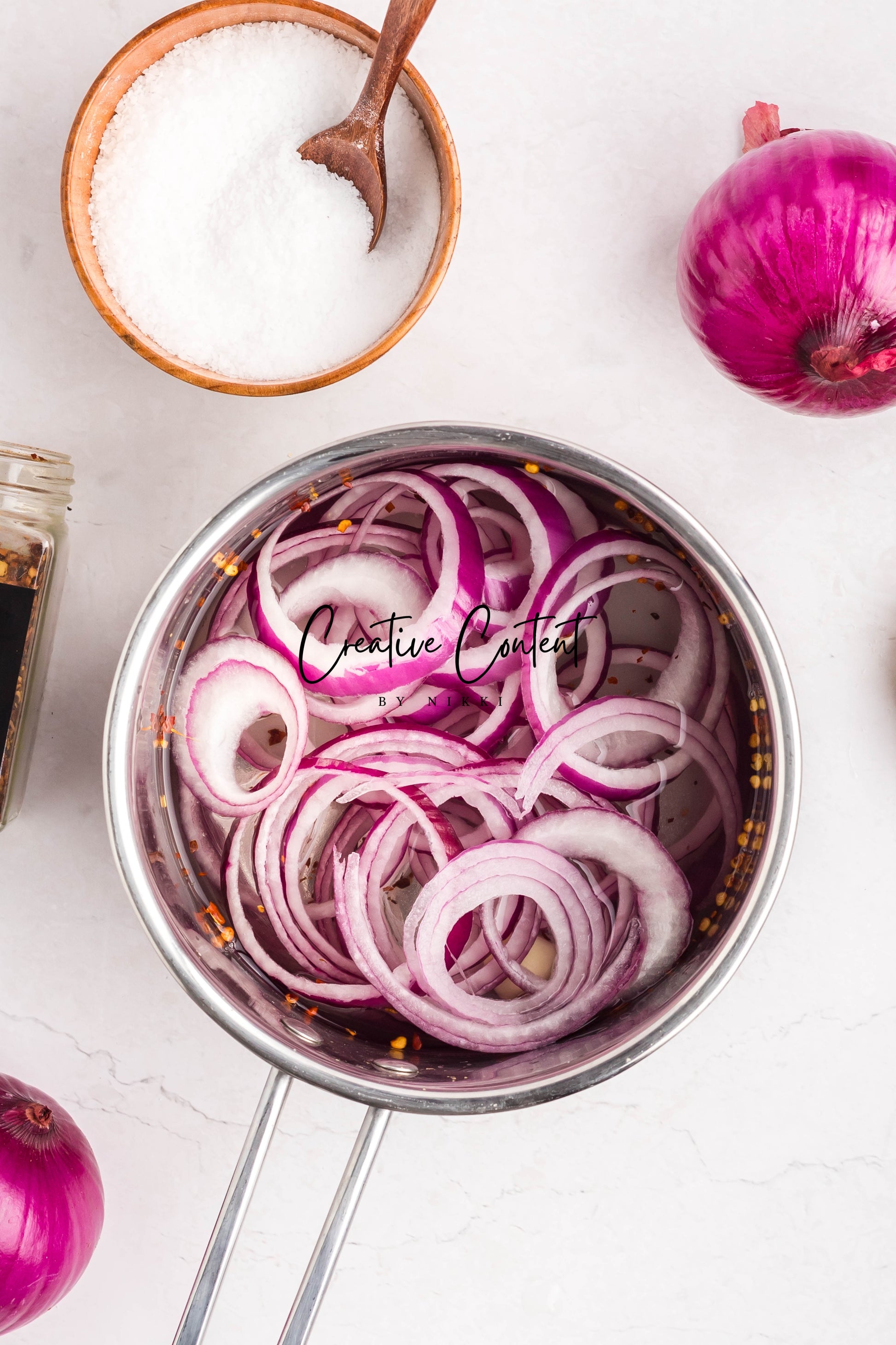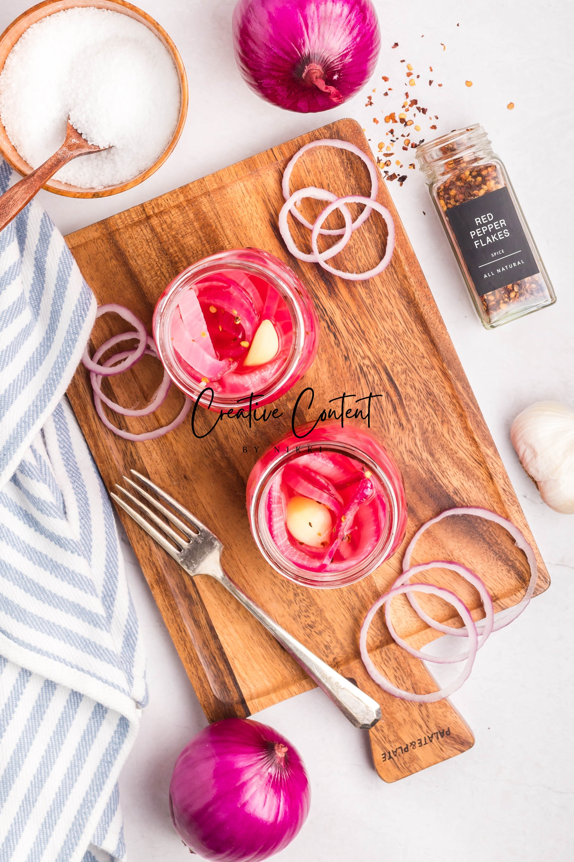 - Ingredients: Red onion, white vinegar, water, white cane sugar, garlic cloves, coarse kosher salt, red pepper flakes