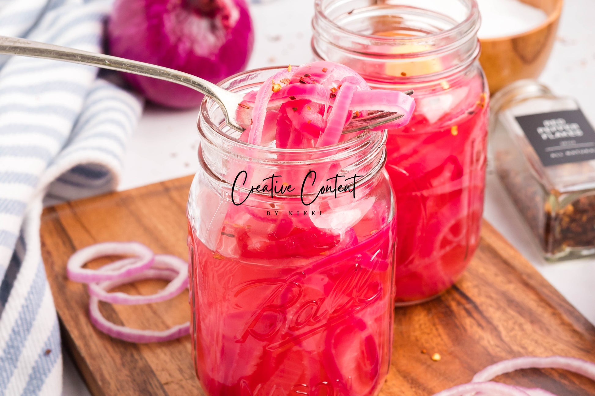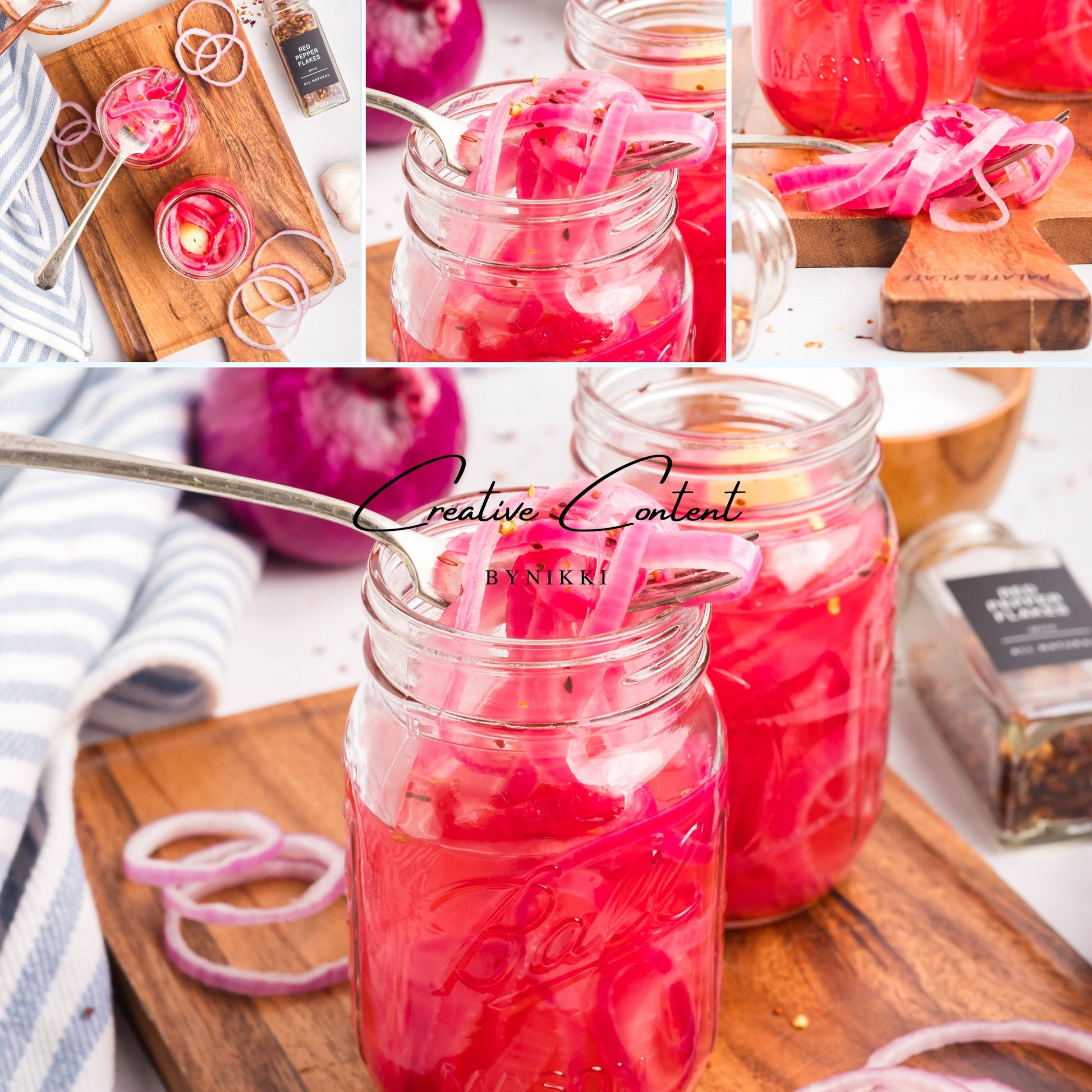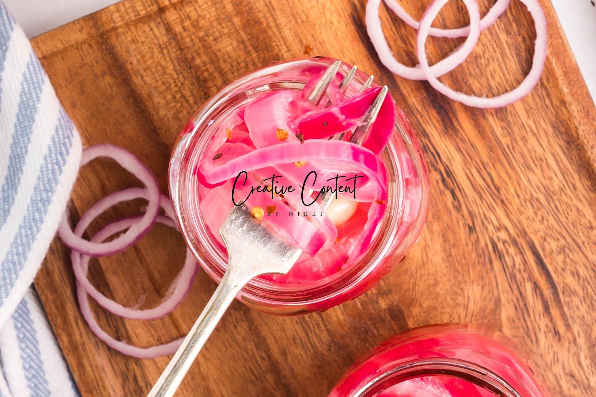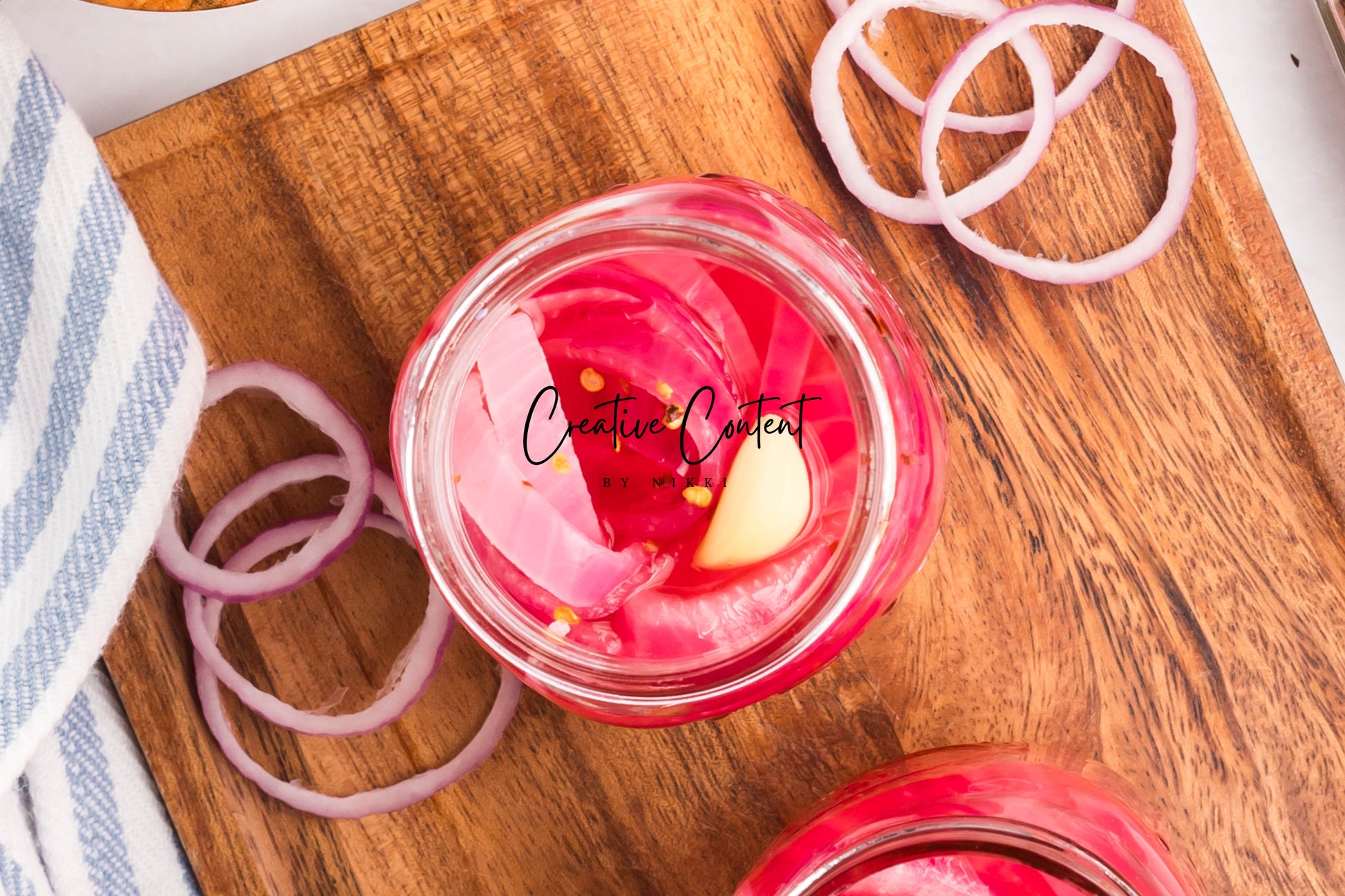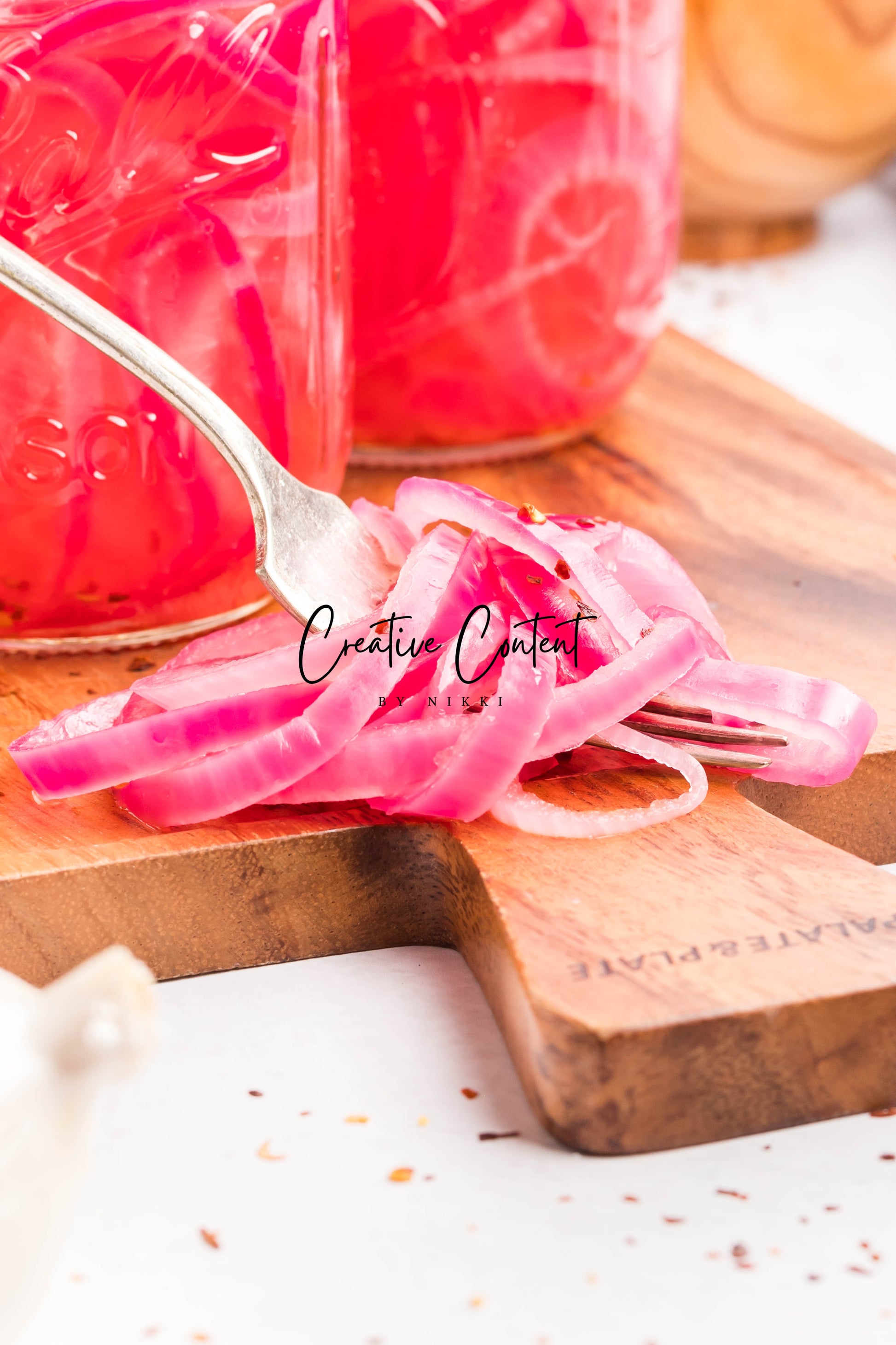 - Ingredients: Red onion, white vinegar, water, white cane sugar, garlic cloves, coarse kosher salt, red pepper flakes