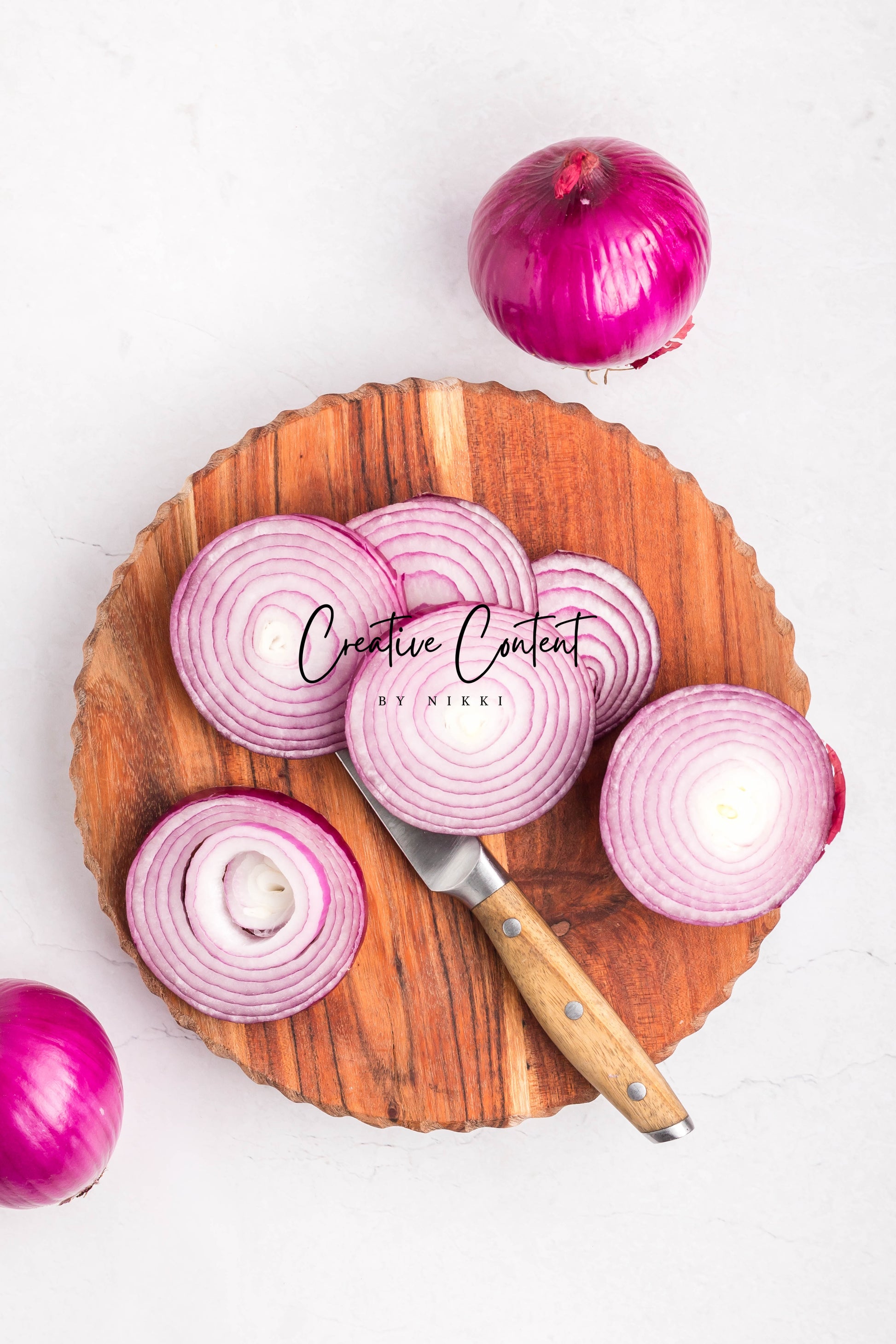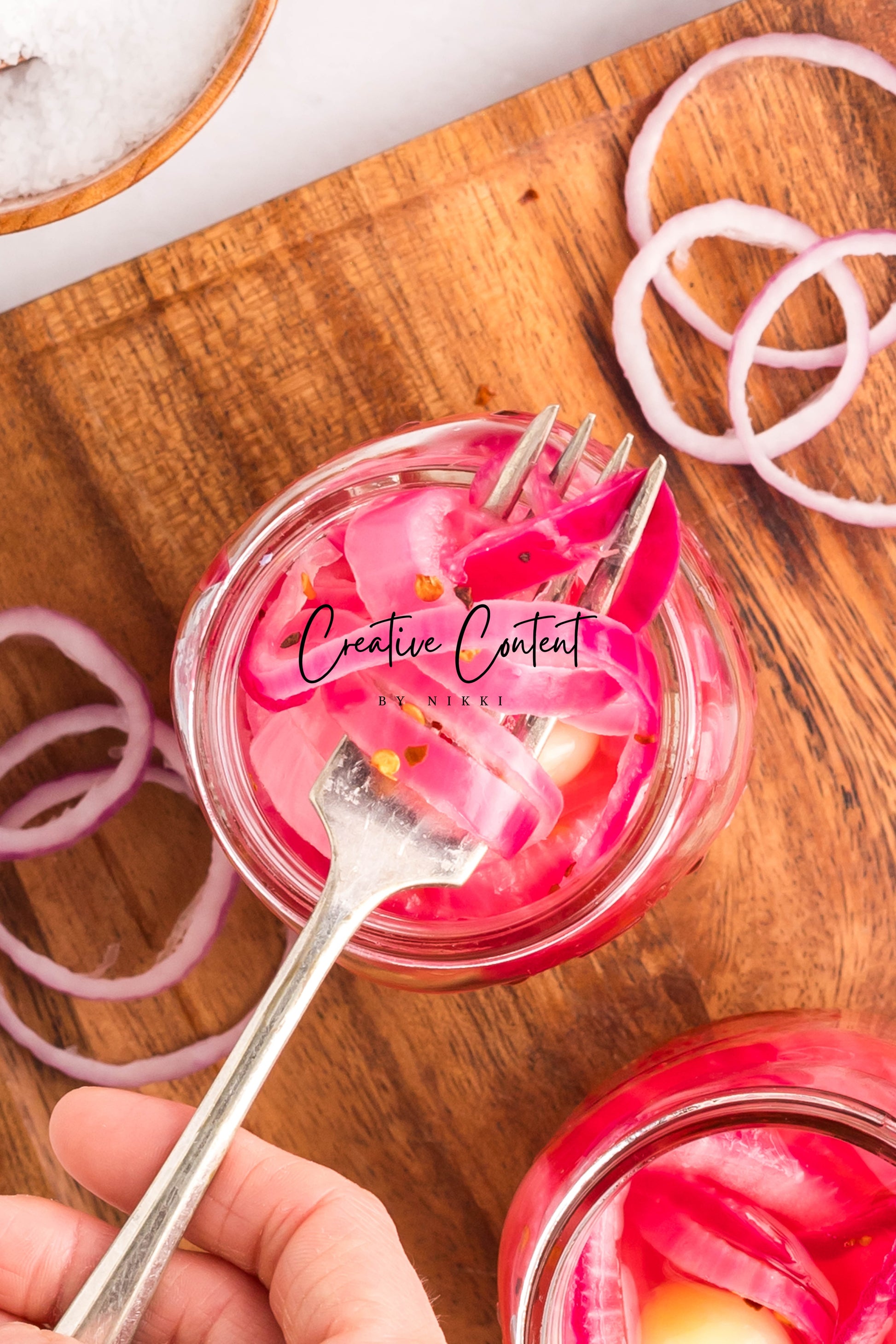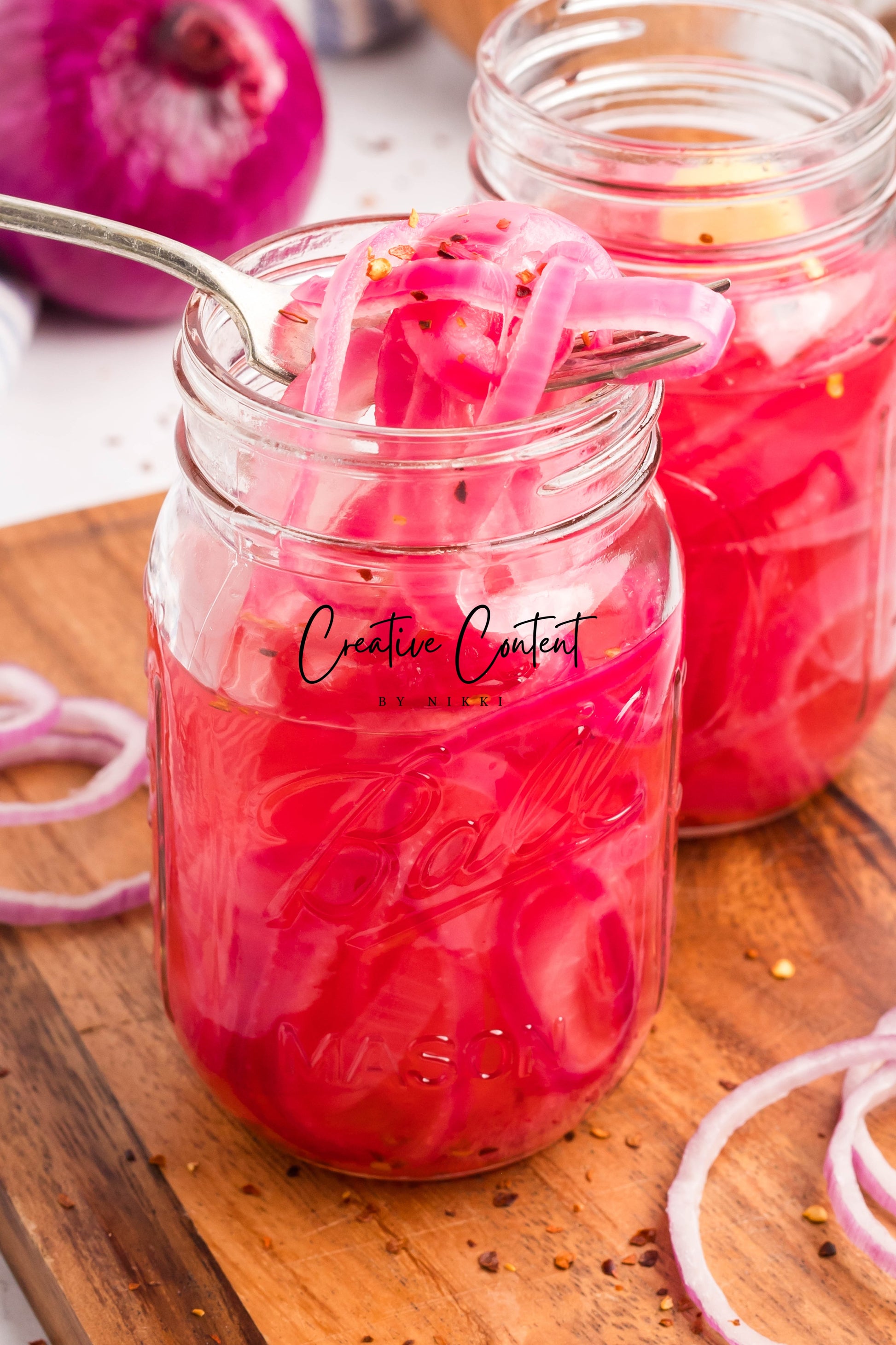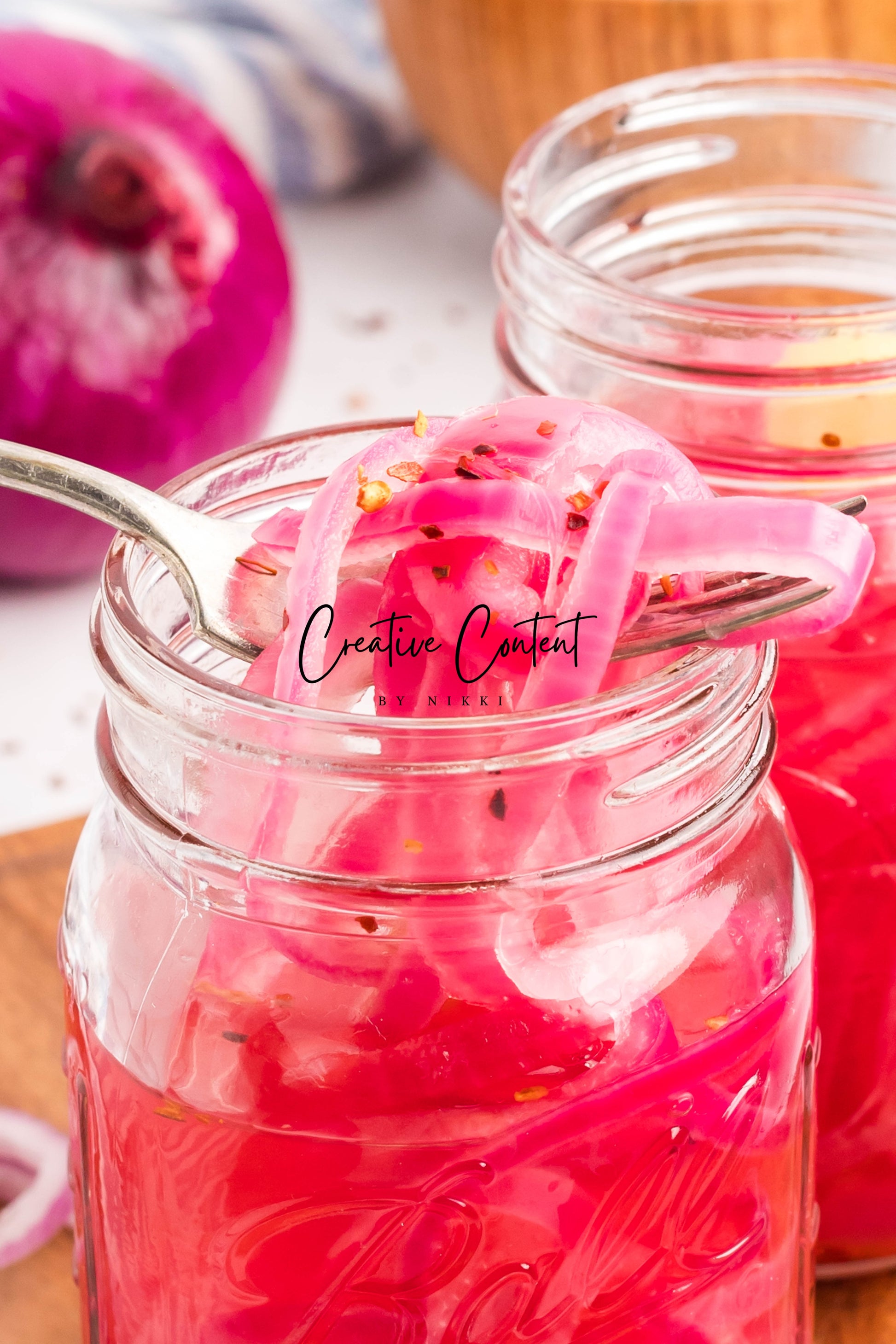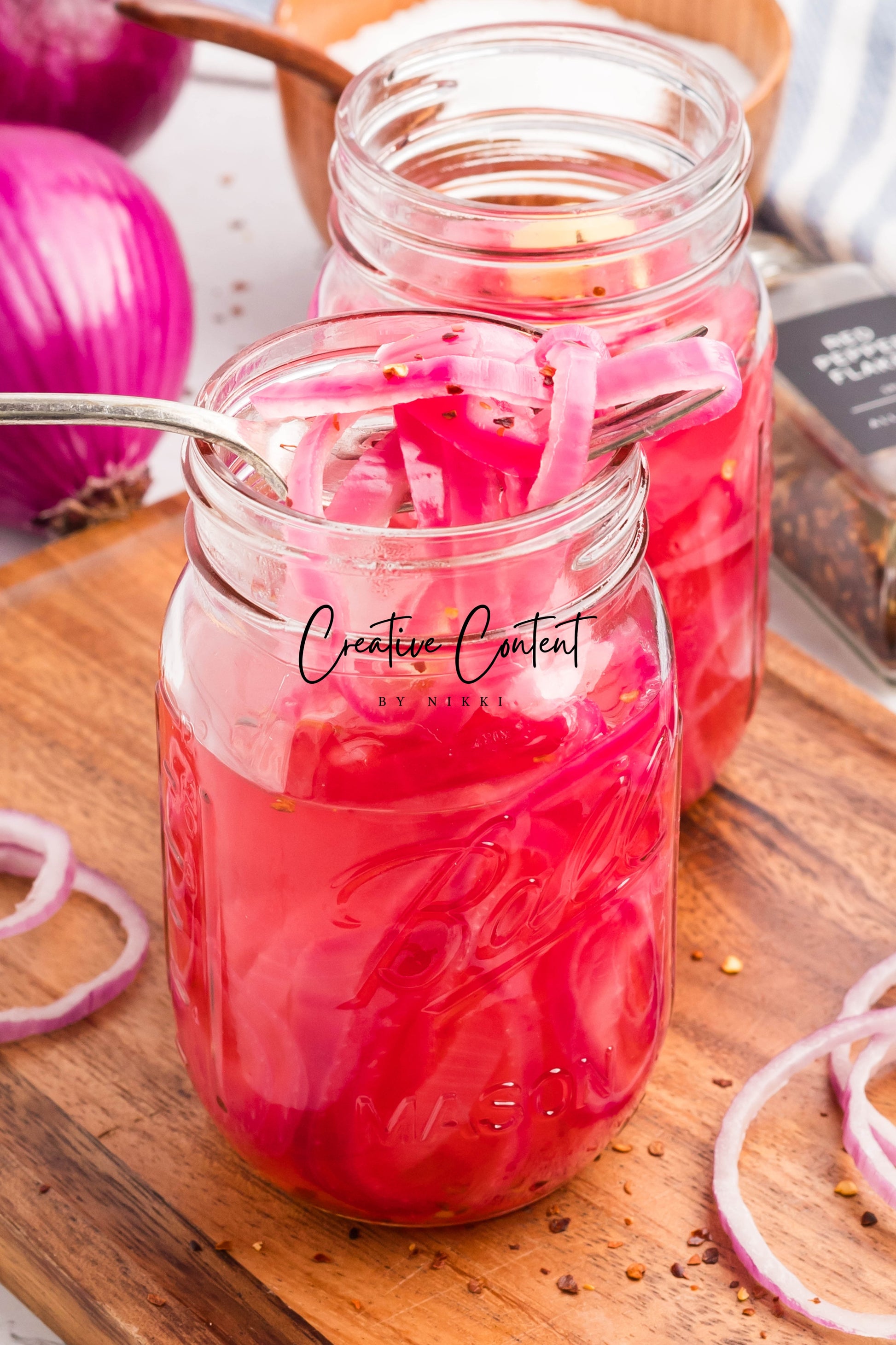 - Ingredients: Red onion, white vinegar, water, white cane sugar, garlic cloves, coarse kosher salt, red pepper flakes