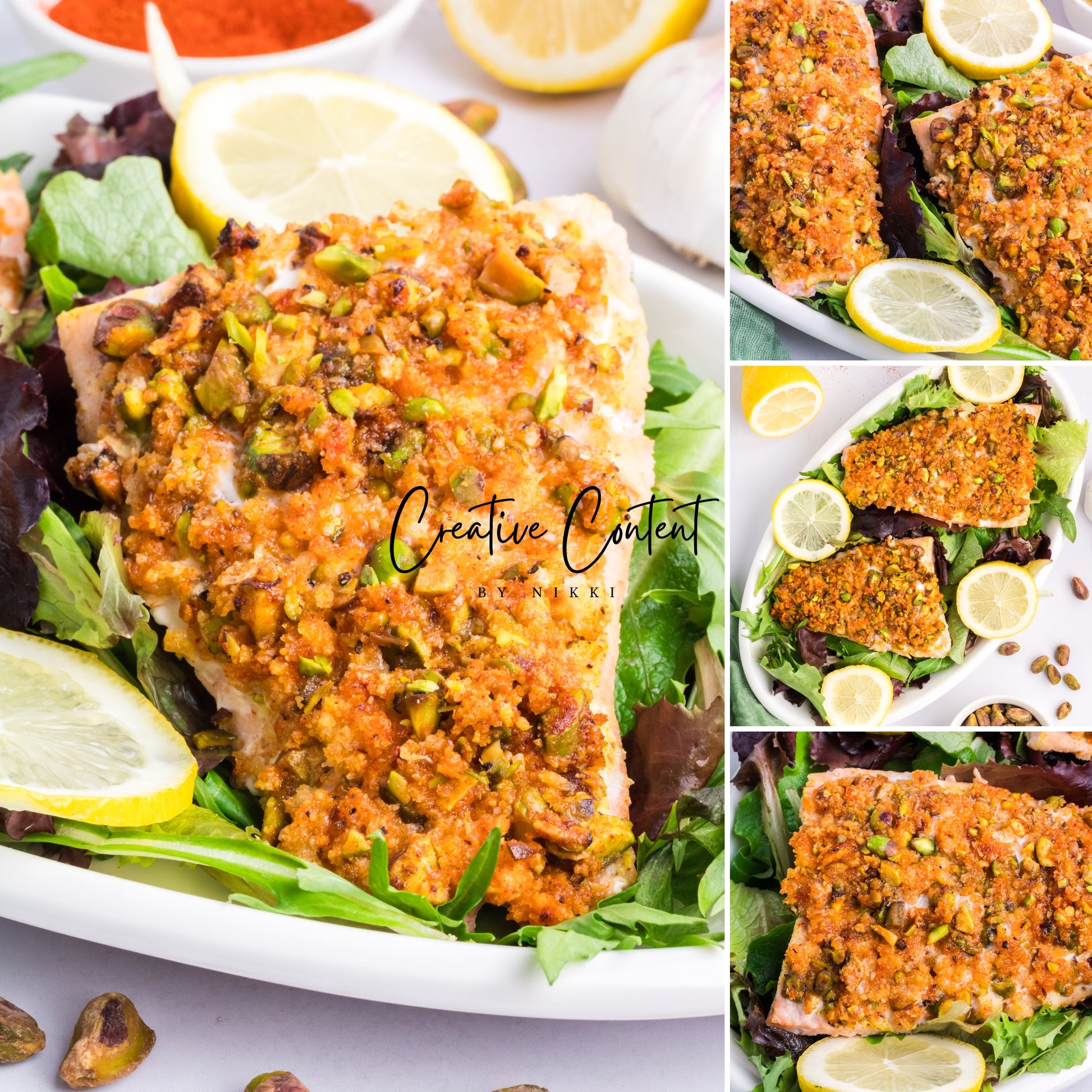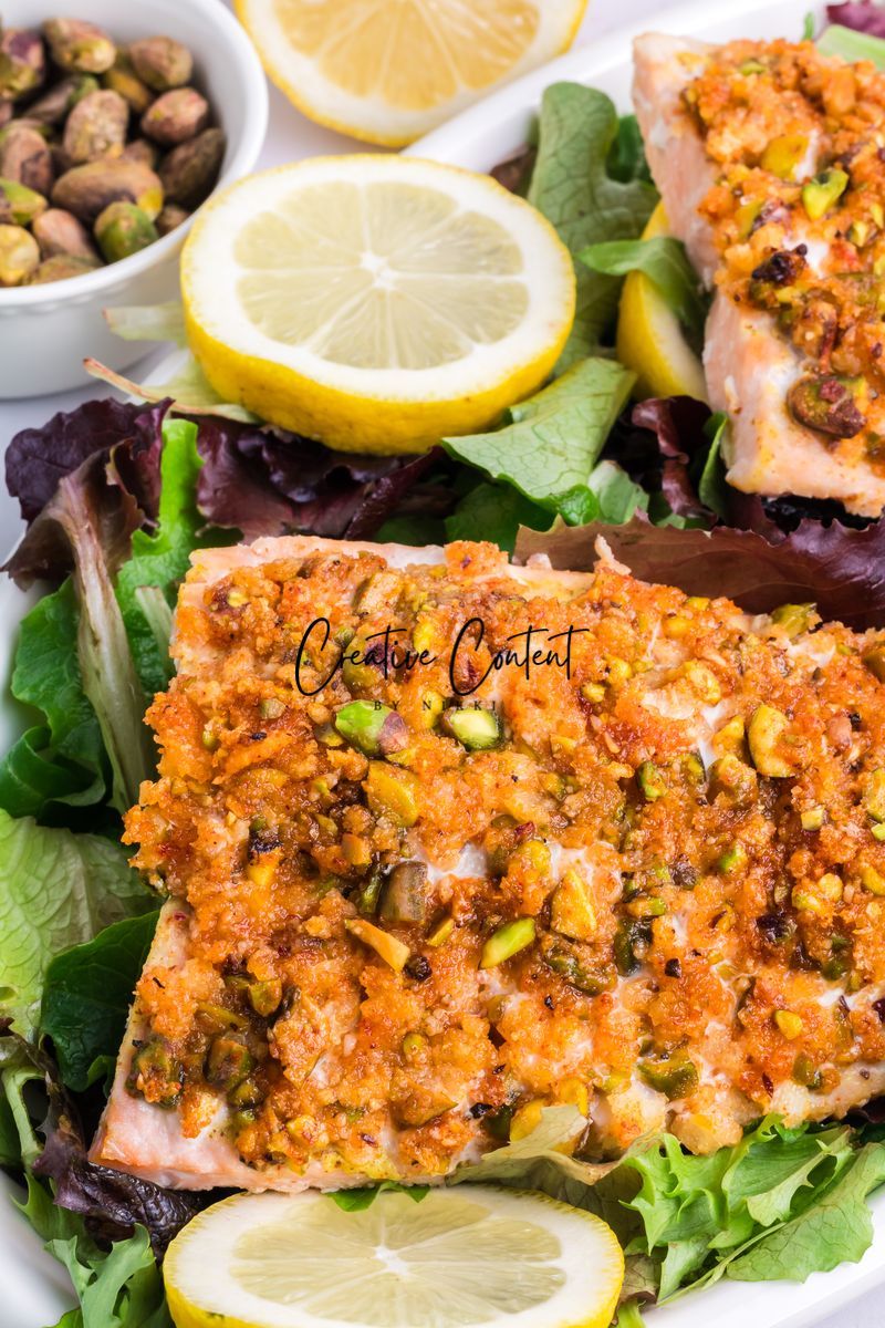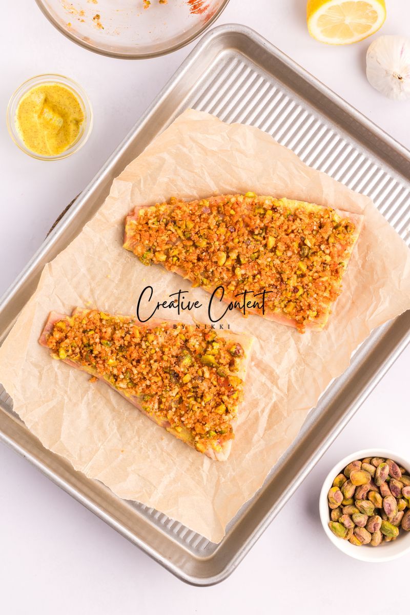 This pistachio-crusted salmon is loaded with crunchy pistachios, parmesan cheese, and garlic. It is truly an amazing entree that goes great with pasta, rice, or salad. This is a great entree to make when having people over, as you can serve it directly out of the oven when they arrive.