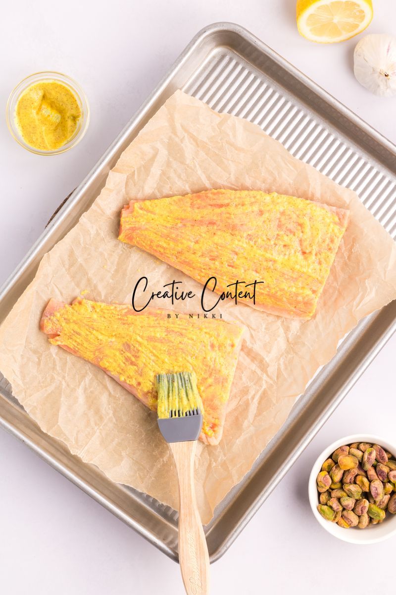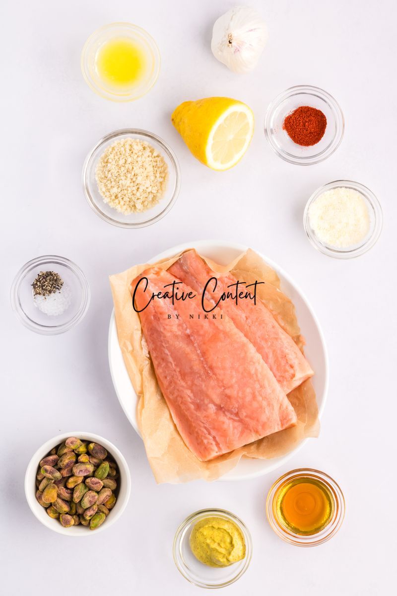 Featured Ingredients; Salmon filets, Dijon mustard, pistachios, panko breadcrumbs, parmesan cheese, unsalted butter, lemon juice, honey, paprika, coarse kosher salt, black pepper, and garlic clove.