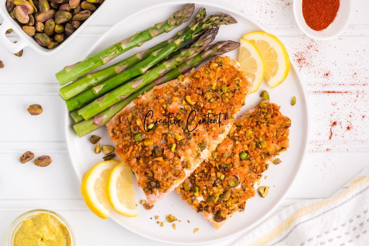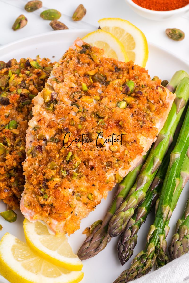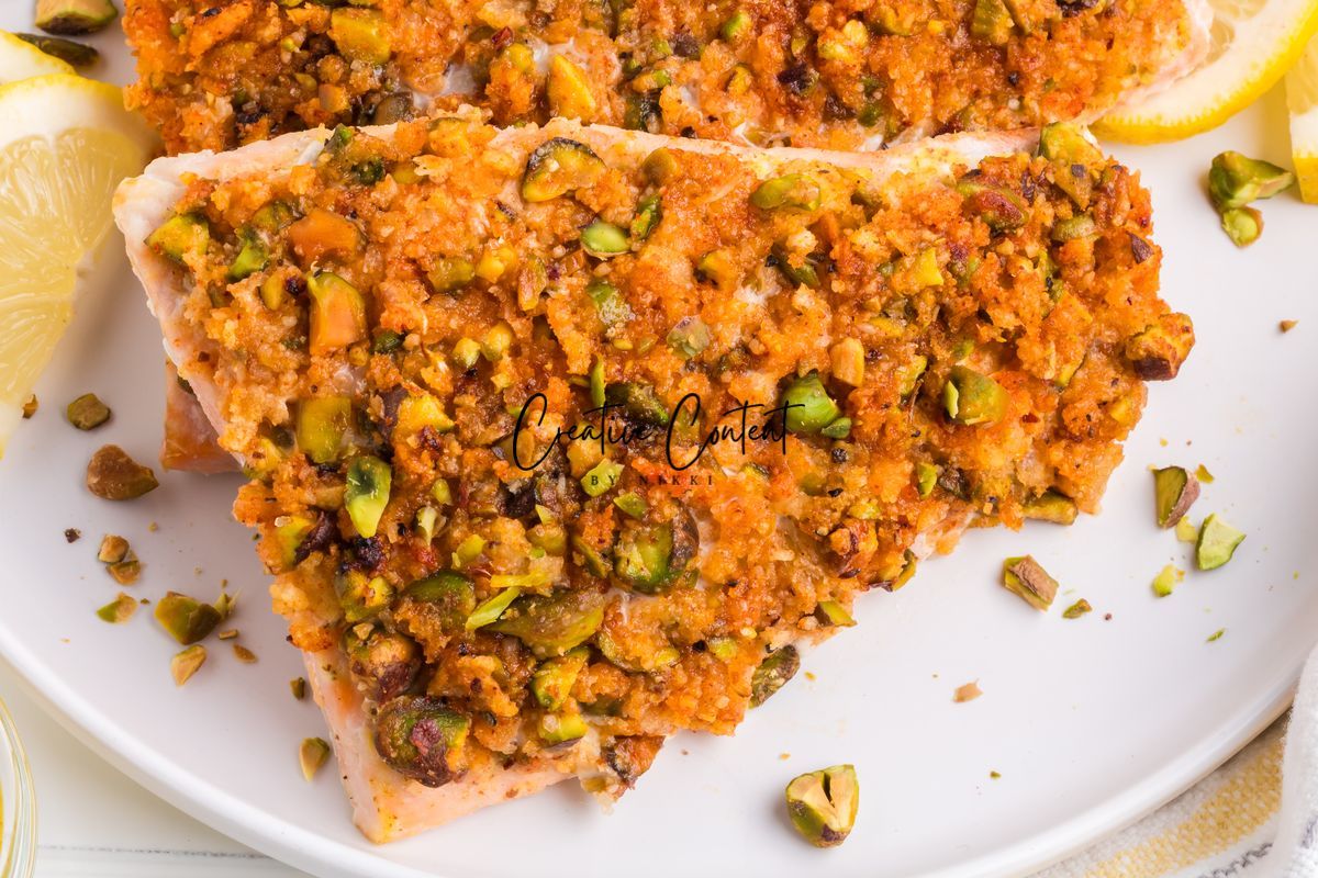 This pistachio-crusted salmon is loaded with crunchy pistachios, parmesan cheese, and garlic. It is truly an amazing entree that goes great with pasta, rice, or salad. This is a great entree to make when having people over, as you can serve it directly out of the oven when they arrive.
