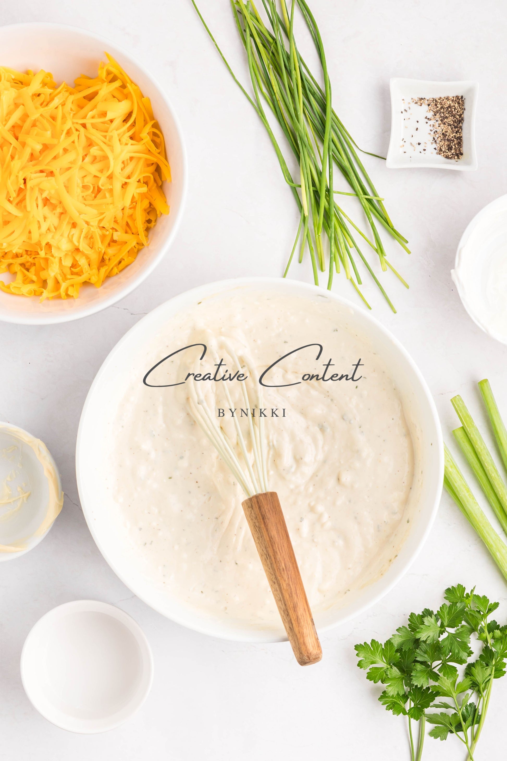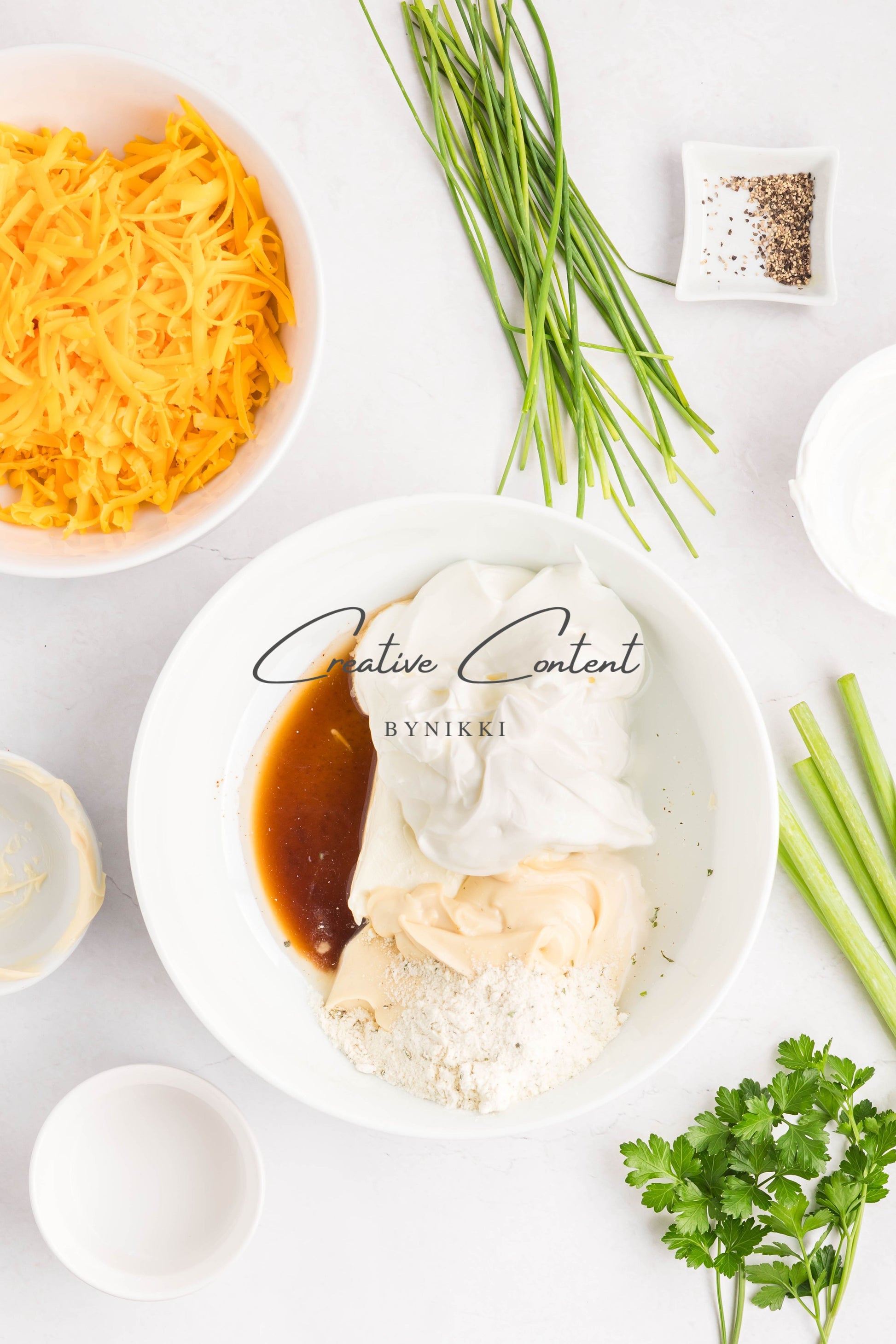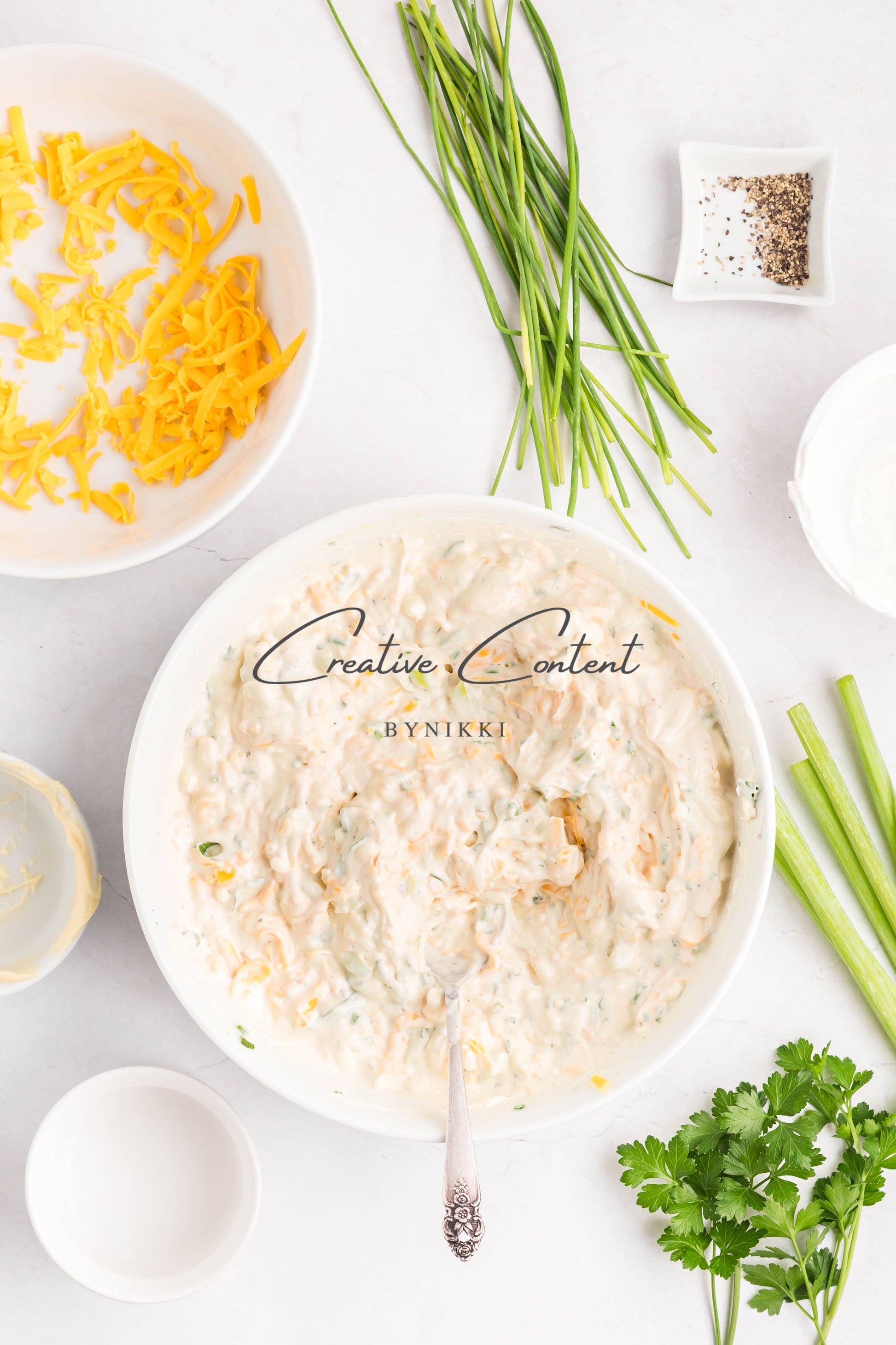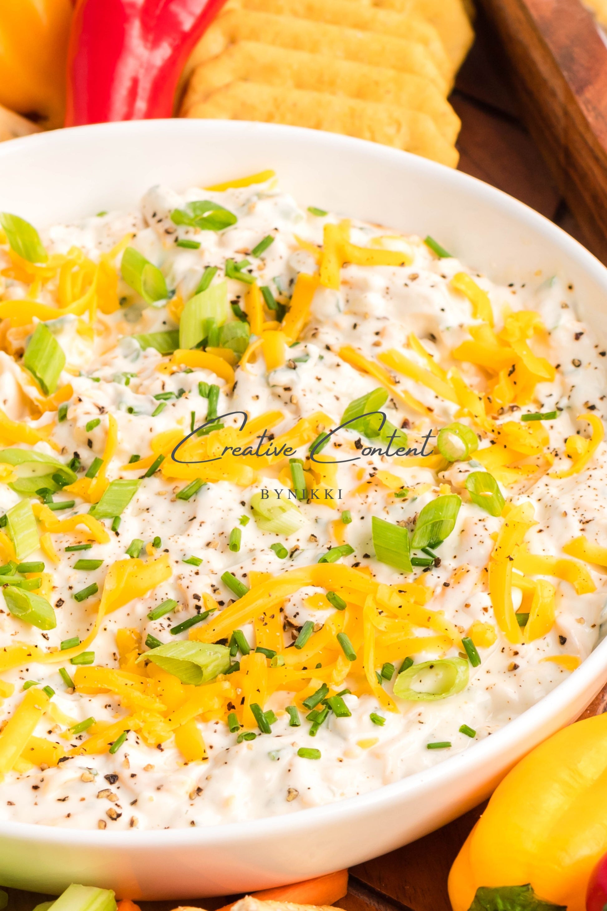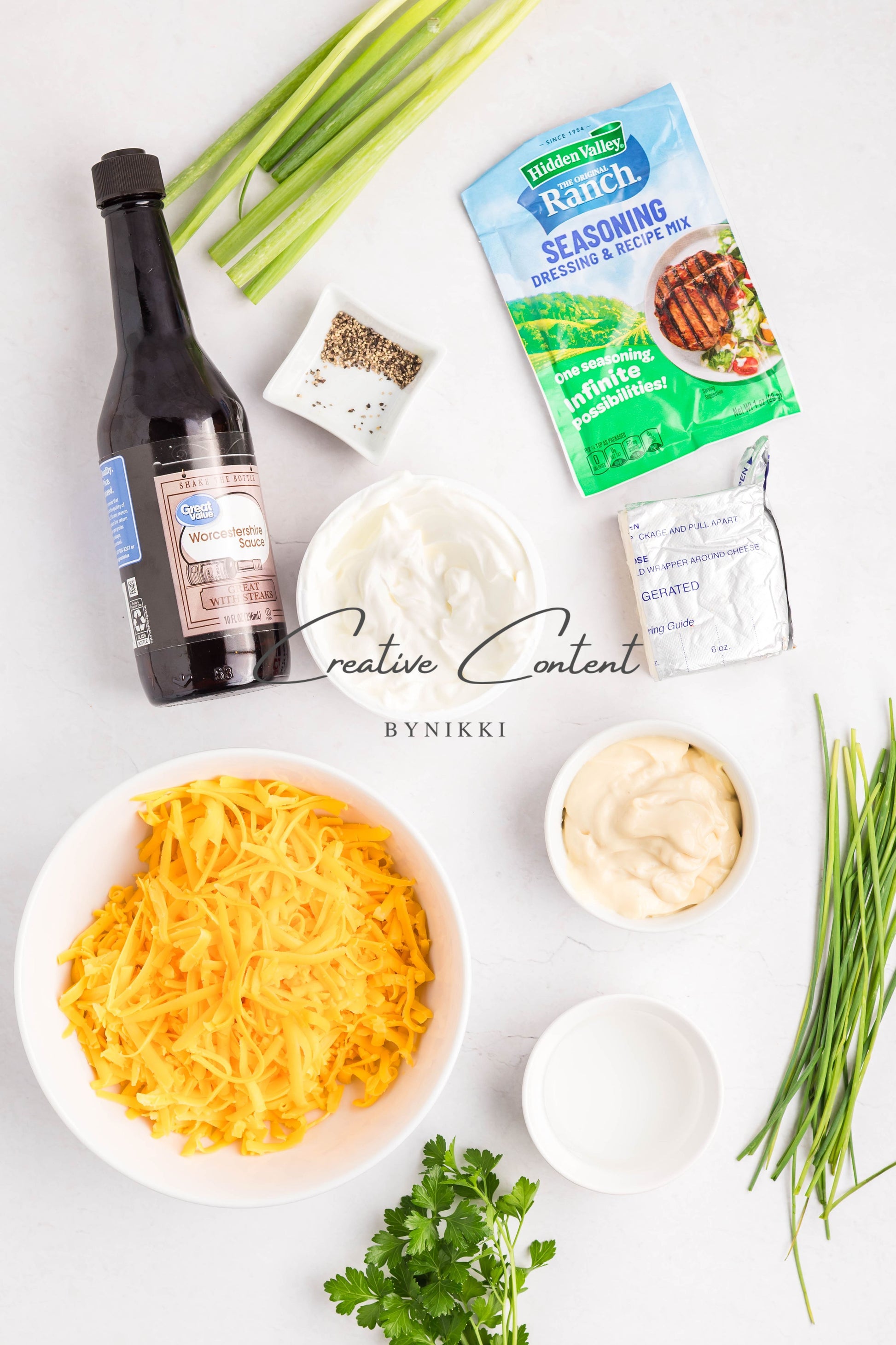 - Ingredients: sour cream, mayonnaise, cream cheese, ranch seasoning mix, Worcestershire sauce, Cheddar cheese, scallions, chives, parsley, tap water, black pepper