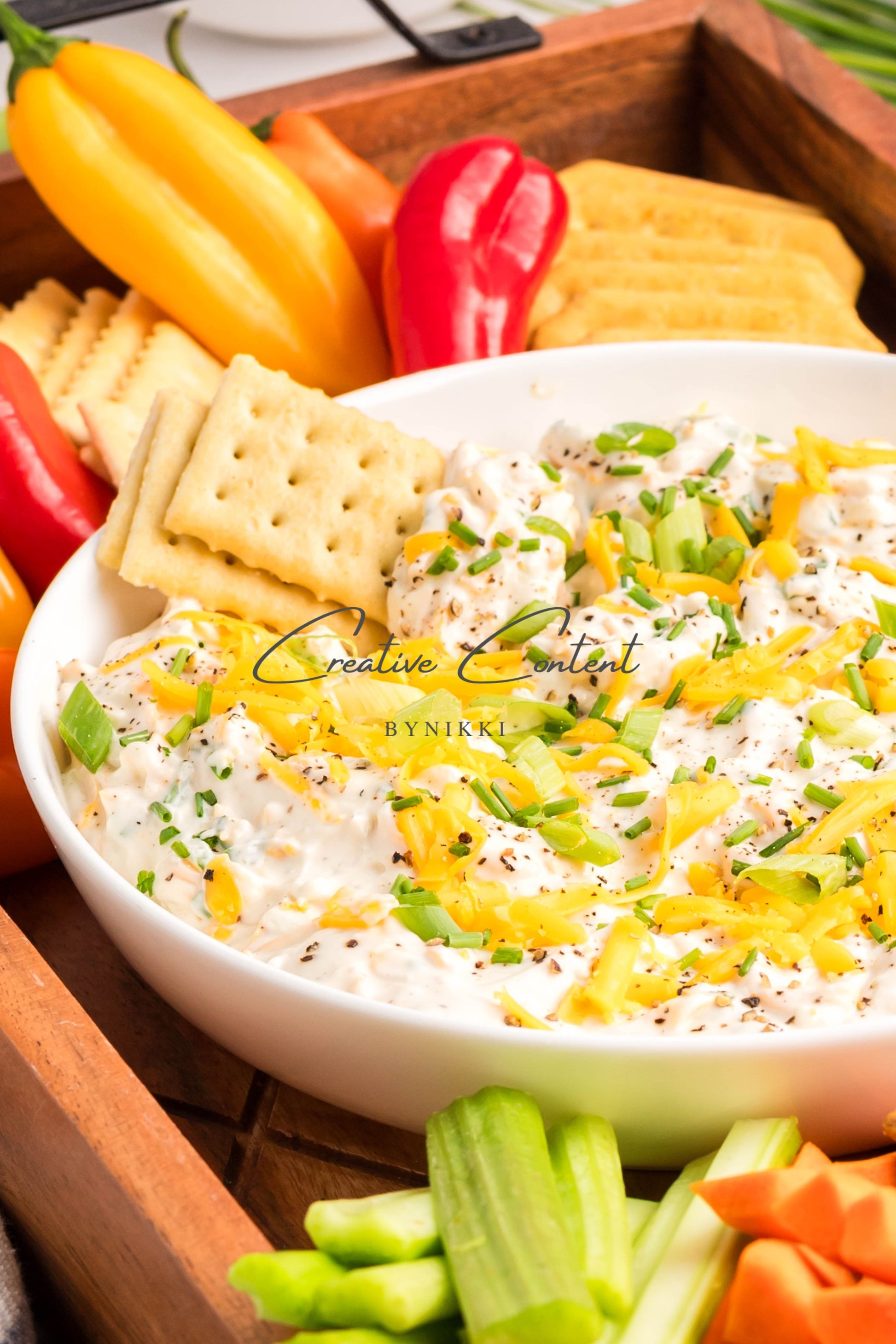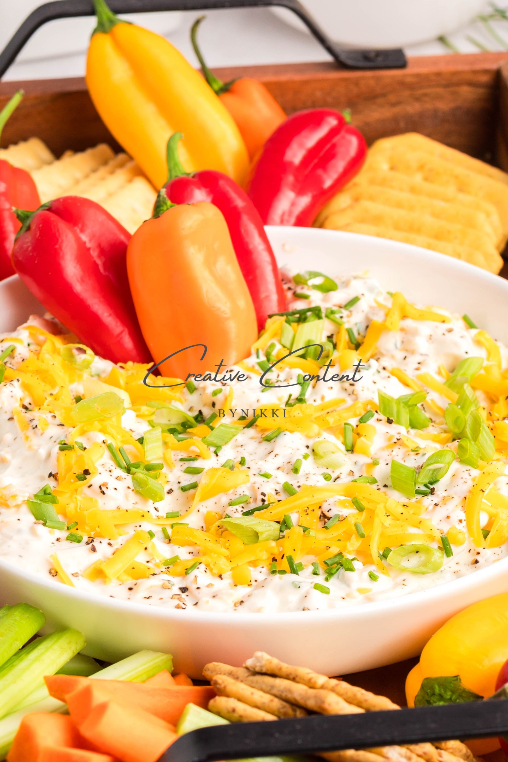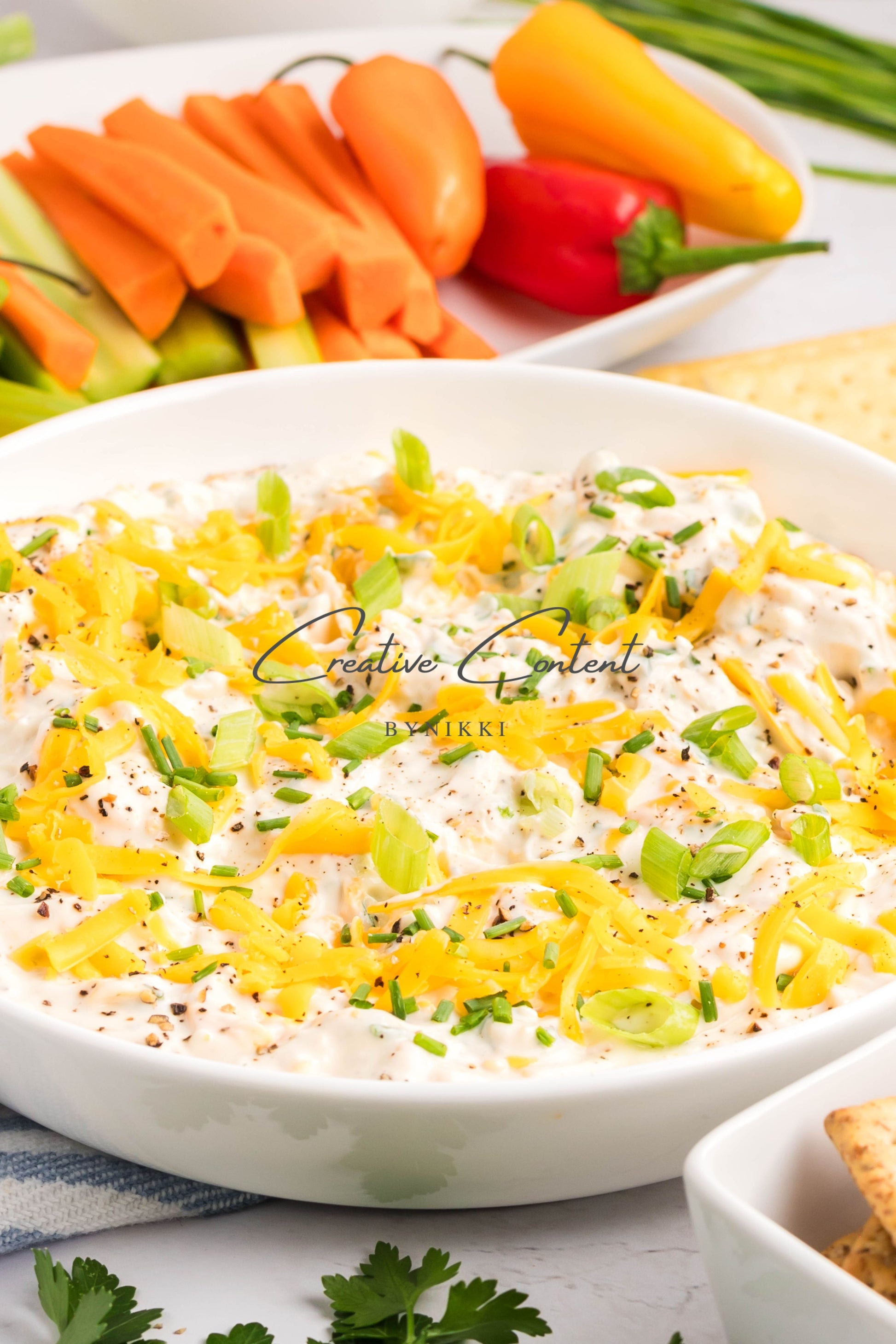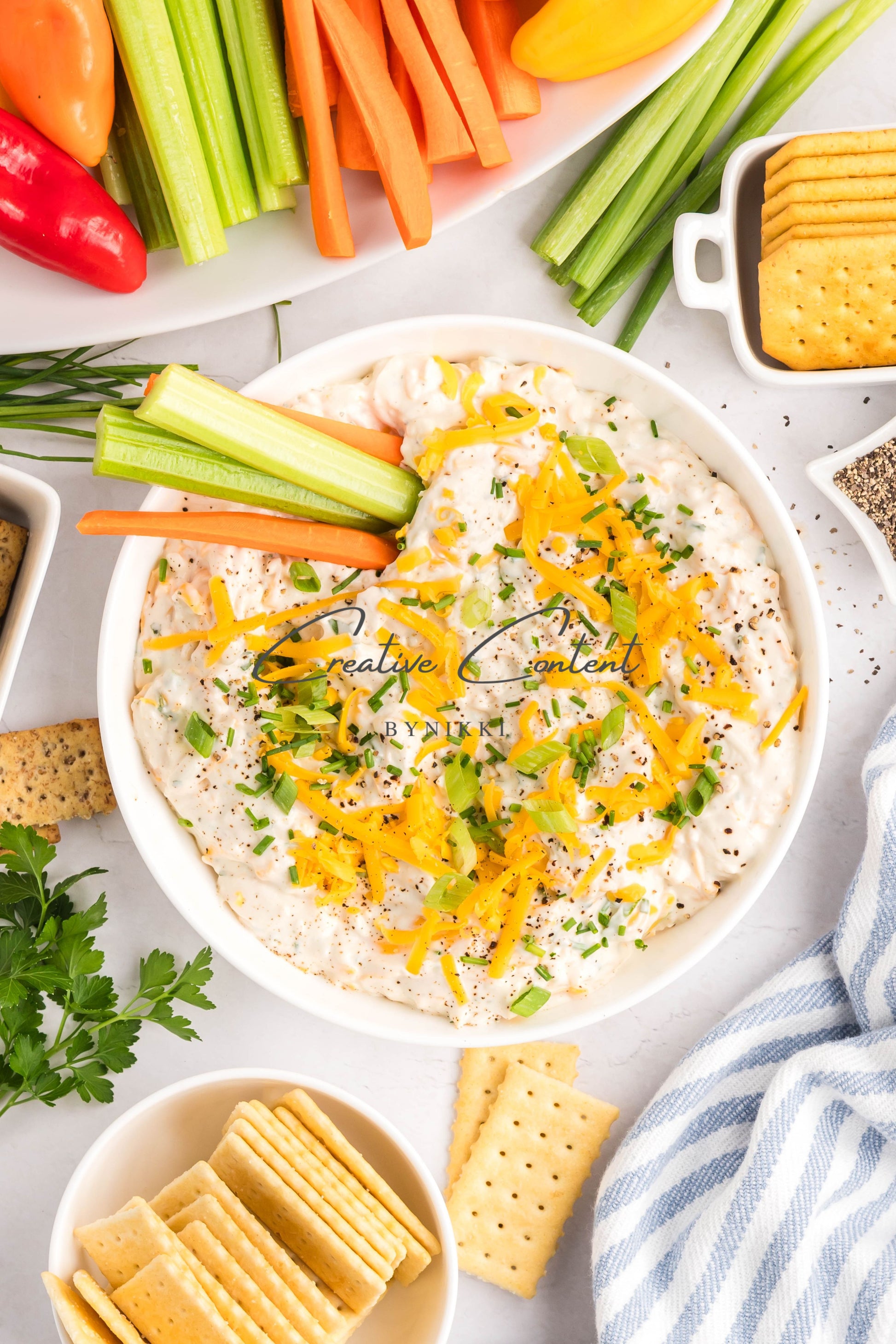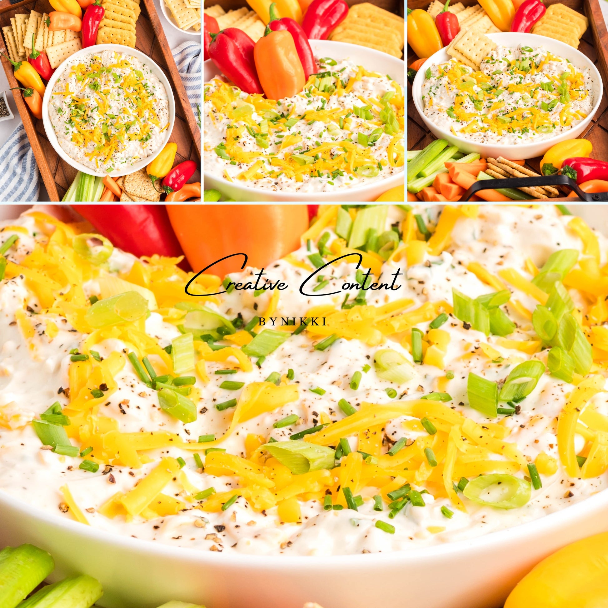- Ingredients: sour cream, mayonnaise, cream cheese, ranch seasoning mix, Worcestershire sauce, Cheddar cheese, scallions, chives, parsley, tap water, black pepper