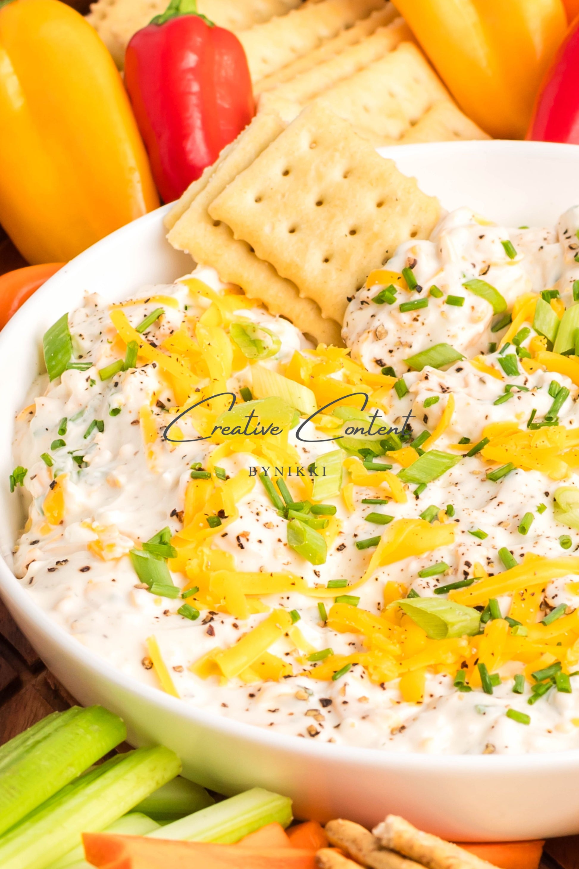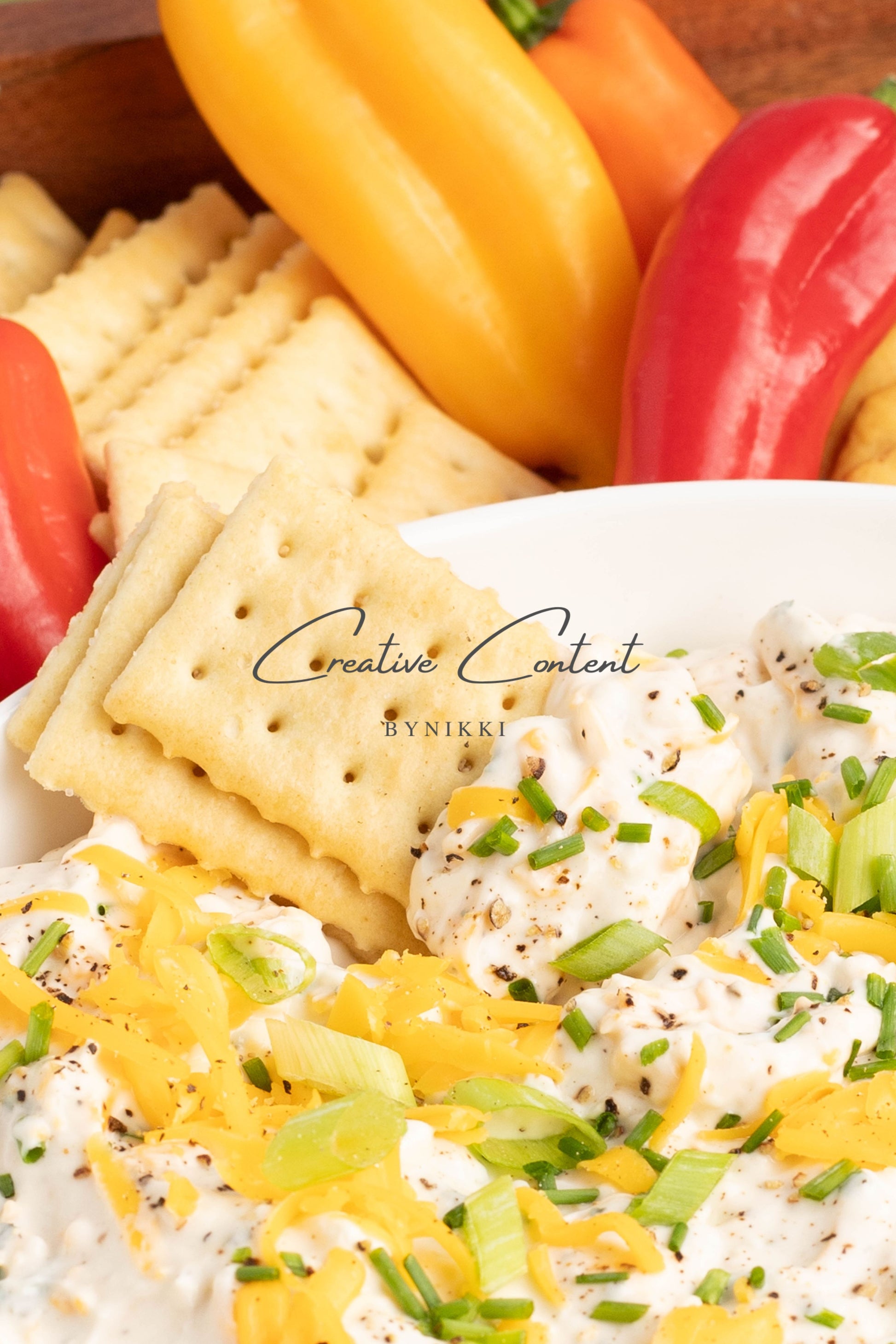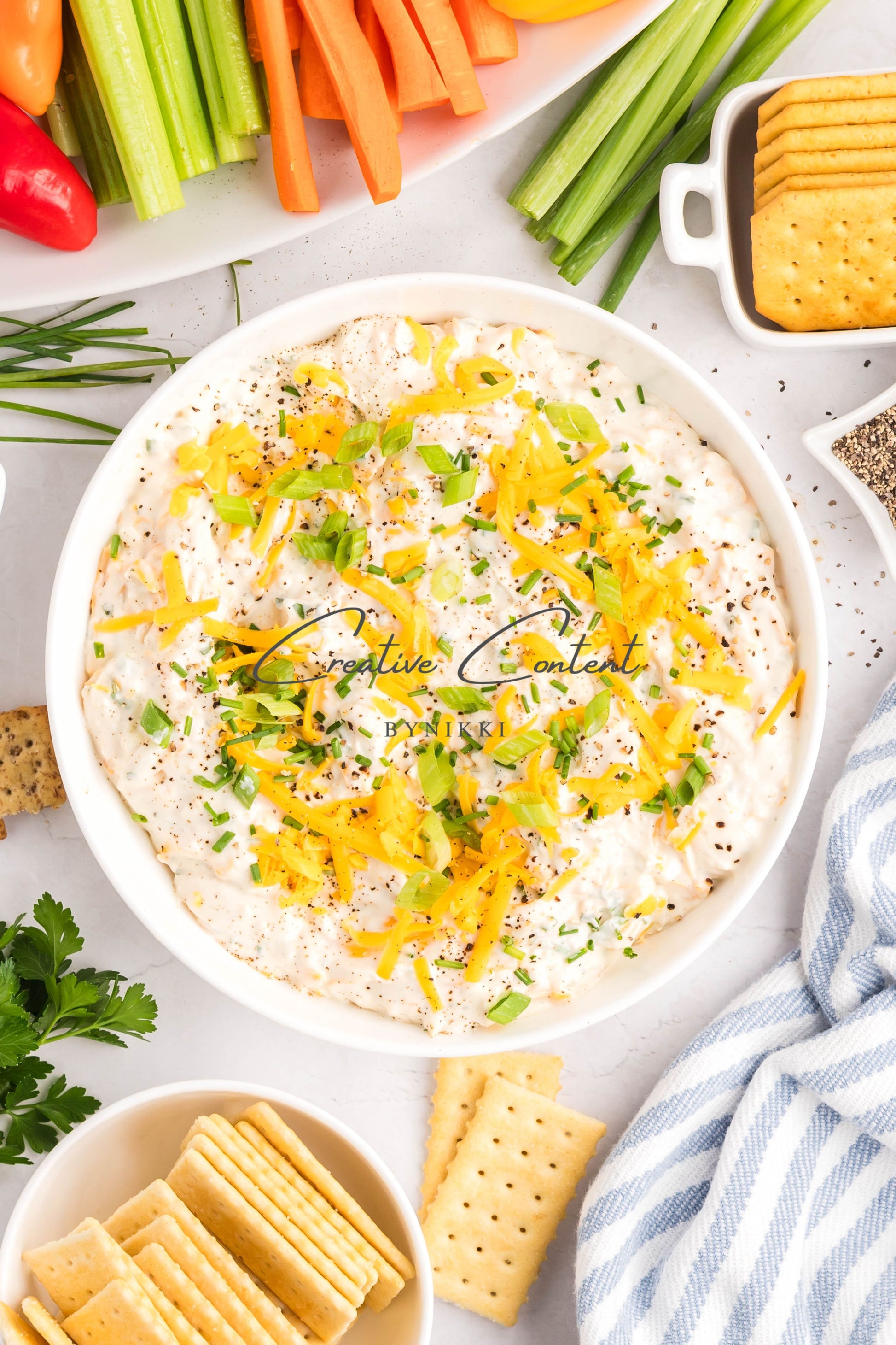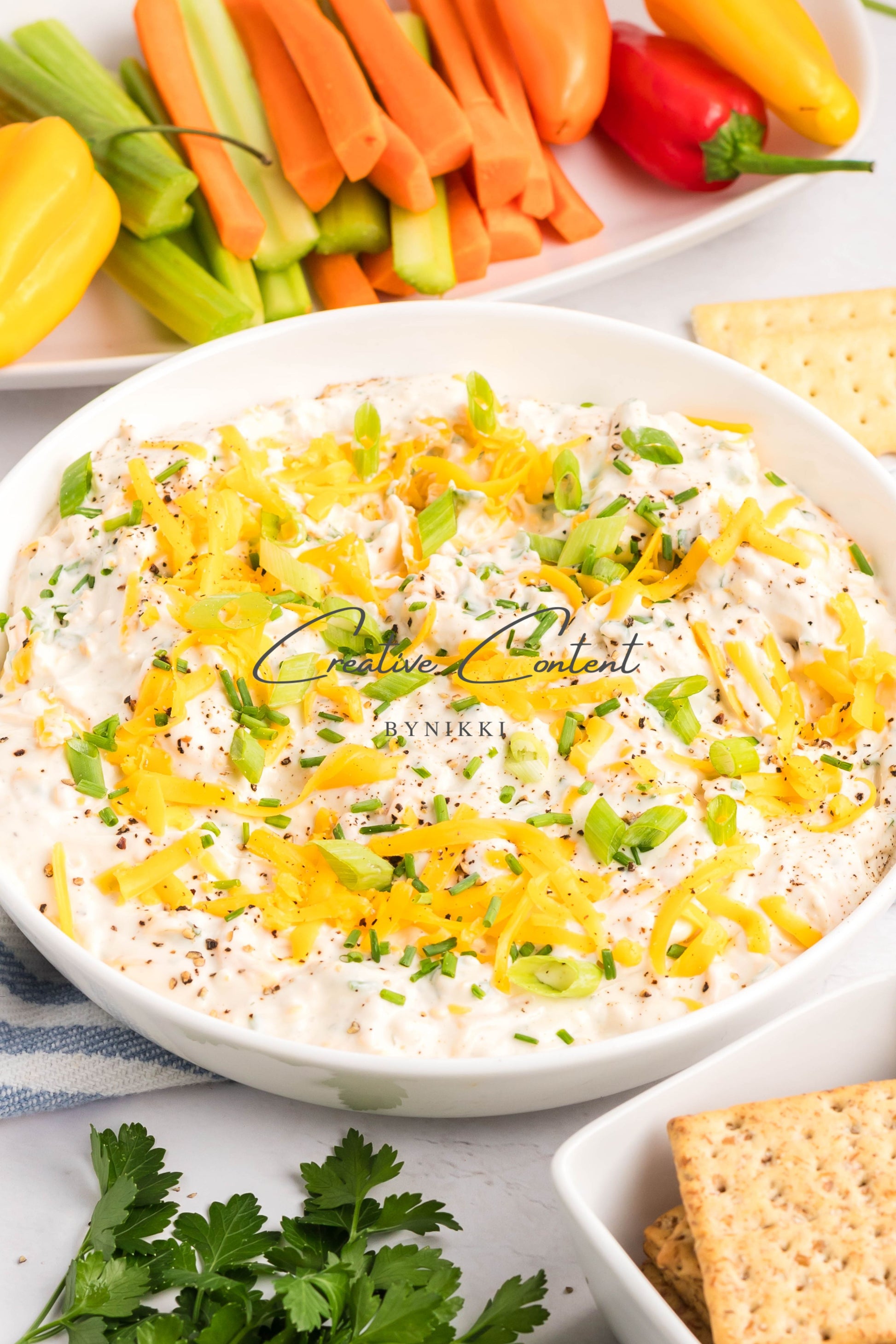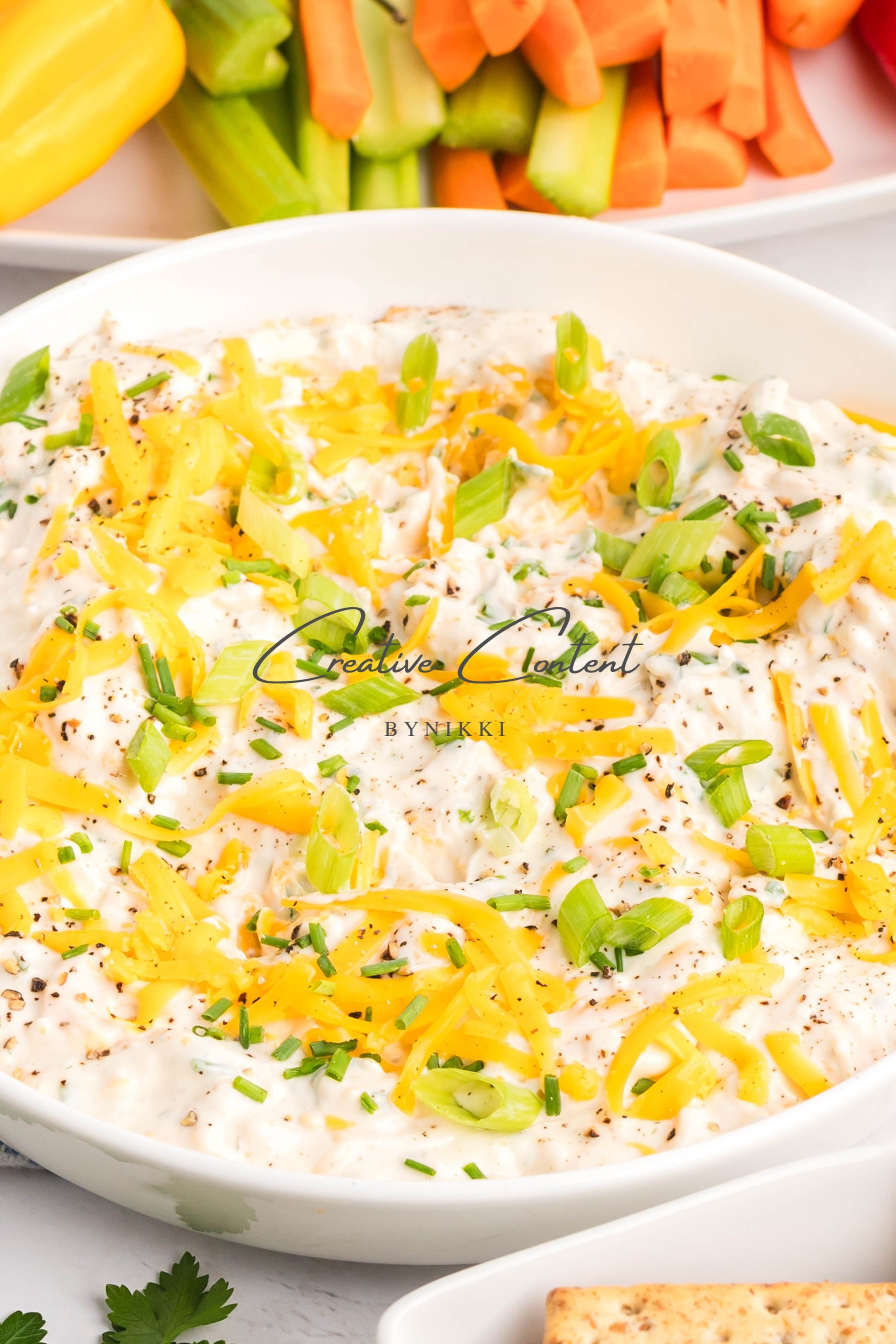 - Ingredients: sour cream, mayonnaise, cream cheese, ranch seasoning mix, Worcestershire sauce, Cheddar cheese, scallions, chives, parsley, tap water, black pepper