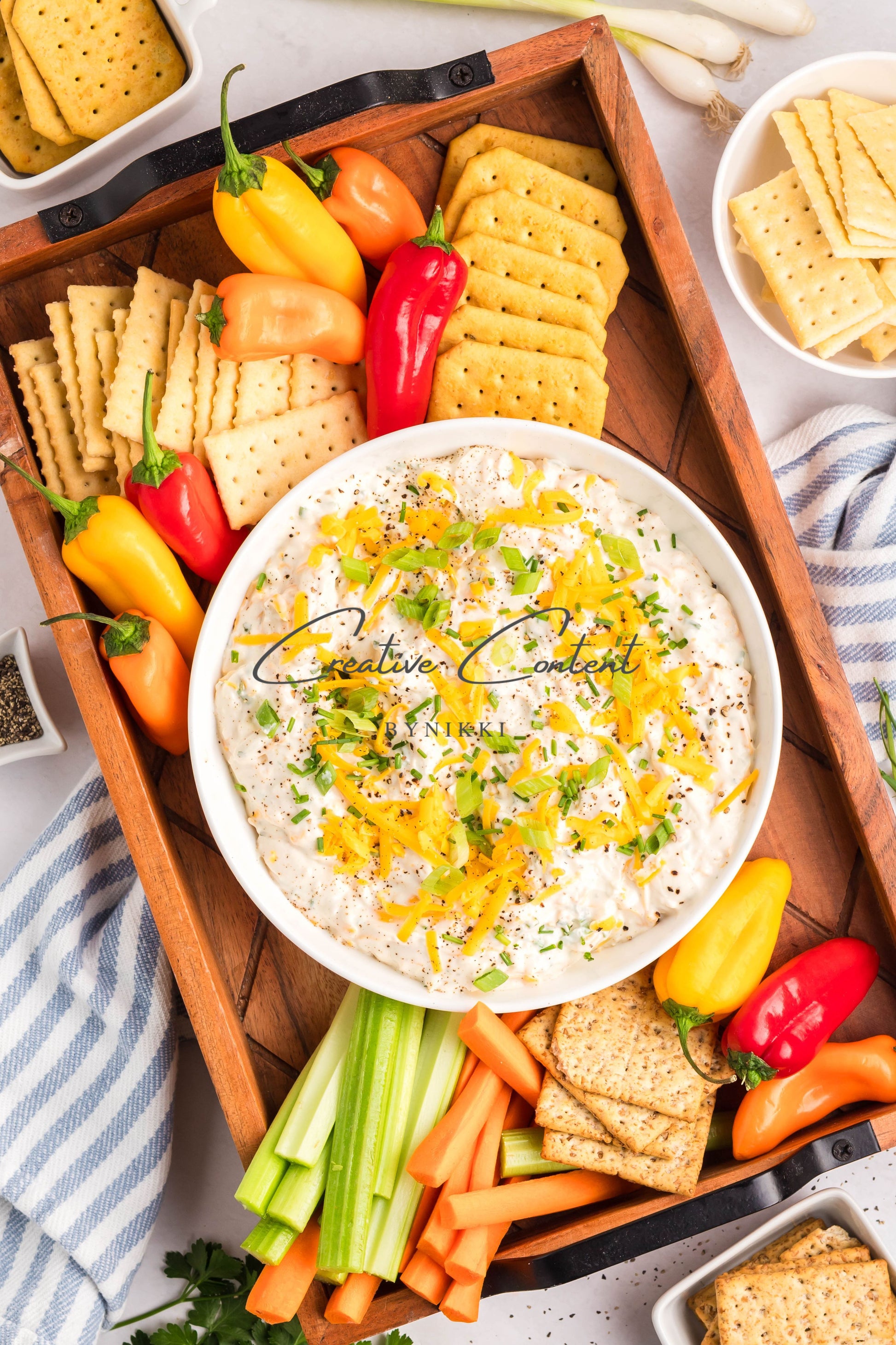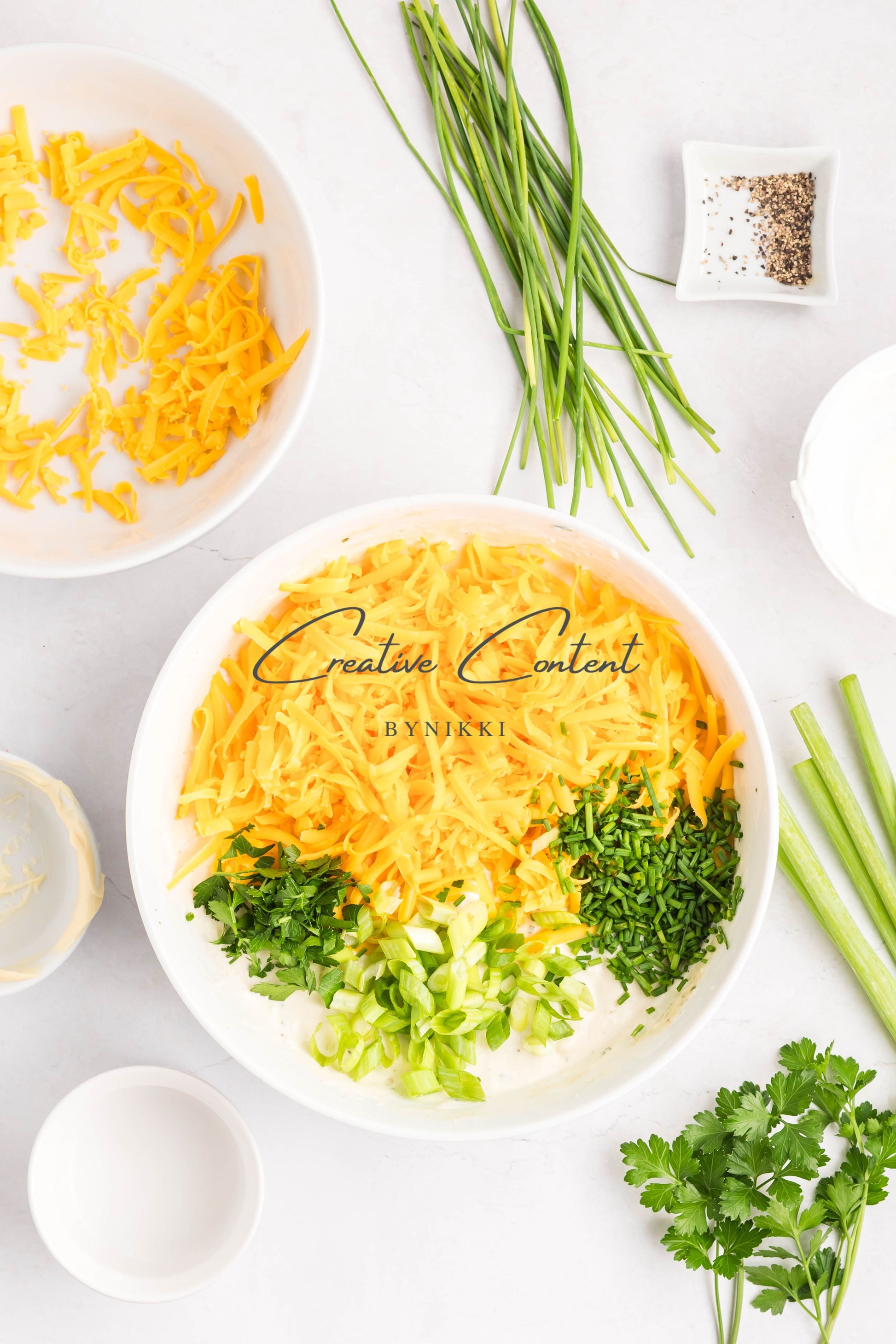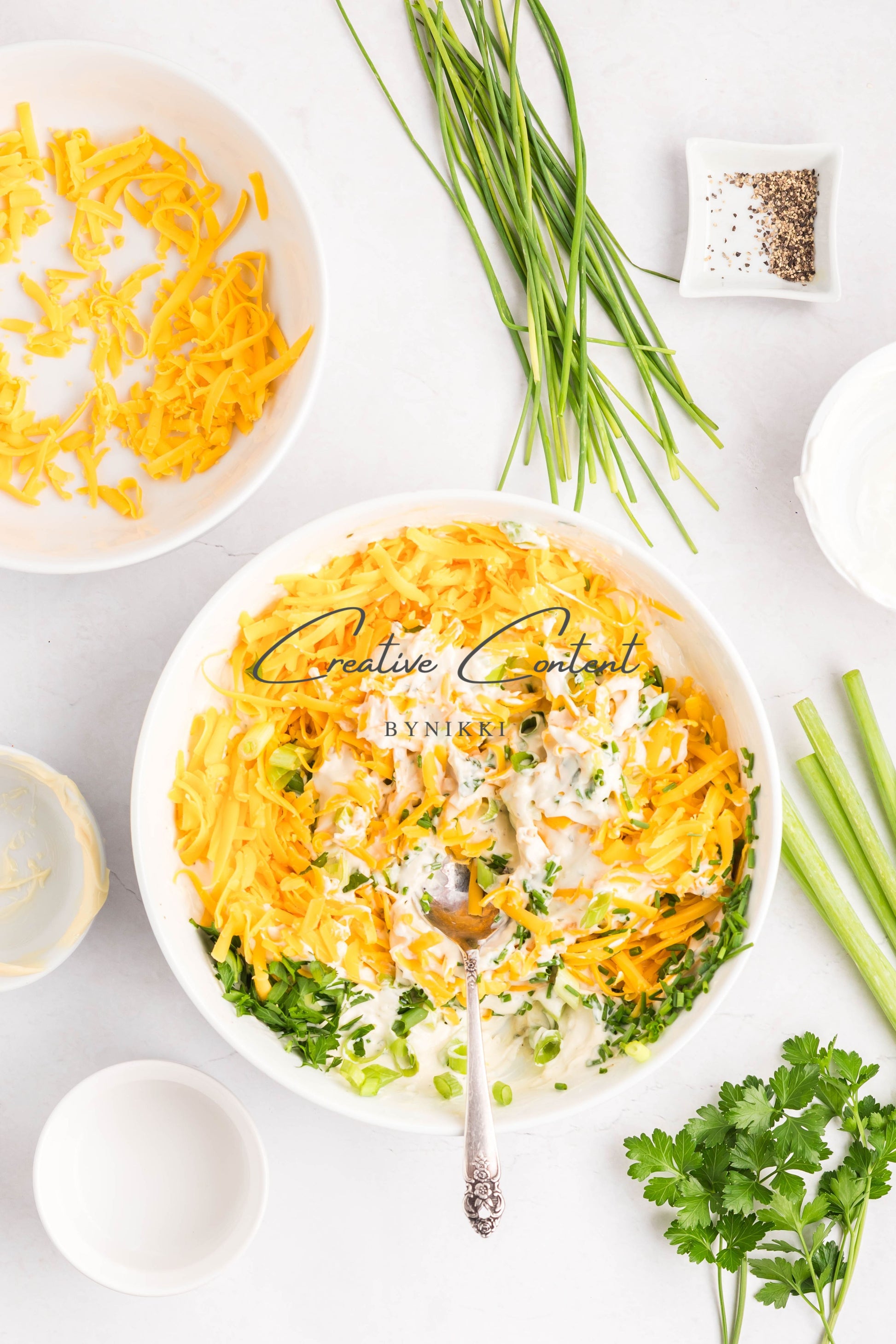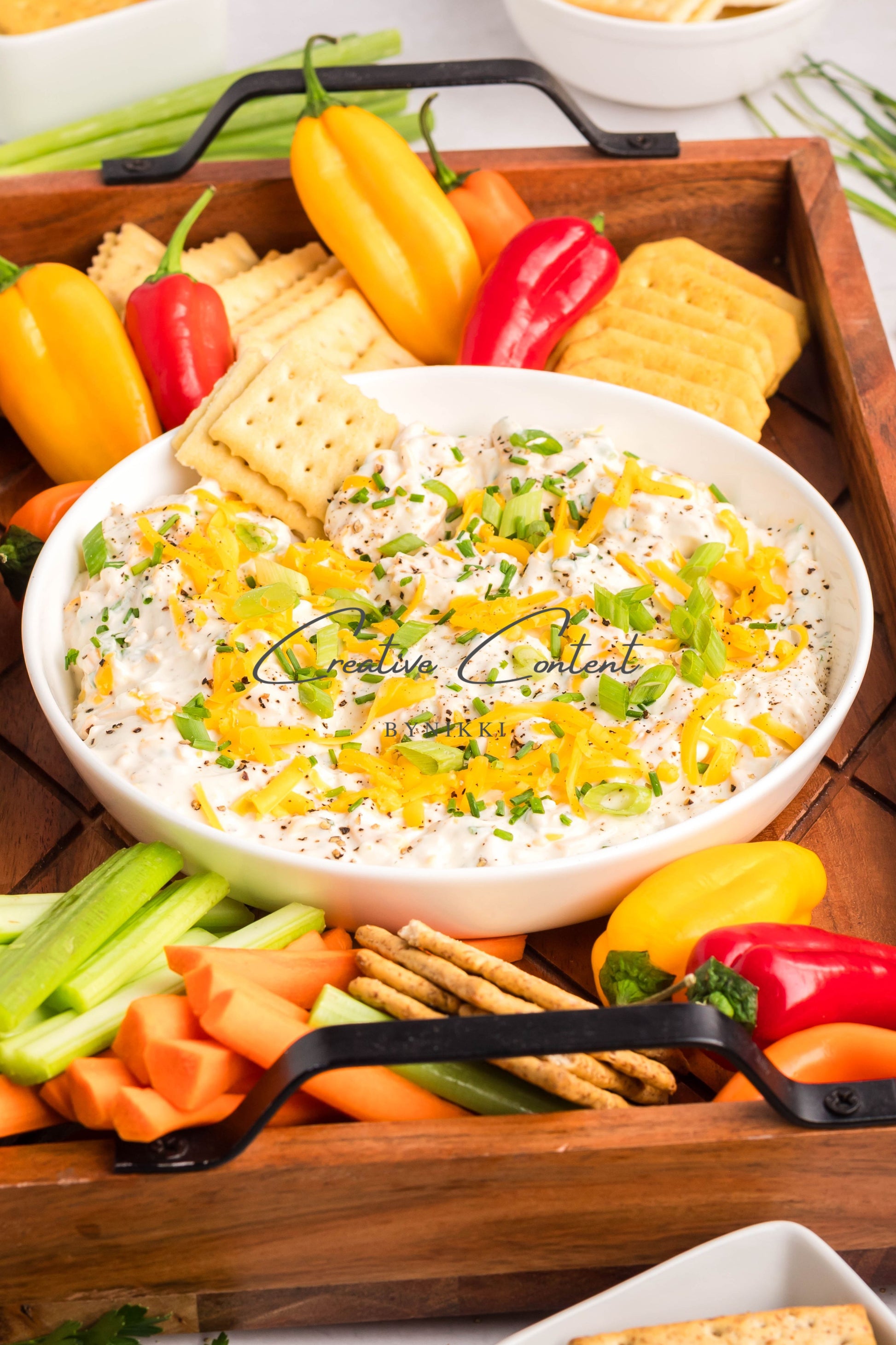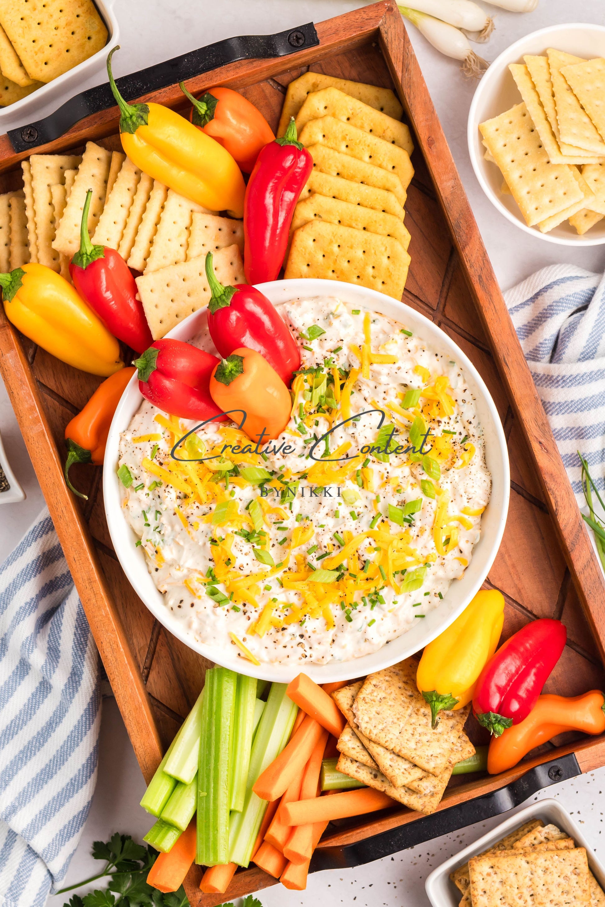 - Ingredients: sour cream, mayonnaise, cream cheese, ranch seasoning mix, Worcestershire sauce, Cheddar cheese, scallions, chives, parsley, tap water, black pepper