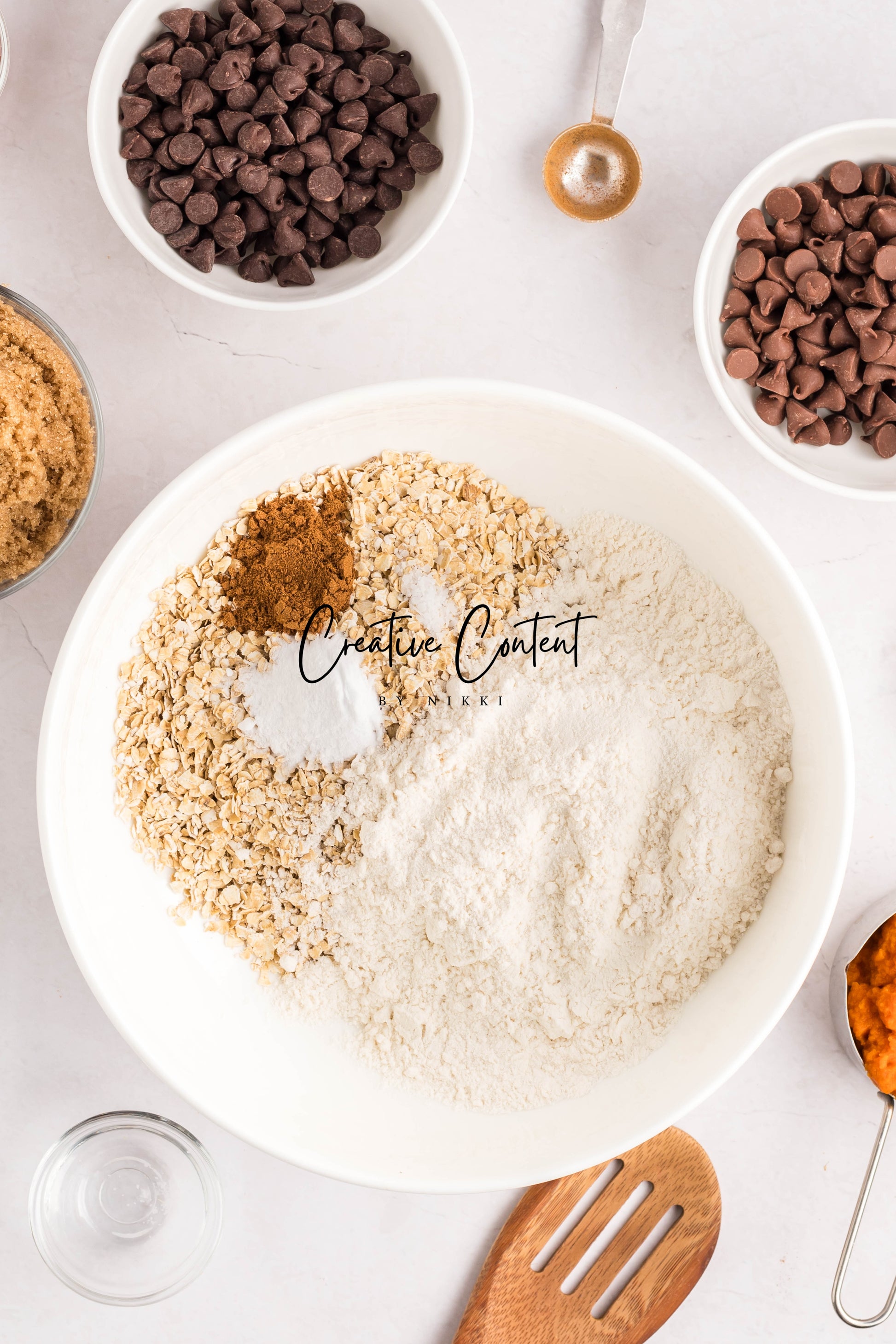 - Featured Ingredients; quick cook oats, all-purpose flour, baking soda, pumpkin pie spice, coarse kosher salt, unsalted butter, brown sugar, granulated sugar, pumpkin puree, egg, and vanilla extract.
