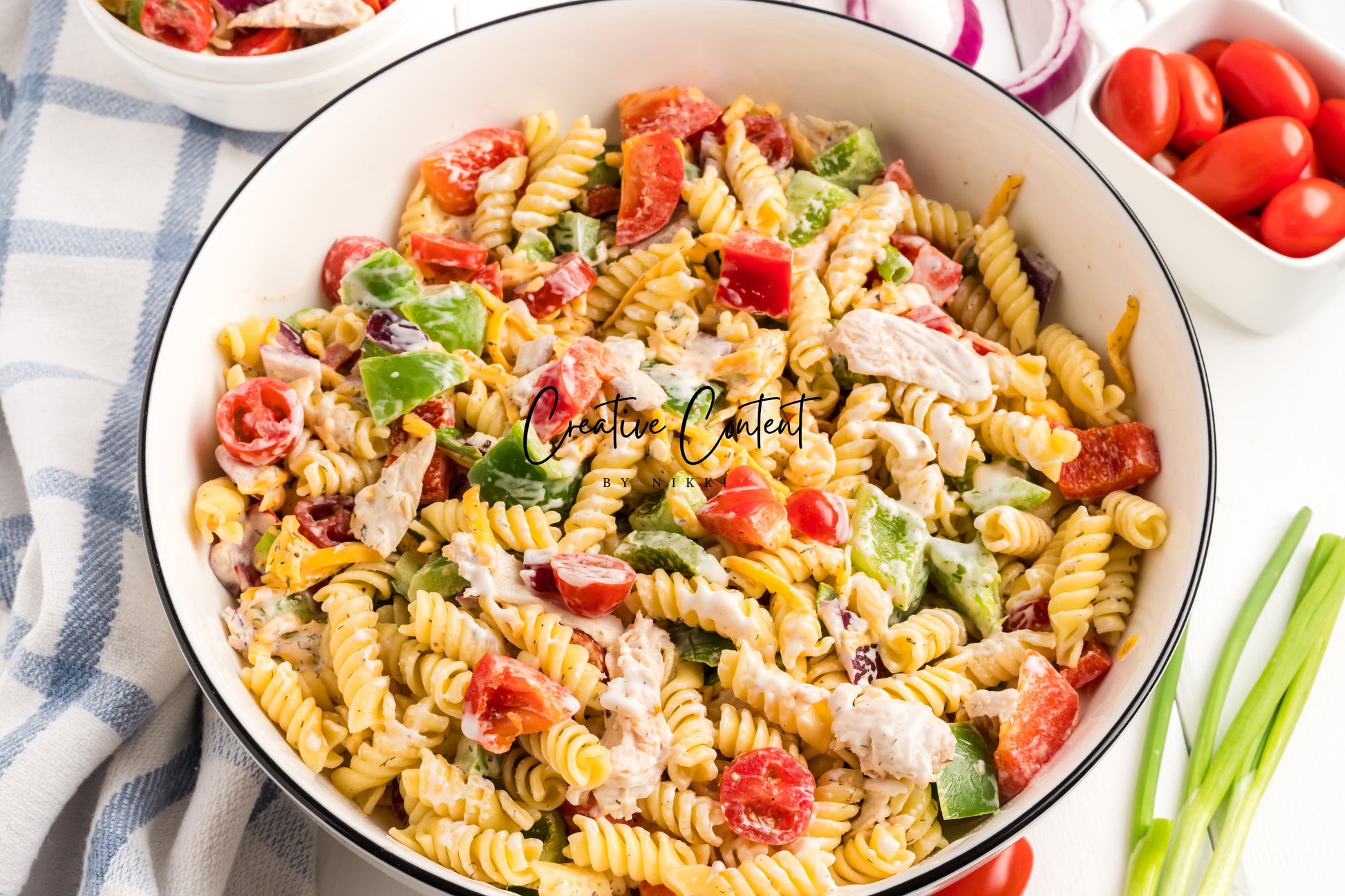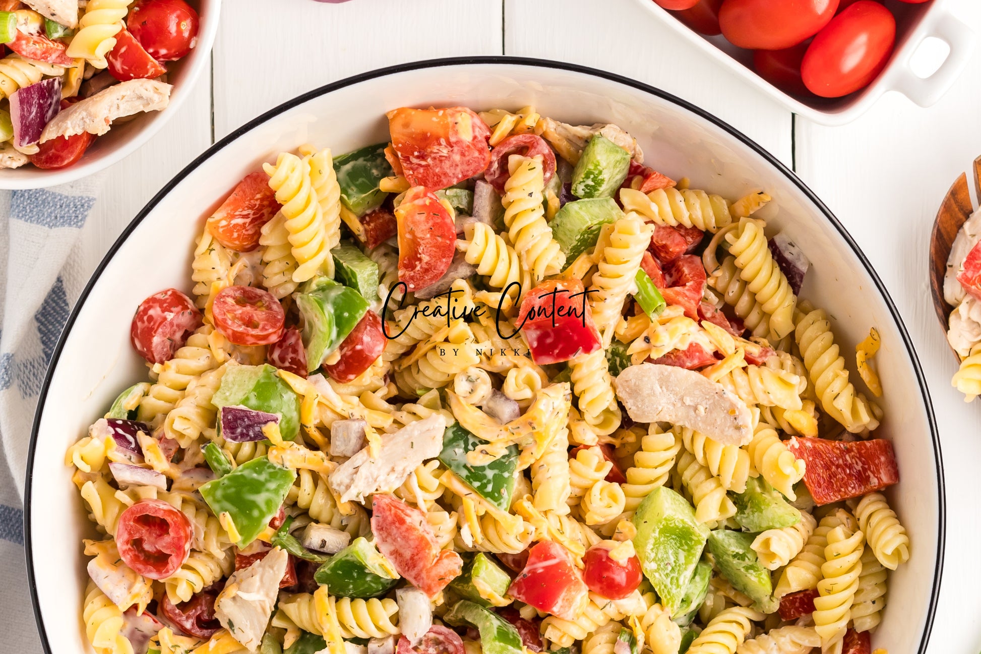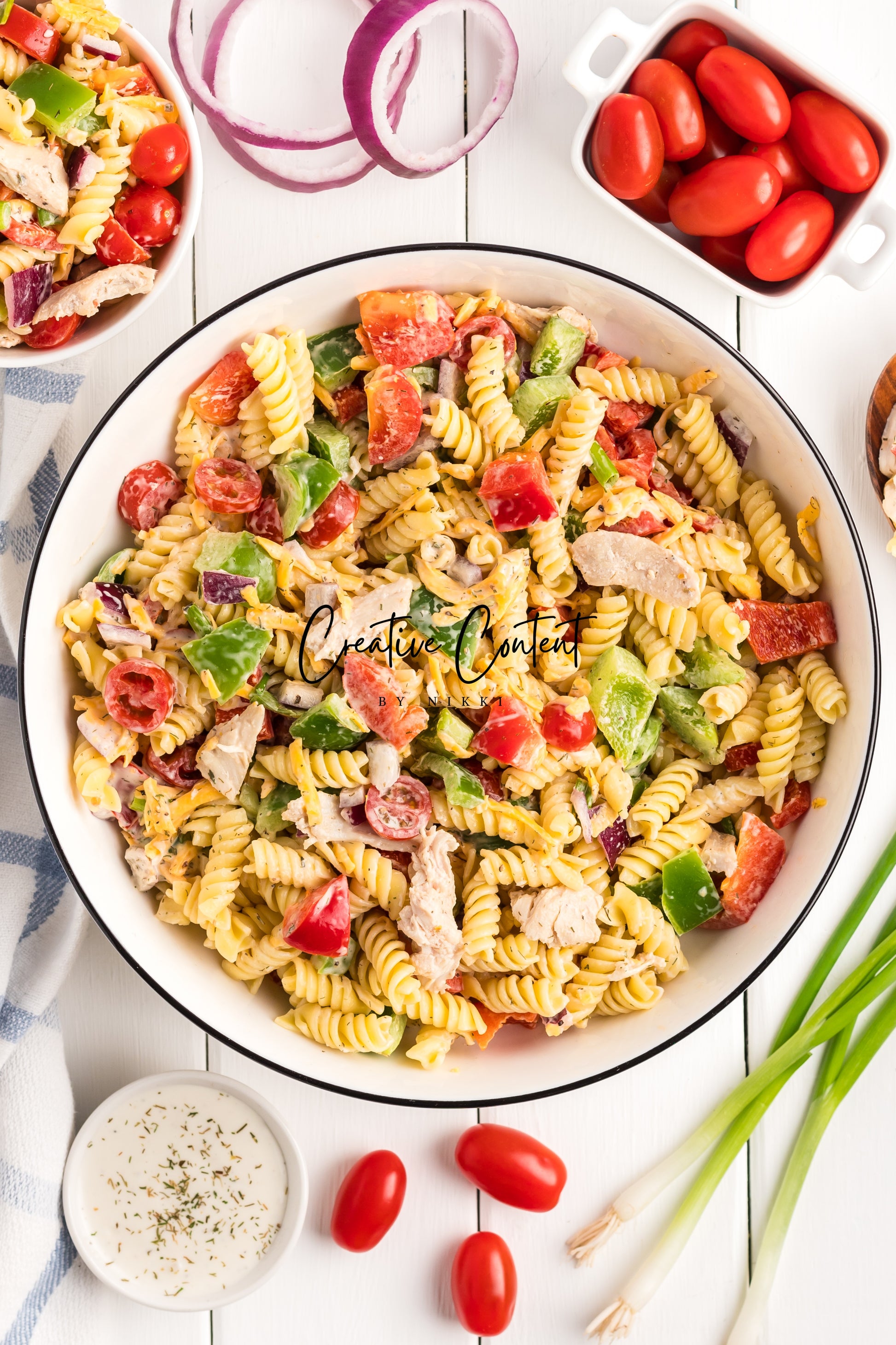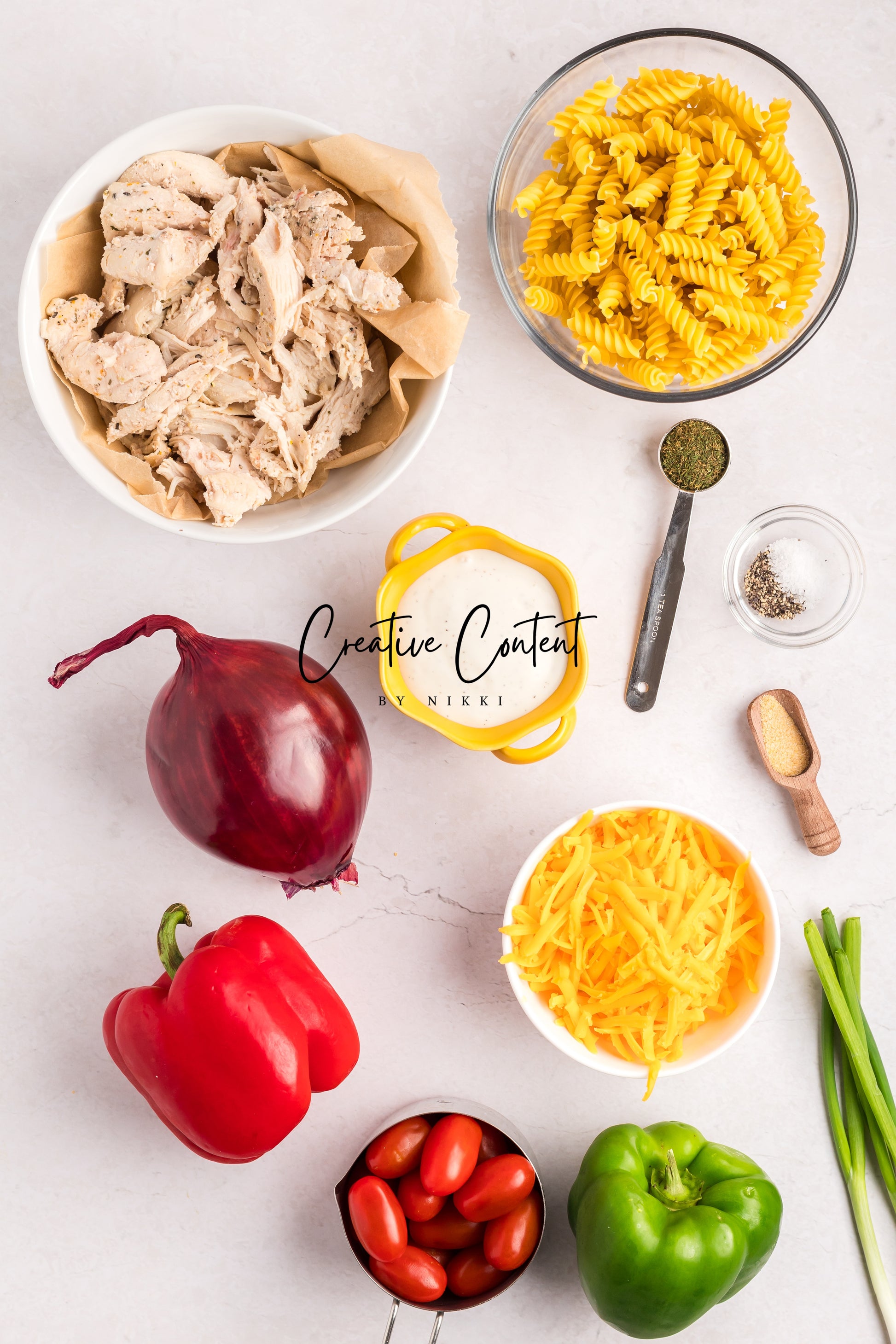 - Featured Ingredients; rotini pasta, cooked chicken, green bell pepper, red bell pepper, cherry tomatoes, cheddar cheese, red onion, dried dill, garlic powder, salt, pepper, and ranch dressing