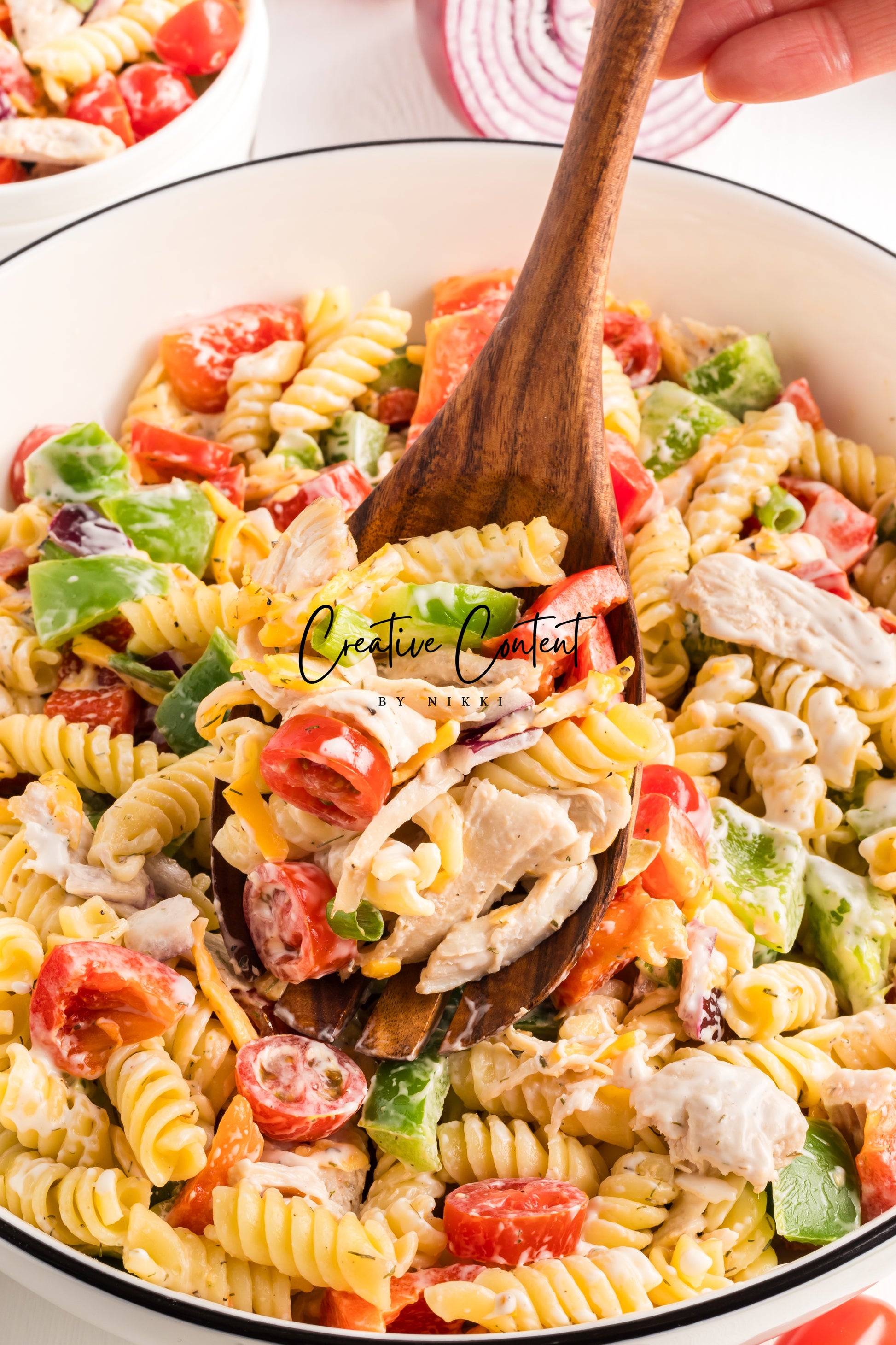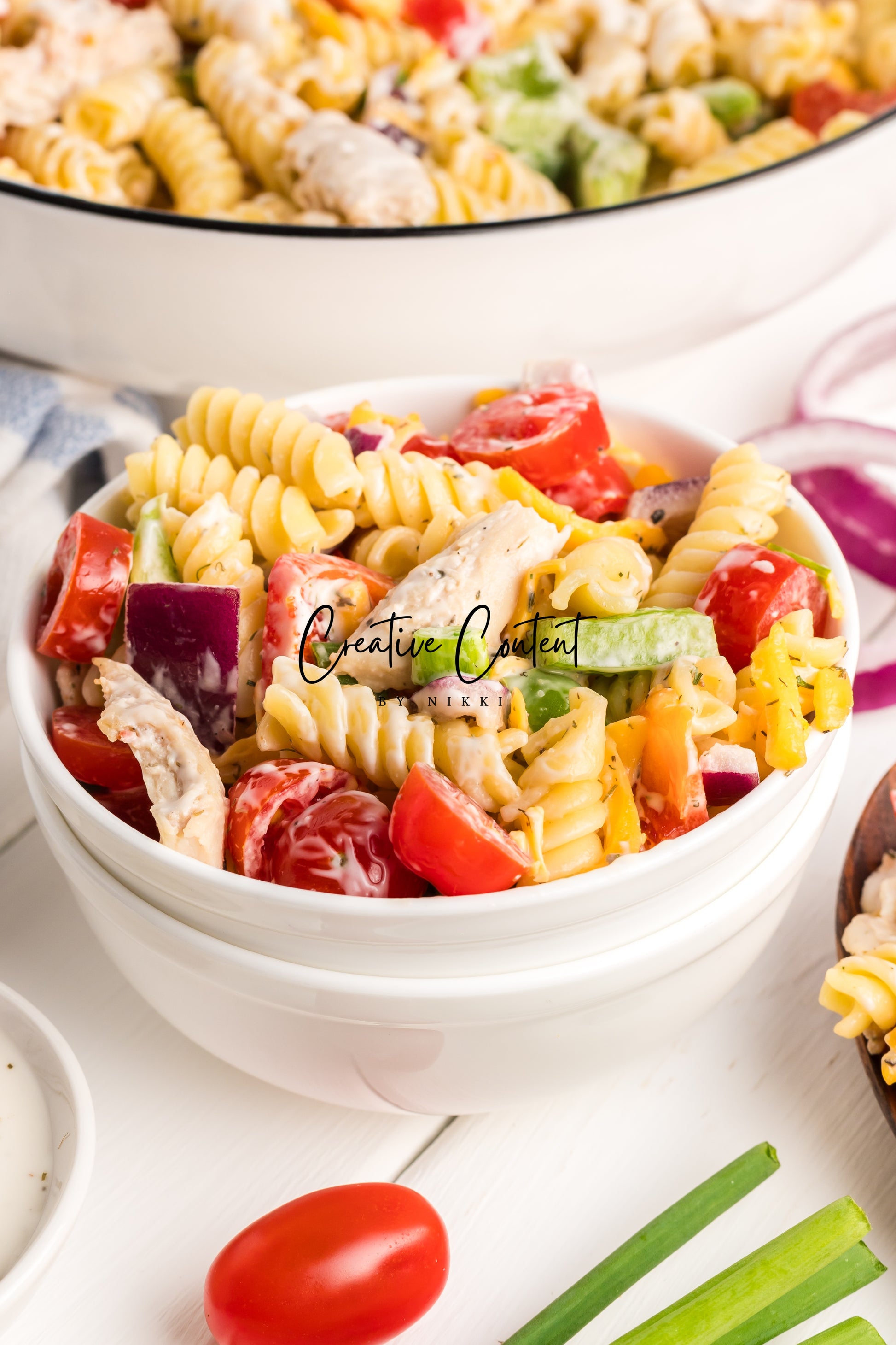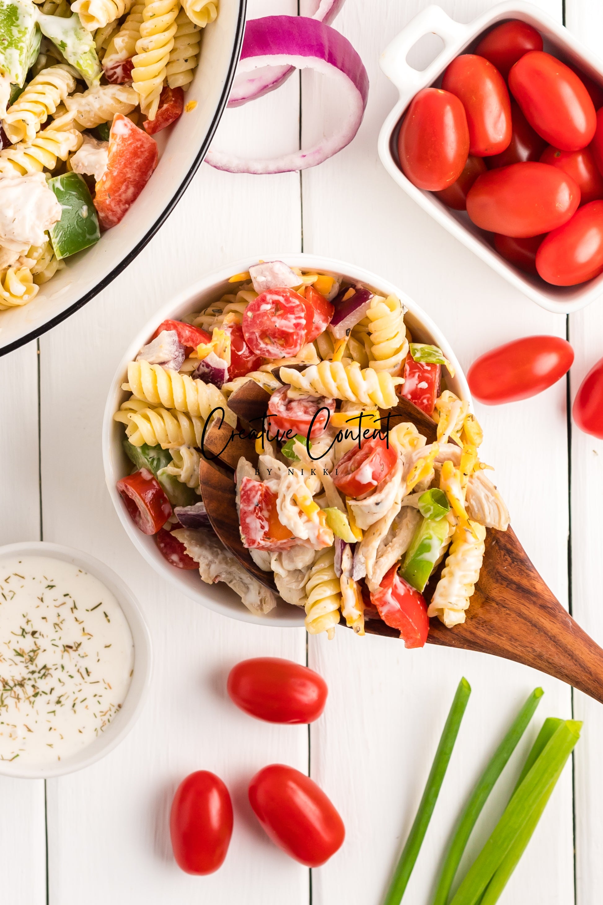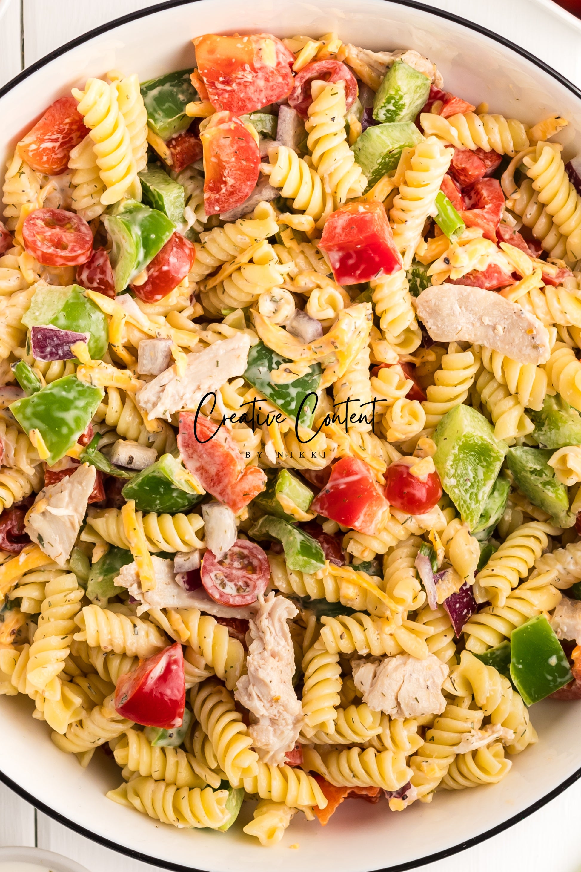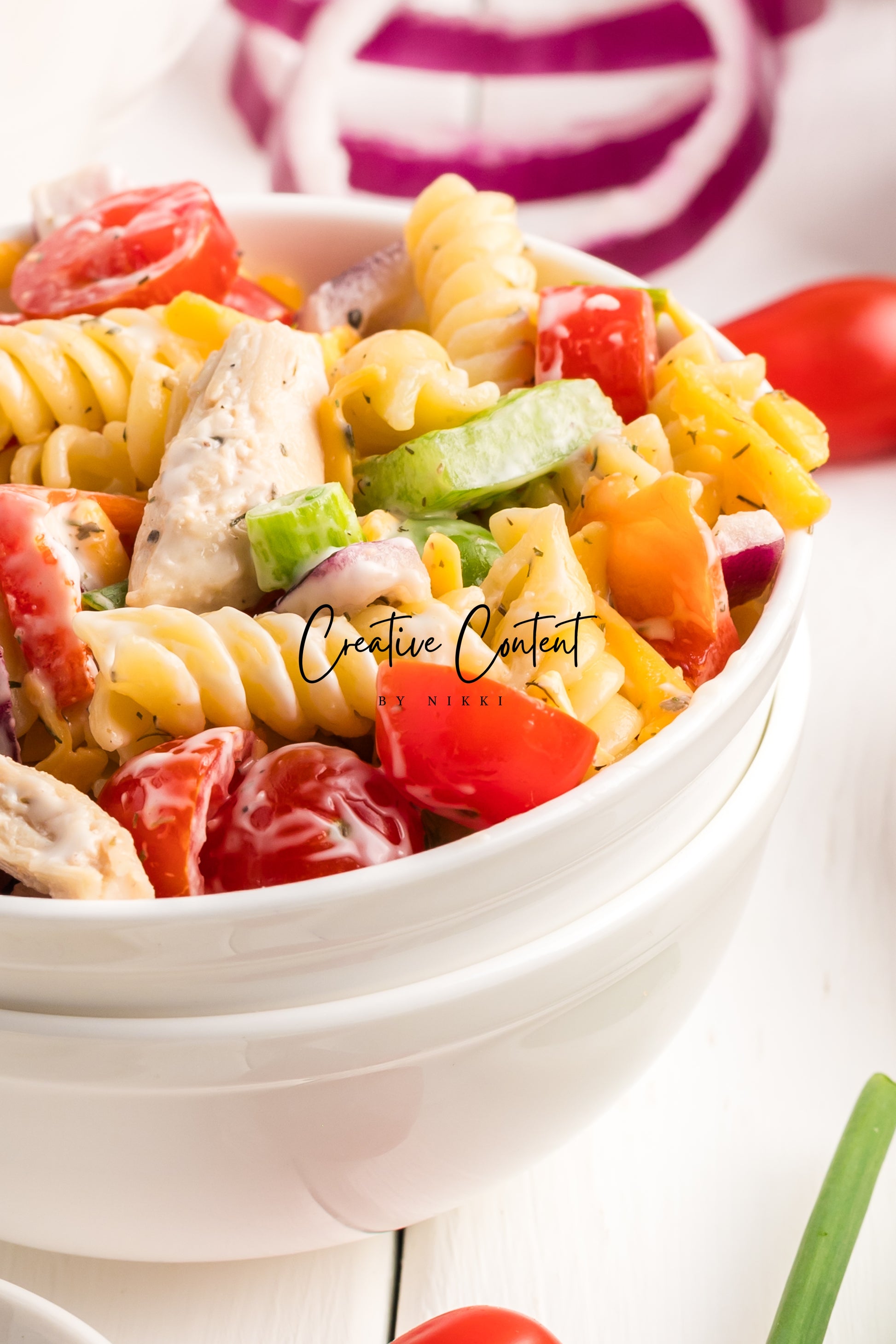 - Featured Ingredients; rotini pasta, cooked chicken, green bell pepper, red bell pepper, cherry tomatoes, cheddar cheese, red onion, dried dill, garlic powder, salt, pepper, and ranch dressing