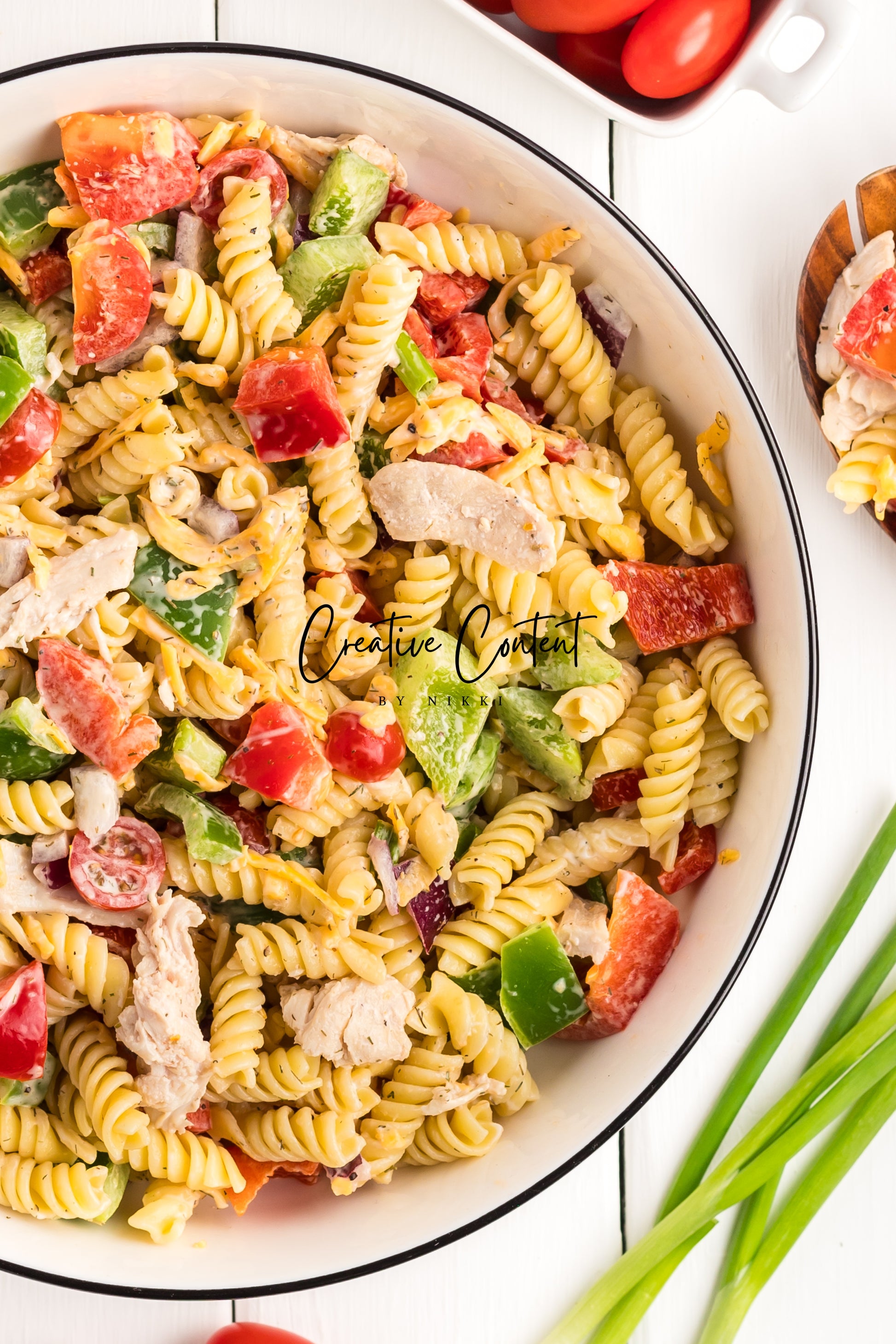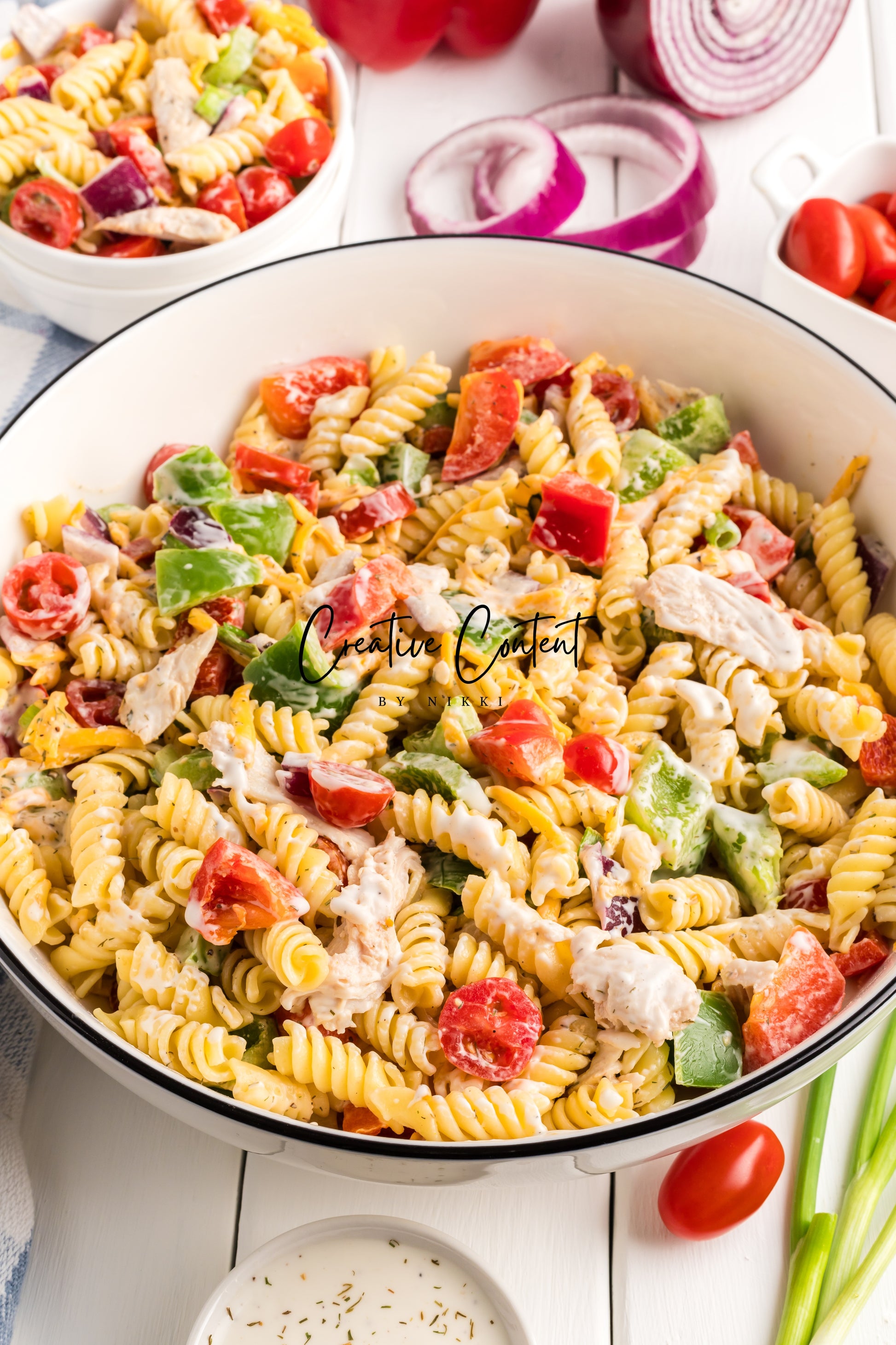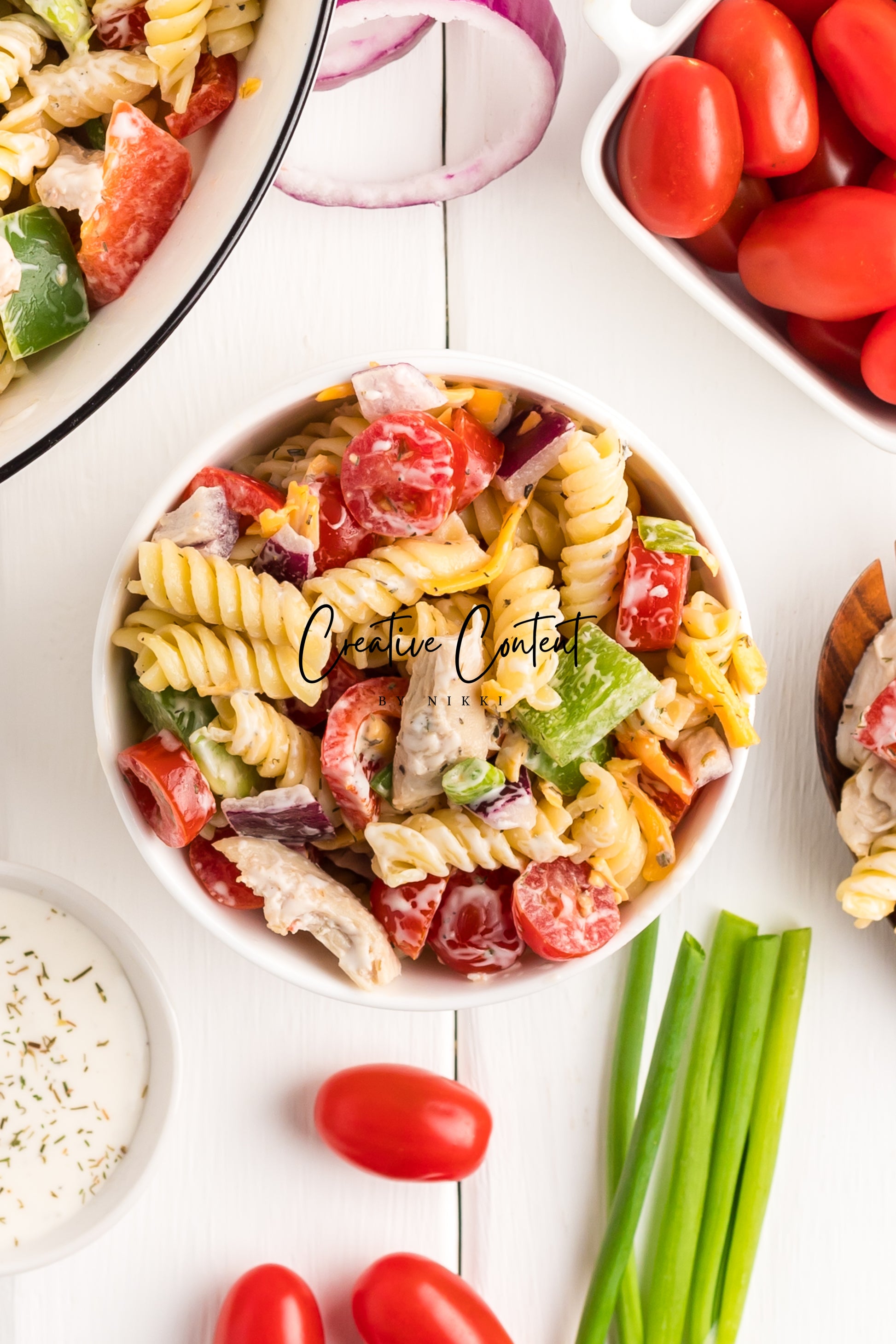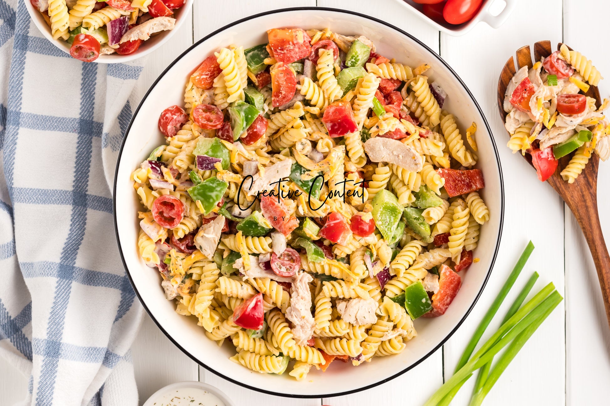 - Featured Ingredients; rotini pasta, cooked chicken, green bell pepper, red bell pepper, cherry tomatoes, cheddar cheese, red onion, dried dill, garlic powder, salt, pepper, and ranch dressing