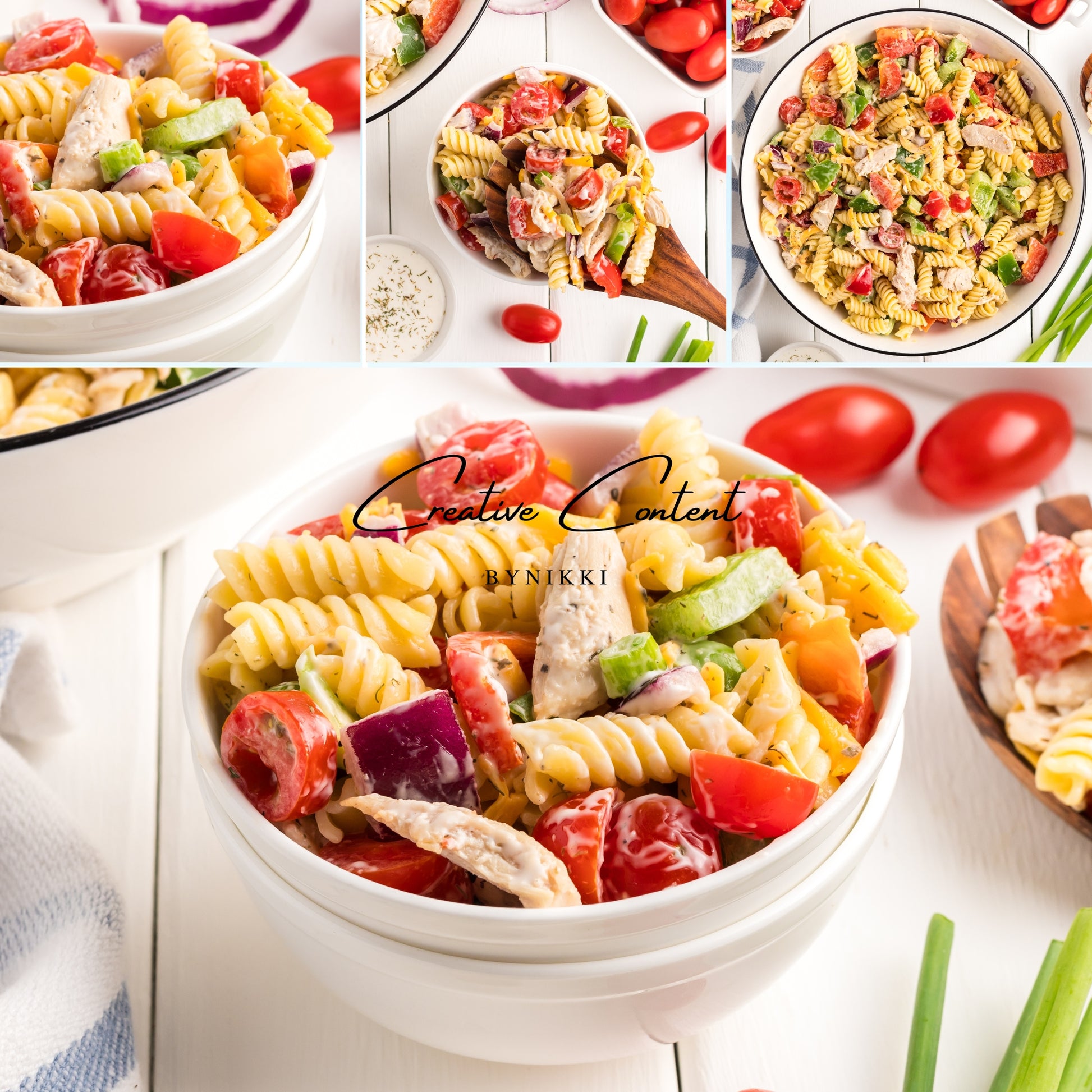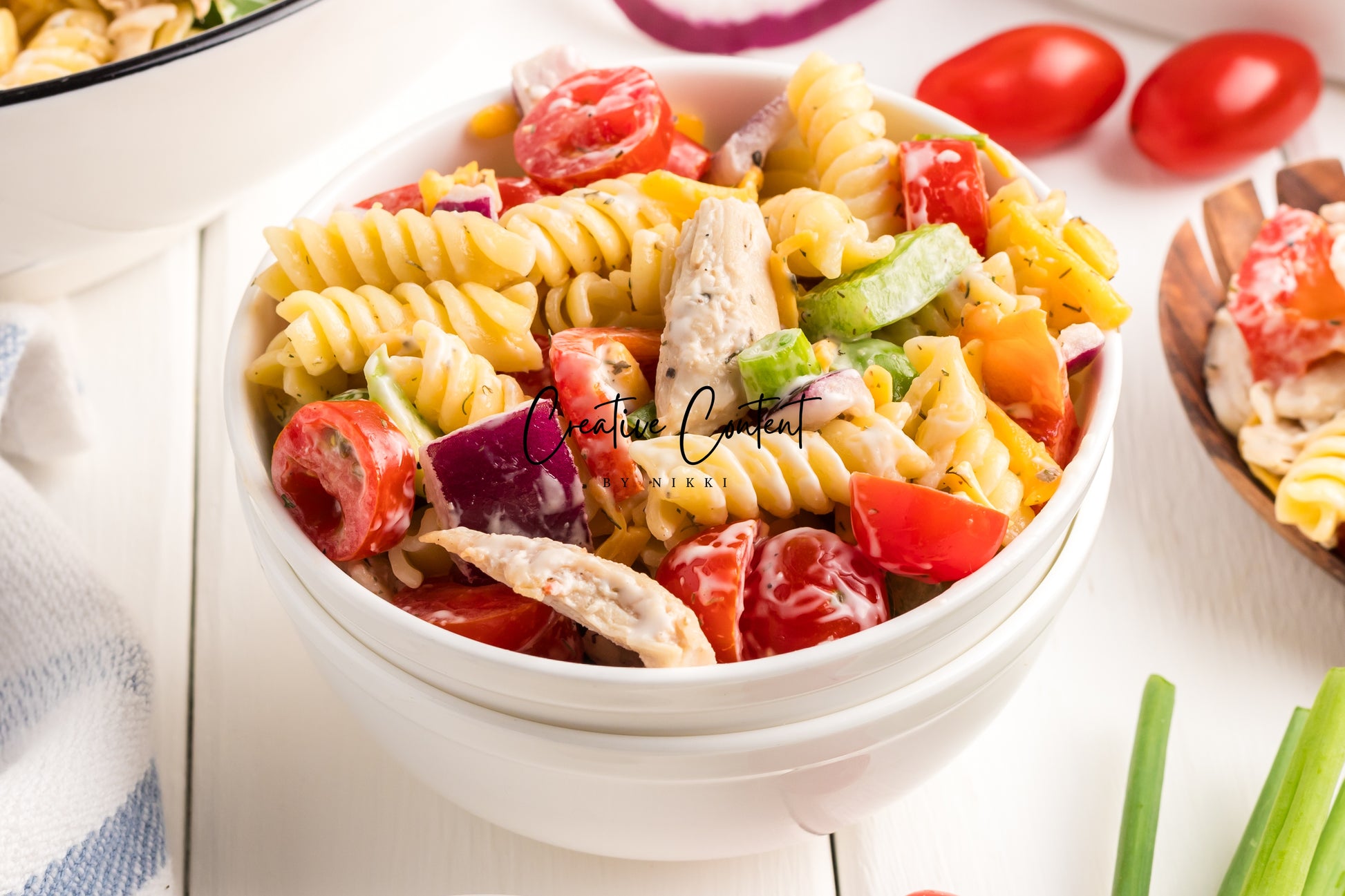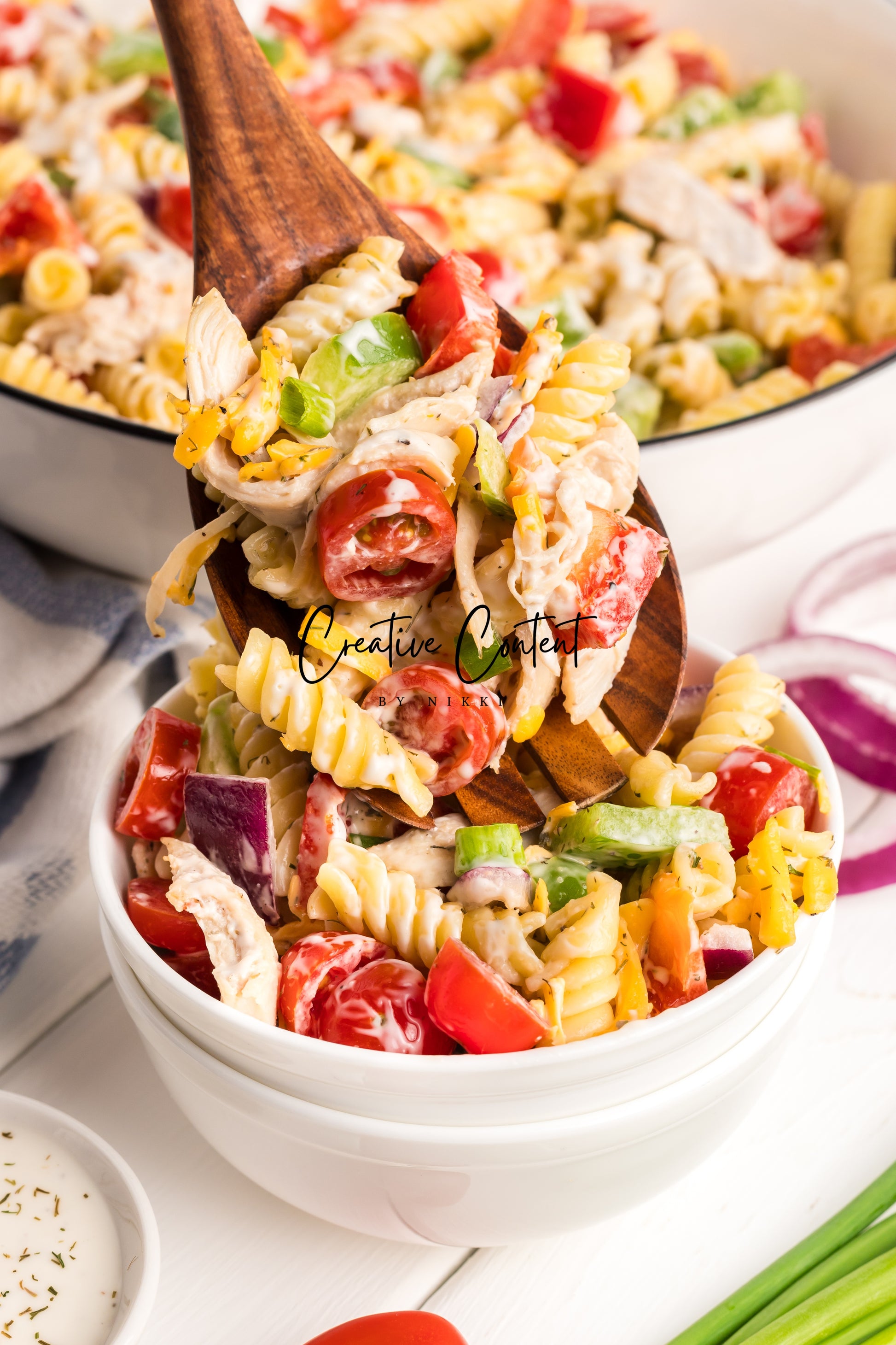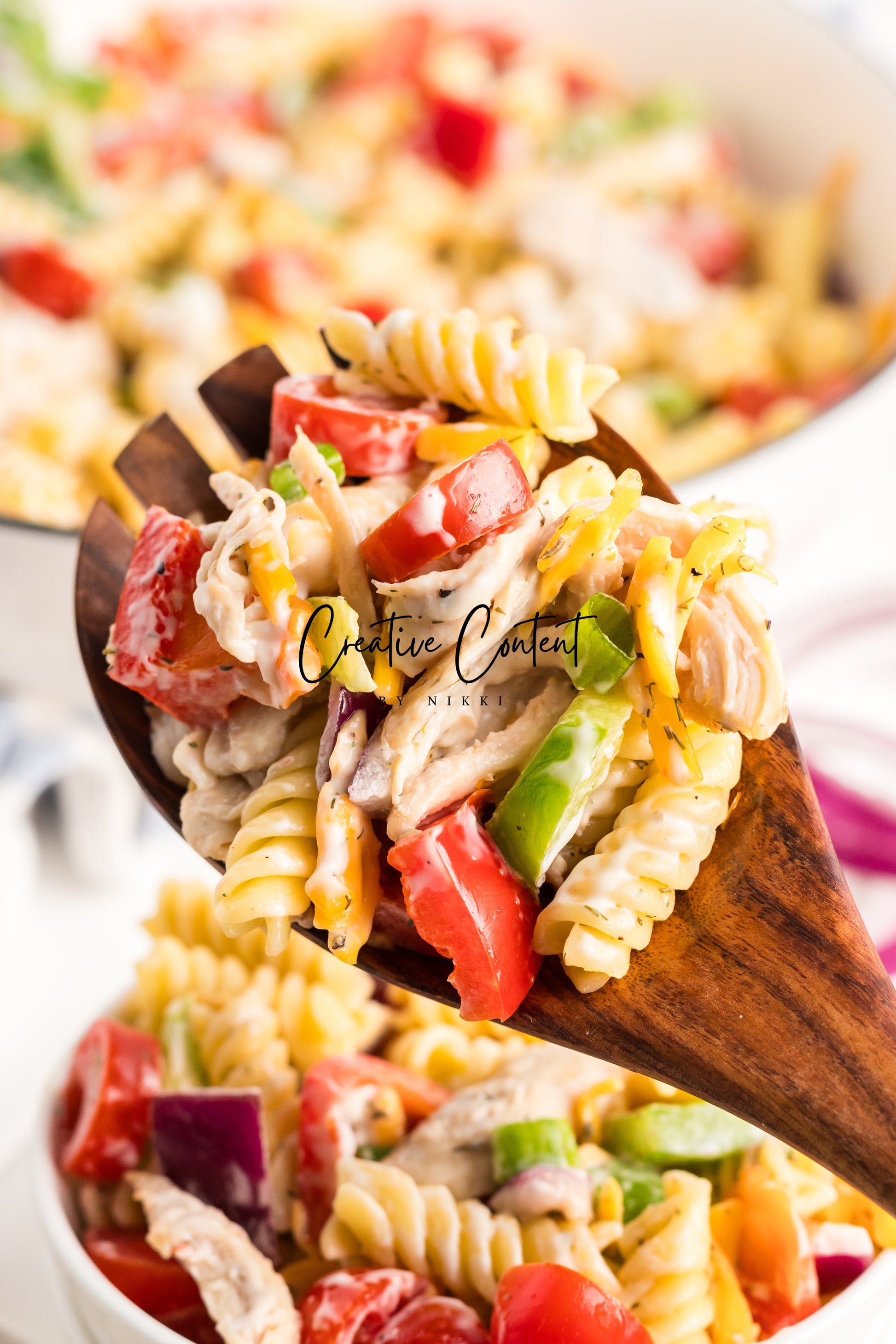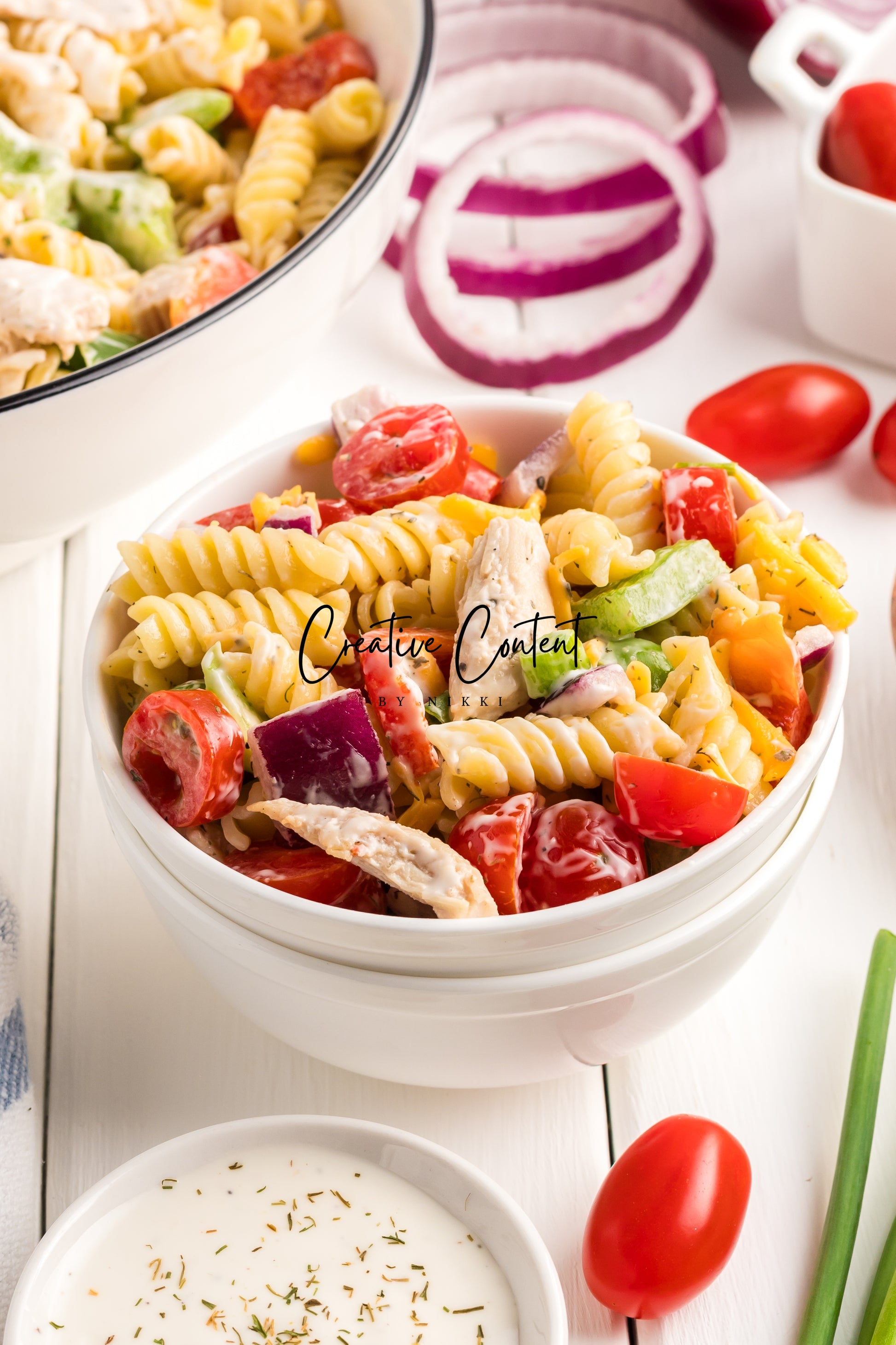 - Featured Ingredients; rotini pasta, cooked chicken, green bell pepper, red bell pepper, cherry tomatoes, cheddar cheese, red onion, dried dill, garlic powder, salt, pepper, and ranch dressing