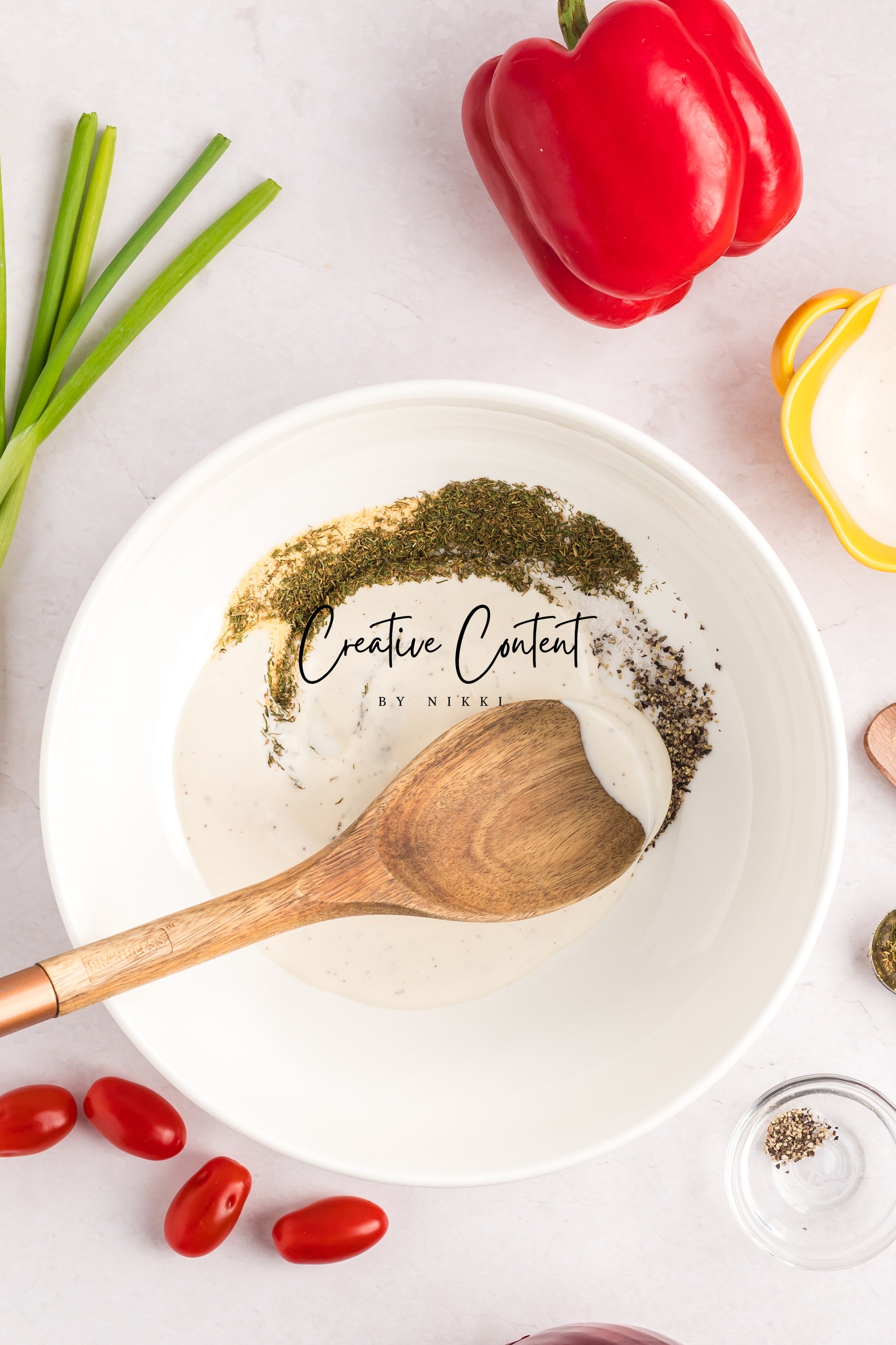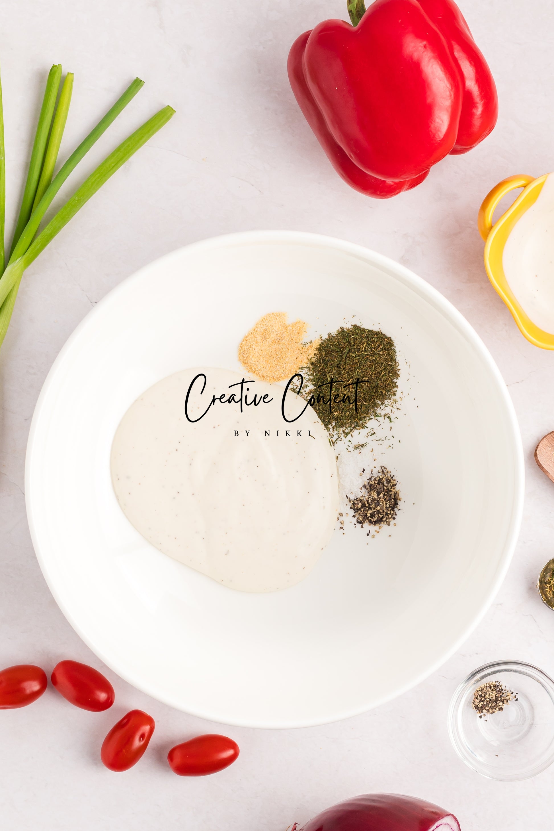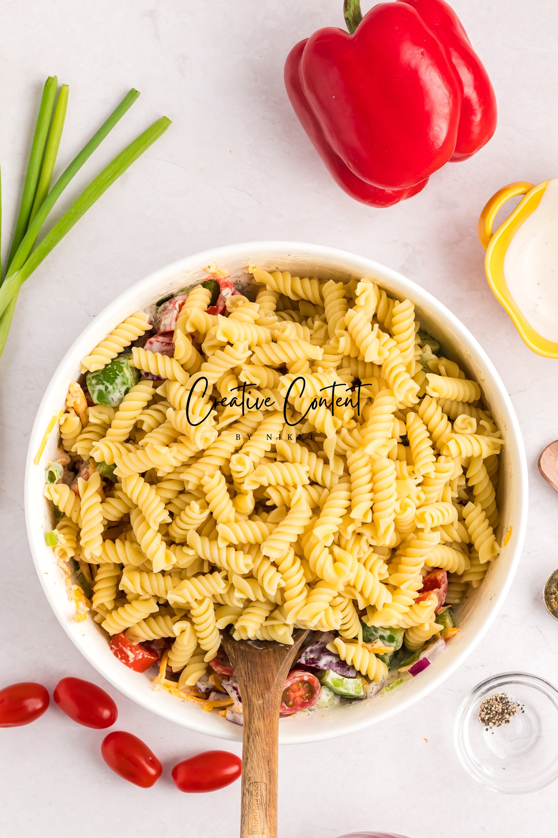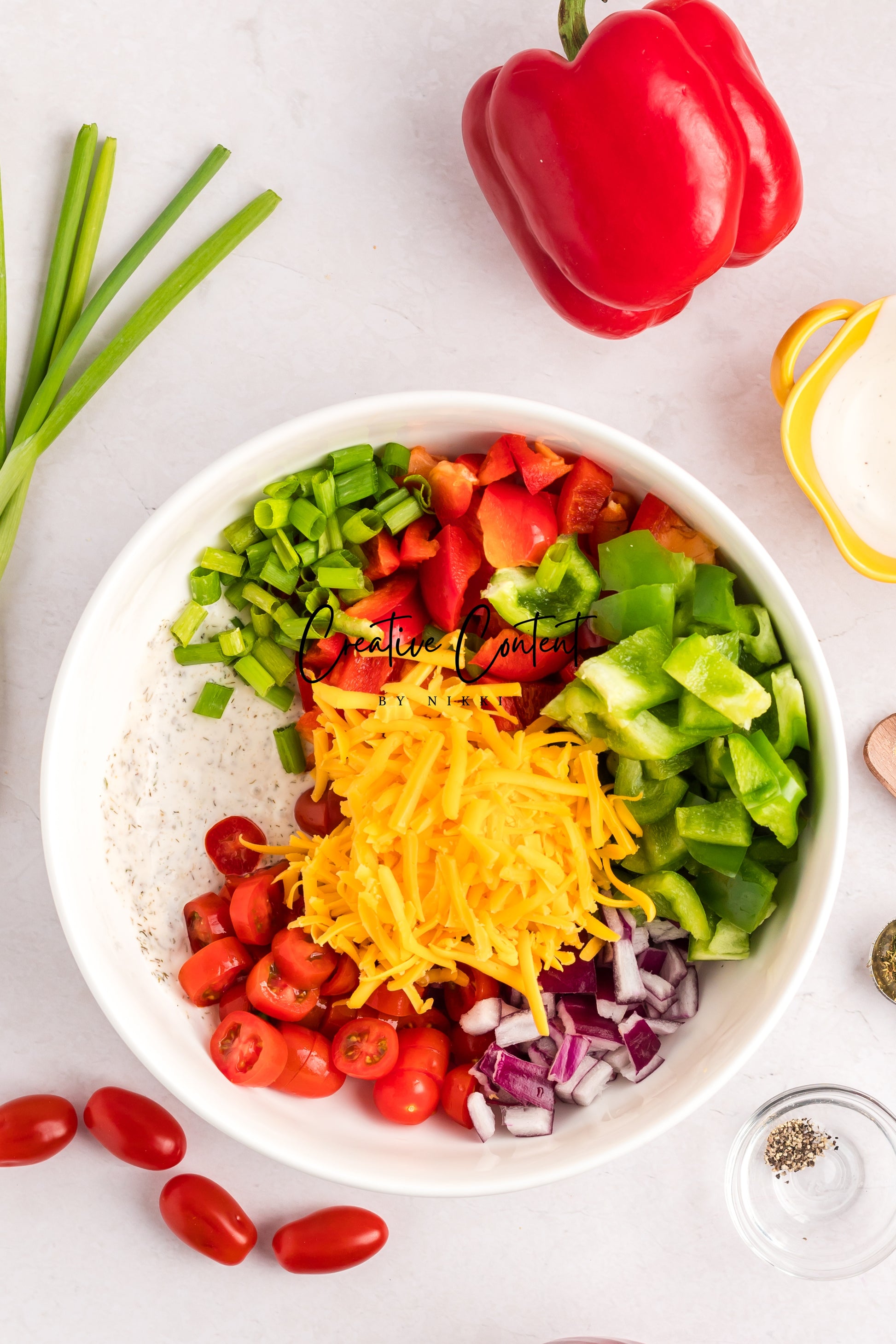 - Featured Ingredients; rotini pasta, cooked chicken, green bell pepper, red bell pepper, cherry tomatoes, cheddar cheese, red onion, dried dill, garlic powder, salt, pepper, and ranch dressing