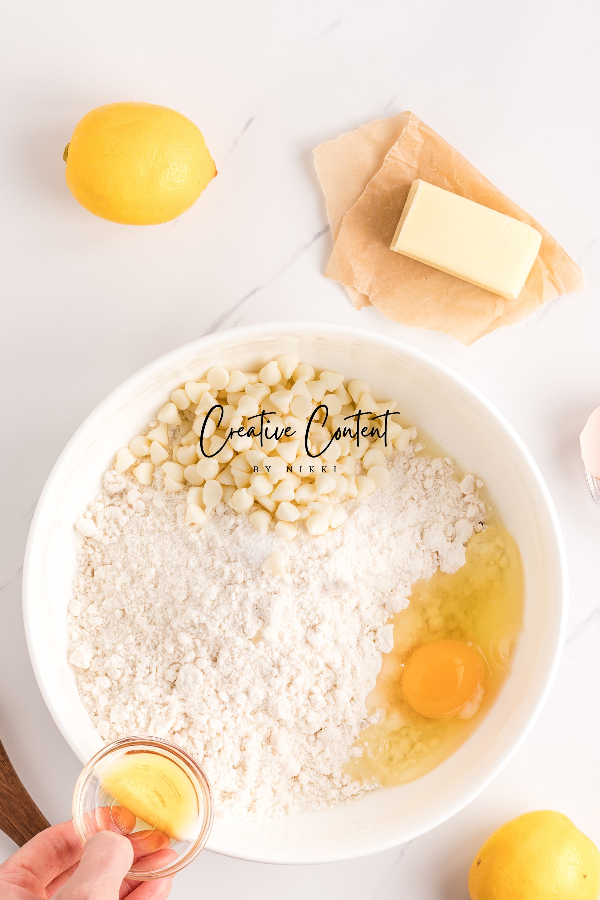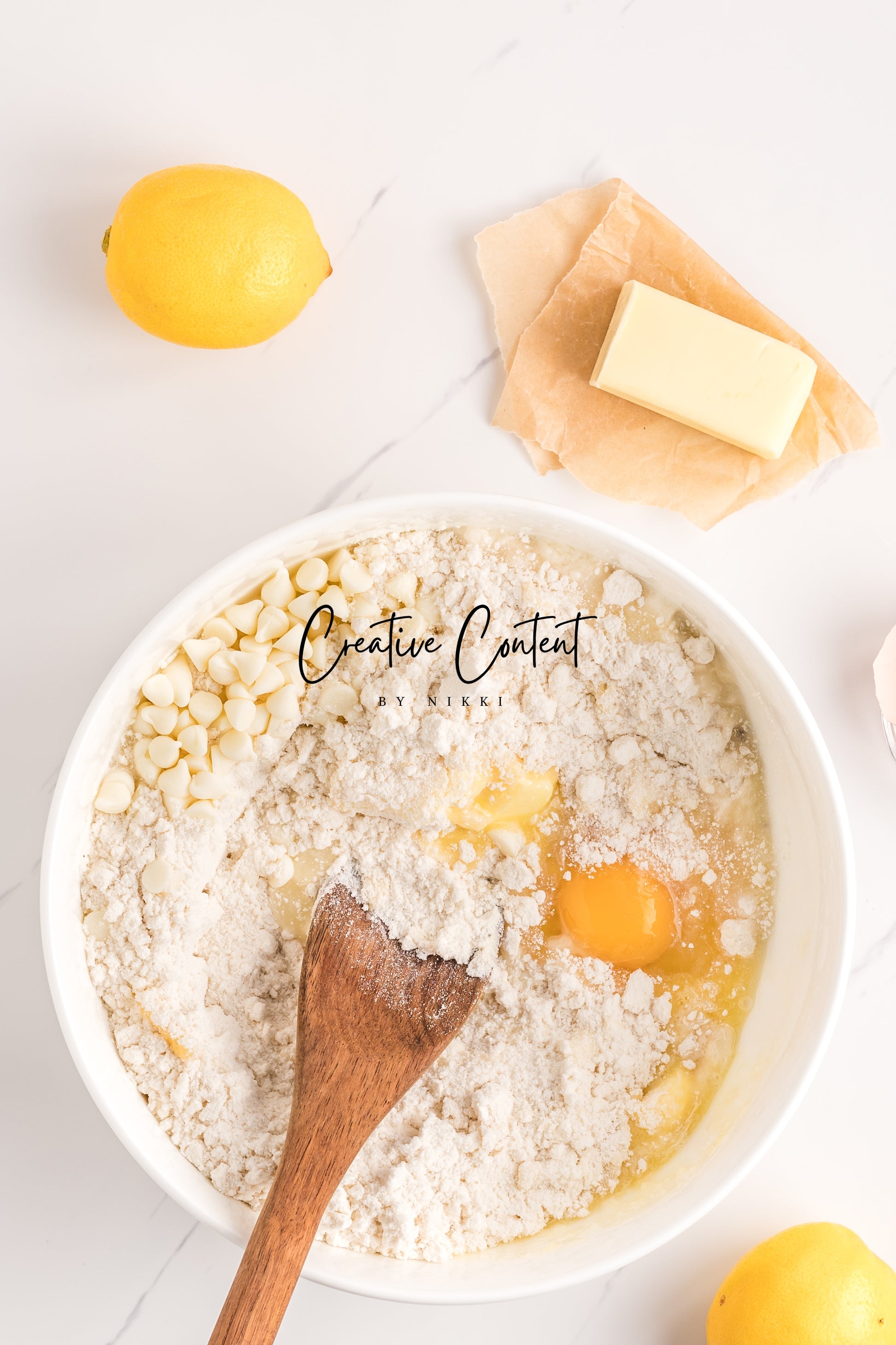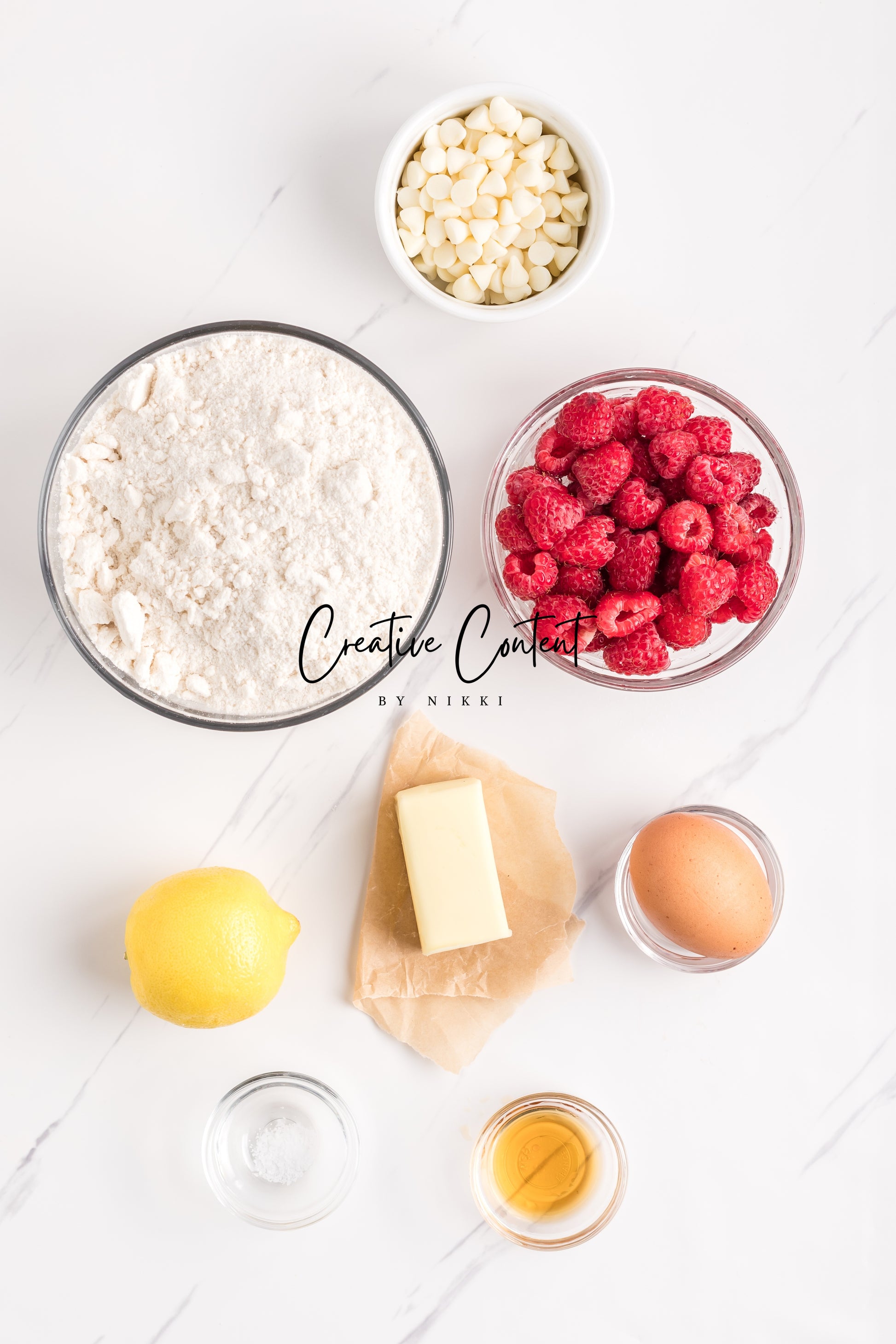 - Ingredients needed; sugar cookie mix, unsalted butter, white chocolate chips, egg, lemon, vanilla extract, coarse kosher salt, and raspberries.