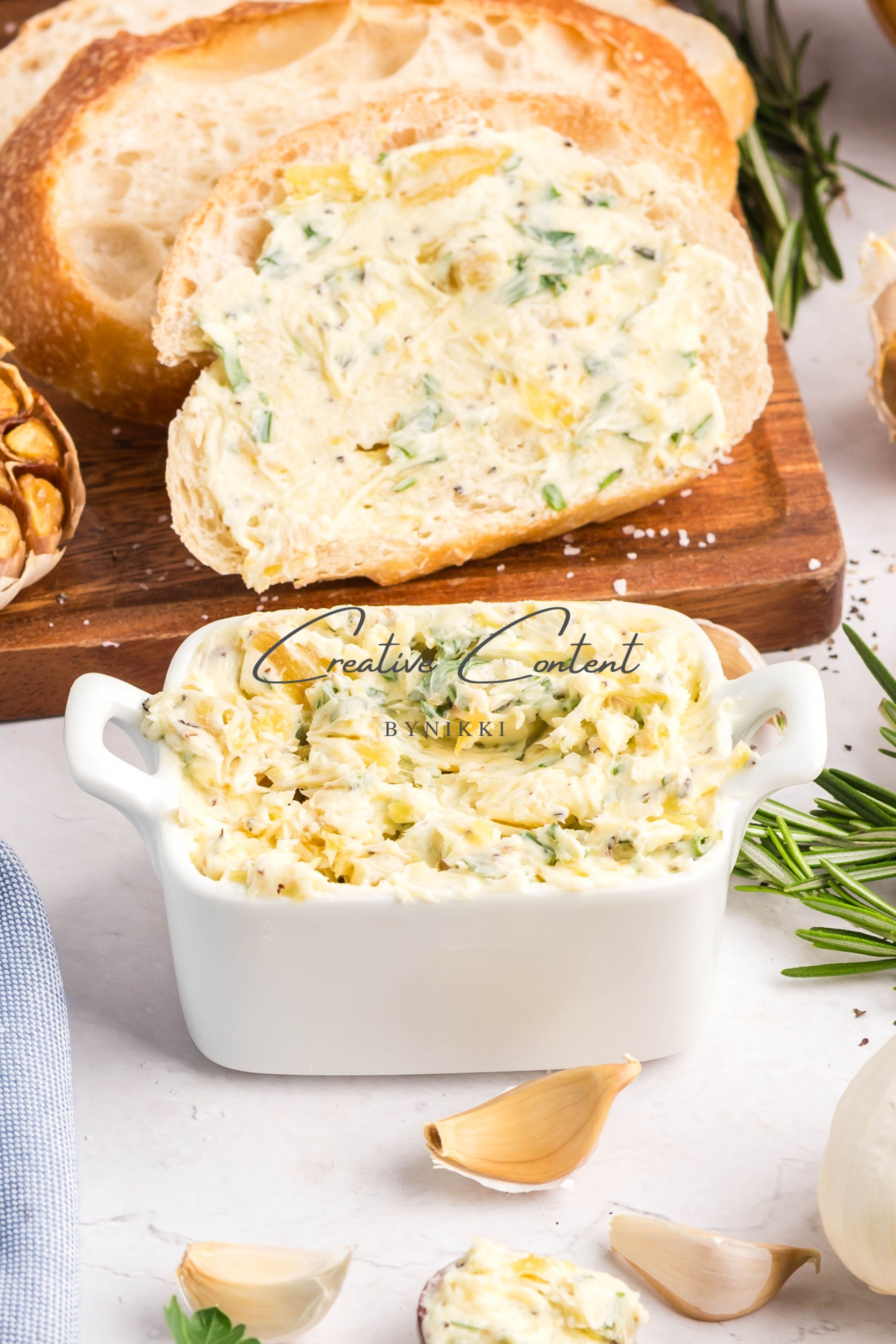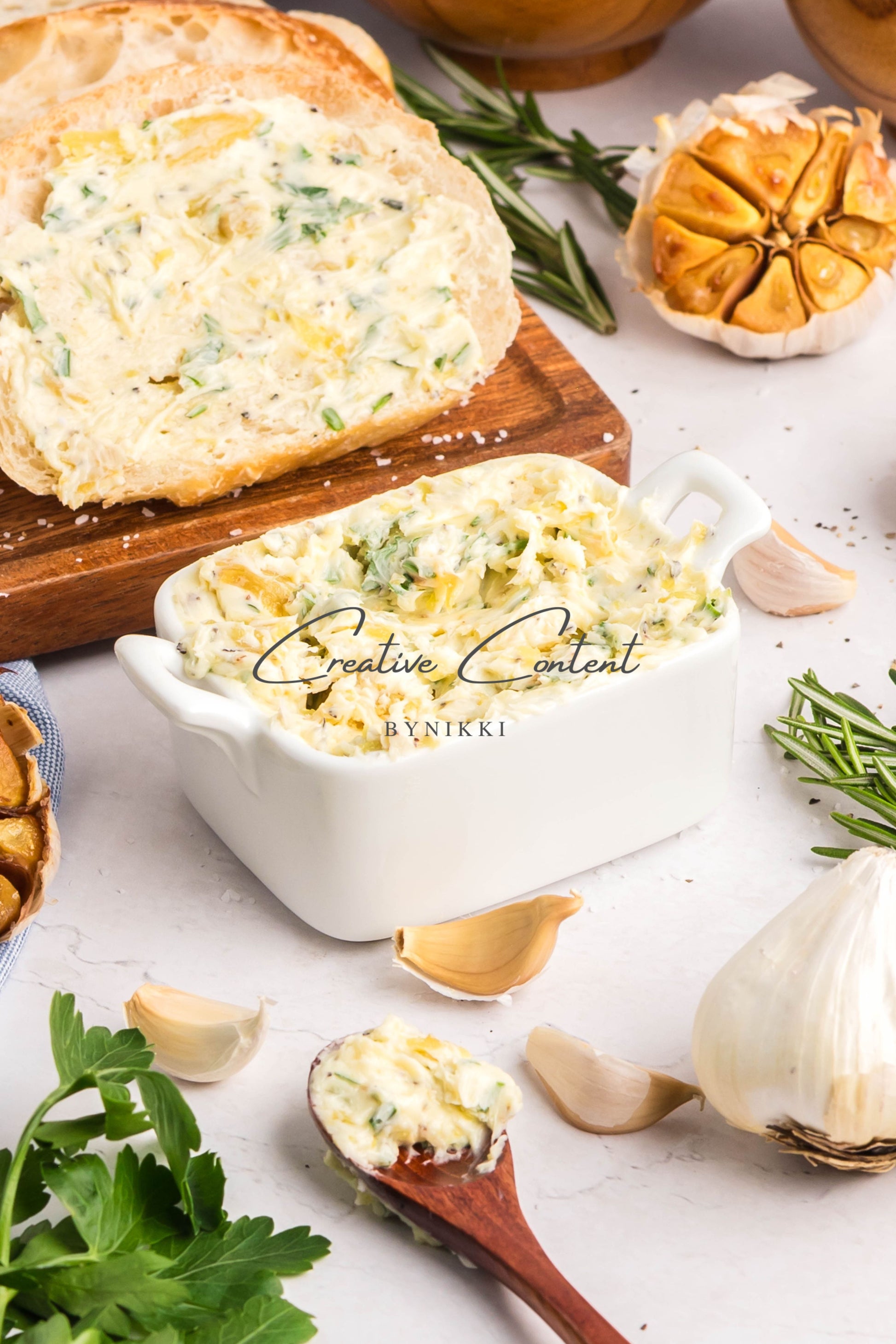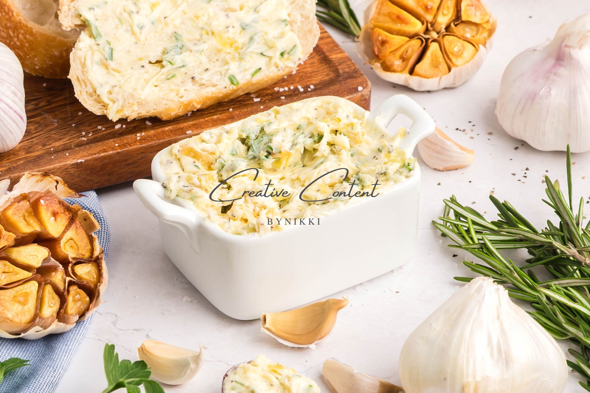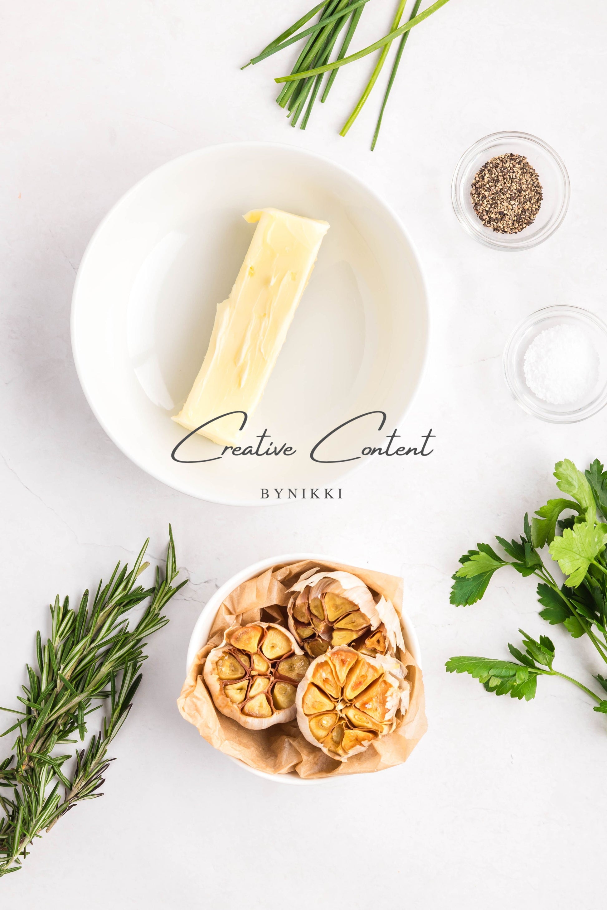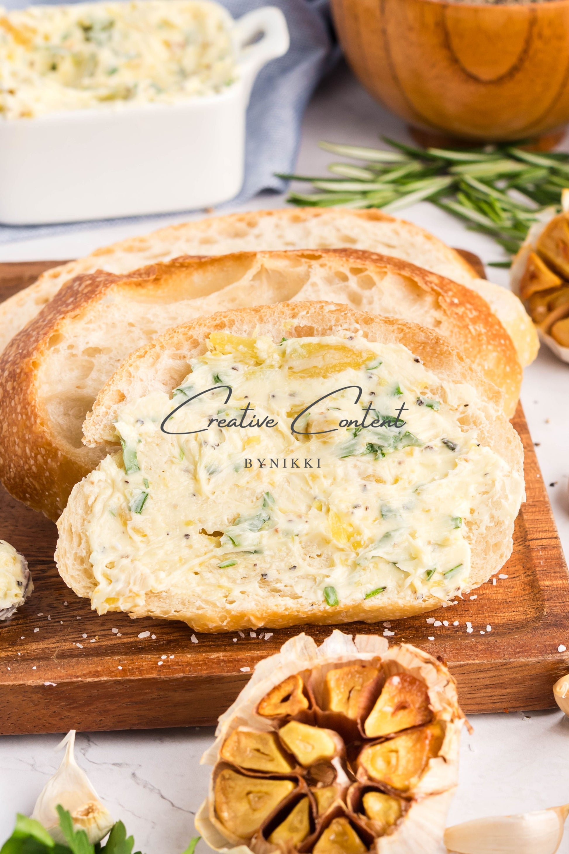 - Ingredients: garlic, avocado oil, kosher salt, butter, rosemary, chives, parsley, black pepper